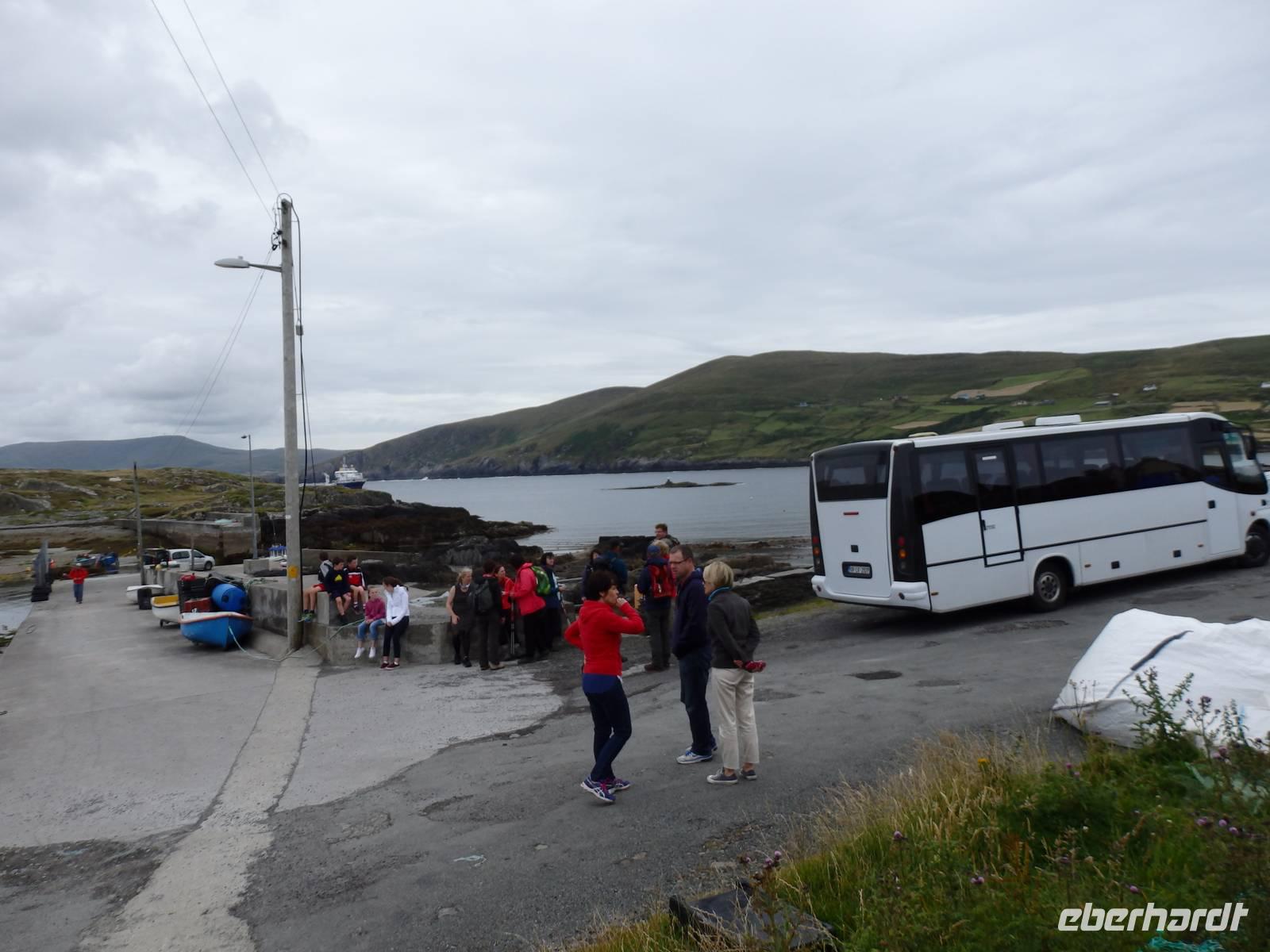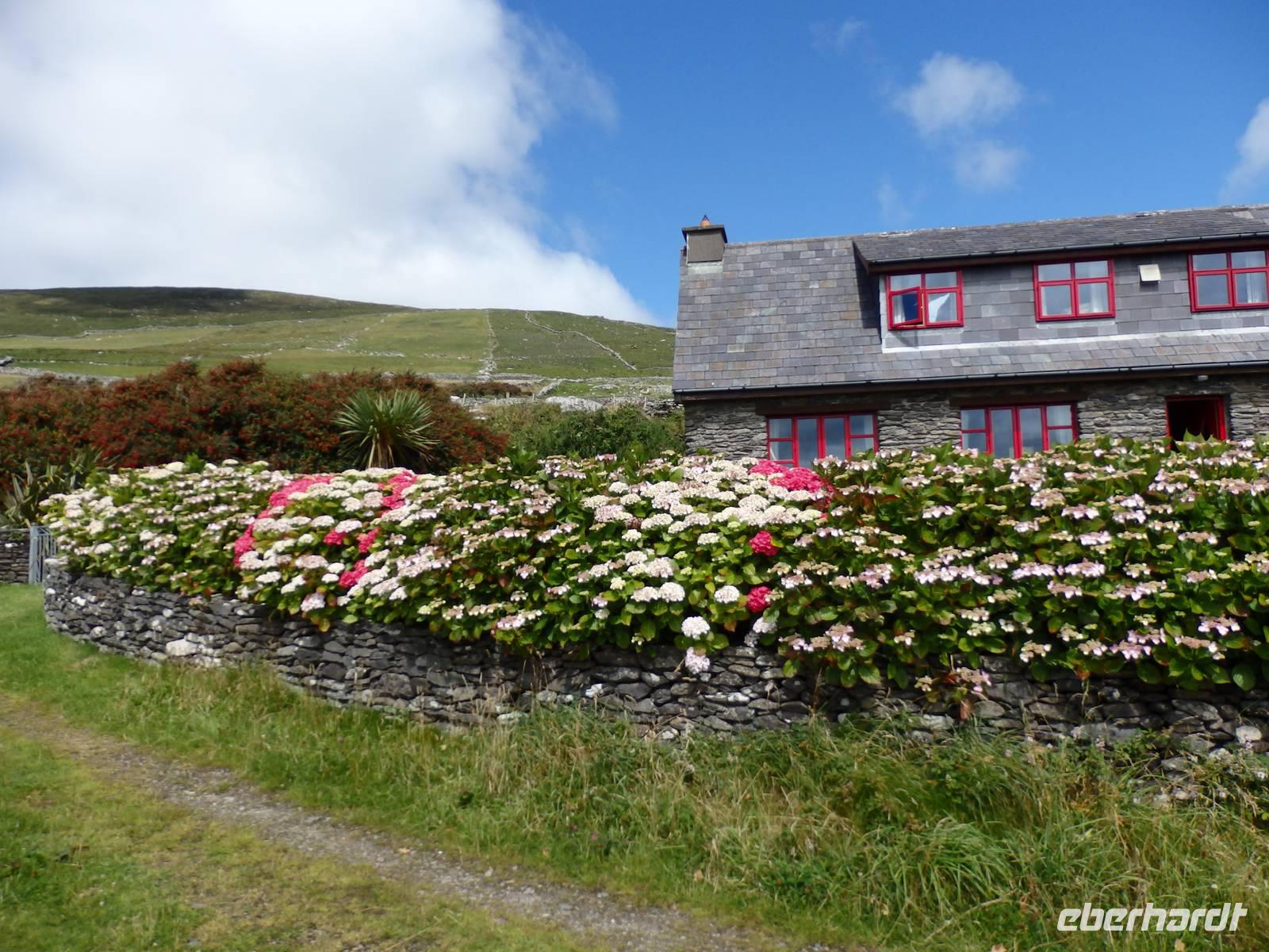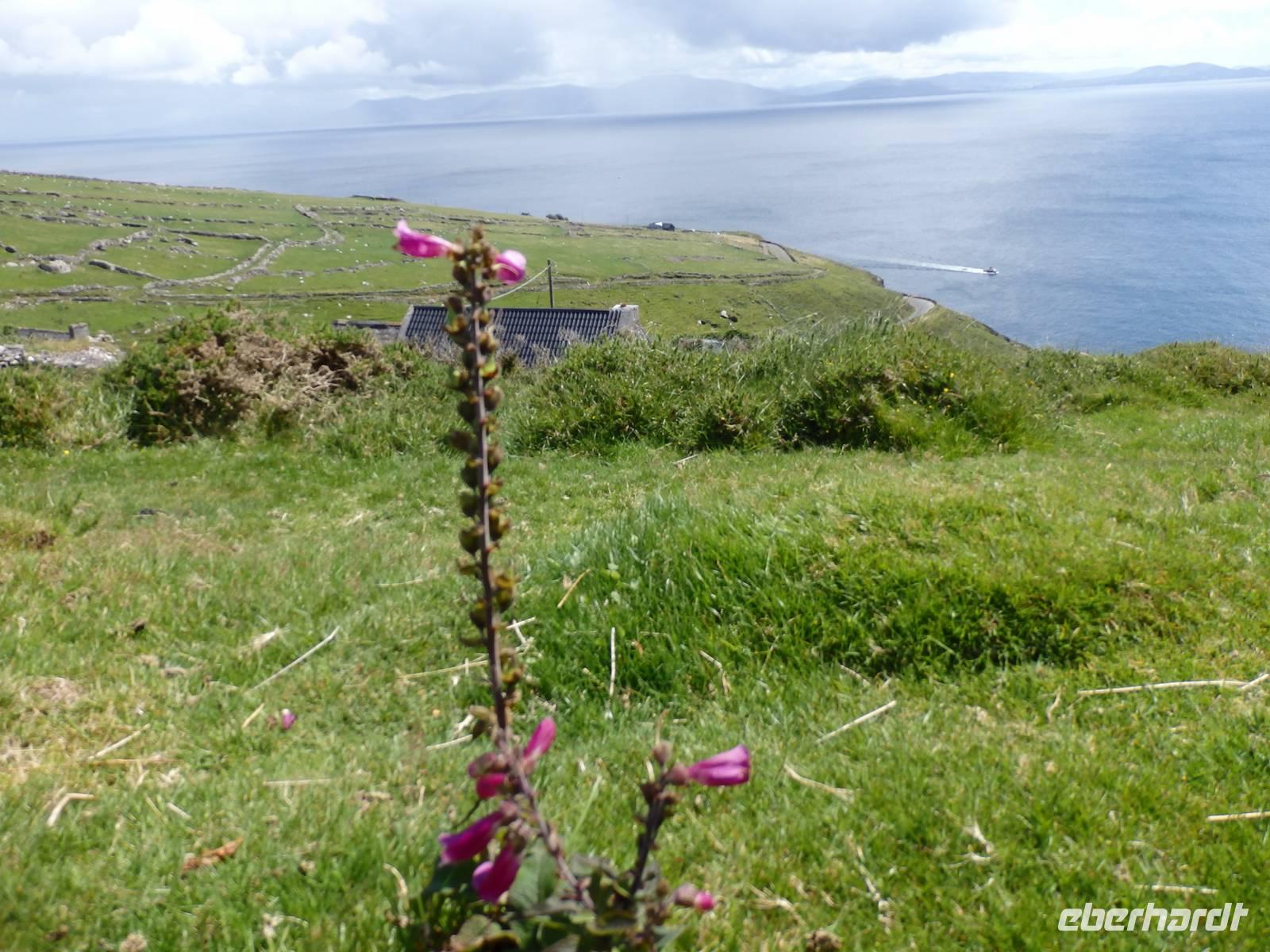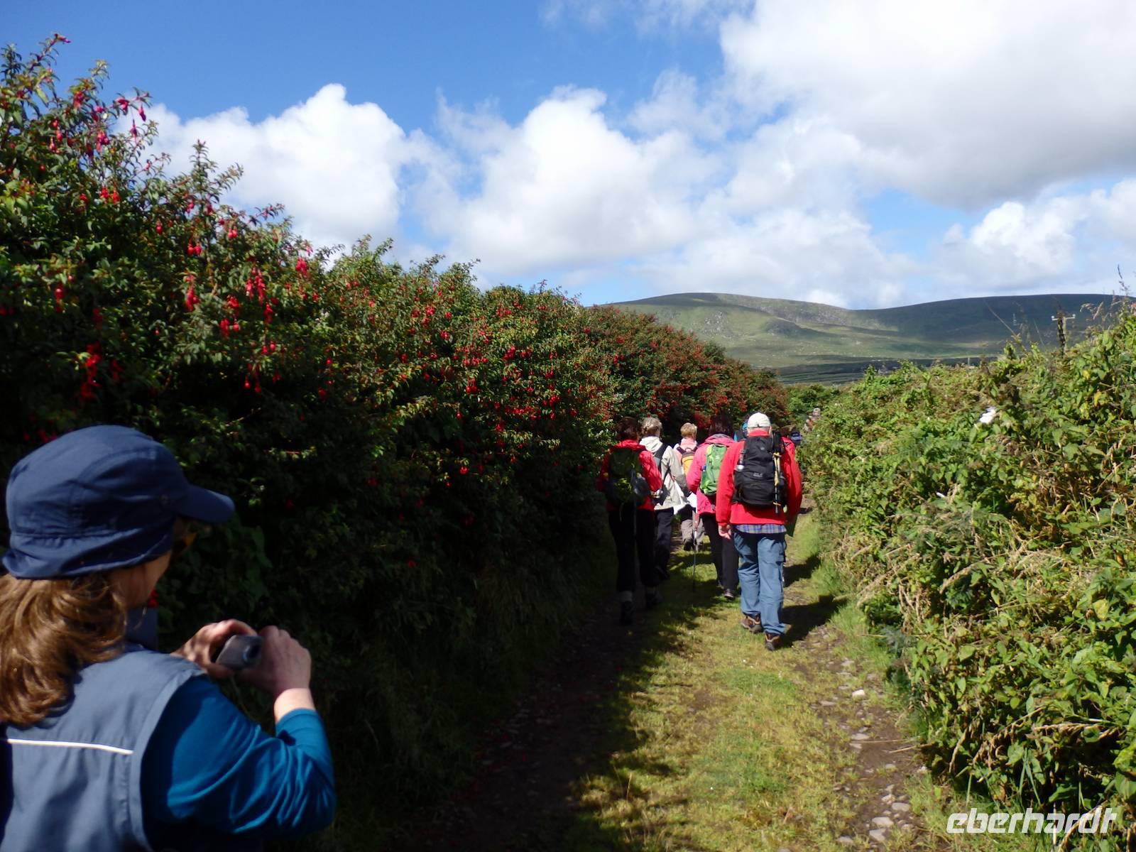 Heute früh treffen wir uns zum Frühstück mit Jan, unserem örtlichen Reiseleiter, der uns an den nächsten Tagen die Schönheiten des Landes zeigen wird. Nachdem alle ihr Lunchpaket im Rucksack verstaut hatten ging es dann mit John und dem Bus auf zur 1. Wanderung. Im Ort Dingle war ein kurzer Stop geplant. Und gleich nach der romantischen kleinen Hafenstadt ging es dann los. Unser Weg führte zunächst am schönen Sandstrand entlang, hier gab es schon viel zu sehen und Jan erzählte uns von den Gezeiten. Der Wasserpegel ist bei Ebbe um 4 m niedriger als bei Flut. Bei herrlichem Wetter geht es weiter vorbei an einem kleinen Dorf und Feldern und Wiesen. Schafherden sehen wir links und rechts unseres Weges. Wir kommen an eine Strasse zum Slea Head. Herrliche Fuchsien und Monbretien schmücken den Wegesrand. Auf einer kleinen Anhöhe mit wunderbarem Blick aufs Meer machen wir Pause und stärken uns vom Lunchpaket. In der Ferne sehen wir zwei Inseln Skelling Michael und Little Skelling. Hier befindet sich ein heute verlassenes Kloster - UNESCO - Weltkulturerbe; die Insel ist mit einem Boot erreichbar.