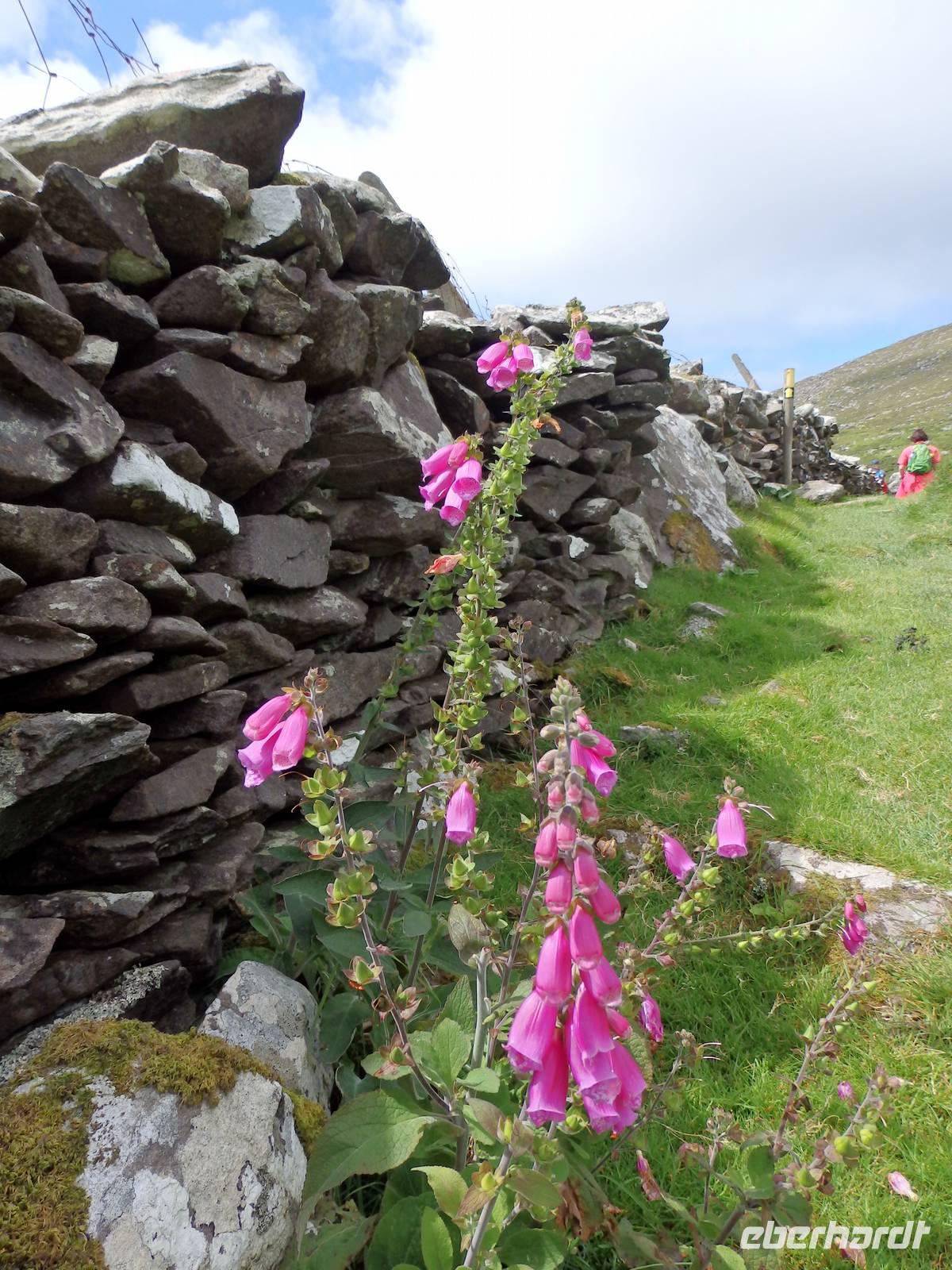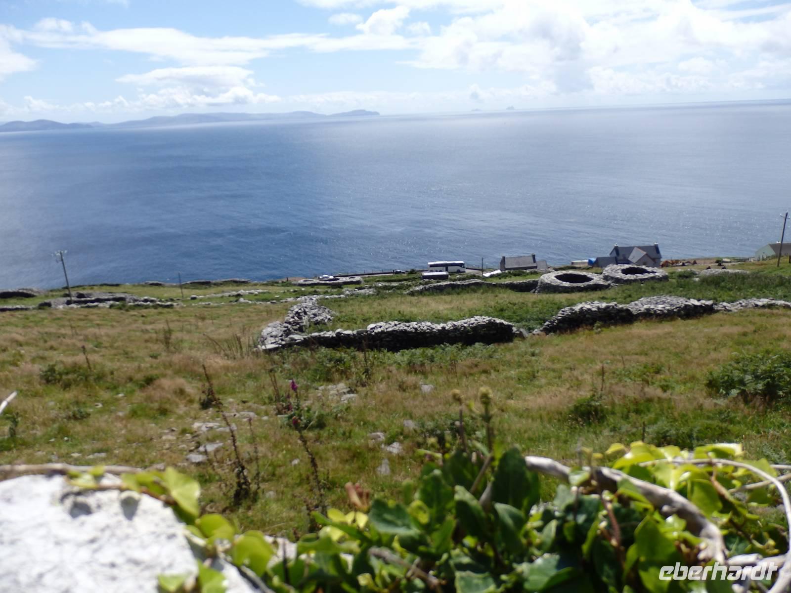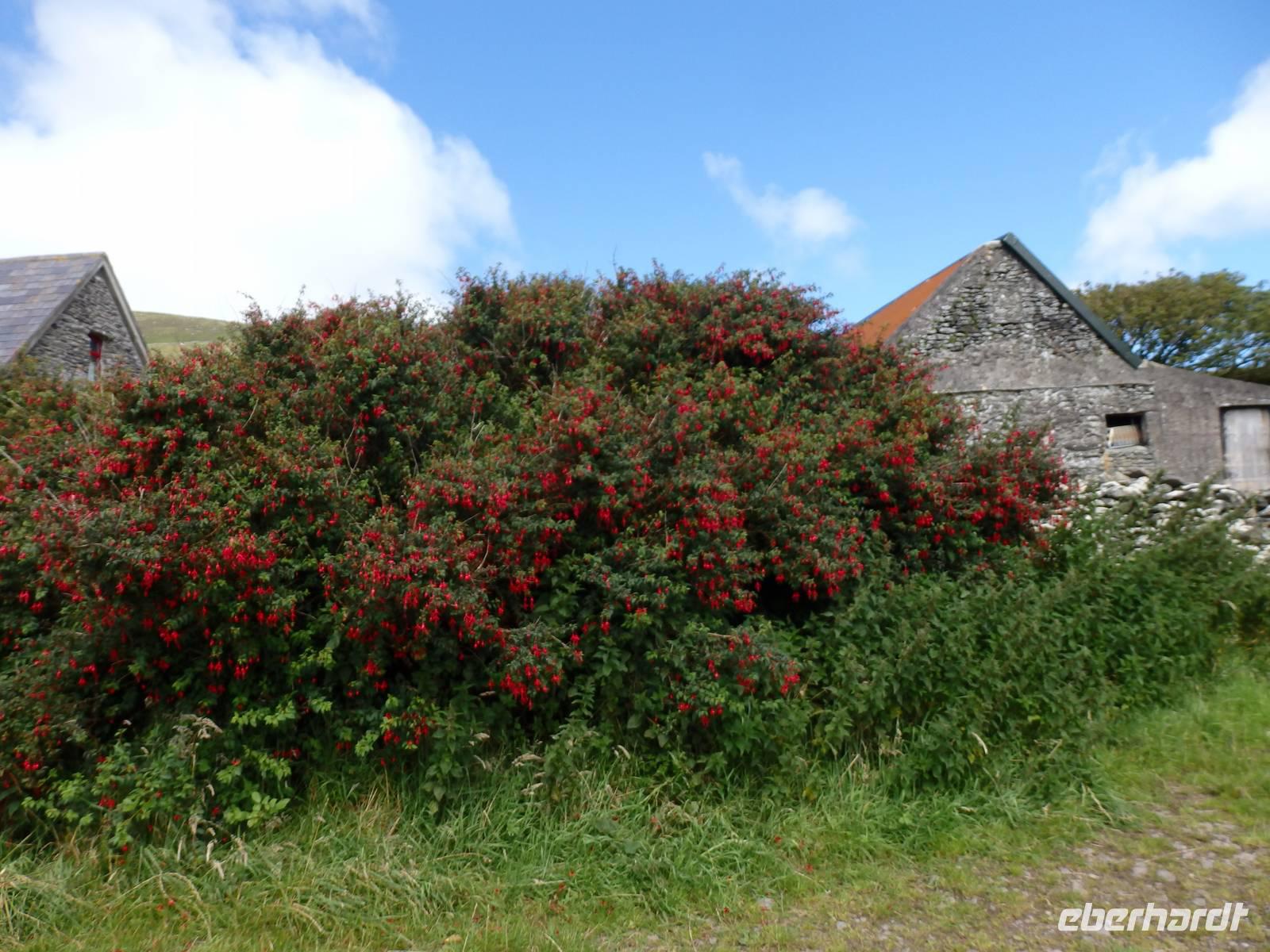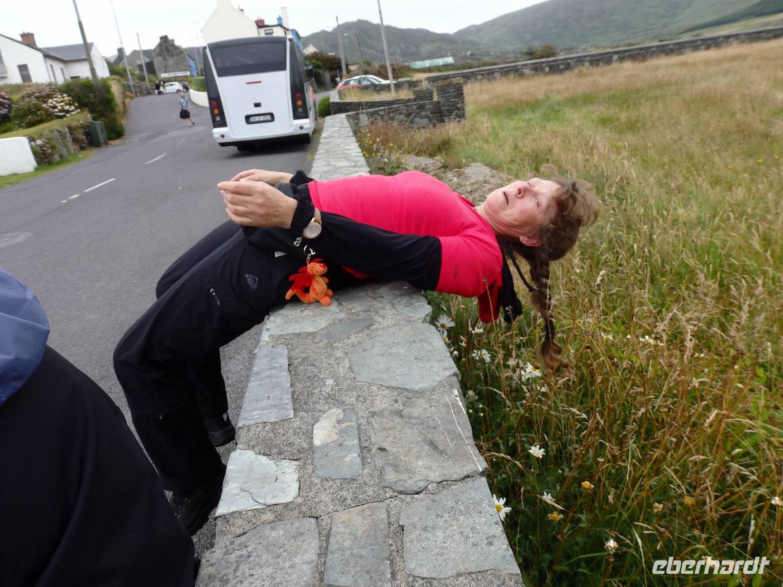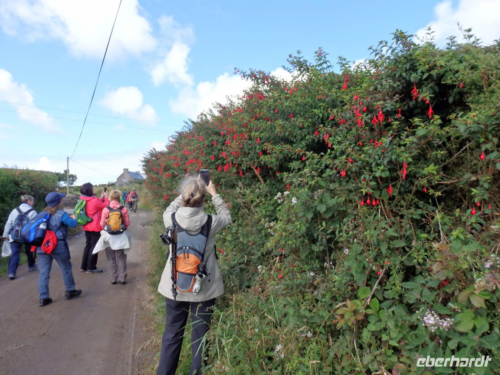 Heute früh treffen wir uns zum Frühstück mit Jan, unserem örtlichen Reiseleiter, der uns an den nächsten Tagen die Schönheiten des Landes zeigen wird. Nachdem alle ihr Lunchpaket im Rucksack verstaut hatten ging es dann mit John und dem Bus auf zur 1. Wanderung. Im Ort Dingle war ein kurzer Stop geplant. Und gleich nach der romantischen kleinen Hafenstadt ging es dann los. Unser Weg führte zunächst am schönen Sandstrand entlang, hier gab es schon viel zu sehen und Jan erzählte uns von den Gezeiten. Der Wasserpegel ist bei Ebbe um 4 m niedriger als bei Flut. Bei herrlichem Wetter geht es weiter vorbei an einem kleinen Dorf und Feldern und Wiesen. Schafherden sehen wir links und rechts unseres Weges. Wir kommen an eine Strasse zum Slea Head. Herrliche Fuchsien und Monbretien schmücken den Wegesrand. Auf einer kleinen Anhöhe mit wunderbarem Blick aufs Meer machen wir Pause und stärken uns vom Lunchpaket. In der Ferne sehen wir zwei Inseln Skelling Michael und Little Skelling. Hier befindet sich ein heute verlassenes Kloster - UNESCO - Weltkulturerbe; die Insel ist mit einem Boot erreichbar.