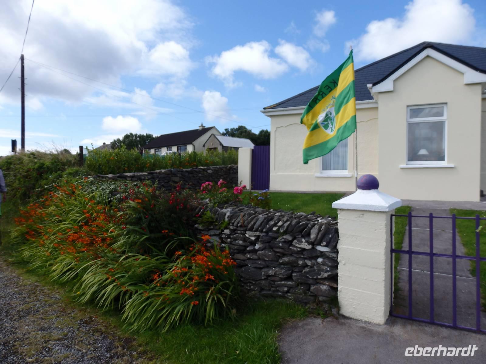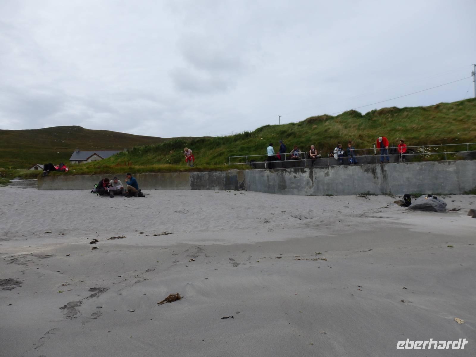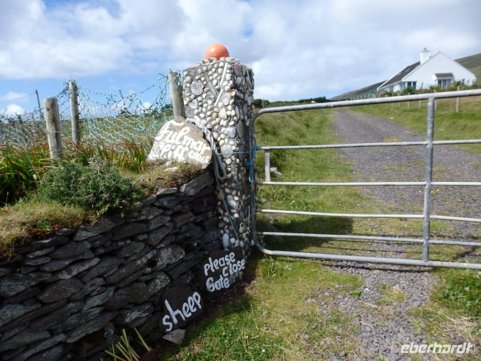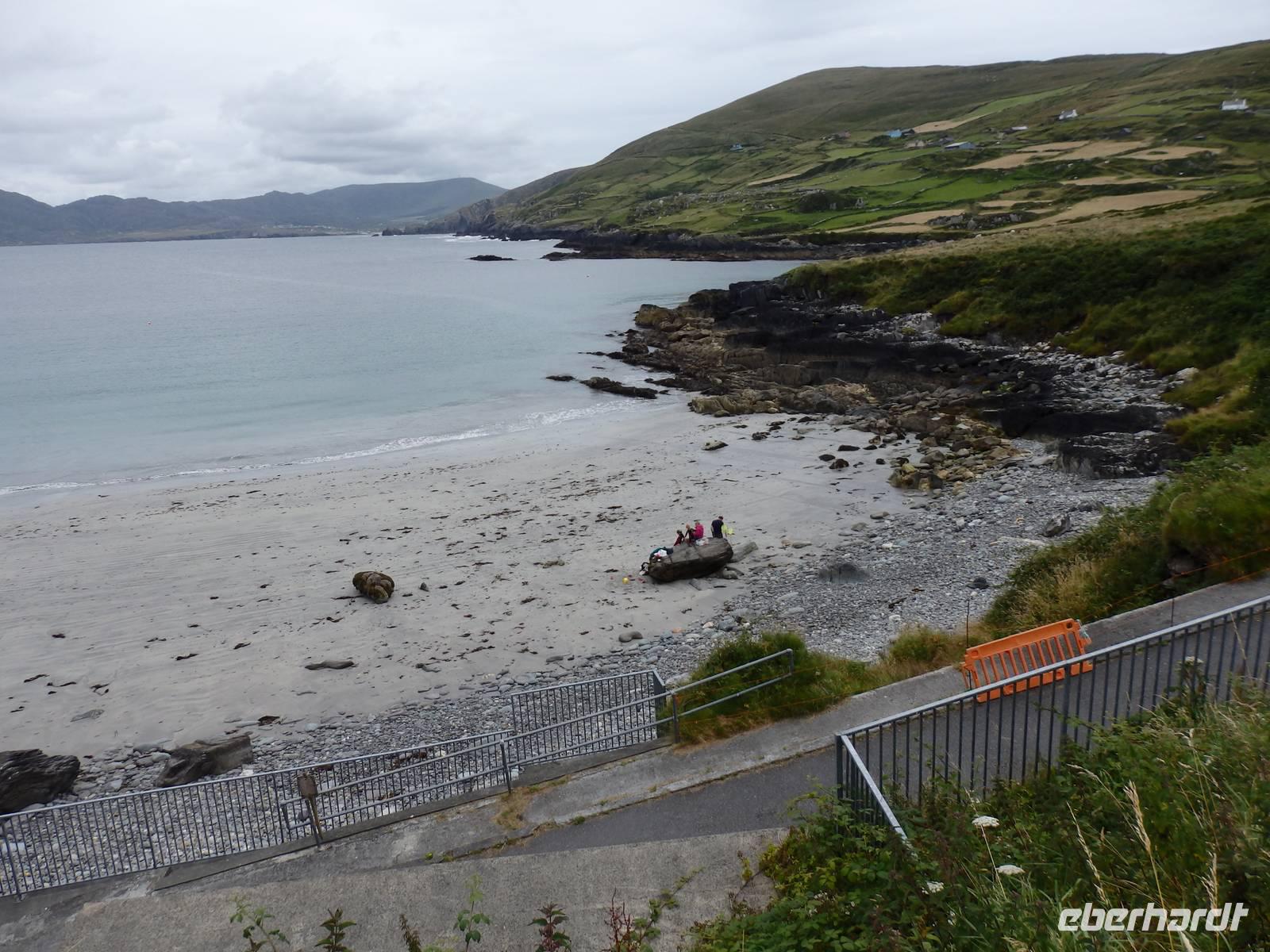 Heute früh treffen wir uns zum Frühstück mit Jan, unserem örtlichen Reiseleiter, der uns an den nächsten Tagen die Schönheiten des Landes zeigen wird. Nachdem alle ihr Lunchpaket im Rucksack verstaut hatten ging es dann mit John und dem Bus auf zur 1. Wanderung. Im Ort Dingle war ein kurzer Stop geplant. Und gleich nach der romantischen kleinen Hafenstadt ging es dann los. Unser Weg führte zunächst am schönen Sandstrand entlang, hier gab es schon viel zu sehen und Jan erzählte uns von den Gezeiten. Der Wasserpegel ist bei Ebbe um 4 m niedriger als bei Flut. Bei herrlichem Wetter geht es weiter vorbei an einem kleinen Dorf und Feldern und Wiesen. Schafherden sehen wir links und rechts unseres Weges. Wir kommen an eine Strasse zum Slea Head. Herrliche Fuchsien und Monbretien schmücken den Wegesrand. Auf einer kleinen Anhöhe mit wunderbarem Blick aufs Meer machen wir Pause und stärken uns vom Lunchpaket. In der Ferne sehen wir zwei Inseln Skelling Michael und Little Skelling. Hier befindet sich ein heute verlassenes Kloster - UNESCO - Weltkulturerbe; die Insel ist mit einem Boot erreichbar.