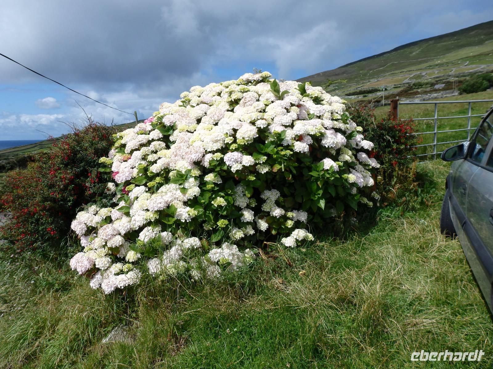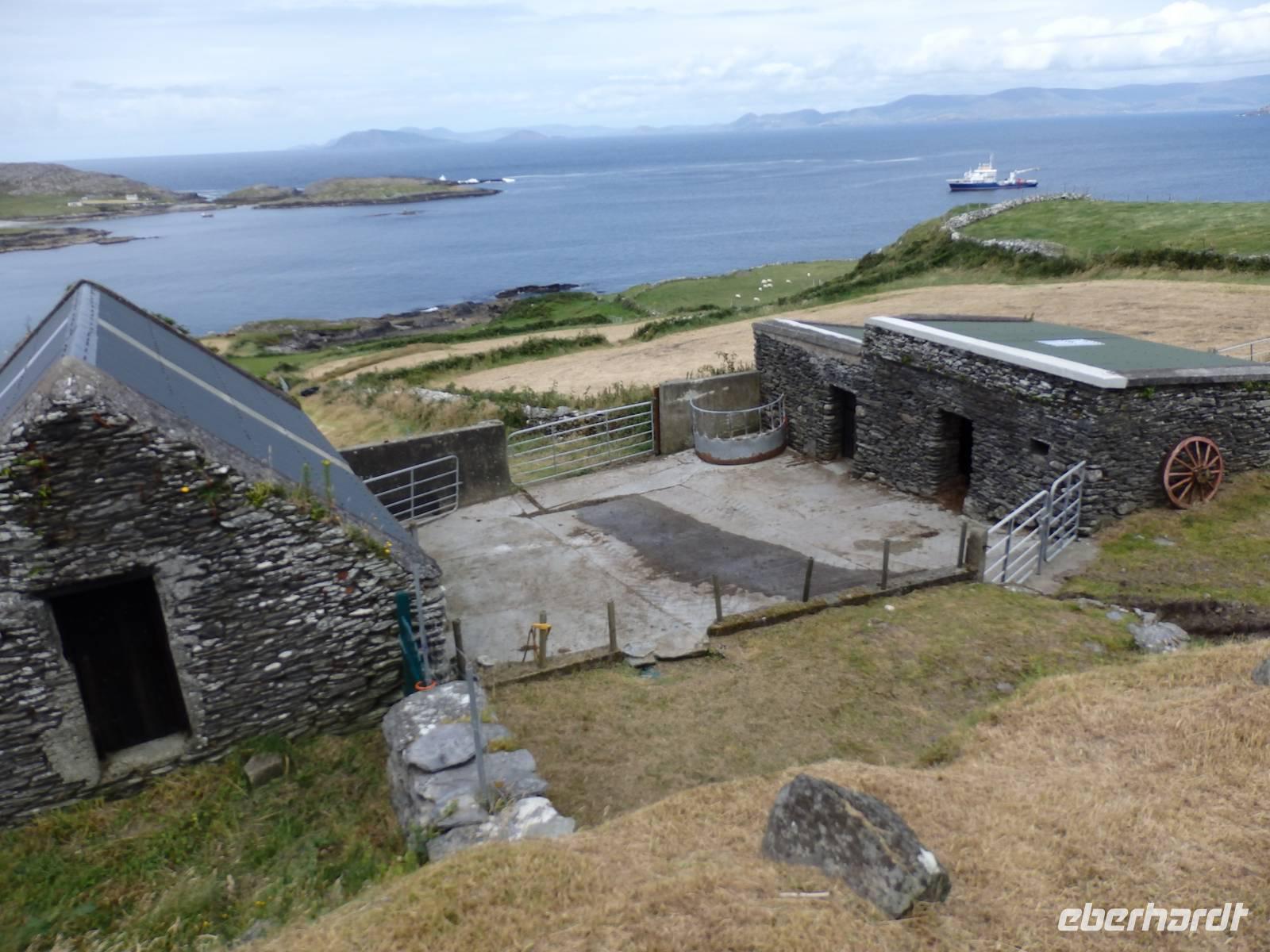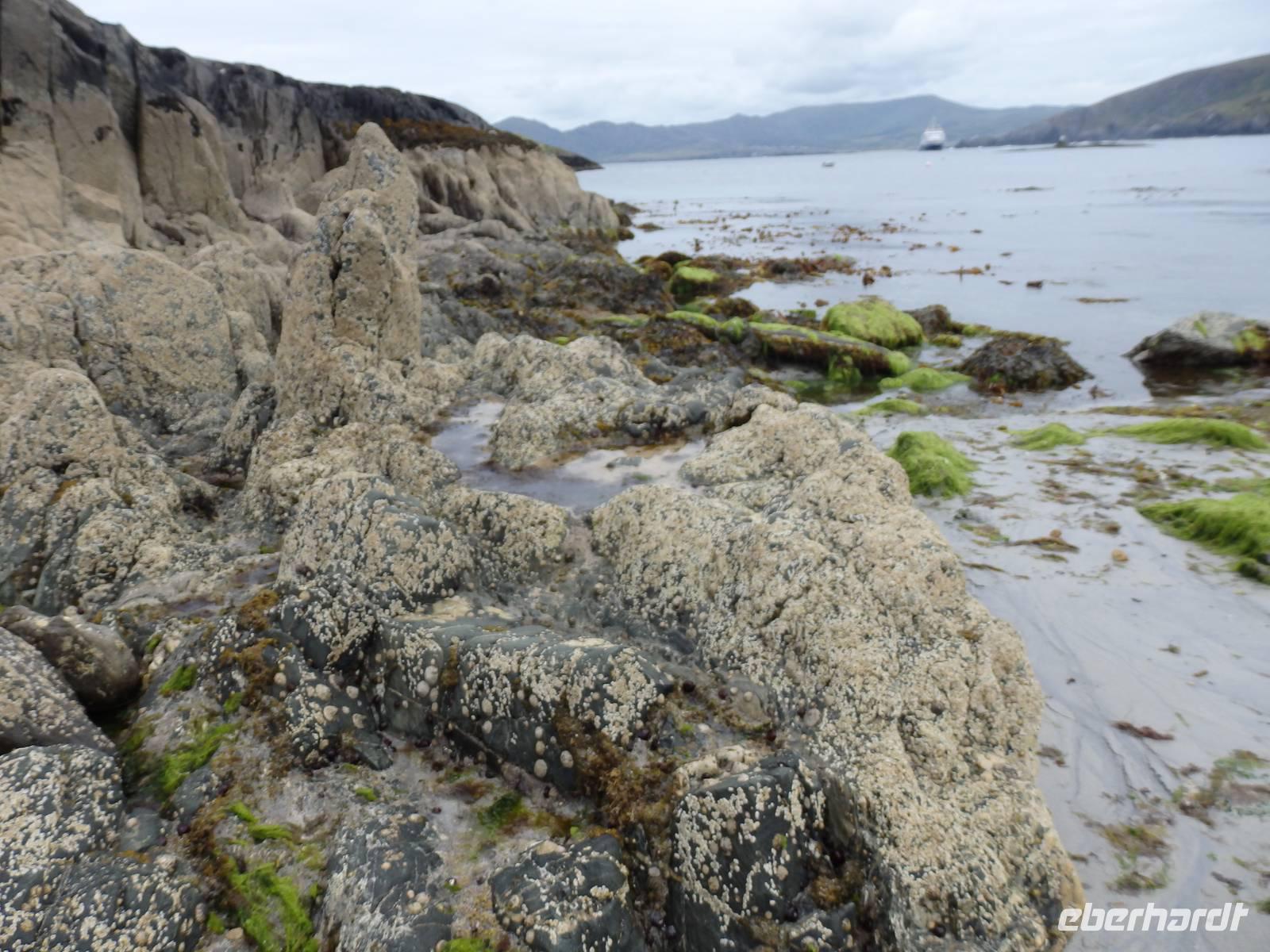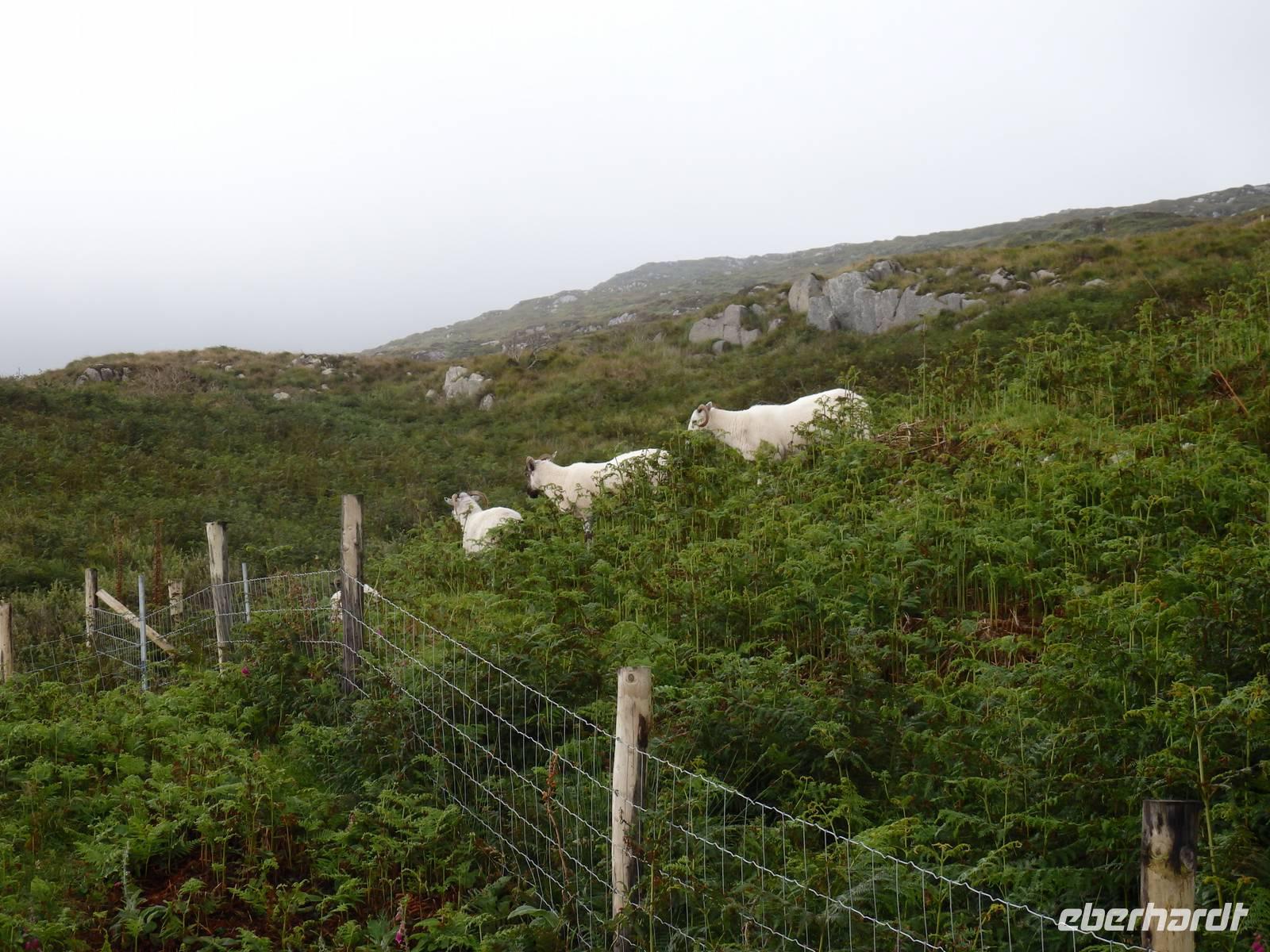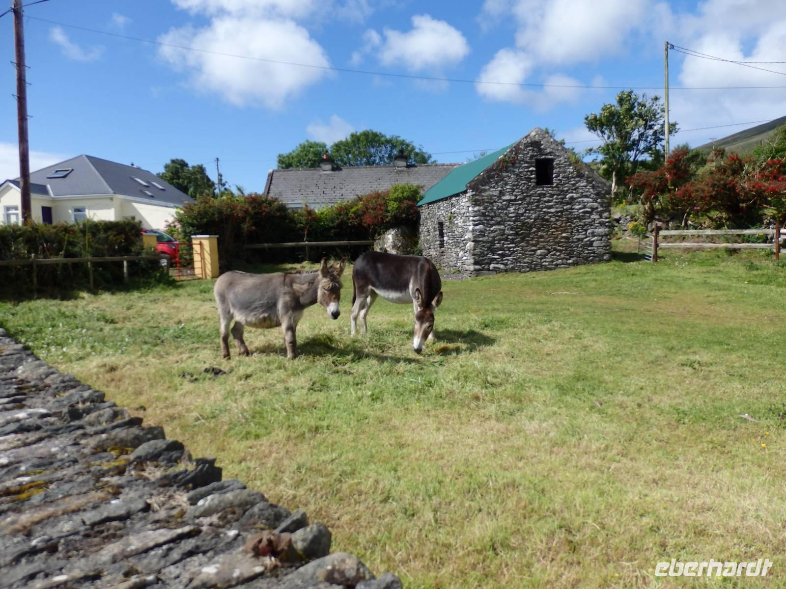 Heute früh treffen wir uns zum Frühstück mit Jan, unserem örtlichen Reiseleiter, der uns an den nächsten Tagen die Schönheiten des Landes zeigen wird. Nachdem alle ihr Lunchpaket im Rucksack verstaut hatten ging es dann mit John und dem Bus auf zur 1. Wanderung. Im Ort Dingle war ein kurzer Stop geplant. Und gleich nach der romantischen kleinen Hafenstadt ging es dann los. Unser Weg führte zunächst am schönen Sandstrand entlang, hier gab es schon viel zu sehen und Jan erzählte uns von den Gezeiten. Der Wasserpegel ist bei Ebbe um 4 m niedriger als bei Flut. Bei herrlichem Wetter geht es weiter vorbei an einem kleinen Dorf und Feldern und Wiesen. Schafherden sehen wir links und rechts unseres Weges. Wir kommen an eine Strasse zum Slea Head. Herrliche Fuchsien und Monbretien schmücken den Wegesrand. Auf einer kleinen Anhöhe mit wunderbarem Blick aufs Meer machen wir Pause und stärken uns vom Lunchpaket. In der Ferne sehen wir zwei Inseln Skelling Michael und Little Skelling. Hier befindet sich ein heute verlassenes Kloster - UNESCO - Weltkulturerbe; die Insel ist mit einem Boot erreichbar.
