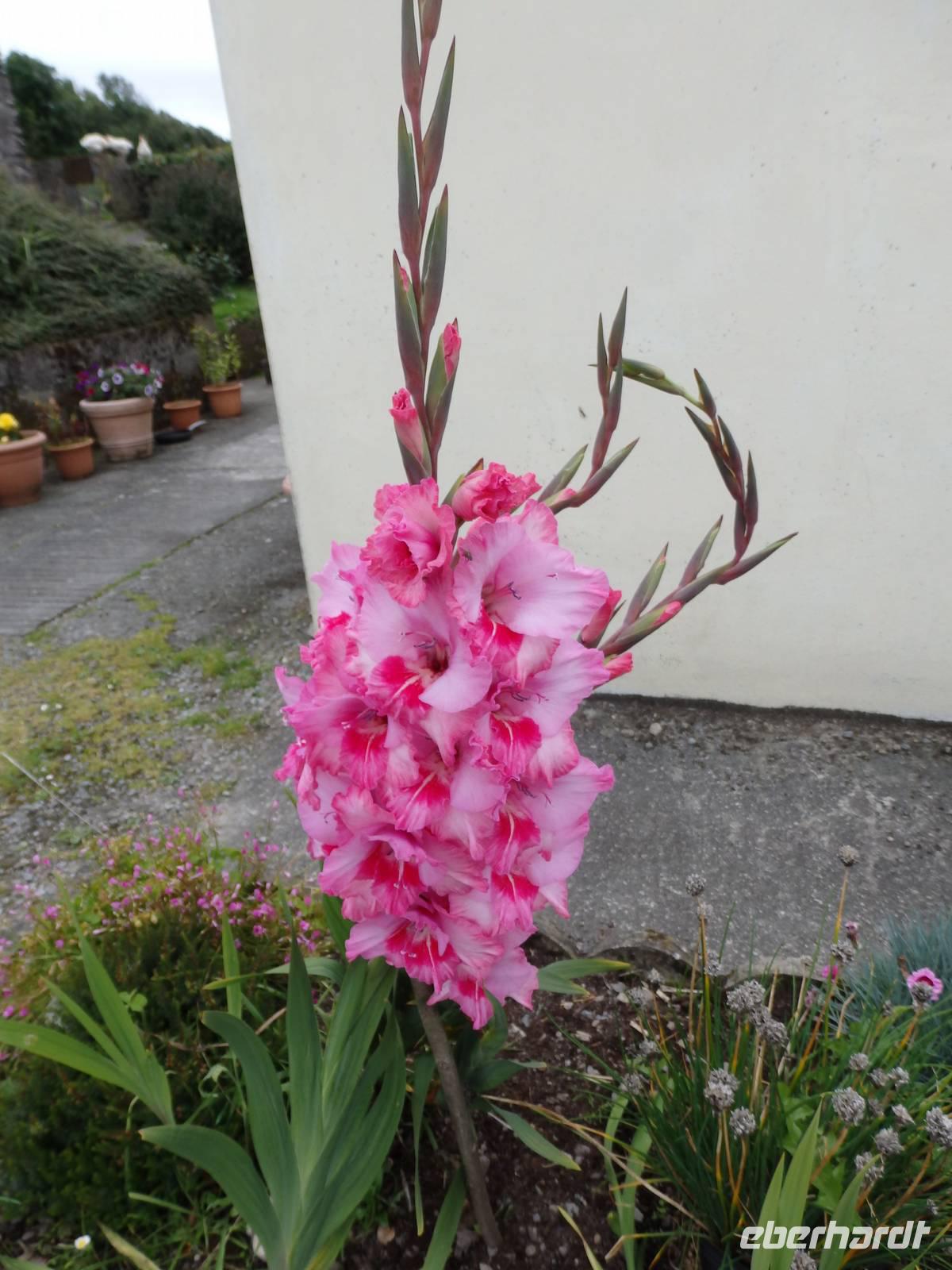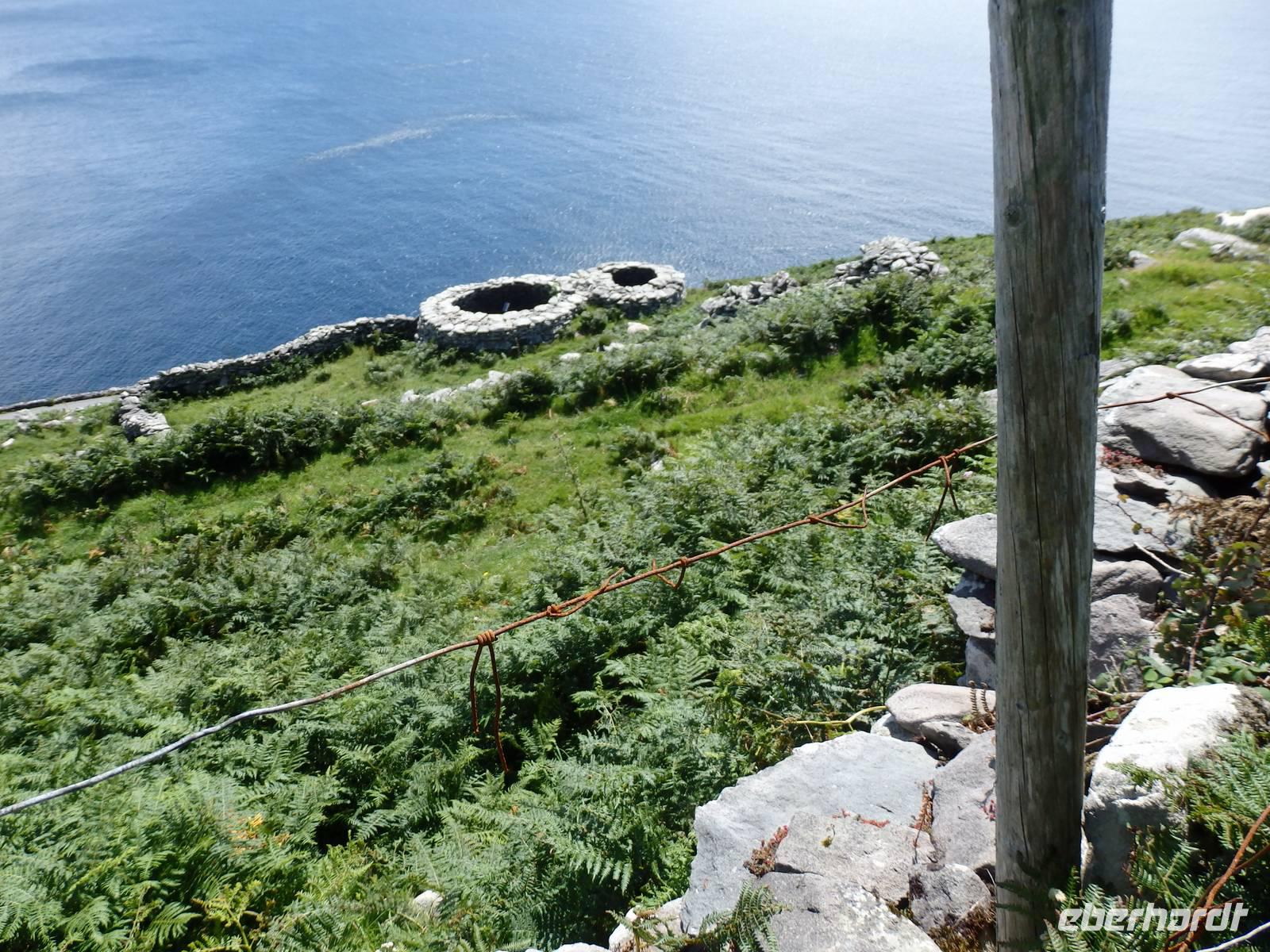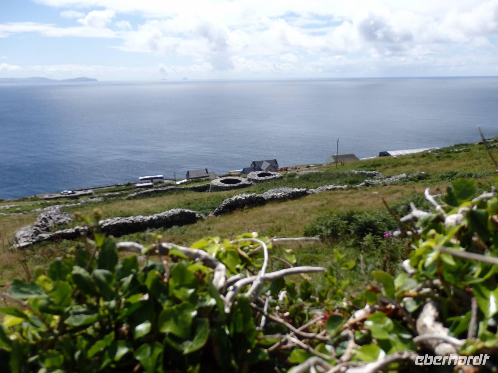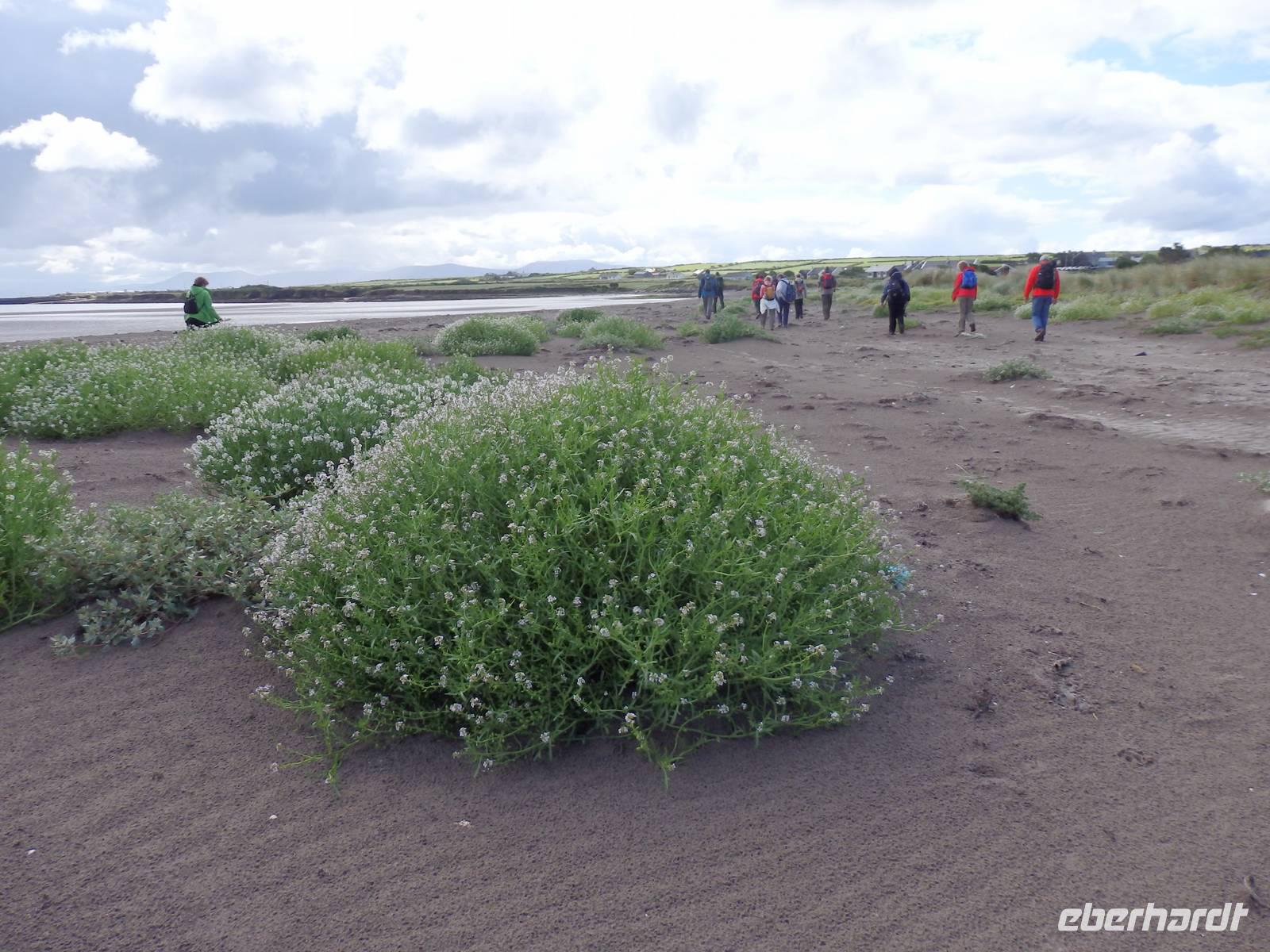 Heute früh treffen wir uns zum Frühstück mit Jan, unserem örtlichen Reiseleiter, der uns an den nächsten Tagen die Schönheiten des Landes zeigen wird. Nachdem alle ihr Lunchpaket im Rucksack verstaut hatten ging es dann mit John und dem Bus auf zur 1. Wanderung. Im Ort Dingle war ein kurzer Stop geplant. Und gleich nach der romantischen kleinen Hafenstadt ging es dann los. Unser Weg führte zunächst am schönen Sandstrand entlang, hier gab es schon viel zu sehen und Jan erzählte uns von den Gezeiten. Der Wasserpegel ist bei Ebbe um 4 m niedriger als bei Flut. Bei herrlichem Wetter geht es weiter vorbei an einem kleinen Dorf und Feldern und Wiesen. Schafherden sehen wir links und rechts unseres Weges. Wir kommen an eine Strasse zum Slea Head. Herrliche Fuchsien und Monbretien schmücken den Wegesrand. Auf einer kleinen Anhöhe mit wunderbarem Blick aufs Meer machen wir Pause und stärken uns vom Lunchpaket. In der Ferne sehen wir zwei Inseln Skelling Michael und Little Skelling. Hier befindet sich ein heute verlassenes Kloster - UNESCO - Weltkulturerbe; die Insel ist mit einem Boot erreichbar.
