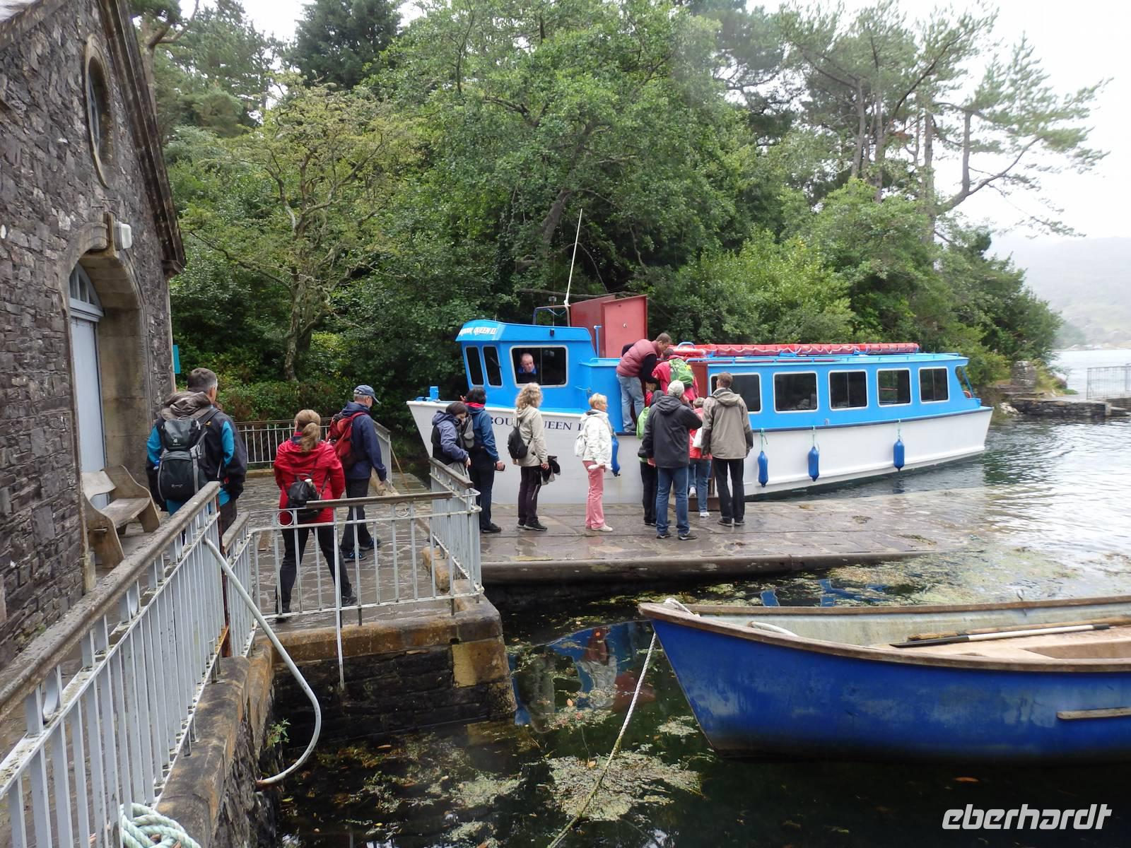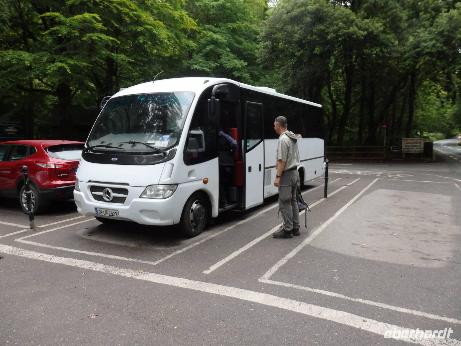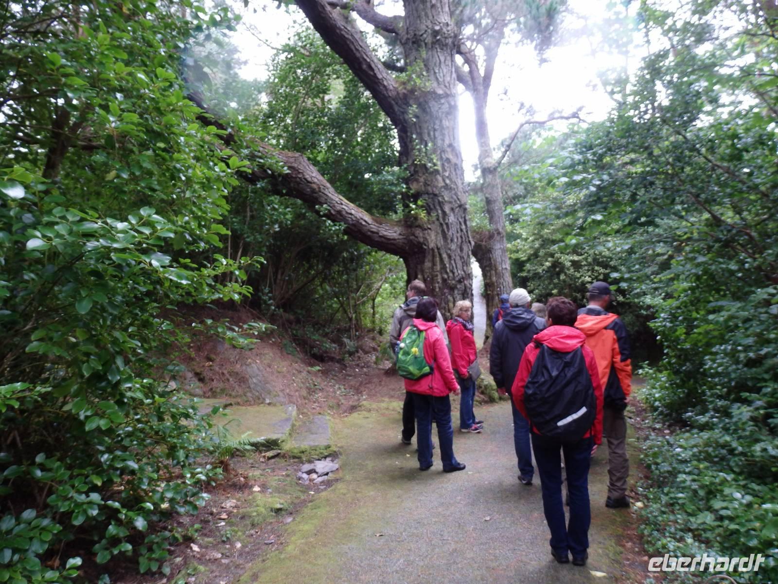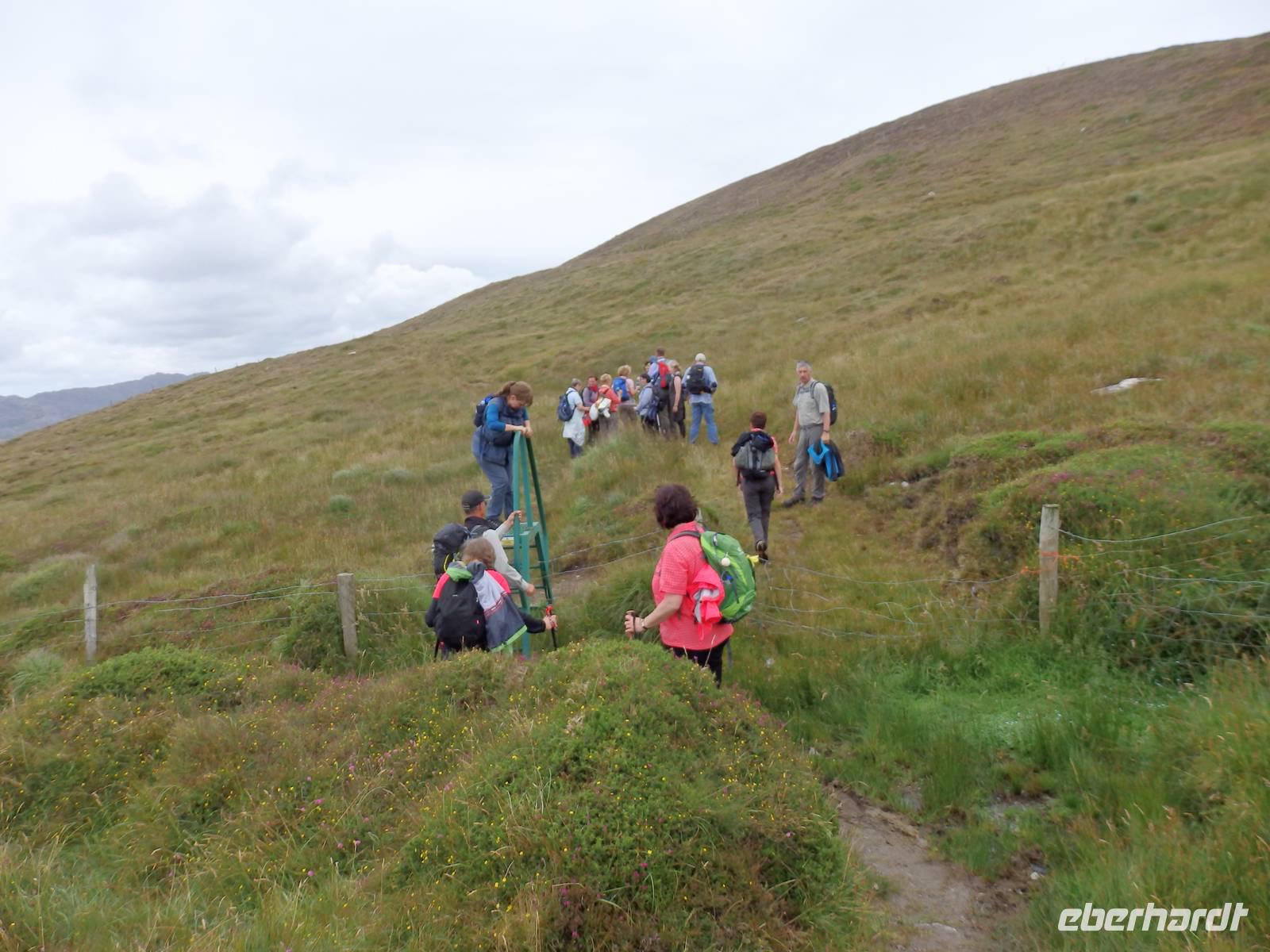 Gestärkt vom Frühstück und mit dem Lunchpaket im Rucksack geht es wieder bei herrlichem Wetter mit dem Bus zum Ausgangspunkt unserer heutigen Tour. Unseren Wanderführer Jan treffen wir in Kenmare. Außerhalb von Kenmare verabschieden wir uns vorerst von unserem Busfahrer und es geht zu Fuß und mit guter Laune bergauf auf der Old Kenmare Road. Dieser Weg war früher die "Verbindungsstrasse" zwischen Kenmare und Killarney. Hier und da sehen wir eine Schafherde am Wegesrand und irgendwann wird es dann ganz ruhig um uns. Am Windy Gap - einem Pass auf dem Scheitelpunkt unserer heutigen Wanderung können wir in das weite Tal vor Killarney blicken. Die Sicht ist einzigarttig gut. Von hier geht es weiter bergab bis zum Killarney Nationalpark. Von Jan`s Angebot eine Abkürzung zum Bus zu nehmen wollten wir nichts wissen. Wir biegen im Tal rechts ab und es geht wieder bergauf. Die Landschaft zeigt sich hier von einer ganz anderen Seite. Wir kommen in ein Waldgebiet mit vielen uralten Eichen und anderen interessanten Gehölzen. Das viele Moos auf dem Boden, an den Steinen und auch Bäumen vermittelt uns einen ganz besonderen Eindruck - wir fühlen uns wie in einem Märchenwald. Oben auf dem Berg angekommen schmeckt das Lunchpaket besonders gut. Jetzt geht es ein Stück gerade aus auf einer Höhe und anschließend bergab. Die Landschaft wechseklt wieder ihr Bild. Da es hier z.T. durch ein sehr morastiges Gebiet geht, nutzen wir gern den für die Wanderer angelegten Pfad aus Bohlen - so bleiben unsere Schuhe trocken. An einem kleinen Wasserfall machen wir noch kurz halt für ein paar Foto´s und gleich ging es weiter in Richtung Torc Waterfall. In atemberaubenter Geschwindigkeit schießt hier das Wasser über die Felsen ins Tal. Jetzt treffen wir wieder unseren John, er bringt uns zum Muckross House. Hier gönnen wir uns einen Kaffee und einige sogar ein schönes Stück Kuchen oder Torte. Jetzt ist es nur noch ein kleines Stück bis zu unserem Hotel. Wir machen uns frisch und geniessen unser wohlverdientes Abendessen.