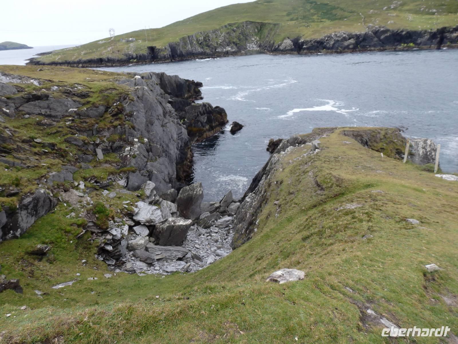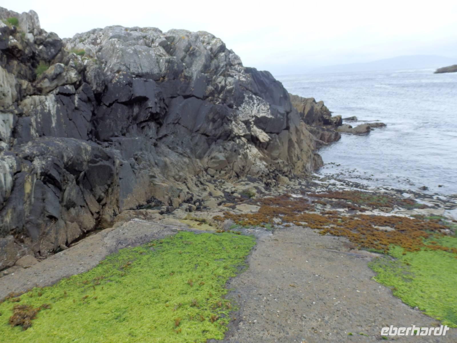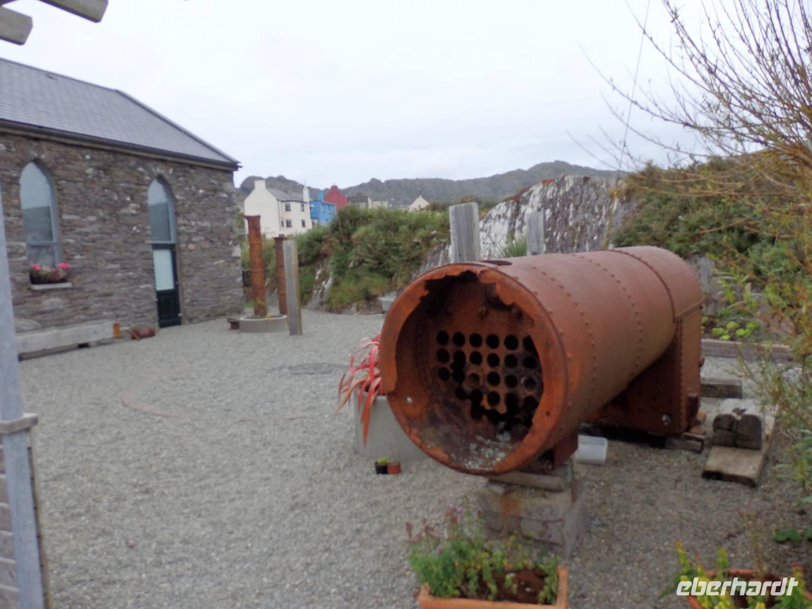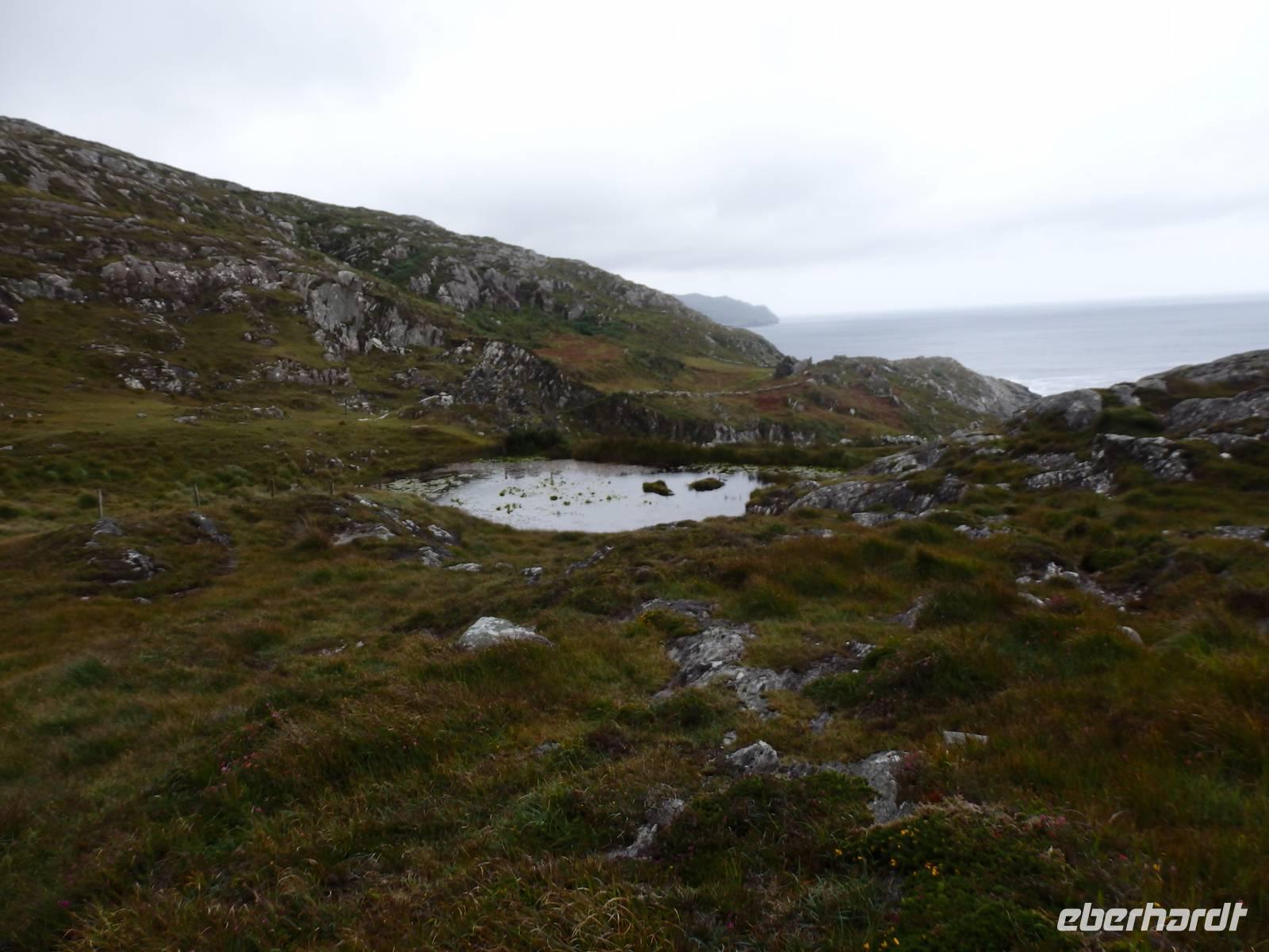 Heute muss ich mich - leider - voin meiner Wandergruppe verabschieden. Nach dem Früphstück geht es mit Lunchpaket im Rucksack zum Bus, John fährt uns. In Bantry sehen wir auf dem Marktplatz einen großen Anker aus vergangenen Zeiten. Am Ufer stehen verlassene Getreidespeicher, von hier aus florierte der Export auf dem Seewege. Wir fahren an die Nordseite der Halbinsel und beginnen da unsere Wanderung. John hat Mühe mit dem Bus durch die immer enger werdenen Straßen zu kommen. Auf unserer Wandertour kommen wir vorbei an einer alten verlassenen Siedlung, sie beherbergte früher Bergleute, die in den Kupferminen ihren Lebensunterhalt verdienten. Hier auf Shepps Head gab es auch eine Reihe von Kupferminen insb. im 19. JH. Die Landschaft hier ist einzigartig schön, steile Klippen und kleine Buchten prägen das Gebiet. Wir kommen an einen künstlich angelegten See, der z.Z. des Kupferbergbaues in der Nähe der alten Minen angelegt wurde.