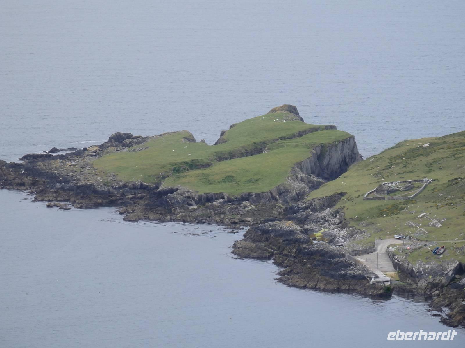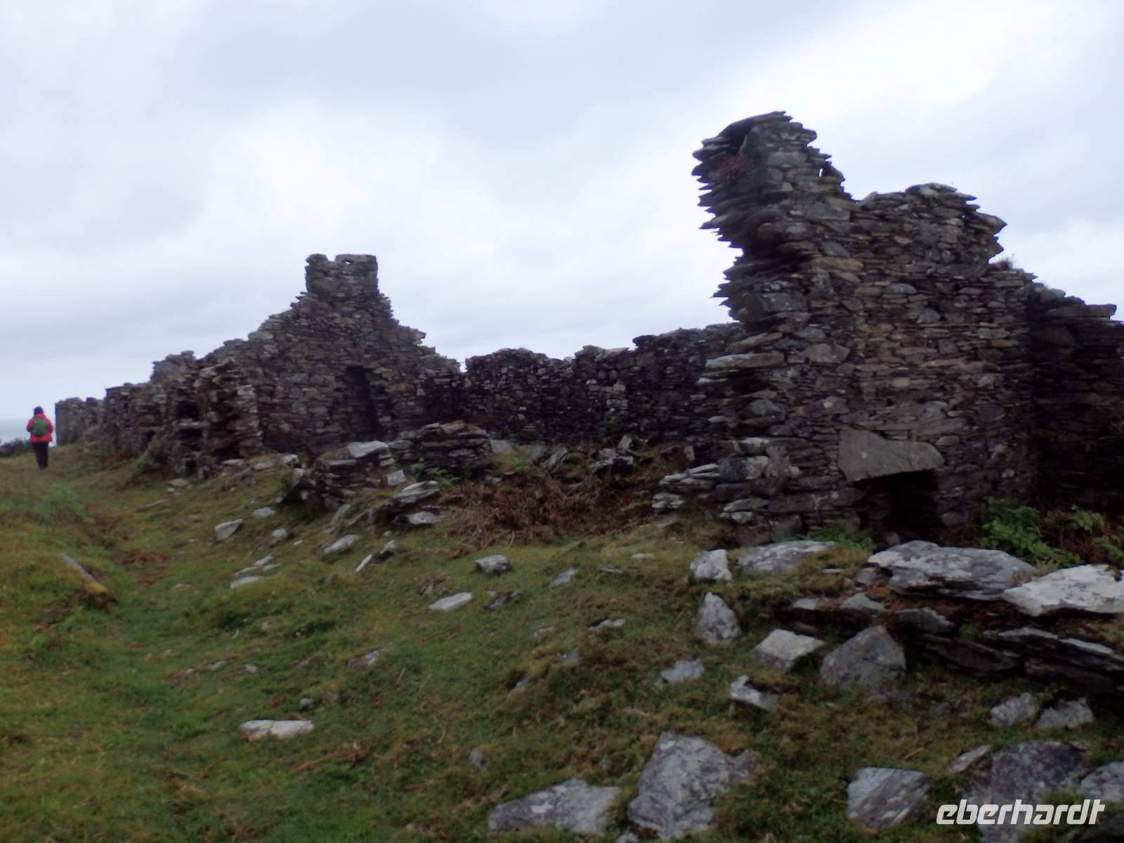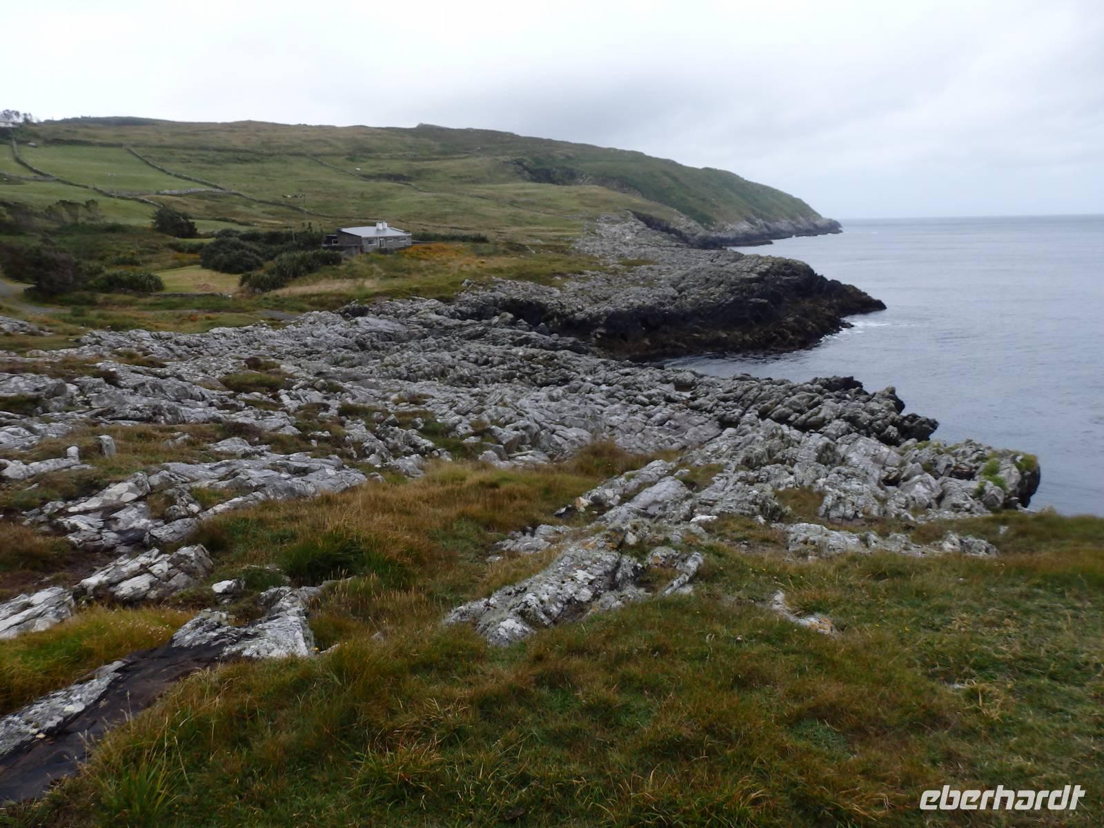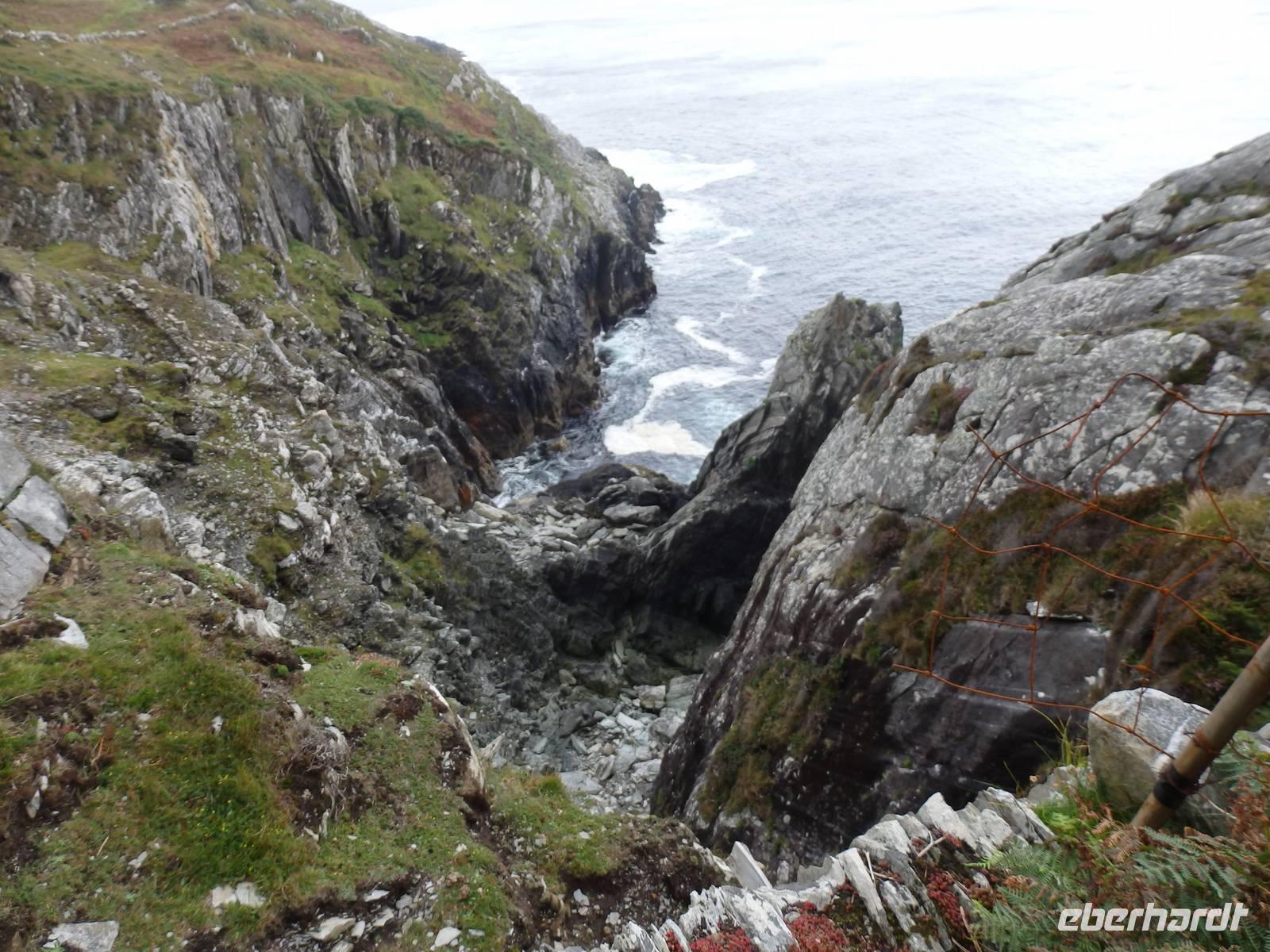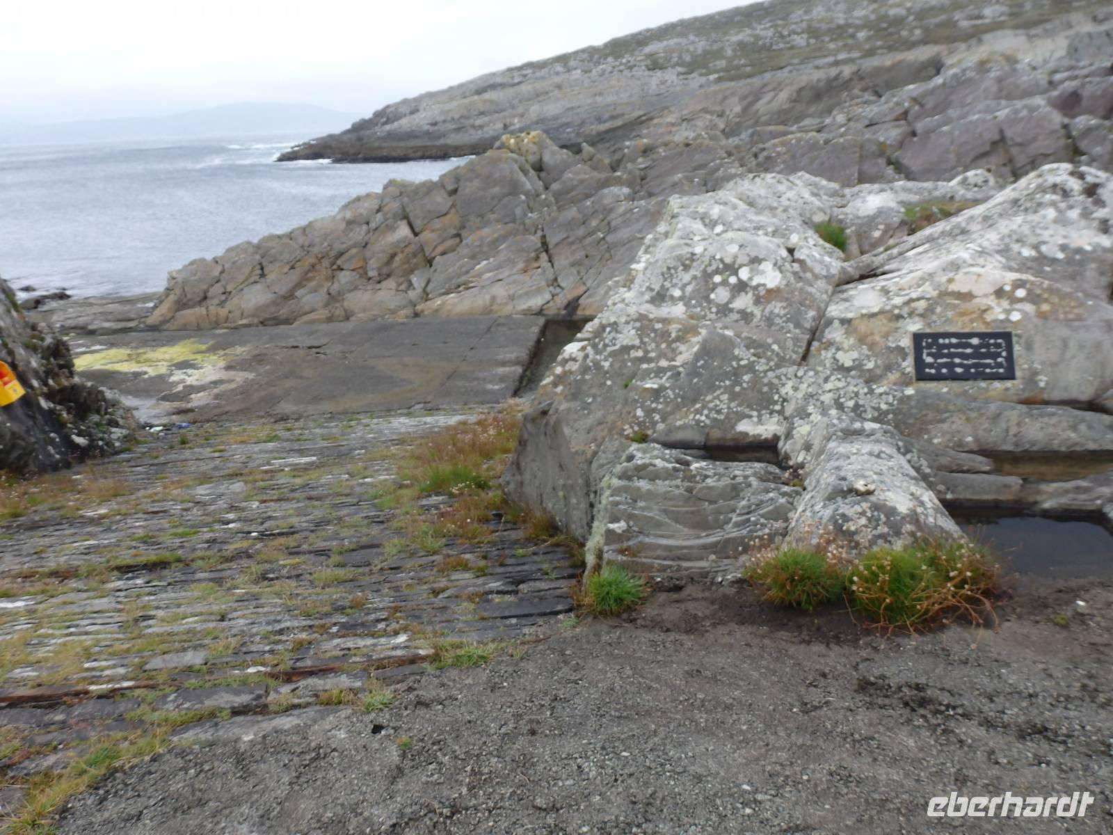Heute muss ich mich - leider - voin meiner Wandergruppe verabschieden. Nach dem Früphstück geht es mit Lunchpaket im Rucksack zum Bus, John fährt uns. In Bantry sehen wir auf dem Marktplatz einen großen Anker aus vergangenen Zeiten. Am Ufer stehen verlassene Getreidespeicher, von hier aus florierte der Export auf dem Seewege. Wir fahren an die Nordseite der Halbinsel und beginnen da unsere Wanderung. John hat Mühe mit dem Bus durch die immer enger werdenen Straßen zu kommen. Auf unserer Wandertour kommen wir vorbei an einer alten verlassenen Siedlung, sie beherbergte früher Bergleute, die in den Kupferminen ihren Lebensunterhalt verdienten. Hier auf Shepps Head gab es auch eine Reihe von Kupferminen insb. im 19. JH. Die Landschaft hier ist einzigartig schön, steile Klippen und kleine Buchten prägen das Gebiet. Wir kommen an einen künstlich angelegten See, der z.Z. des Kupferbergbaues in der Nähe der alten Minen angelegt wurde.