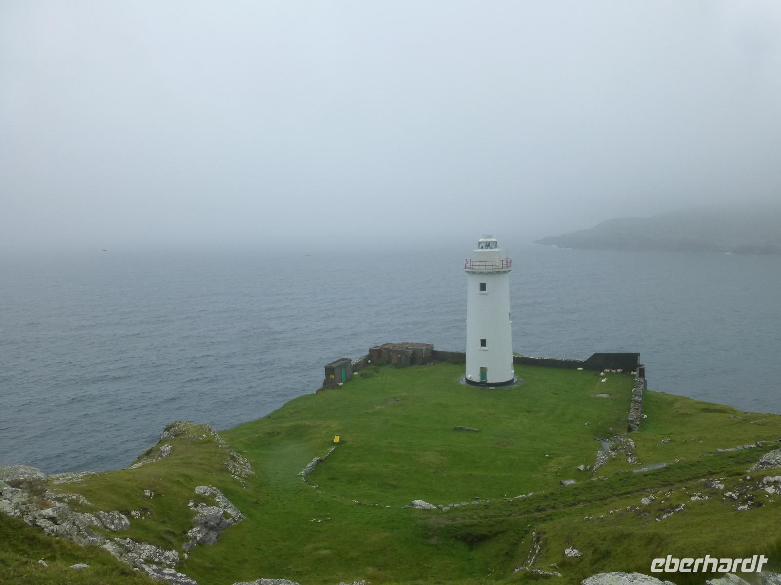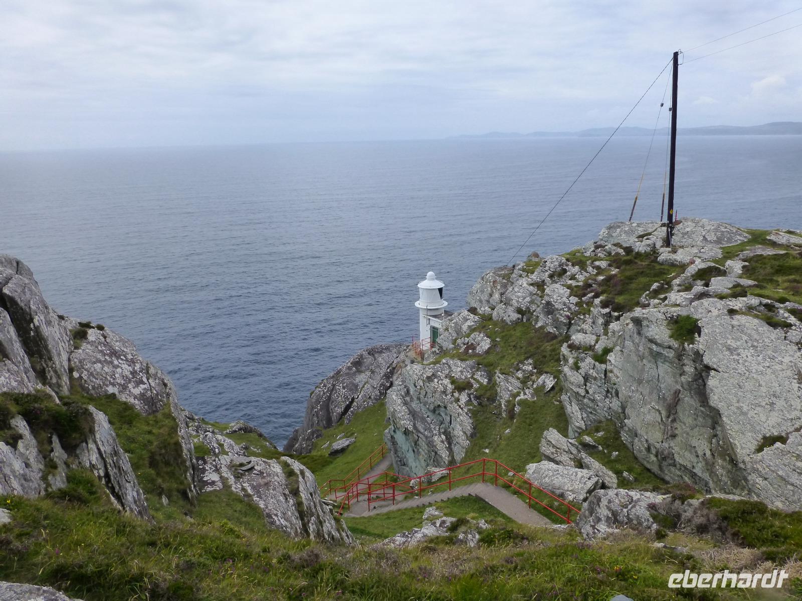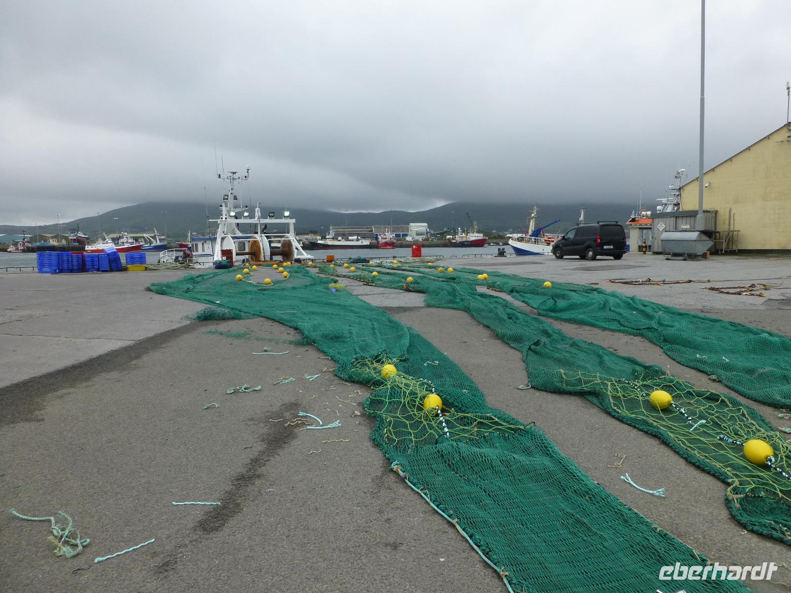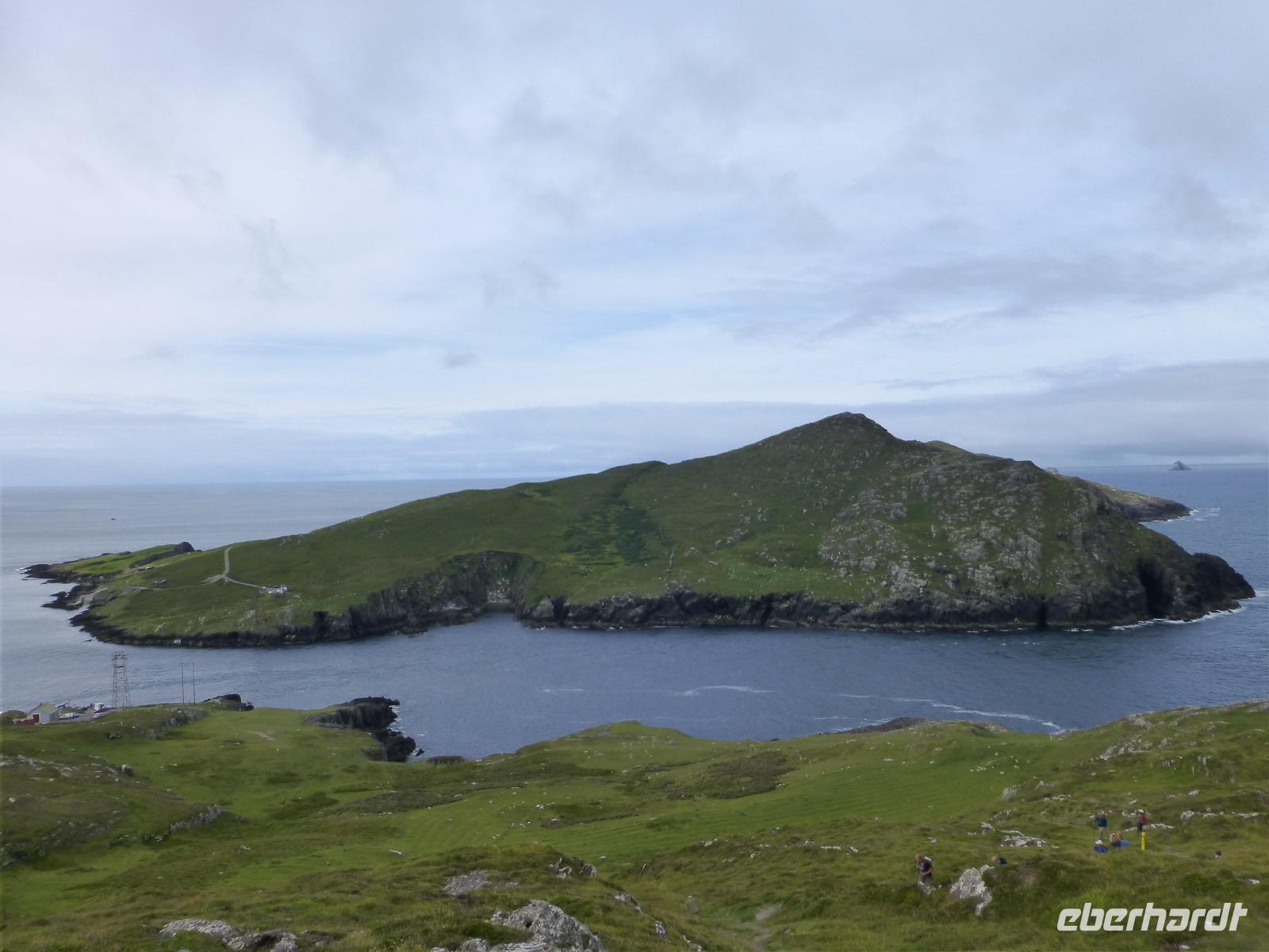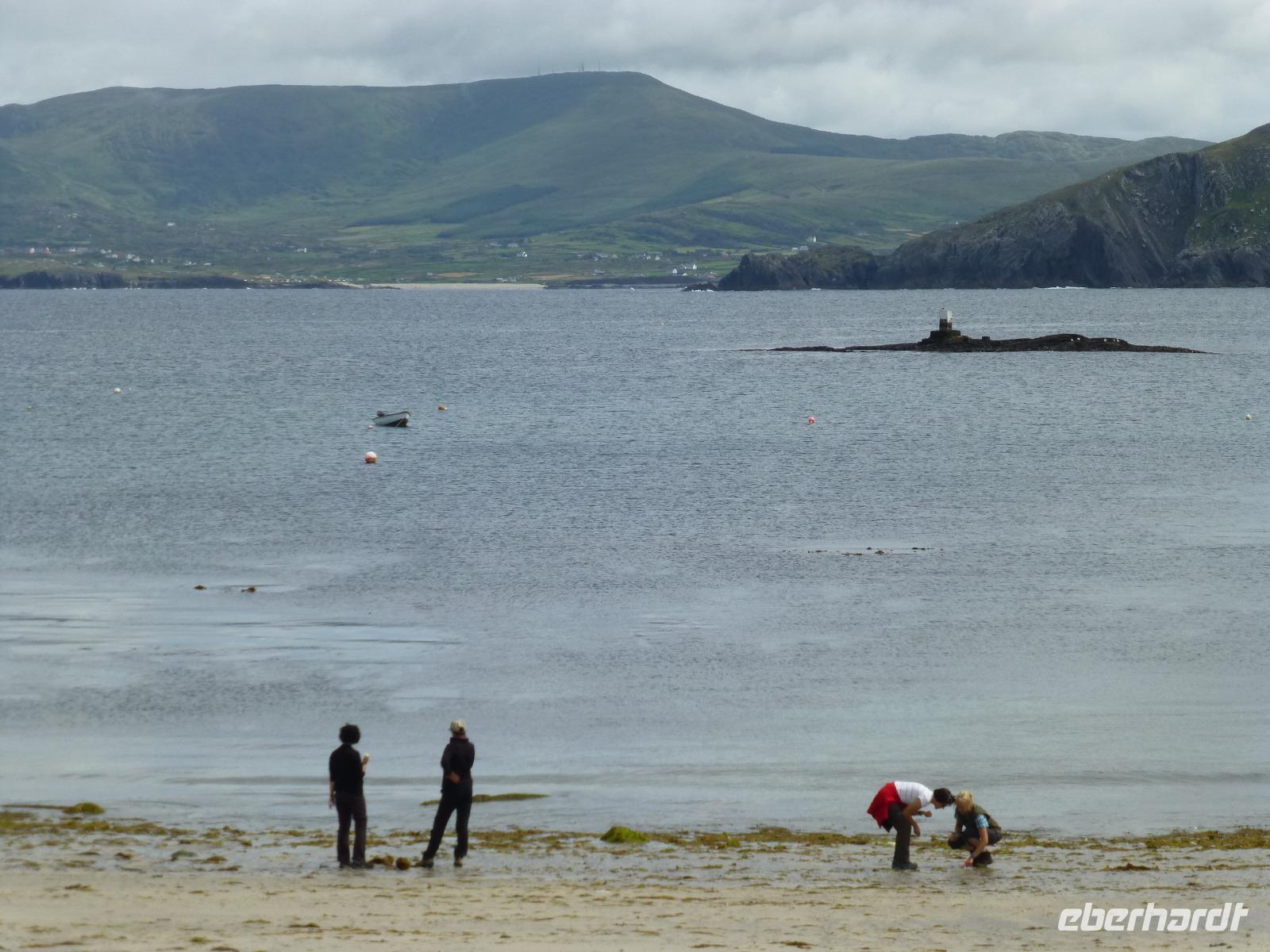 Am Morgen ist es ziemlich grau und regnet. Aber das Wetter soll laut Voraussage nicht zu schlecht werden. Unser Weg führt uns nach Castletownbere, einem Ort mit natürlichem Tiefseehafen und der irischen Fischereischule. Während des Wartens auf die Fähre nach Beare Island können wir Fischer beim Reparieren eines Schleppnetzes beobachten. Trotz aller modernen Technik ist da noch Handarbeit angesagt. Nach der kurzen Überfahrt beginnen wir unsere Wanderung. Bereits jetzt beginnt es leicht zu regnen. Unterwegs begegnen wir alten Geschützstellungen der britischen Armee, dieses hatte bis 1936 Schiffe der Royal Navy hier in einem Vertragshafen stationiert. Über einen alten Fahrweg erreichen wir an der Westspitze von Beare Island den Ardnakinna Leuchtturm, welcher seit 1965 in Betrieb ist. Von jetzt an weht uns eine steife Brise ins Gesicht, wir laufen durch eine tiefhängende Wolke und werden mit deren Wasser konfrontiert. Als wir am ehemaligen Signalturm, welcher 1964 bei einem Sturm einstürzte, eine Pause machen sind wir alle durchweicht.