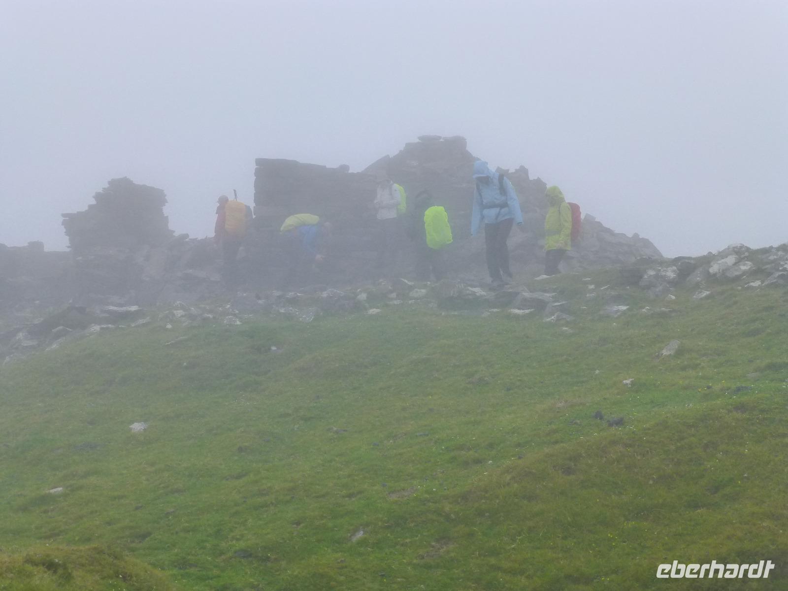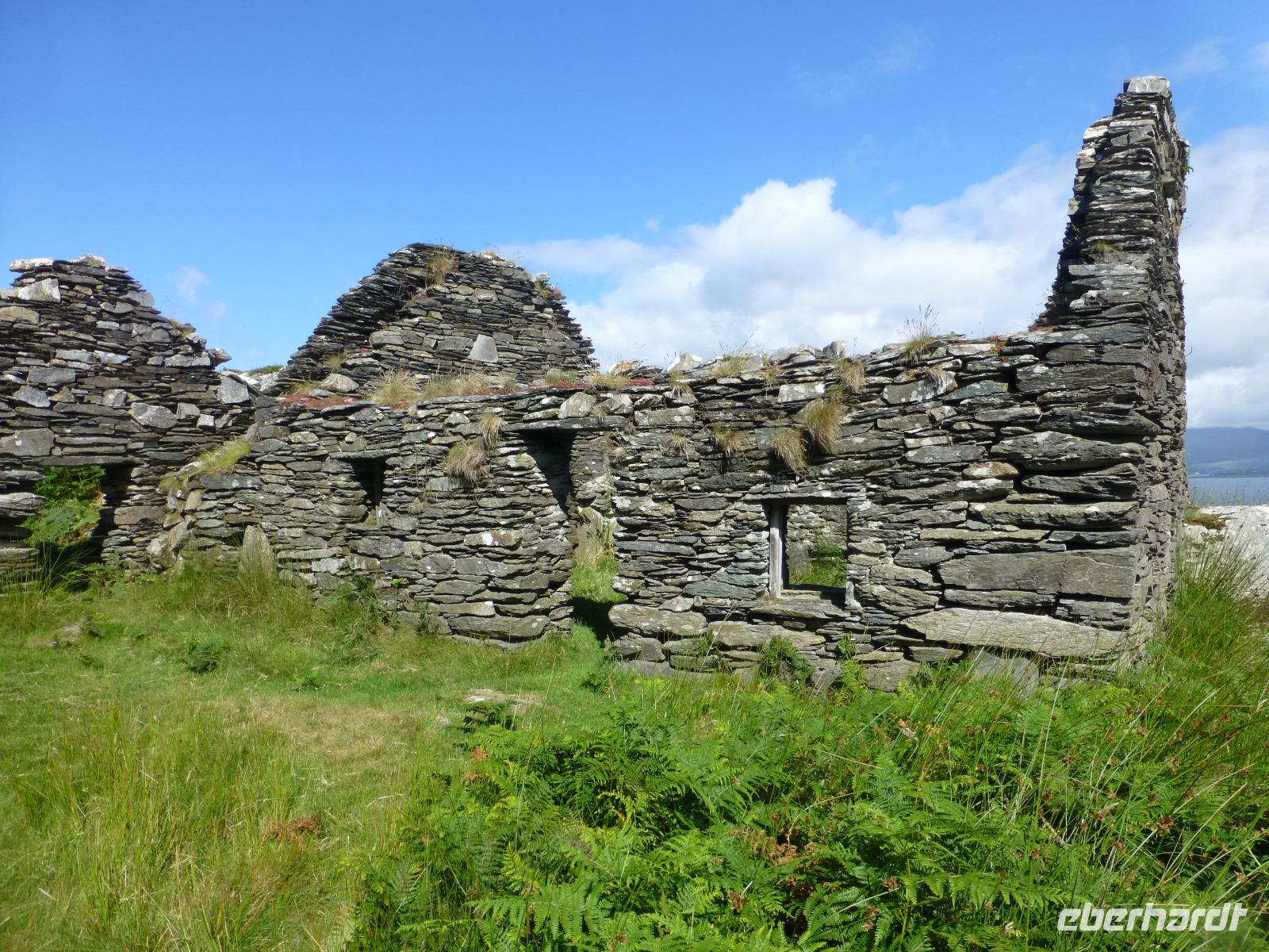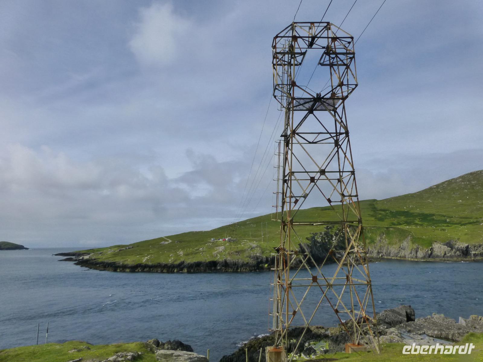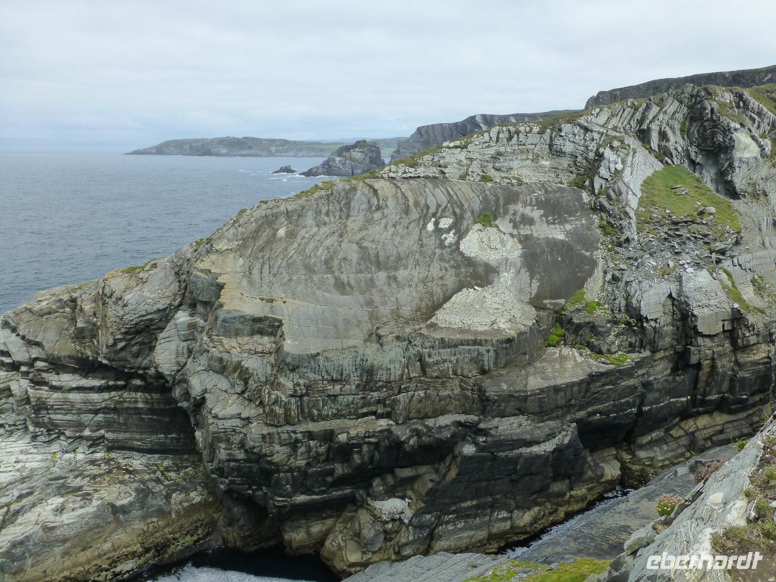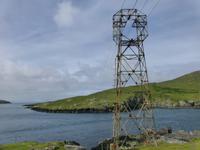 Am Morgen ist es ziemlich grau und regnet. Aber das Wetter soll laut Voraussage nicht zu schlecht werden. Unser Weg führt uns nach Castletownbere, einem Ort mit natürlichem Tiefseehafen und der irischen Fischereischule. Während des Wartens auf die Fähre nach Beare Island können wir Fischer beim Reparieren eines Schleppnetzes beobachten. Trotz aller modernen Technik ist da noch Handarbeit angesagt. Nach der kurzen Überfahrt beginnen wir unsere Wanderung. Bereits jetzt beginnt es leicht zu regnen. Unterwegs begegnen wir alten Geschützstellungen der britischen Armee, dieses hatte bis 1936 Schiffe der Royal Navy hier in einem Vertragshafen stationiert. Über einen alten Fahrweg erreichen wir an der Westspitze von Beare Island den Ardnakinna Leuchtturm, welcher seit 1965 in Betrieb ist. Von jetzt an weht uns eine steife Brise ins Gesicht, wir laufen durch eine tiefhängende Wolke und werden mit deren Wasser konfrontiert. Als wir am ehemaligen Signalturm, welcher 1964 bei einem Sturm einstürzte, eine Pause machen sind wir alle durchweicht.