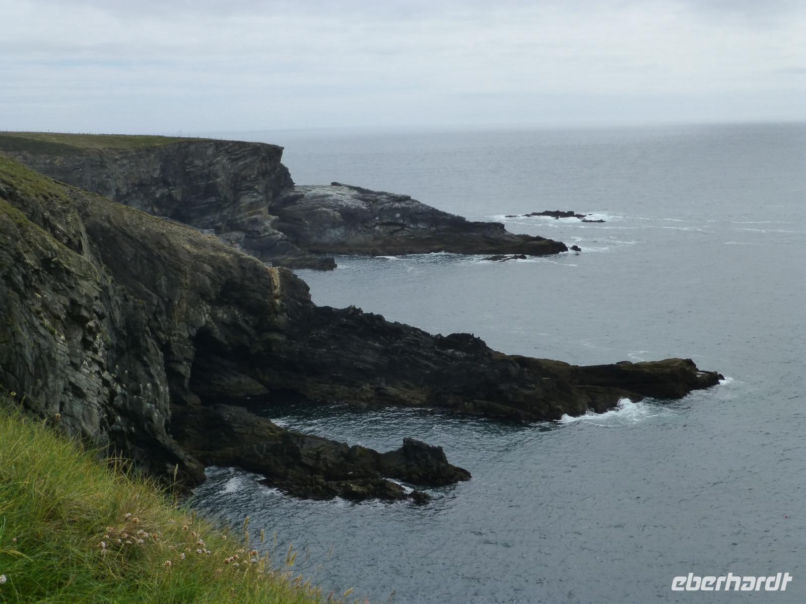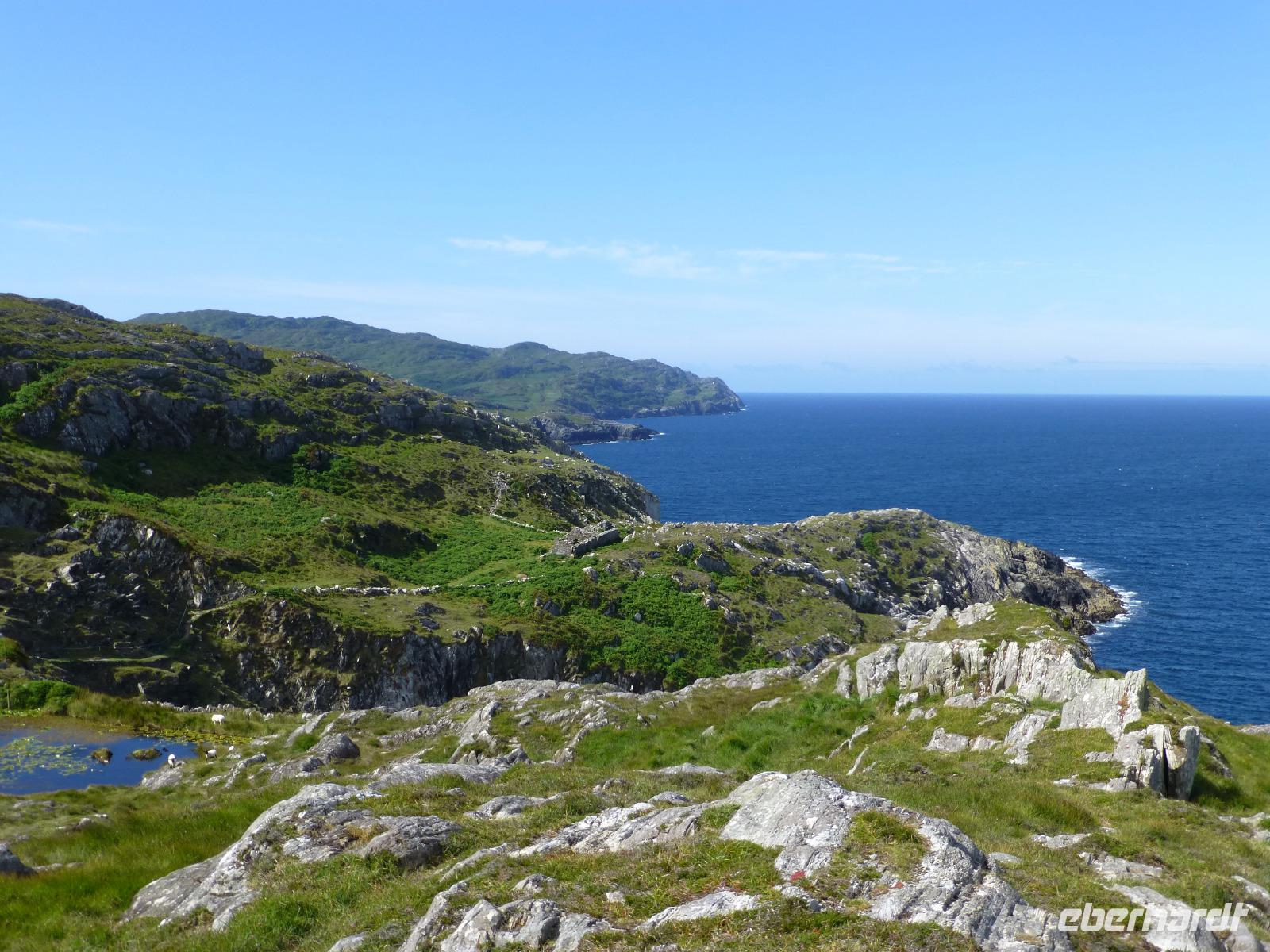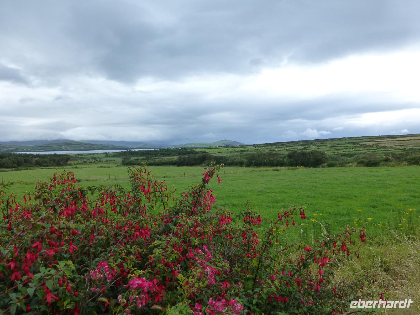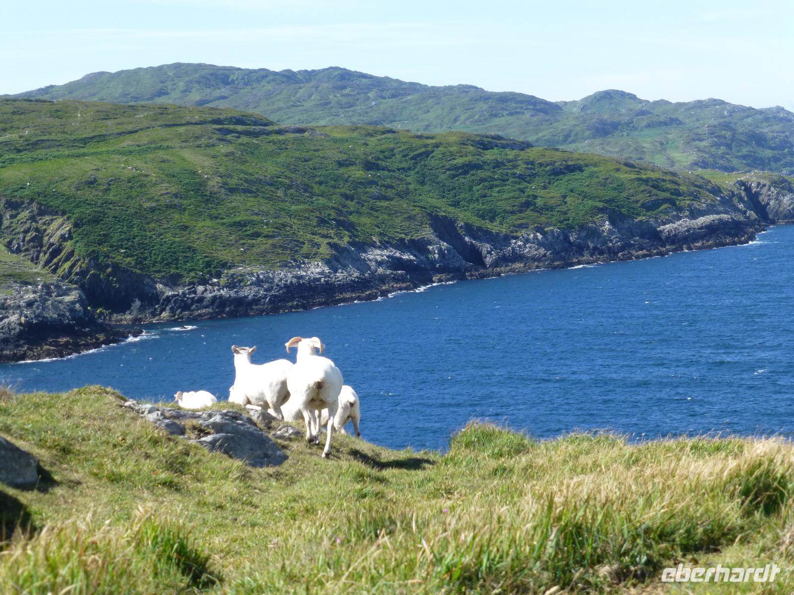 Der Morgen zeigt sich heute trüb, doch bereits kurz nach unserer Abfahrt zum Sheeps Head sieht man deutlich wie die Sonne heraus will. Über Bantry und Durrus geht es auf die Halbinsel mit dem Namen "Schafskopf". Wir passieren Ahakista und Kilcrohan und danach wird die Straße immer schmaler. Mit Niall am Steuer sollte alles gut gehen und so erreichen wir auf schmaler Straße, sie ist gerade so breit wie unser kleiner Bus, unseren Wanderausgangspunkt Cahergal. Das Wetter? Zeigt sich hier auf der Halbinsel von seiner besten Seite. Auf unserem Weg passieren wir die Reste des alten Minersvillage, auch hier am Sheeps Head hat man versucht im 19. Jh. Kupfer abzubauen. Mit Blick auf die Bantry Bay führt der Weg entlang einer bezaubernden Klippenlandschaft. Unsere Mittagpause machen wir an einem windstillen Plätzchen, umrahmt von zahlreichen Strandnelken welche in den Felsspalten blühen. Der Weg führt uns dann langsam aufwärts, immer mal wieder müssen wir kleine Feuchtwiesen überwinden. Schließlich erreichen wir den 1965 errichteten Leuchtturm ganz im Westen der Sheeps Head Halbinsel. Von Ferne sehen wir auch den Leuchtturm auf Beare Island, an welchem wir morgen vorbei wandern werden. Vom Leuchtturm wandern wir nochmals bergan zum Endziel unserer Tour am Parkplatz von Toreen. Hier wartet nicht nur Niall mit dem Bus auf uns sondern auch ein kleines Cafe mit reichlich Belohnung für die hinter uns liegende Wanderung. Und das Wetter? Es war den ganzen Tag wunderschön, nur am Ende zog etwas „Seafog" auf.