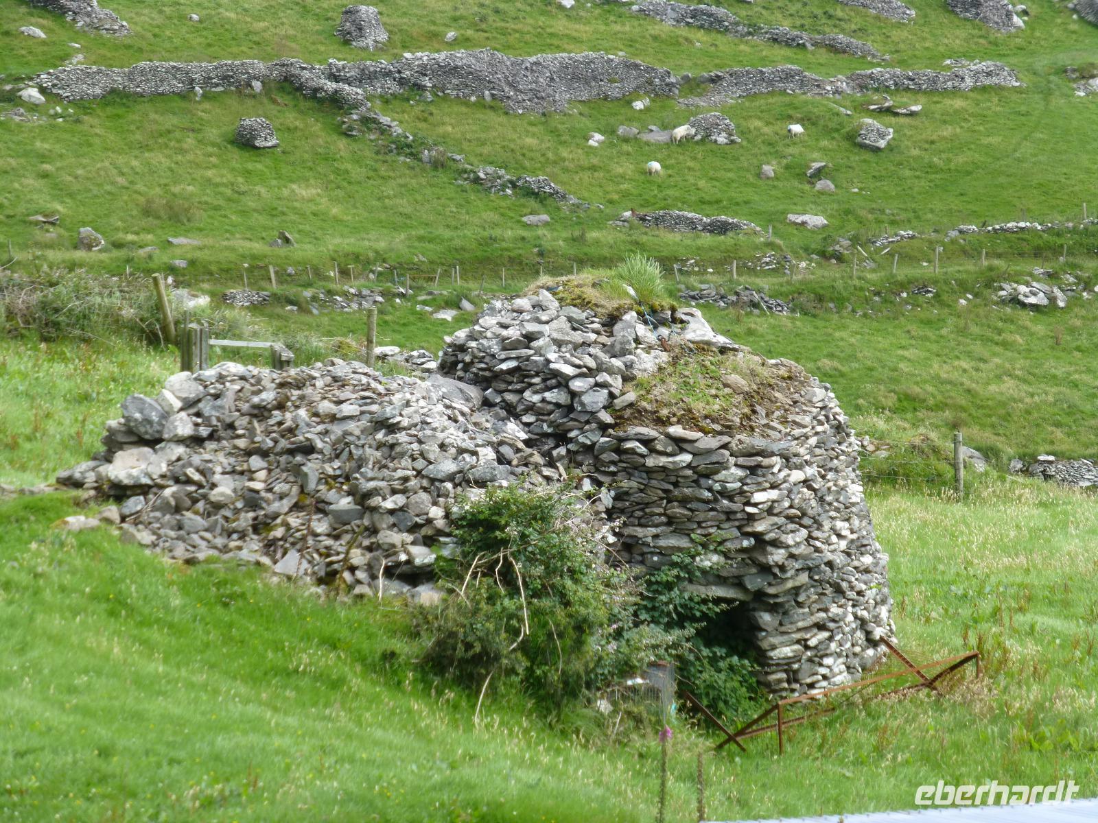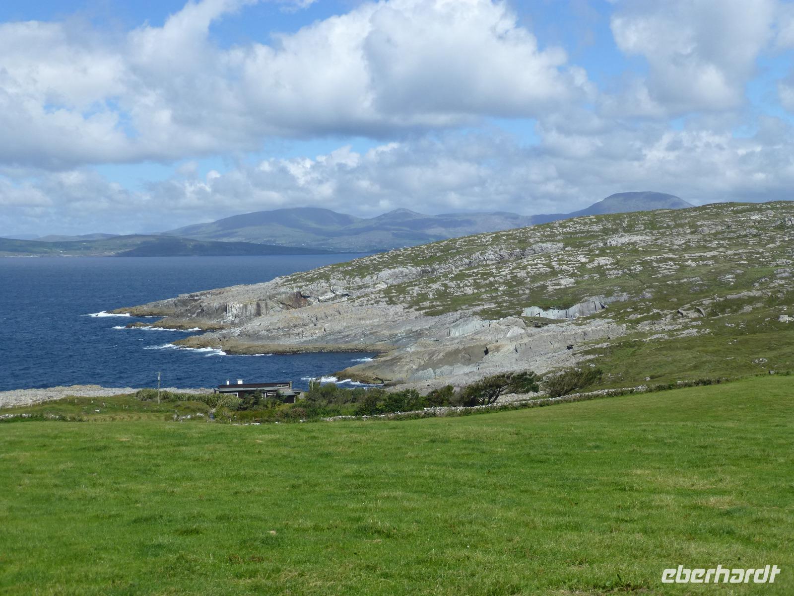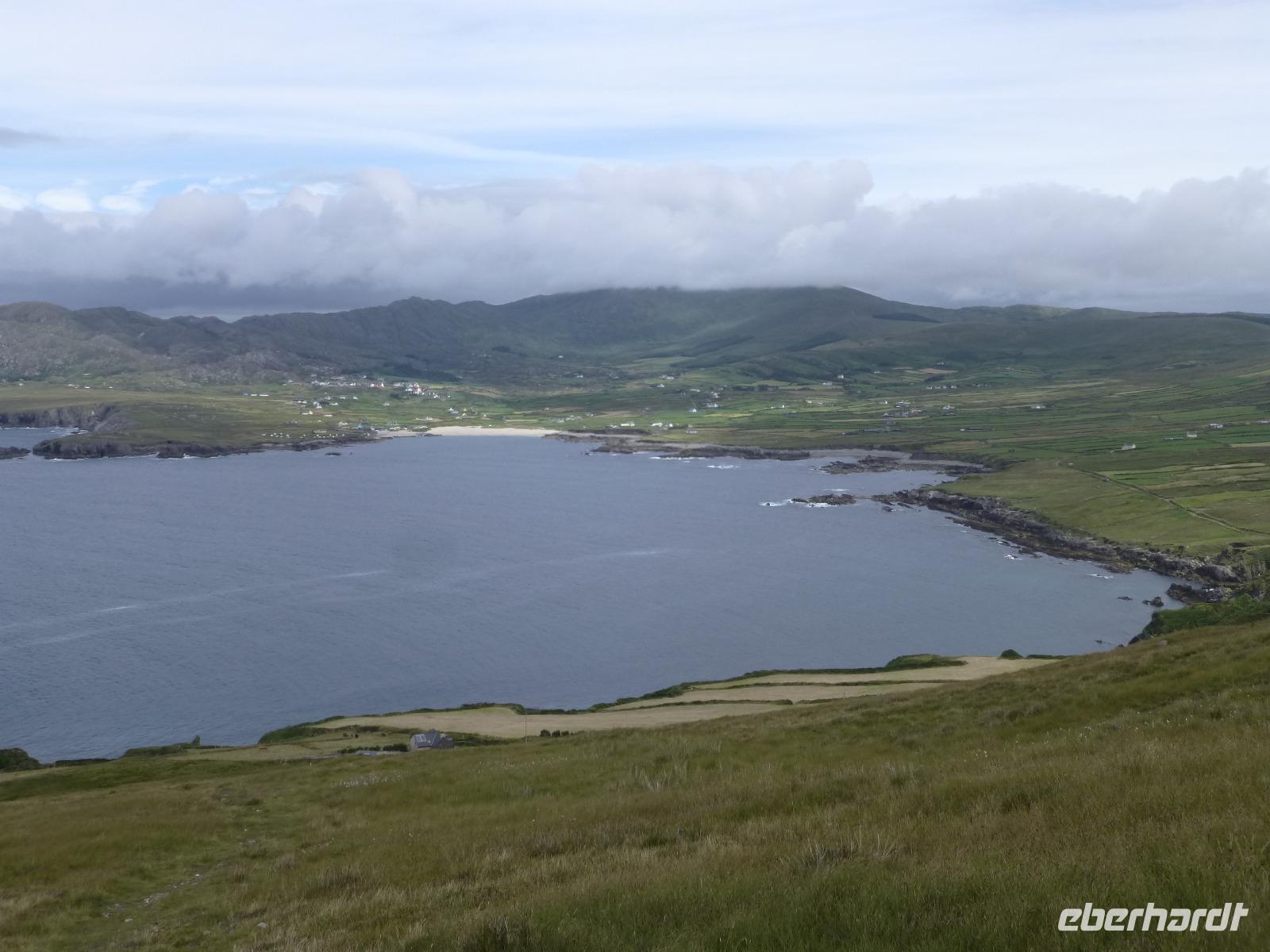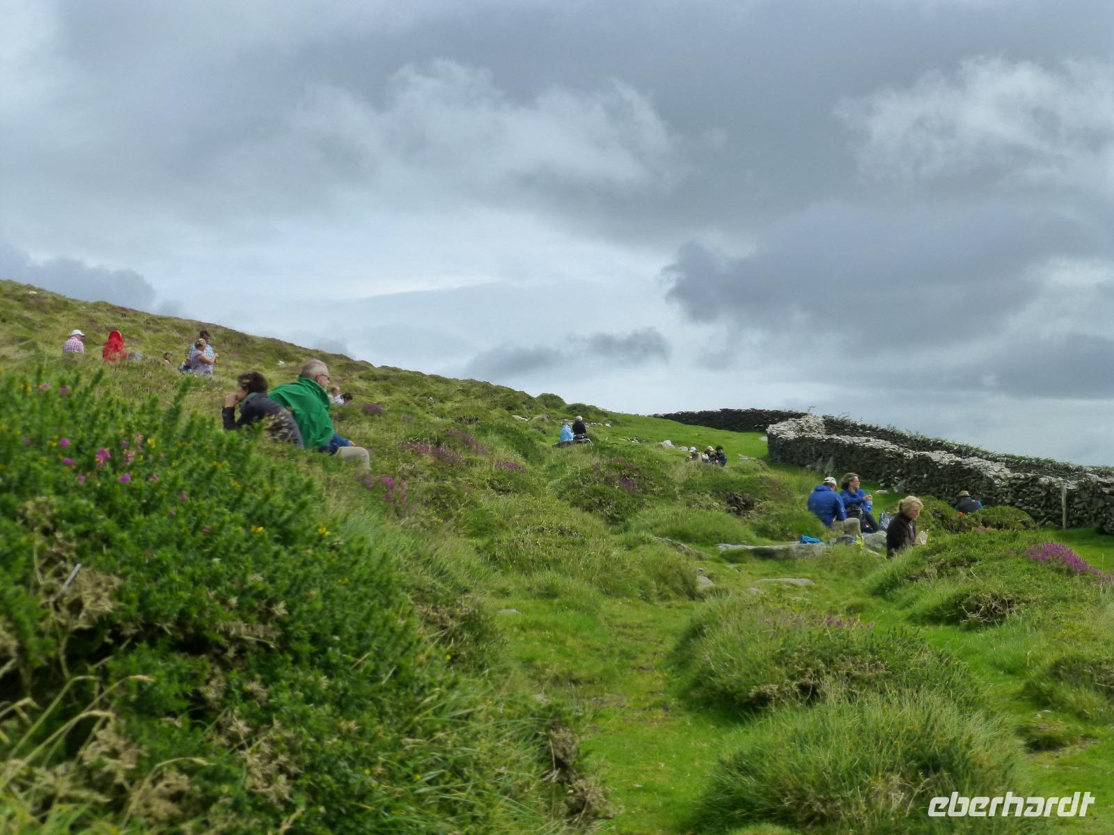 Nach dem Frühstück und der Verteilung der Lunchpakete machen wir uns auf den Weg. Das Wetter wird einbisschen Wechselhaft, aber nicht zu schlecht. Vorbei an Dingle erreichen wir Ventry Harbour. An Paddie O'Shea's Pub beginnt unser Wanderung. Zuerst entlang des Strandes laufen wir später durch eine kleine Siedlung und zwischen Weideflächen entlang. Nachdem wir ein Stück entlang der Straße zum Slea Head gelaufen sind mache wir eine Pause mit schönem Blick auf die Küste und die gegenüber der Dingle Bay liegenden Iveragh Halbinsel. Durch Schafweiden, natürlich mit Kontakt zu den Vierbeinern, erreichen wir oberhalb des Slea Head bei Dunquinn das Ende unserer Wanderung. Niall wartet schon auf uns, gemeinsam fahren wir nach Ballyferriter für eine Kaffeepause. Auf dem Weg zurück nach Dingle stoppen wir noch beim Galarus Oratory. Bei diesem Gebäude handelt es sich um ein frühchristliches Gebetshaus, welches in perfekter Trockensteinbauweise vor ca. 1300 Jahren errichtet wurde. Nach einem kurzen Stopp in Dingle erreichen wir am Abend wieder unser Hotel.