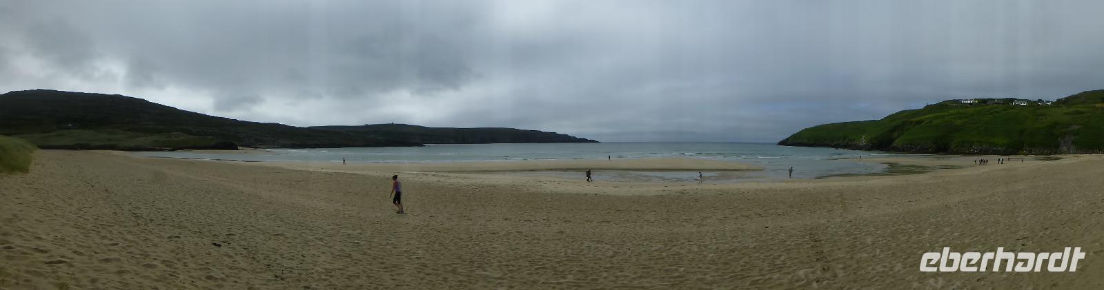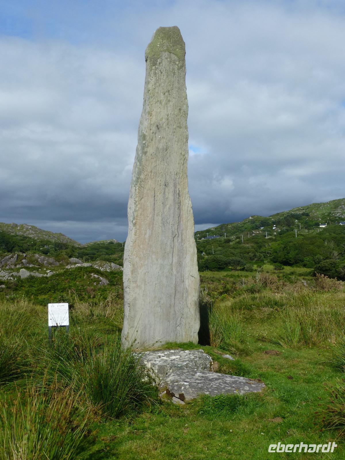 Das Wetter zeigt sich heute wieder von seiner besten Seite. Unser Buschauffeur Niall hat heute seinen freien Tag, am Steuer sitzt dafür John. Vom Hotel fahren wir über Casteltownbere zur Dursey Cable Car Station. Diese liegt ganz im Westen der Beara Halbinsel. Als erste und einzige Seilbahn Irlands 1969 erbaut, befördert sie in erster Linie Tiere auf oder von der 400 m entfernt liegenden Insel. Wir machen uns auf den Weg, es geht bergan, wir folgen immer den gelben Wegmarkierungen. Vom höchsten Punkt des ersten Teilabschnittes, 121 m über dem Meer, öffnet sich der Blick zurück auf Dursey Island bzw. voraus auf Garinish Pier und den Strand von Ballydonegan. Am Sandstrand von Garinish machen wir unsere Mittagspause mit den "Homemade Sandwiches" aus unserem Hotel. Nach unserer Wanderung genießen wir im O'Neils Pub in Allihies eine Erfrischung. Zum Abschluss des Tages sehen wir uns noch den Ogham Stone von Ballycrovane an. Mit 5,3 m Höhe ist er der höchste Schriftstein in Europa und stammt etwa von 800-700 v.Ch. Über Eyeries und Castletownbere erreichen wir am Abend wieder Glengarriff.