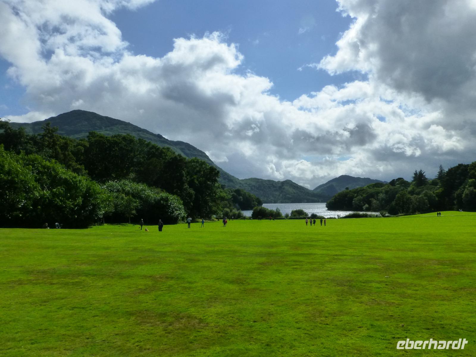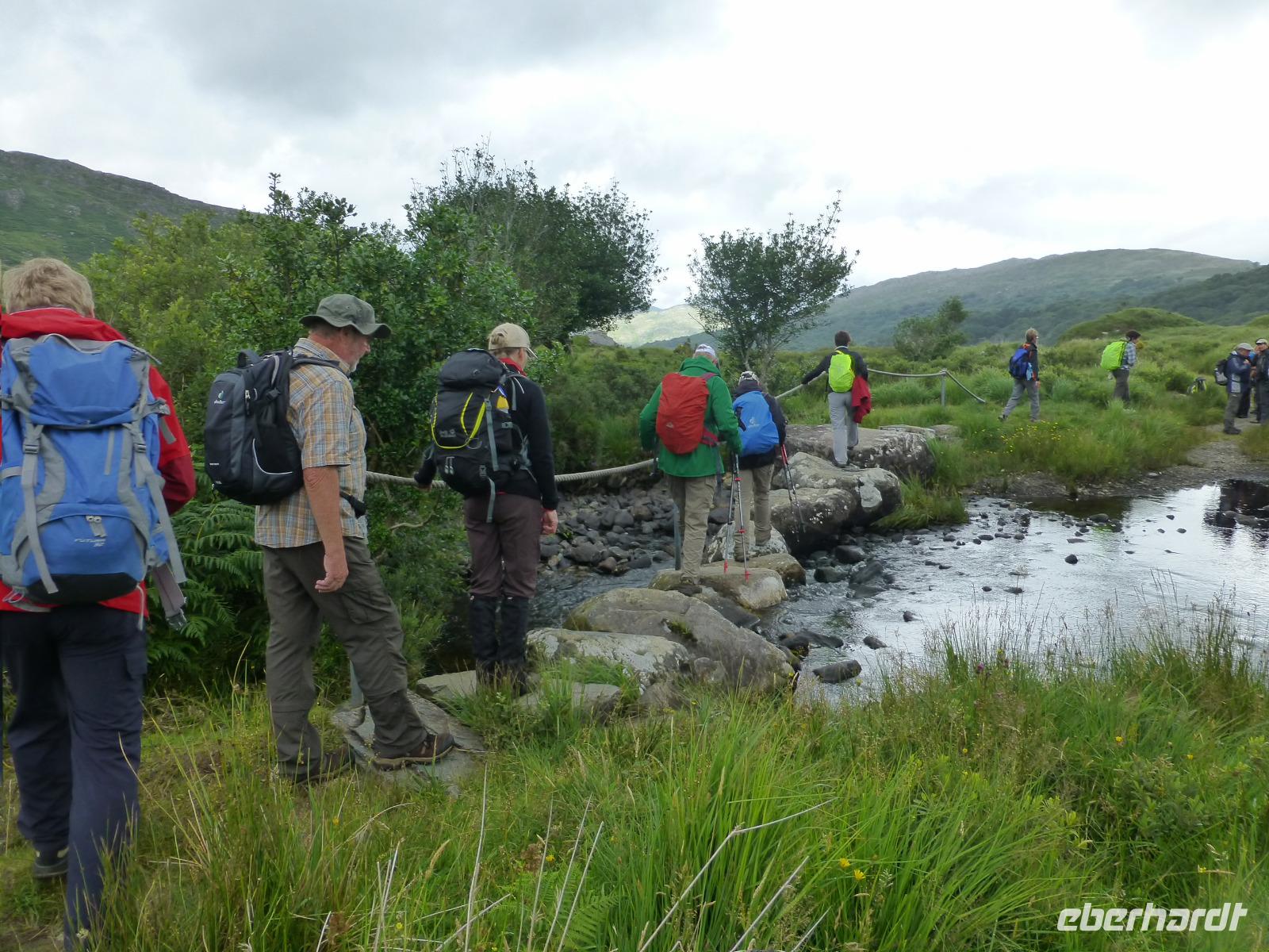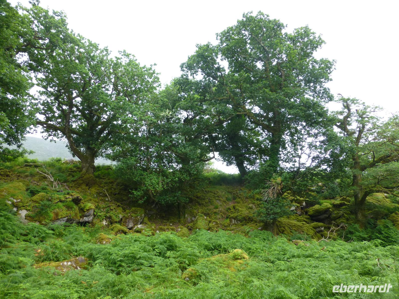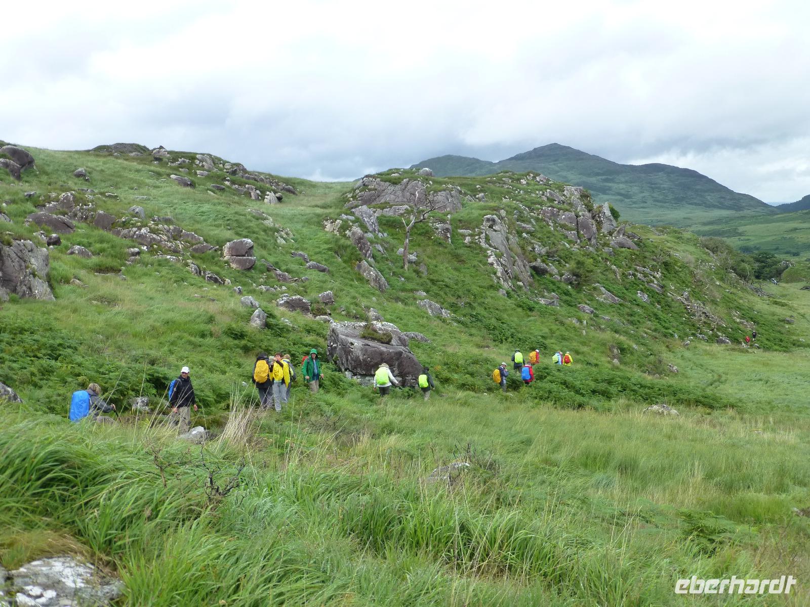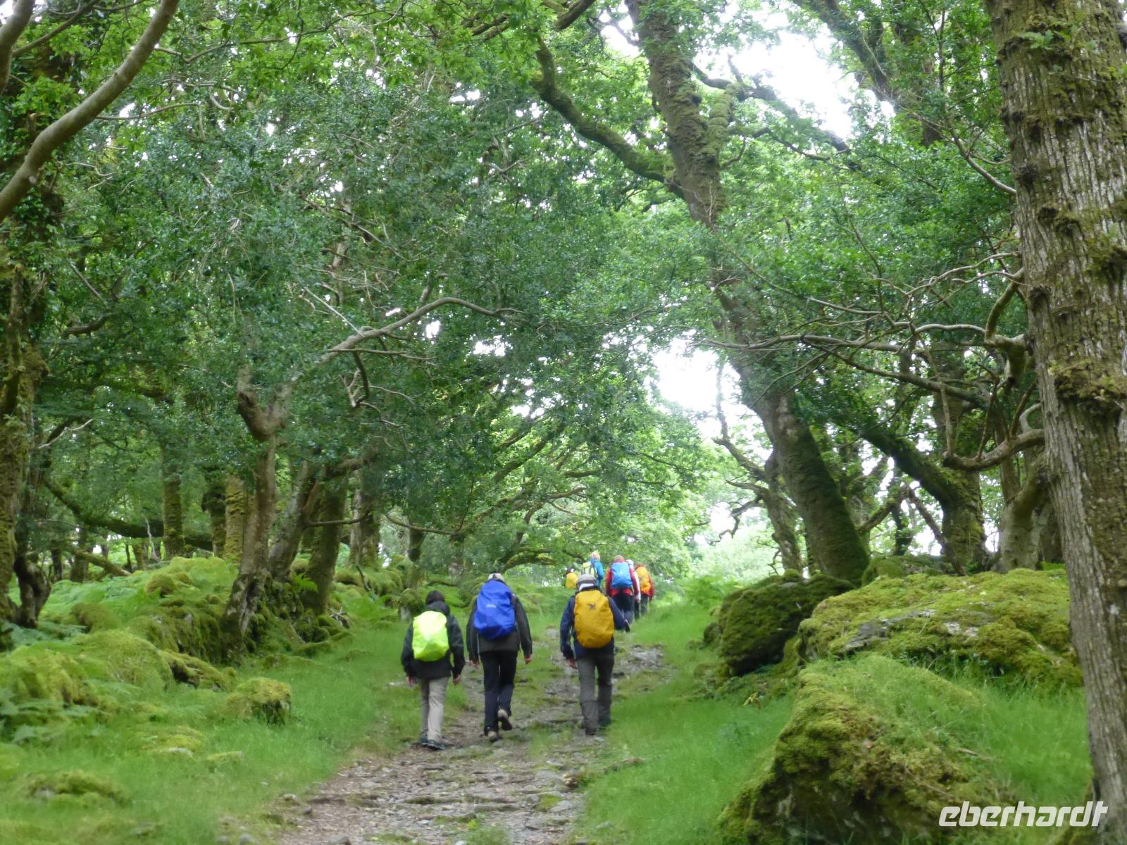 Am Morgen fahren wir von Glengarriff über den Caha Pass nach Kenmare. Etwas außerhalb des Ortes beginnt unsere Wanderung auf der Old Kenmare Road. Diese Straße war in früheren Zeiten die Verbindung zwischen Kenmare und Killarney. Zuerst steigt der Weg an und nach Erreichen eines kleinen Passes mit dem Namen Windy Gap weitet sich der Blick in das vor uns liegende Tal, gleichzeitig sieht man beim Blick zurück die Bucht von Kenmare. Mit Sonnenschein und kräftigem Gegenwind geht es hinab ins Tal. Mit dem Erreichen des Killarney Nationalpark ändert sich das Landschaftsbild, die schroffe Landschaft und wir laufen in einen grünen alten Eichenwald hinein mit einer Vielzahl an moosbedeckten Steinen. Es entsteht der Eindruck als befänden wir uns in einem Märchenwald, es fehlt eigentlich nur noch die Begegnung mit einem irischen Kobold, einem Leprechaun. Unter einem der alten Bäume machen wir unsere Mittagspause. Im weiteren Verlauf des Weges öffnet sich die Landschaft wieder, wir laufen zum Teil über Bohlenwege, da vielfach morastiges Gebiet vorhanden ist. Ein kleiner Wasserfall lädt zu einer Pause ein, bevor wir den letzten Teil des Weges zum Torc Waterfall in Angriff nehmen. Am Wasserfall wartet Niall mit dem Bus auf uns. Bevor wir ins Hotel fahren machen wir noch einen Halt im Muckrosspark. Der ehemalige Herrensitz der Familie Herbert mit seinem exzellenten Garten und Landschaftspark ist eine Augenweide. Nach Ankunft im Hotel werden wir mit einem Irish Coffee begrüßt, ein Geschenk unseres irischen Partners Michael Ryan. Einige von unserer Gruppe besuchen am Abend die irische Show "Celtic Steps" mit traditioneller Musik und viel Stepptanz.