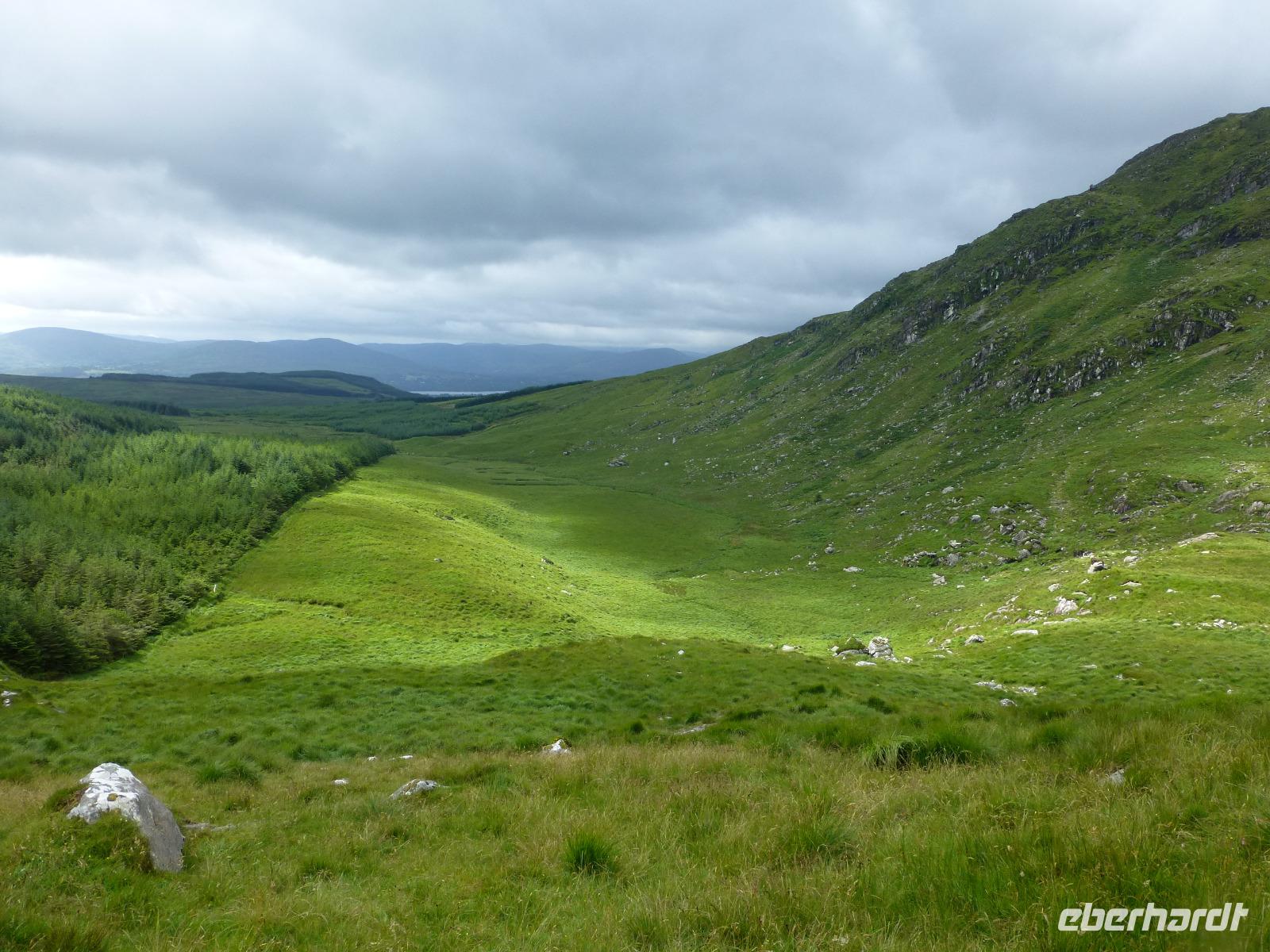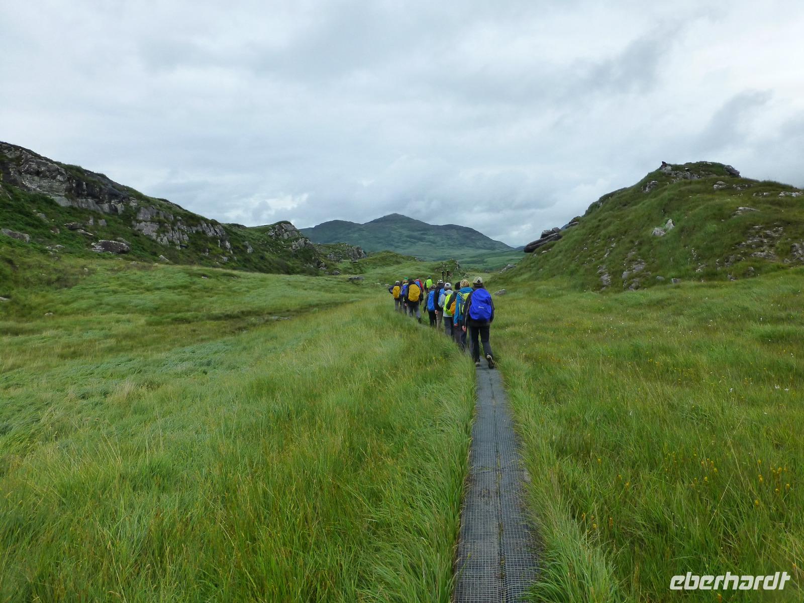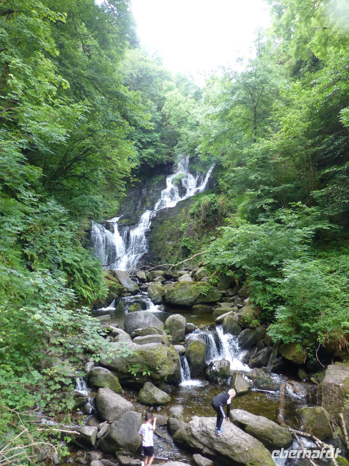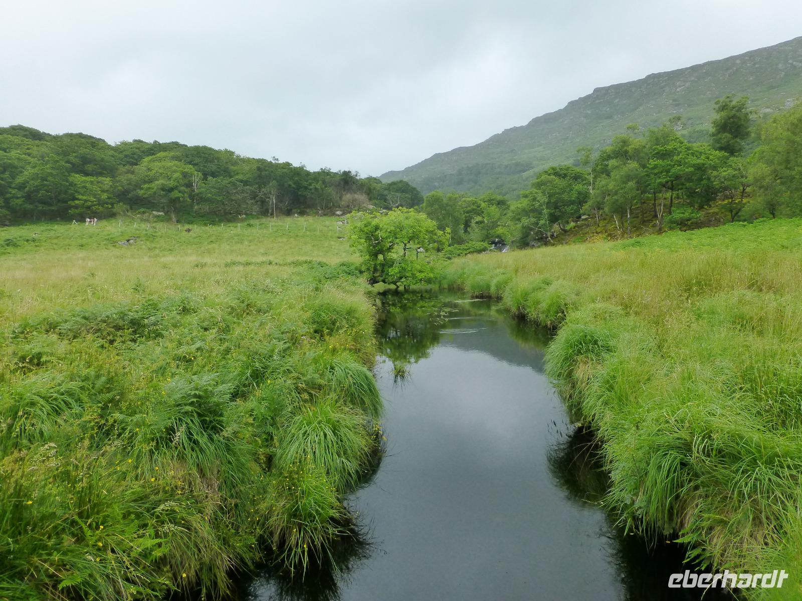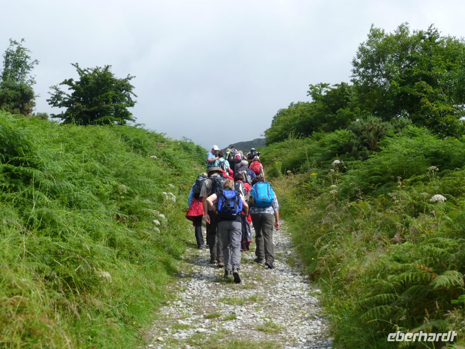 Am Morgen fahren wir von Glengarriff über den Caha Pass nach Kenmare. Etwas außerhalb des Ortes beginnt unsere Wanderung auf der Old Kenmare Road. Diese Straße war in früheren Zeiten die Verbindung zwischen Kenmare und Killarney. Zuerst steigt der Weg an und nach Erreichen eines kleinen Passes mit dem Namen Windy Gap weitet sich der Blick in das vor uns liegende Tal, gleichzeitig sieht man beim Blick zurück die Bucht von Kenmare. Mit Sonnenschein und kräftigem Gegenwind geht es hinab ins Tal. Mit dem Erreichen des Killarney Nationalpark ändert sich das Landschaftsbild, die schroffe Landschaft und wir laufen in einen grünen alten Eichenwald hinein mit einer Vielzahl an moosbedeckten Steinen. Es entsteht der Eindruck als befänden wir uns in einem Märchenwald, es fehlt eigentlich nur noch die Begegnung mit einem irischen Kobold, einem Leprechaun. Unter einem der alten Bäume machen wir unsere Mittagspause. Im weiteren Verlauf des Weges öffnet sich die Landschaft wieder, wir laufen zum Teil über Bohlenwege, da vielfach morastiges Gebiet vorhanden ist. Ein kleiner Wasserfall lädt zu einer Pause ein, bevor wir den letzten Teil des Weges zum Torc Waterfall in Angriff nehmen. Am Wasserfall wartet Niall mit dem Bus auf uns. Bevor wir ins Hotel fahren machen wir noch einen Halt im Muckrosspark. Der ehemalige Herrensitz der Familie Herbert mit seinem exzellenten Garten und Landschaftspark ist eine Augenweide. Nach Ankunft im Hotel werden wir mit einem Irish Coffee begrüßt, ein Geschenk unseres irischen Partners Michael Ryan. Einige von unserer Gruppe besuchen am Abend die irische Show "Celtic Steps" mit traditioneller Musik und viel Stepptanz.