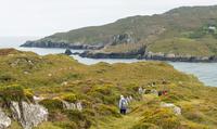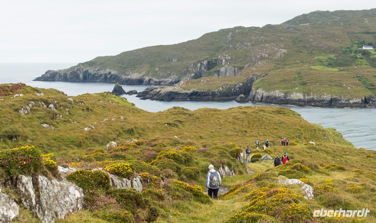 Mit dem Bus fahren wir nach Caherulagh auf der Mizenhalbinsel und entlang des markierten Sheeps Head Weges wandern wir auf mittlerer Höhe westwärts. Immer wieder schweift der Blick dabei über die Dunmanus Bucht zur südlich gelegenen Mizen Head Halbinsel.