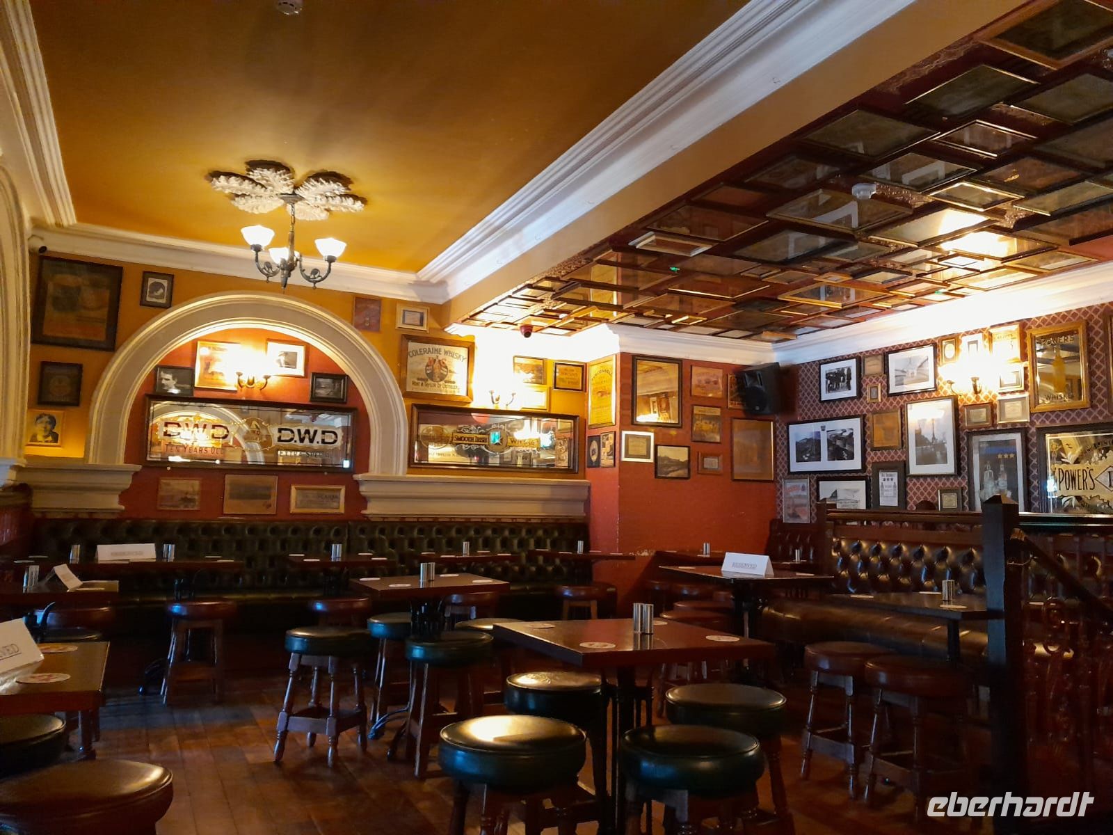 Mit „Fluid sunshine“- „Flüssigem Sonnenschein“ – wurden wir dann auch typisch irisch begrüßt. Passender hätte das Wetter an diesem ersten Tag in Irland nicht sein können, denn, getreu des Zitates eines der örtlichen Destiller: „In Irland regnet es viel, und hier in Slane freuen wir uns darüber. Wir fangen Regenwasser auf, sammeln es und bereiten es als Brauchwasser auf. Durch diese Wiederverwendung verringern wir unsere Abhängigkeit vom Fluss Boyne.“ Die sehr persönliche Führung, die man am besten mit dem Satz „Wo irischer Whiskey auf Familientradition trifft“, beschreiben könnte, hat uns allen sehr gut gefallen – informativ, interessant, humorvoll. Dazu Ein Tasting der besten „Pott Still Whiskeys“, gereift in Bourbon, Virgin Eichen oder Oloroso Fässern gereicht mit schmackhaften Canapés. So gestärkt fuhren wir nach Dublin in unser 4 * Hotel Iveagh Gardens Hotel in der Nähe des „St.Stephens Green“. Nachdem wir eingecheckt hatten machten wir uns schon bald auf den Weg und zum „Merchants Arch Pub“ am Ufer des Flusses Liffey. Der Pub wurde übrigens schon im Jahre 1828 erbaut und diente lange Jahre der Dubliner Kaufmannsgilde als Versammlungsort. Dort nahmen wir unser heißersehntes erstes gemeinsames Dinner ein, denn wir waren hungrig und müde von einem langen, aber überaus interessanten Tag. Da durfte das erste „Pint“ Guinness natürlich nicht fehlen.