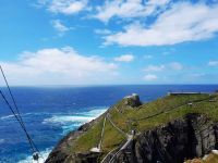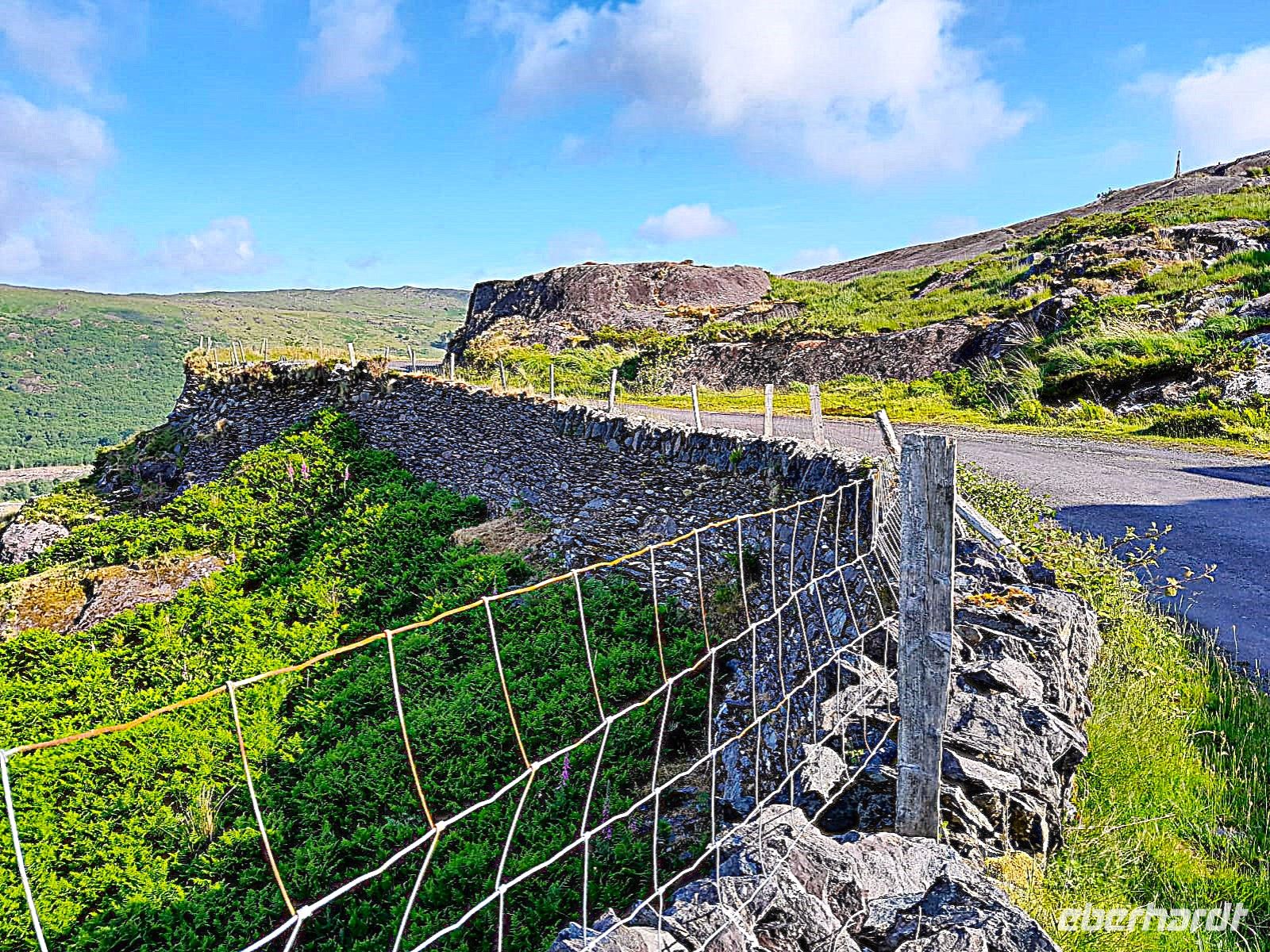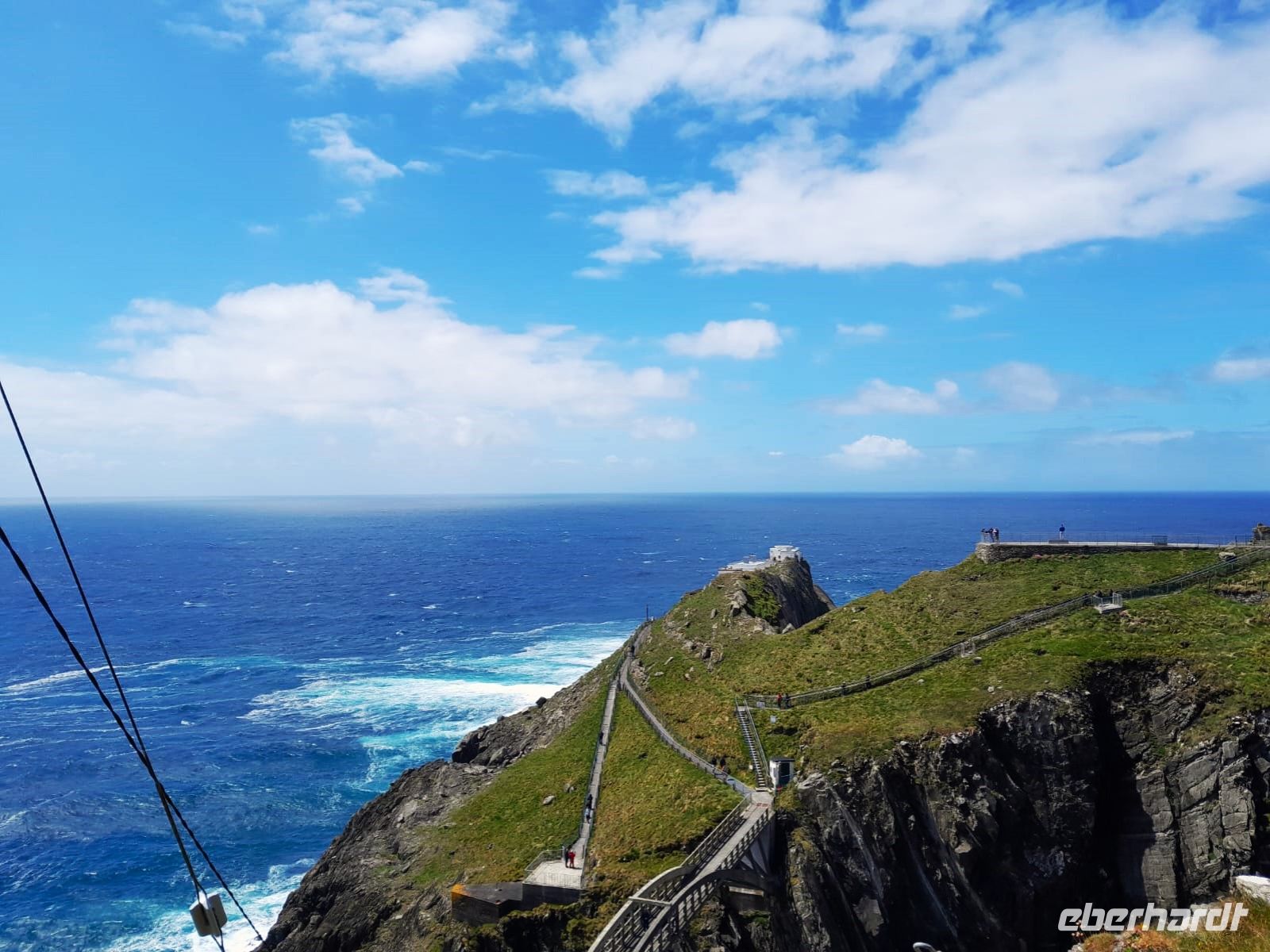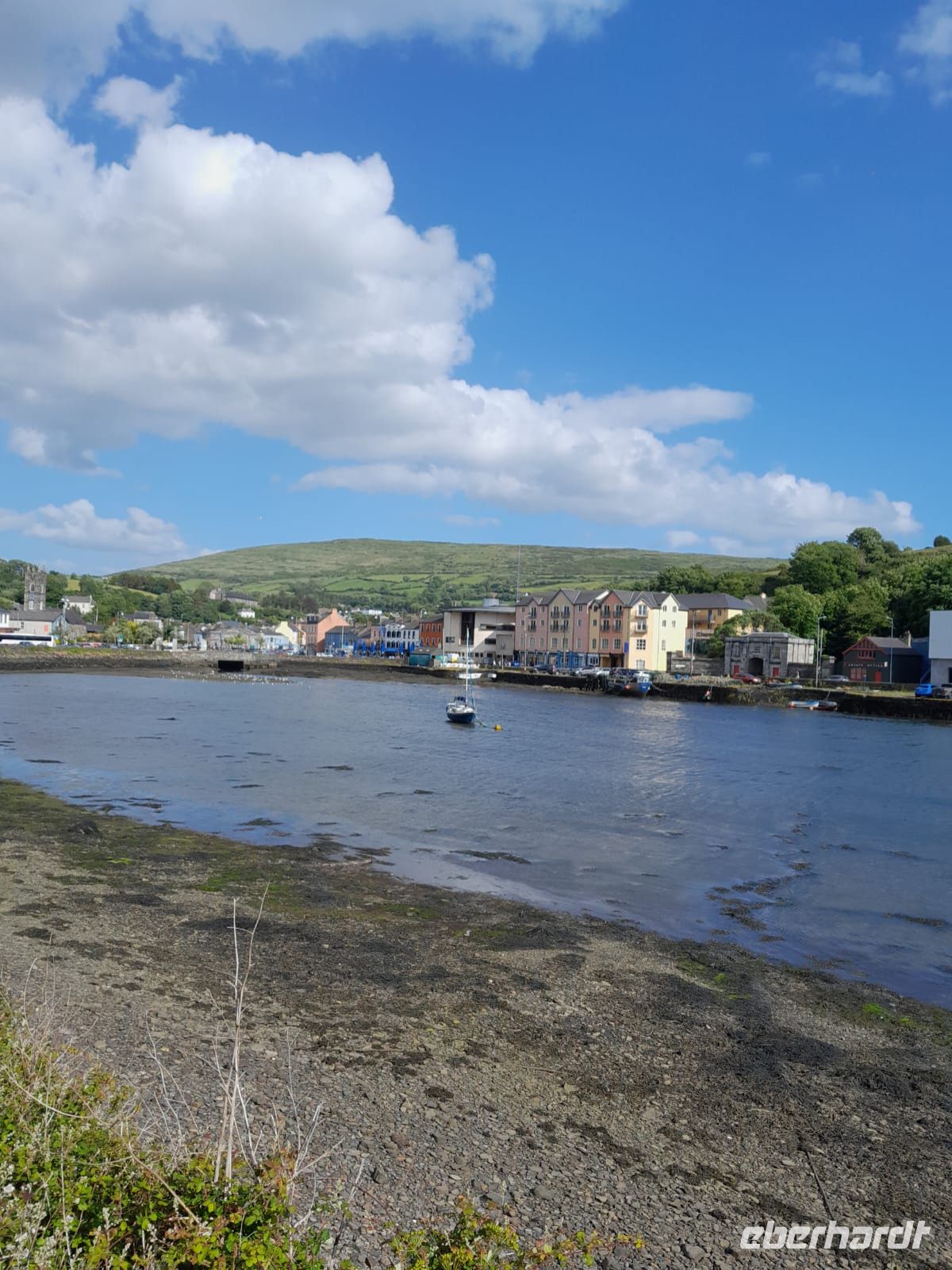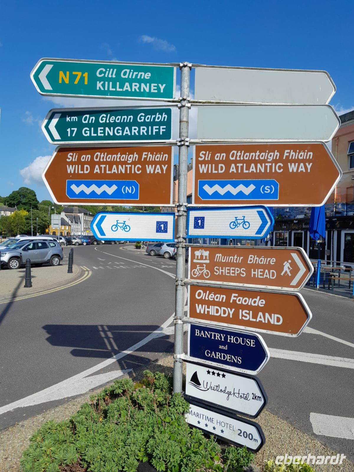 Der Morgen begann, es ist kaum der Rede wert, regnerisch und stürmisch. Wie am Tag zuvor, so besserte sich das Wetter aber auch heute im Laufe des Tages unverhofft schnell. Diesmal auf der Fahrt nach Mizen Head. Sehr zur Freude aller Mitreisenden. Traumhaft! Und traumhaft schön war schon die Anfahrt über die knapp 30 Kilometer lange Mizen Halbinsel, die südlichste der 5 Halbinseln im Süd-Westen der grünen Insel. Über kleine, kurvenreiche Straßen, mit wundervollen Ausblicken hinter jeder Wegbiegung, rotblühenden Fuchsien Hecken und durch malerische Dörfer führte uns der Weg an die südwestliche Spitze bis nach „Mizen Head. Hier, wo einst im Jahre 1909 eine Signal-Station in schwindelerregender Höhe 100 Meter auf zerklüfteten Felsen über dem tosenden Atlantik erbaut wurde, um die Schiffe bei Sturm und Nebel vor den Gefahren der tückischen Klippen zu warnen, schien die Zeit auch am heutigen Sonntag stehengeblieben zu sein. Vom kleinen Besucherzentrum gelangten wir über einen in das Gestein gebauten Fußweg, 99 Treppenstufen und eine beeindruckende Bogenbrücke, die einen tiefen Felseinschritt in 46 Meter Höhe überspannt, bis zur eigentlichen Signal -Station. Welch‘ ein gigantischer Ausblick! Auf dem Rückweg zum Besucherzentrum erblickten wir tief unterhalb der Brücke Robben, die sich gemütlich in der Sonne in der geschützten Bucht räkelten und vom Geschrei der Möwen, Kormorane, Basstölpel und Trottellummen musikalische Unterhaltung bekamen. Gute 2 1/2 Stunden blieben wir dort und es fiel uns schwer, dieses Kleinod wieder zu verlassen. Doch wir wollten heute noch nach Bantry, unserem heutigen Übernachtungsort. Und so fuhren wir wieder los, bzw. erst einmal ein Stück die Straße wieder zurück die wir gekommen waren, was uns aus diesem Blickwinkel aber ganz neue eindrucksvolle Perspektiven auf die Landschaft ermöglichte. Herrlich. Bantry, das malerische Städtchen mit seinen bunt angestrichenen Häusern, erreichten wir am späten Nachmittag. So blieb vor dem Abendessen genügend Zeit, sich den Ort des Hl. St Brendan genauer anzusehen.