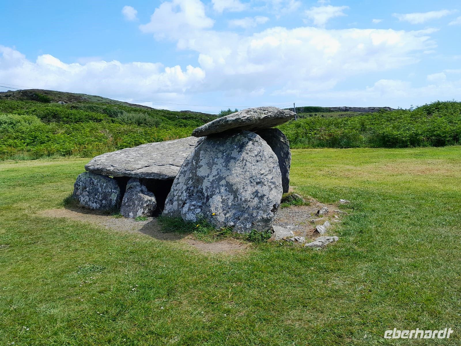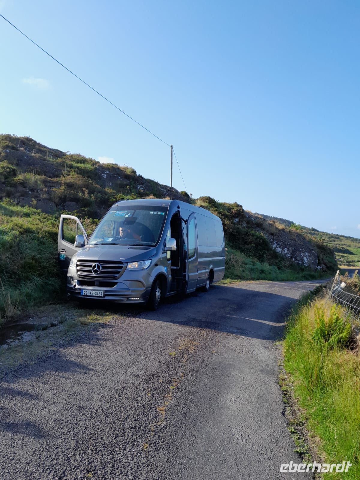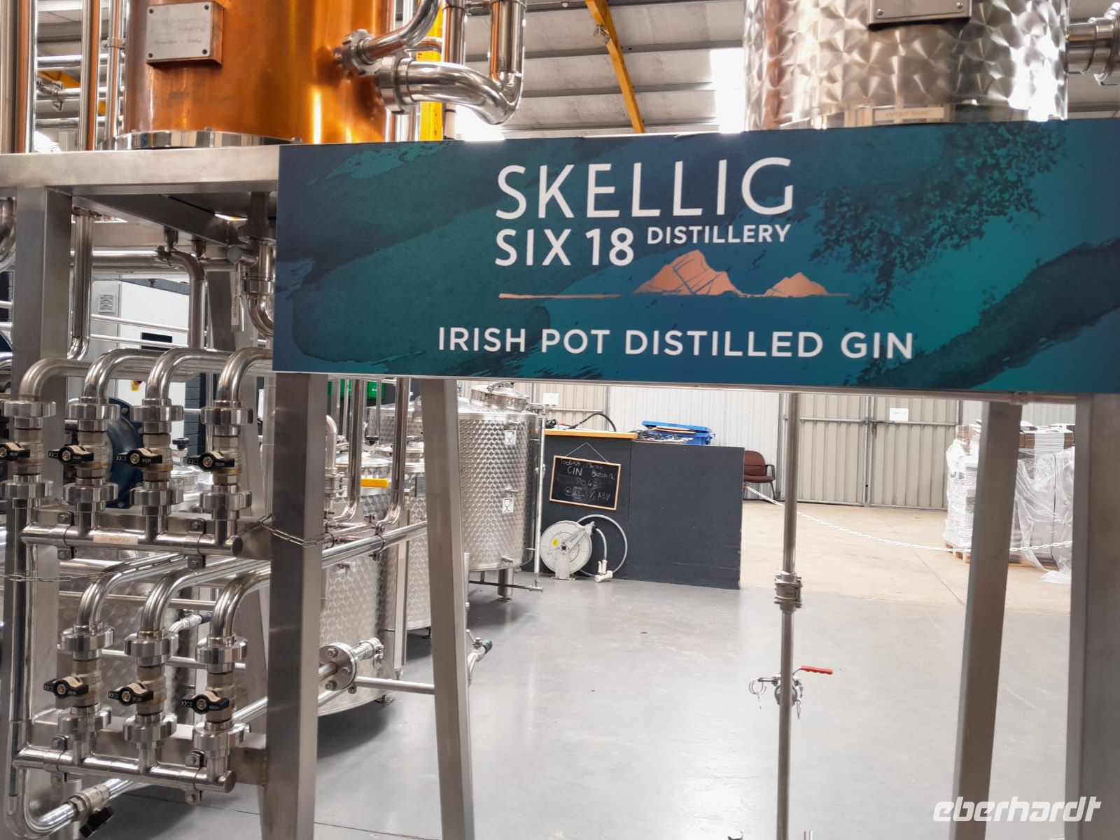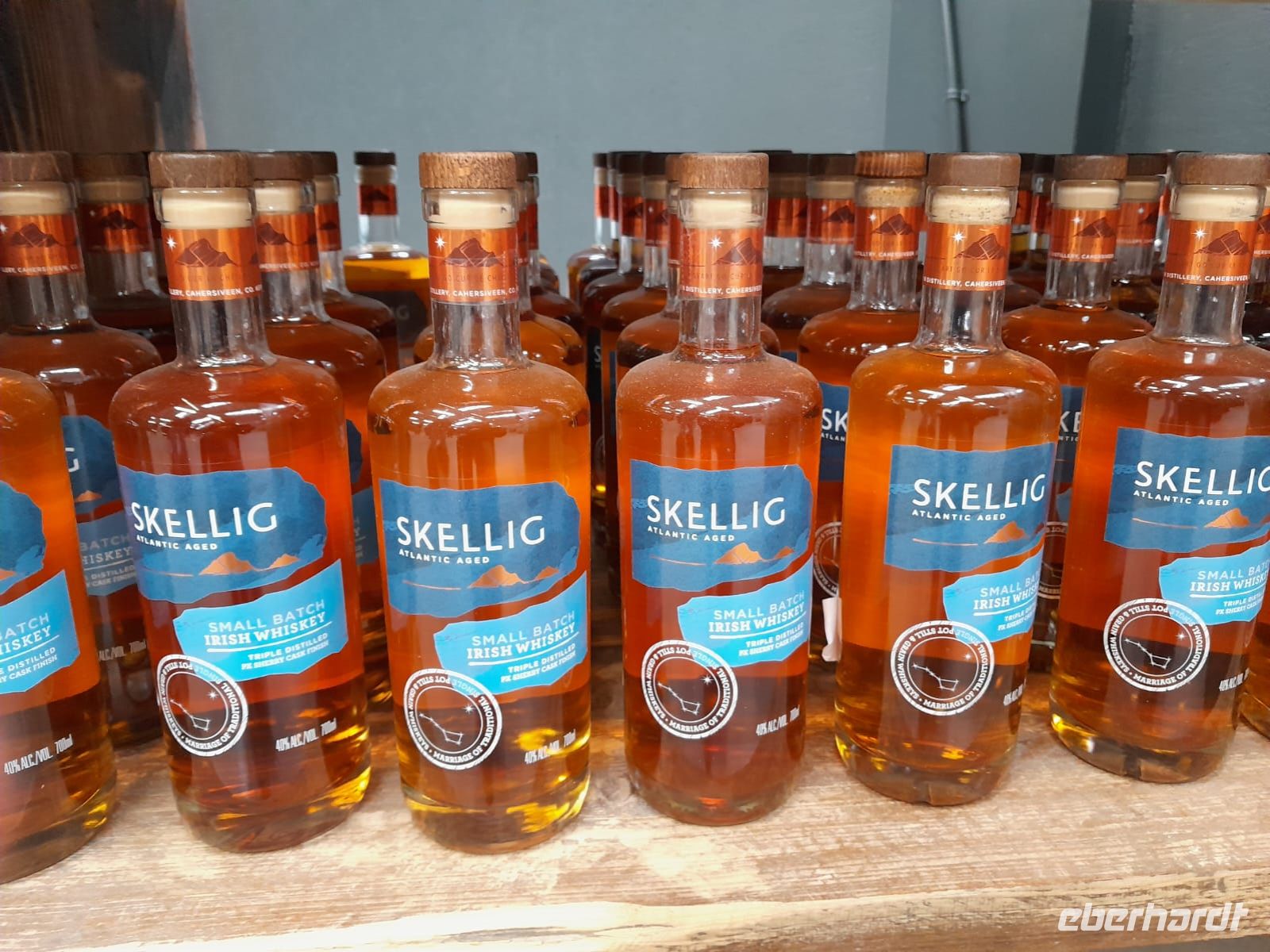 Trotz des „Bank Holidays“ (Gesetzlicher Feiertag in Irland) bekamen wir unser Frühstück schon früher als an den anderen Tagen – hatten wir doch einen langen Tag vor uns. Von Bantry über Killarney zum berühmten „Ring of Kerry“, auch „Herr der Ringe“ genannt, das hatten wir uns für heute vorgenommen. Und an diesem Montag war das Wetter von Beginn auf unserer Seite – na ja, zunächst jedenfalls: Ein strahlend blauer Himmel begrüßte uns an der Bantry Bay. Hugh, darüber ebenso glücklich wie wir, nahm dies zum Anlass, uns die landschaftliche Schönheit seiner Heimat auf ganz besondere Weise zu zeigen. Er fuhr mit uns auf direktem Wege nach Killarney durch die Cork & Kerry Mountains. Um genauer zu sein durch die Shely Mountains. Eine unbeschreiblich atemberaubend schöne, faszinierende Gebirgslandschaft, in der letzten Eiszeit entstanden, und deren Täler und Berge durch Gletscher geformt wurden, durchzogen von Torfmooren und Magerrasen auf denen Schafe weideten. Die Gruppe genoss jeden einzelnen Meter auf dieser Strecke, deren Straßen gefühlt stellenweise alpinen Charakter hatte. Und noch bevor wir Killarney erreicht hatten, waren wir wie berauscht von diesem einzigartigen Naturerlebnis, das wir Dank Hugh an diesem Morgen erleben durften. Irland in seiner vollen Pracht und Schönheit! Hugh: Tausend Dank dafür. In Killarney legten wir eine kurze Toilettenpause ein, bevor wir uns auf die N 72 Richtung Killorglin begaben, um hier auf die N 70 zu stoßen, die „Panorama Ringstraße“ der Iveagh Halbinsel. In Glenbeigh, ein paar Autominuten weiter, fuhren wir an den Strand, um frische Meeresluft zu atmen. Und hier änderte sich das Wetter schlagartig. Düstere Wolke zogen am Horizont auf und eine frische Brise wirbelte unsere Haare fröhlich durcheinander. Kurze Zeit später, wir waren alle Gott sei Dank rechtzeitig wieder im Bus, wurde es sehr windig und es fing an zu regnen. An Fotostopps war auf Grund der schlechten Sicht nicht zu denken. Schade. Aber dafür entschädigte uns der Besuch der Whiskey Distillerie Skellig six 18 in Cahersiveen auf dem Ring of Kerry. 2019 gegründet, und in einer ehemaligen Strumpffabrik untergebracht, weist schon der Name auf seine große Verbundenheit mit der ganzen Region hin: Skellig six18, die 618 Stufen auf der Insel Skellig Michael, die man nehmen muss, um das ehemalige Kloster oben auf den Felsen zu erreichen. Die Führung war unterhaltsam und interessant und die Verkostung des Skellig six 18 Whiskeys brachte uns ganz neue geschmackliche Eindrücke, die unter uns Neu-Whiskey Experten lebhaft diskutiert wurden. Abends im Hotel in Sneem, übrigens unserem letzten gemeinsamen Abend in Irland, wurde zum Abschluss einer unvergesslichen Reise, der ein oder andere Whiskey an der Bar noch einmal einem ausführlichen Test unterzogen – und für gut befunden!