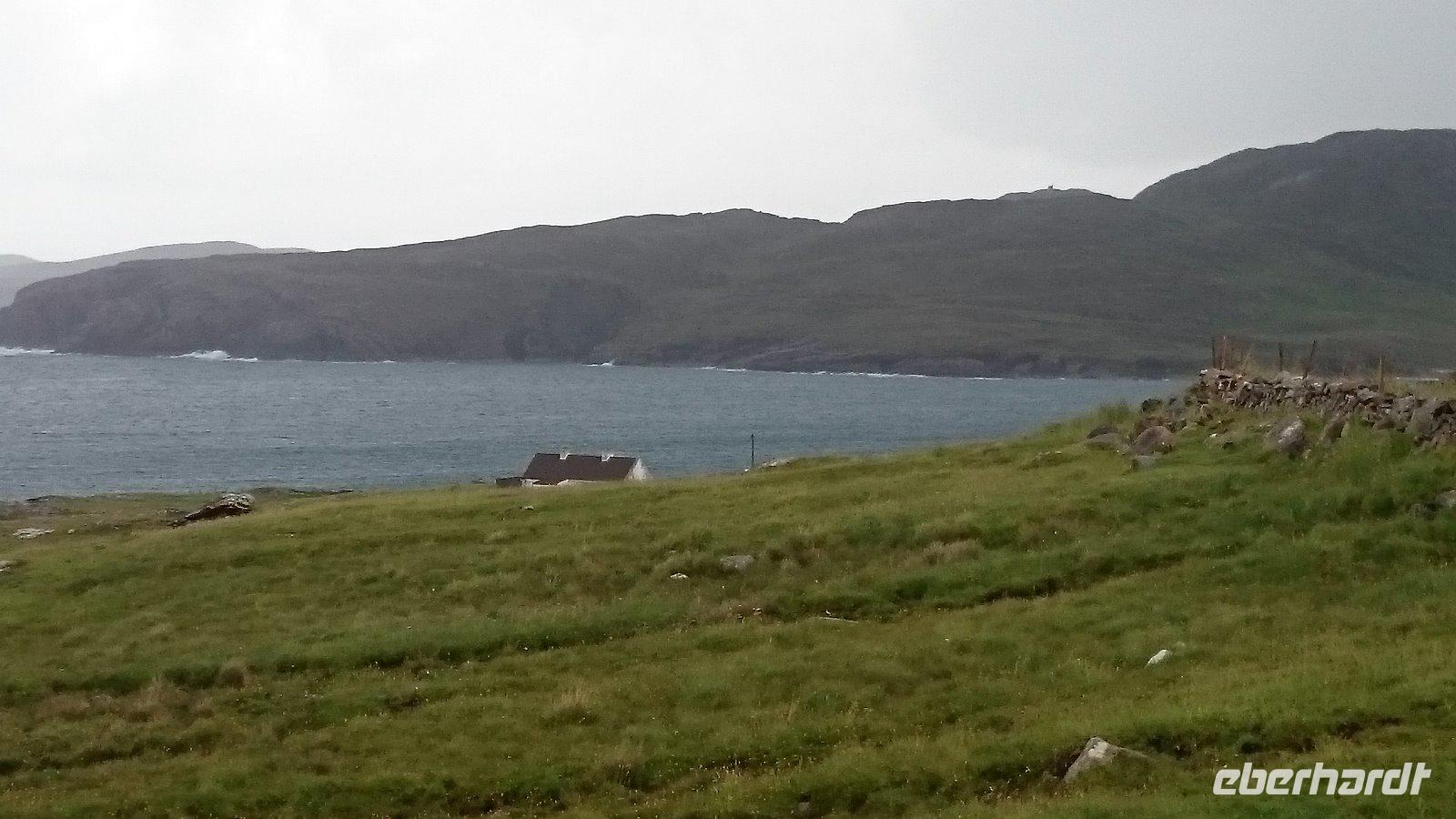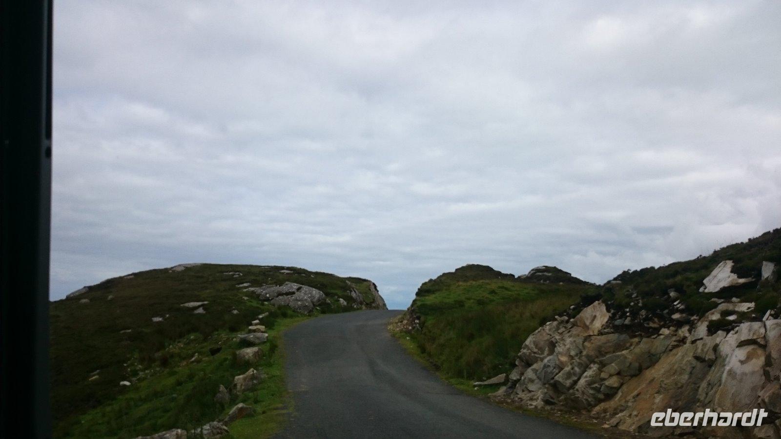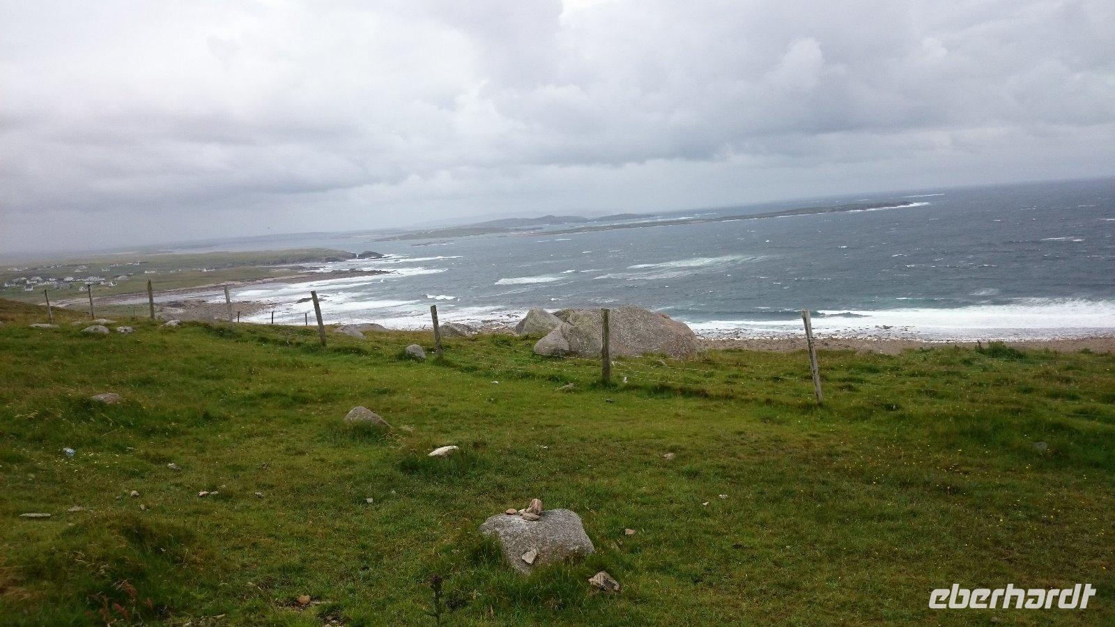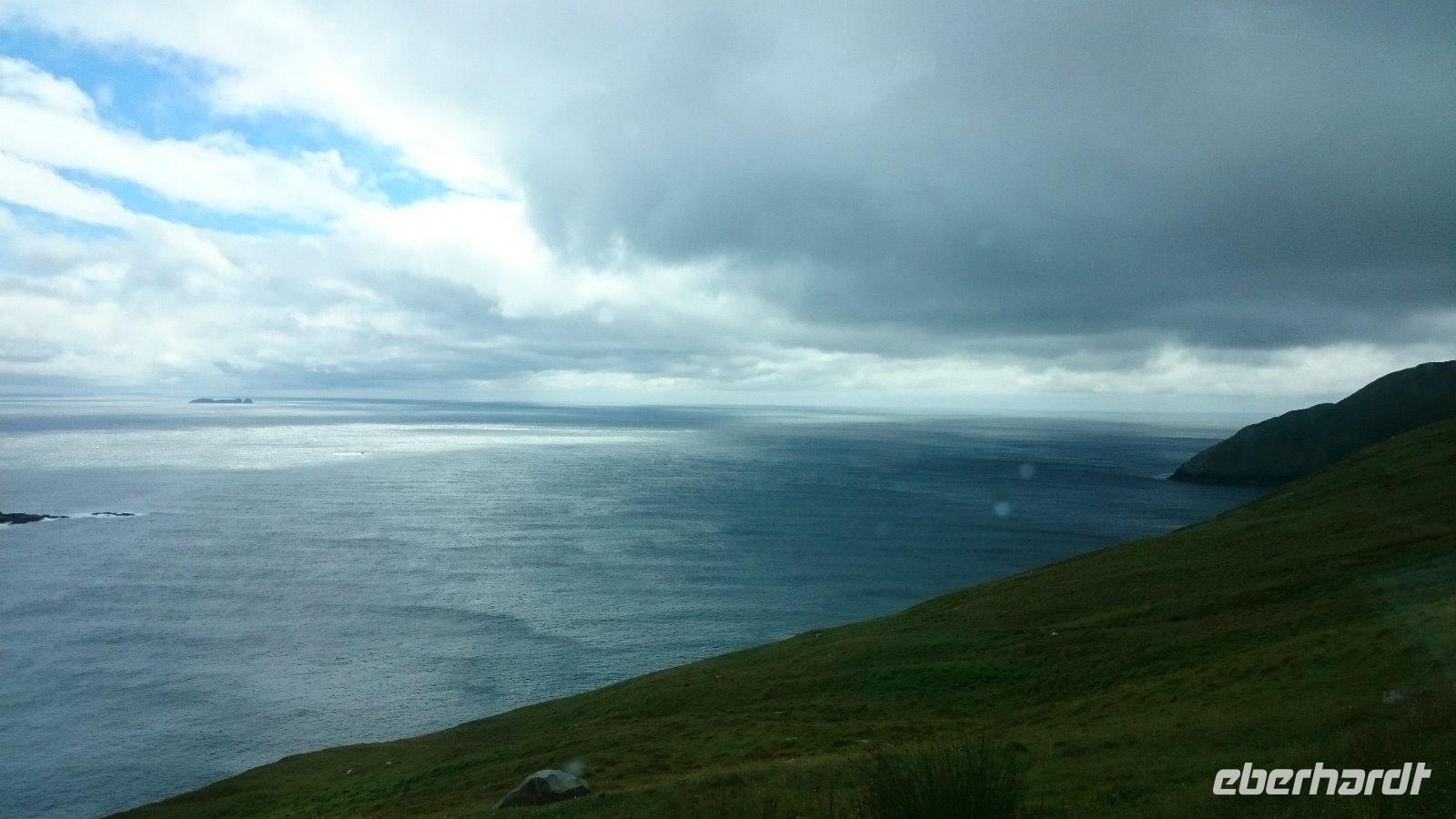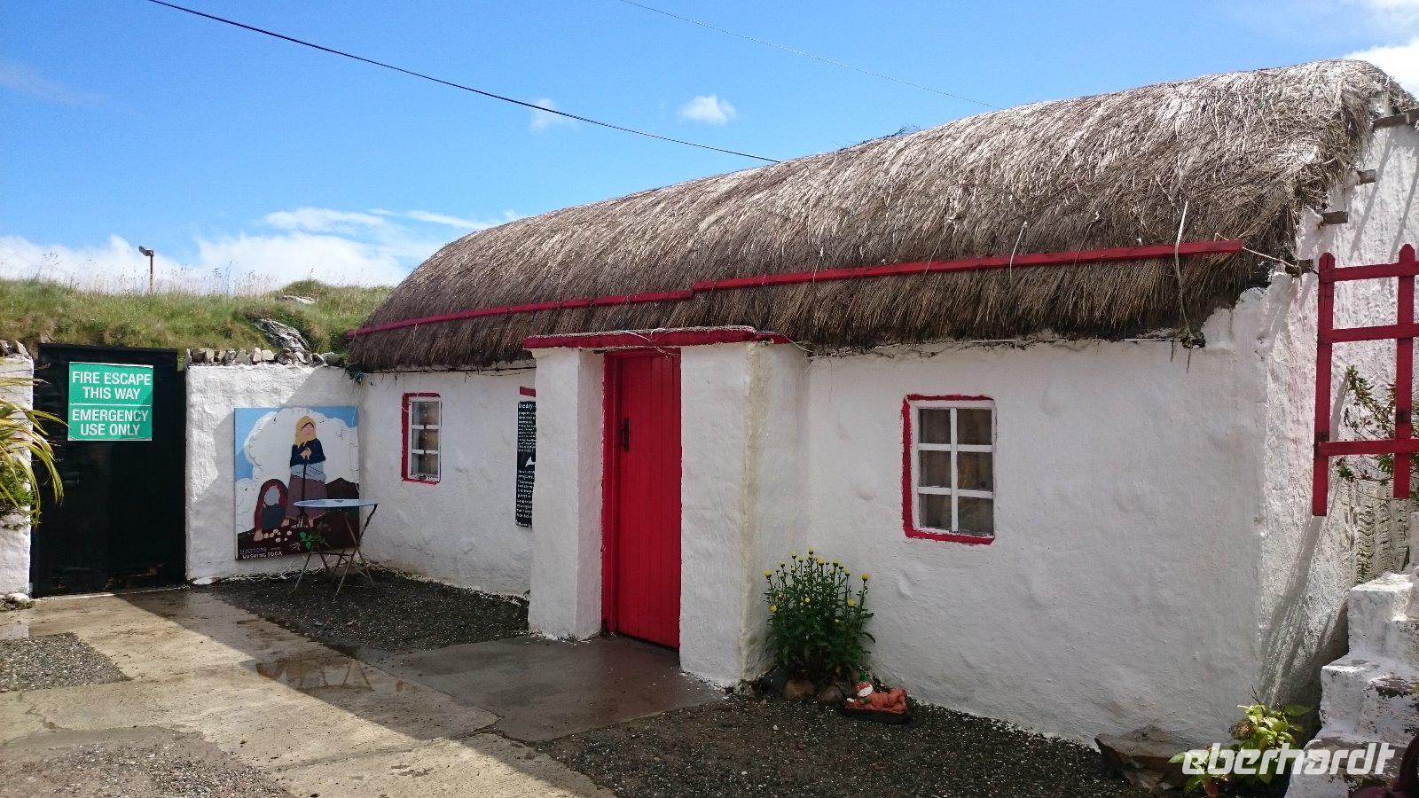 Party mit Bill im Bus oder Downpatrick Head im strömenden Regen - garantiert keine Langeweile war für diese 45 Minuten angesagt. Im gut gewärmten Bus fuhren wir zu Ceide Fields. Hier ging es vielen Gästen in erster Linie darum, die Hosen und Jacken zu trocknen. Darüber hinaus erhielten wir in der Ausstellung einen Überblick über die bedeutenden archäologischen Fundplätze an diesem Ort. Am Nachmittag erkunden wir Achill Islands. Keem Beach lädt mit Sonnenschein zum Spaziergang ein und ein Fotostopp am ehemaligen Ferienhaus von Heinrich Böll darf natürlich auch nicht fehlen.