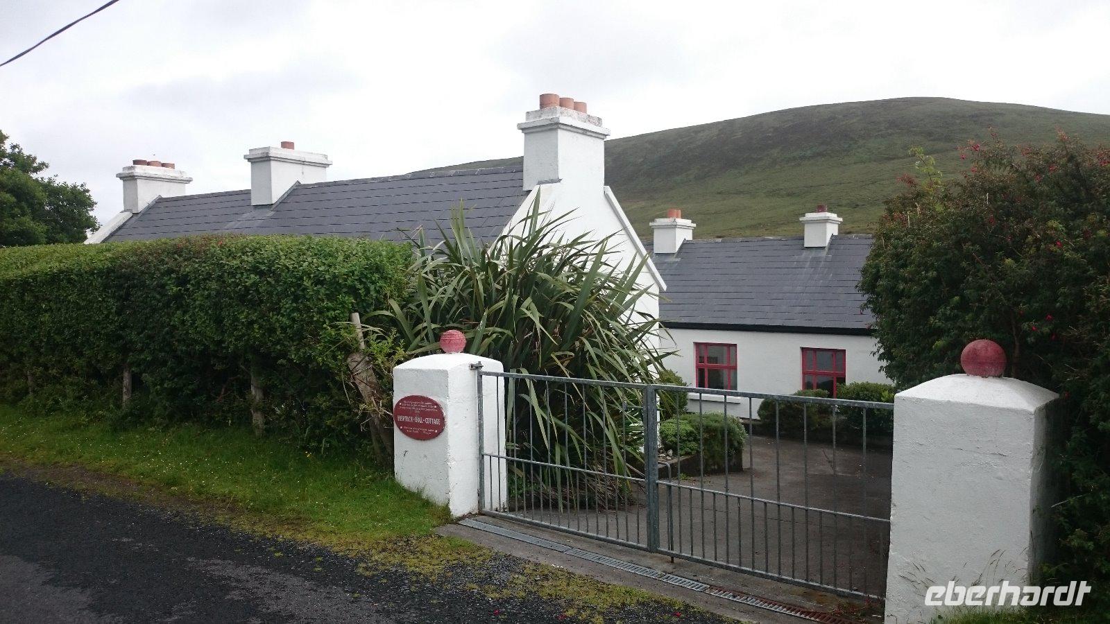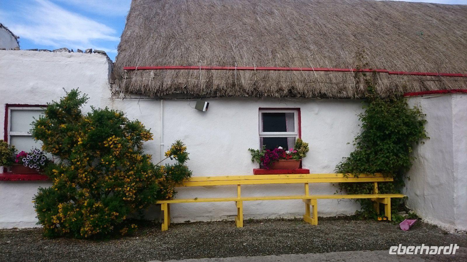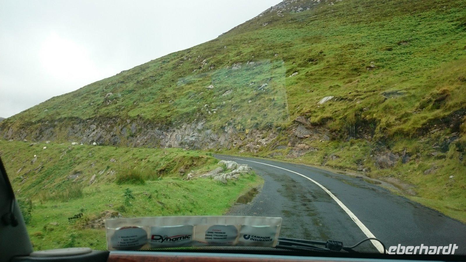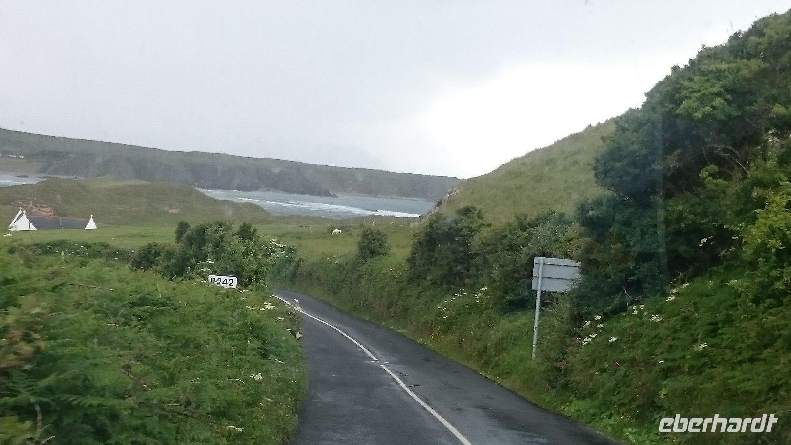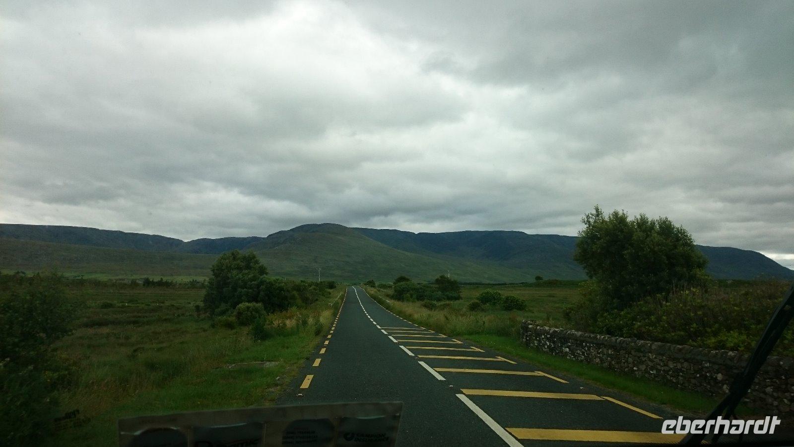 Party mit Bill im Bus oder Downpatrick Head im strömenden Regen - garantiert keine Langeweile war für diese 45 Minuten angesagt. Im gut gewärmten Bus fuhren wir zu Ceide Fields. Hier ging es vielen Gästen in erster Linie darum, die Hosen und Jacken zu trocknen. Darüber hinaus erhielten wir in der Ausstellung einen Überblick über die bedeutenden archäologischen Fundplätze an diesem Ort. Am Nachmittag erkunden wir Achill Islands. Keem Beach lädt mit Sonnenschein zum Spaziergang ein und ein Fotostopp am ehemaligen Ferienhaus von Heinrich Böll darf natürlich auch nicht fehlen.
