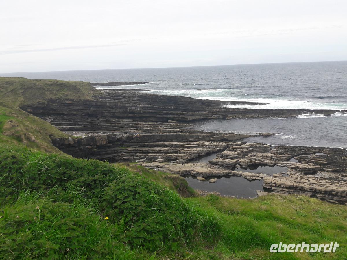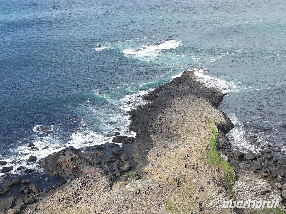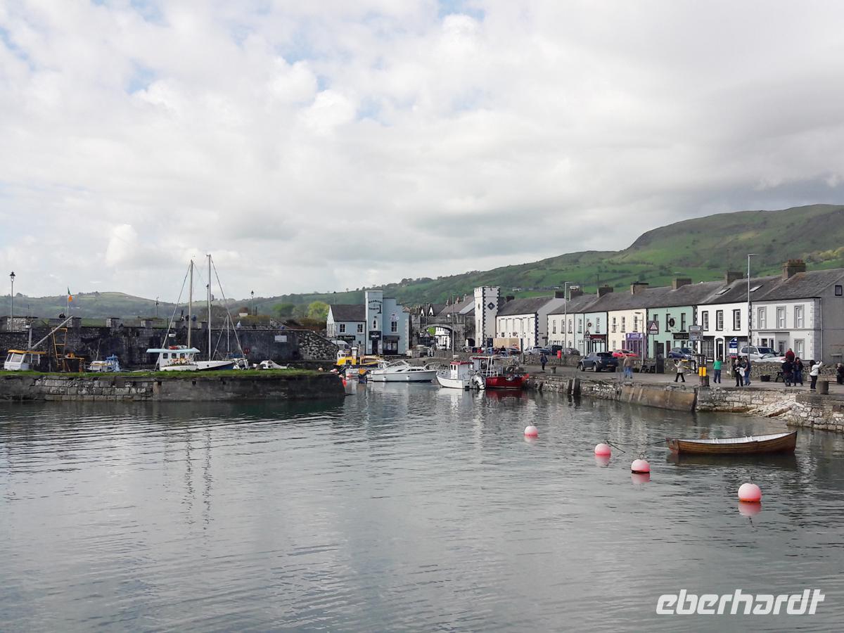 Wir begeben uns heute auf unsere Tour an der nordirischen Küste entlang. Die Causeway Coastal Route im County Antrim. Zunächst ein kurzer Stop am mächtigen normannischen Castel von Carrikfergus, wo Wilhelm III. von Oranien (Protestant) landete, um den letzten Stuart Jakob II. (Katholik) zu besiegen, was mit der Schlacht am Boyne 1691 auch gelang. Eine Pause legen wir in dem kleinen Ort Carnlough ein, der einen idyllischen kleinen Hafen hat und ein Hotel, welches von der Urgroßmutter Winstoin Churchills gegründet wurde. Danach können wir von einem Parkplatz an der Küste drei Fliegen mit einer Klappe schlagen. Wir haben ersten einen herrlichen Blick auf das Vogelschutzgebiet, die Rathlin Island und zum zweiten gleich dahinter am Horizont den Blick auf die Schottische Küste. Es zeigt sich The Mull of Kintyre, der auch Paul Mc. Cartney ein Lied gewidmet hat. Nachdem wir eine Photopause vor einer der größten Burgen Irlands, nämlich Dunluce Castle eingelegt haben, besichtigen wir etwas ganz Irisches, nämlich eine Whiskey-Destillery. Jene in Bushmills schreibt sich mit über 400 Jahren Geschichte auf die Fahnen, die älteste auf der gesamten Insel zu sein. Ich hatte schon vorher den Brennprozess erläutert und so sind wir nach unserer Führung an Originalen fast richtige Whiskeyprofis. Doch das Highlight ist der Giants Causeway, ein aus 6-8 eckigen Basaltlavasteinen geformtes Naturwunder. Ein Riese (Giant) soll diesen Fußweg bis nach Schottland gebaut haben, um sich mit einem anderen zu duellieren. In der Tat ist diese Formation auch in Schottland in kleinerer Form noch zu sehen. Geologen sagen jedoch, dass es die erkalteten Lavareste eines riesigen Vulkans sind, dessen Kaldera sich aber über die Jahrmillionen abgeschliffen hat. Kurtz vor der inneririschen Grenze unternehmen wir einen Stadtspaziergang durch Derry, wo wir über die komplett erhaltene Stadtmauer aus dem frühen 17. Jh. sehen und einen in Blick die Bogside werfen, wo es 1972 zum berüchtigten blutigen Sonntag kam. Zudem steht auf dem Marktplatz das älteste moderne Kaufhaus der Welt, nämlich Austins aus dem Jahr 1830. Unser Hotel beziehen wir in Letterkenny. Es liegt schon in der Republik Irland. Die Grenze zu Großbritannien existiert quasi nicht. Es gibt auch keine Kontrollen, und alle hoffen auf beiden Seiten der Grenze, das dies trotz Brexit auch so bleibt. Und so reisen wir ungehindert in unser Hotel, wo schon ein gutes Abendmenü auf uns wartet.
