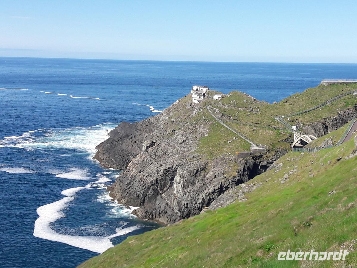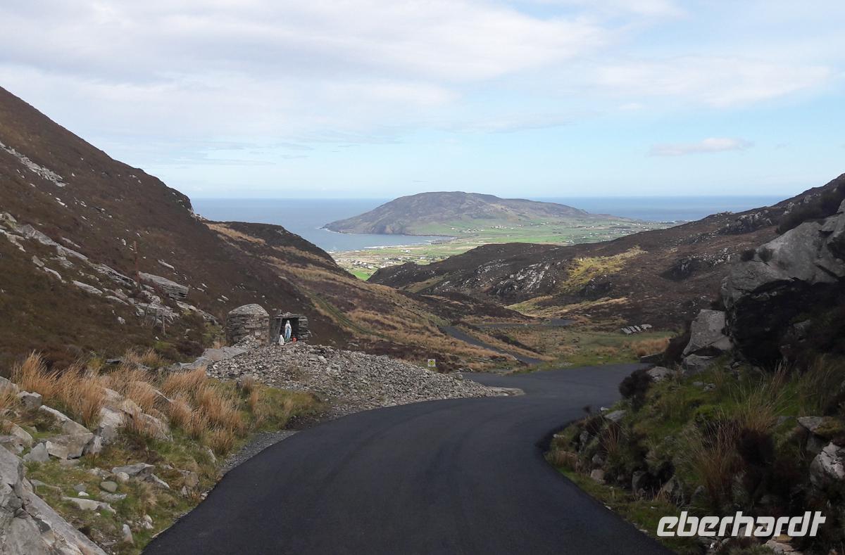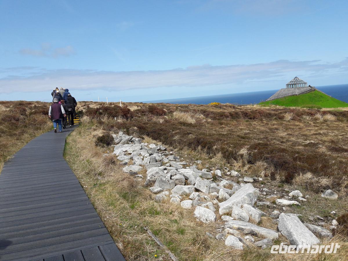Wieder haben wir bestes Wetter erwischt. Das unser Bus nicht größer sein darf, merken wir spätestens heute bei unserer Tour auf die Inishowen Halbinsel. Über Buncara reisen wir zunächst am Dunree Castle vorbei, einem britischen Fort aus dem frühen 19. Jh, dass auch Angst vor einem Angriff französischer Truppen errichtet wurde. Die Straße wird immer schmaler, aber dann erreichen wir ohn: Den Mamore Gap, den höchsten Paß der Halbinsel, wo St. Eignes, ein lokaler Heiliger mit einem Brunnen nebst Statue und Altar verehrt wird. Es ist totenstill. Sämtliche Zivilisationsgeräusche sind verschwunden. Unser Blick geht weit in die Ferne nach Norden auf den Atlantik. In Doagh besichtigen wir das Famine Village, ein Museum, dass an die große Hungersnot in der 1840er Jahre erinnert. Ursachen und Auswirkungen dieser durch einen Kartoffelpilz ausgelösten Katastrophe werden drastisch vor Augen geführt. The great Famine ist bis heute bei allen Iren tief im Bewusstsein verankert, verhungerten doch mehr als eine Millionen Iren und wurden 1,5 Millionen zur Auswanderung getrieben. Nach einer Tasse Tee mit einem Scone, sowie einem kleinen Strandspaziergang setzen wir unseren Weg zum nördlichsten Punkt der Halbinsel fort: Malin Head. Ein Wachturm aus dem Jahr 1805 zeigt den Beginn der militärischen Nutzung dieses Gebiets an. Riesig ist aus weißen Steinen der Name EIRE in den grünen Rasen gelegt. Er sollte Fliegern im 2. Weltkrieg zeigen, dass sie sich über neutralem Gebiet befinden. Wir unternehmen an der tosenden Küste einen Spaziergang zum Höllenloch, welches jedoch nicht recht ruhig ist, was sicher sdaran liegt, dass gerade Ebbe ist, und der Wind nicht allzu stark. Über Carndonagh reisen wir zum Griannan of Aileach Stoneford, was schon weiter im Süden liegt. Über das genaue Alter dieser Ringforts liegen die Archäologen noch im Streit. Manche legen sie schon in die Eisenzeit ins 1. Jahrtausend vor Chr. Sicher ist aber, dass die meisten schon ab ca. 500 n. Chr. bis ins späte Mittelalter in Benutzung waren. Es waren meist Fluchtburgen, die nur sporadisch genutzt wurden. Weit kann man auf den Loch Liffey und auch in Richtung Loch Foyle und Derry in Nordirland schauen. Am Nachmittag haben wir in Letterkenny noch Zeit genug, in trauter Zweisamkeit oder ganz individuell das überschaubare Zentrum zu erkunden und z. B. die Kathedrale St. Eunan zu besichtigen. Auch viele Geschäfte haben geöffnet, denn in Irland gibt es kein Ladenschlußgesetz. Den Abend beschließen wir wieder bei einem gemeinsamen Menü in unserem Hotel.