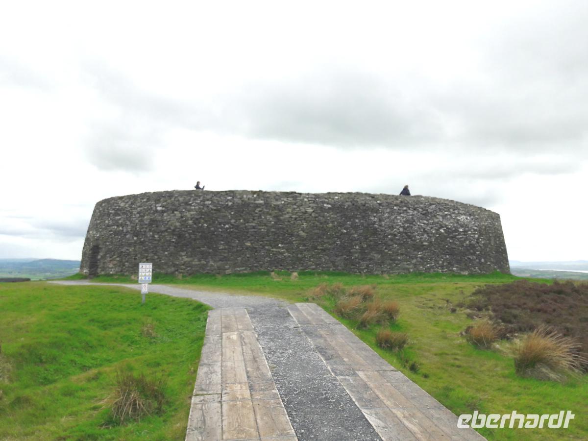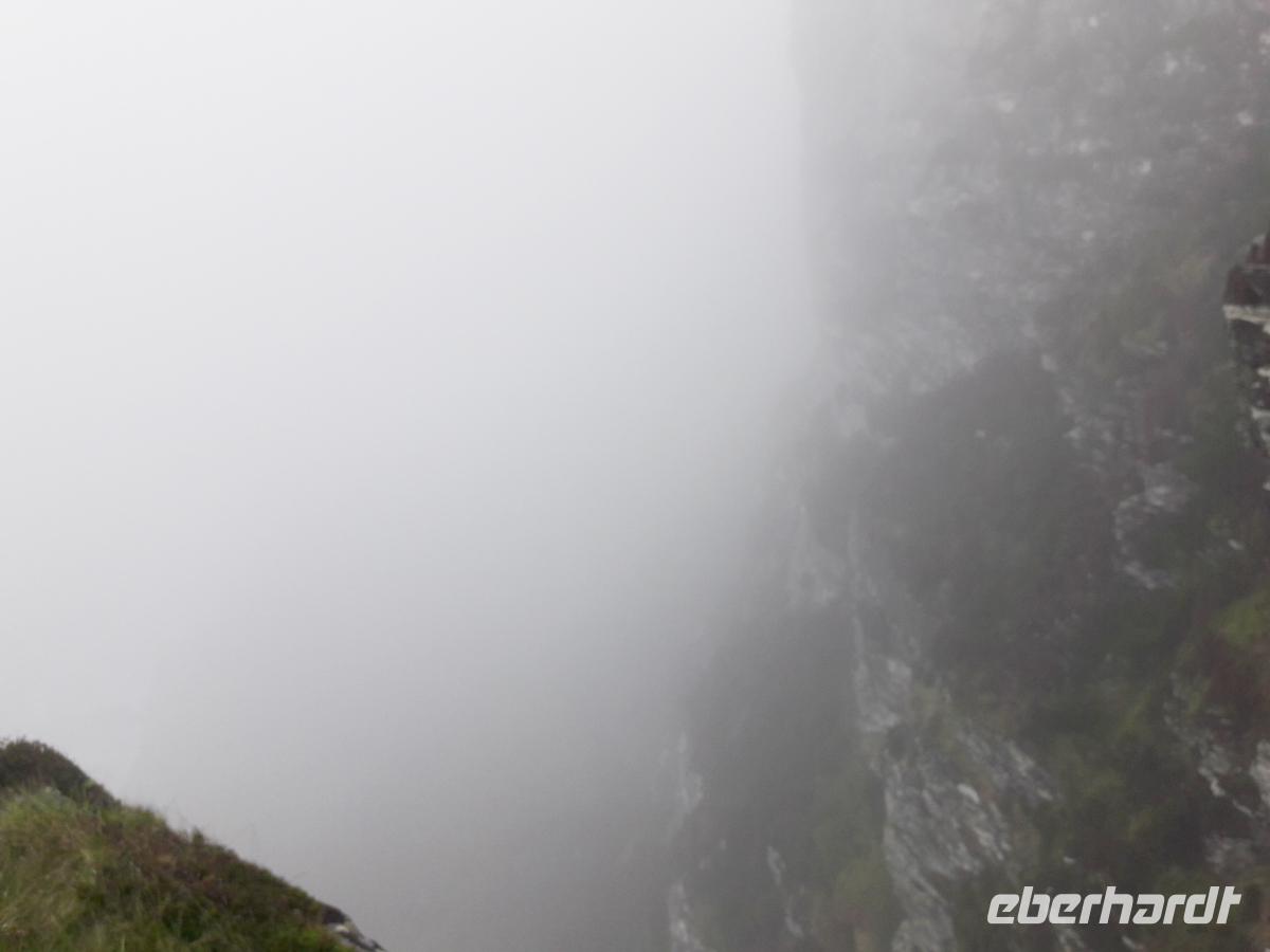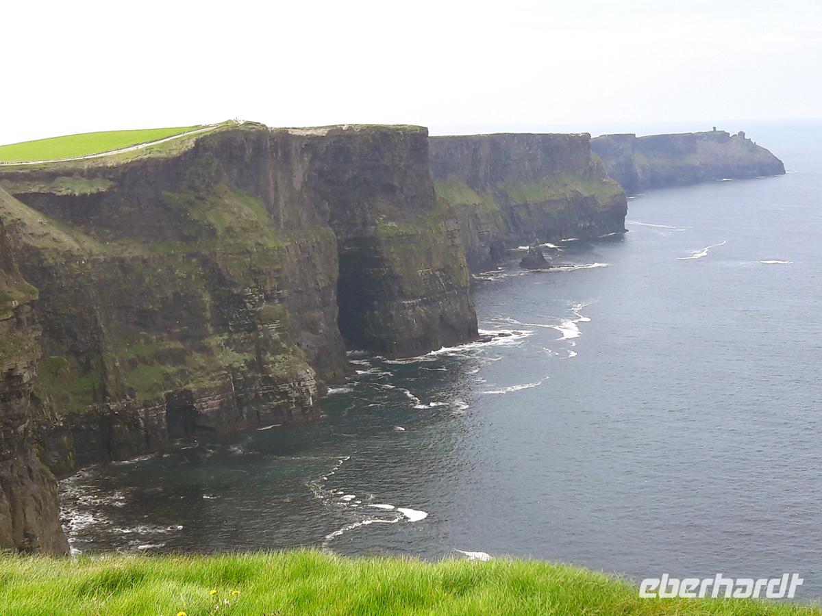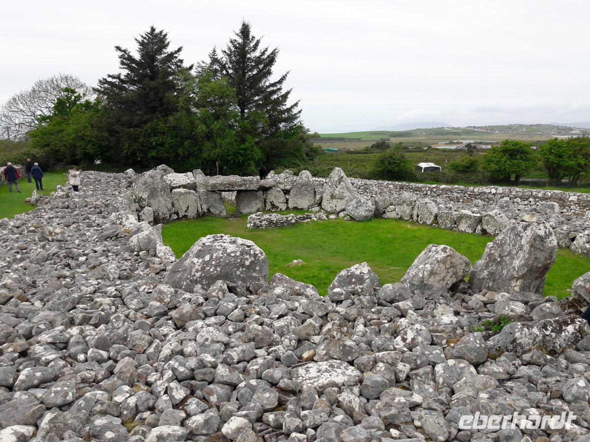 Wieder steht heute etwas Spektakuläres an. Die Klippen von Slieve League sind mit 600 m die höchsten auf dem irischen Festland. Wir müssen in einen noch kleineren Minibus umsteigen um sie zu erreichen. Doch je höher wir kommen, desto dichter wird der Nebel. Und oben angekommen befinden wir uns mitten in den Wolken. Immerhin hören wir das Meer wenigstens laut rauschen. Nachdem wir uns bei einem Kaffee etwas aufgewärmt haben, lade ich unsere Gäste als kleinen Ausgleich für duie entgangene Aussicht zur Besichtigung von Donegal Castle ein, eines der schönsten mittelalterlichen Castles im County. Danach lassen wir uns einen Chowder, eine cremige Fischsuppe schmecken. In Neolithikum wirft uns der Besuch des riesigen Megalithgrabes von Creewekeel zurück und am Mullaghmore Head können wir schon bei guter Sicht die gesamte Bucht von Donegal überblicken. Auf dem Weg dorthin konnten wir einen Blick auf Classiebawn Castle, dem Sitz der Mountbattons werfen. Im Anschluss daran bietet das winzige Dorf Drumcliffe eine schöne Kirche und ein Literaturcafe. Denn hier liegt W. B. Yeats begraben, Irlands erster Literaturnobelpreisträger im Jahre 1923. Der Ort unterhalb von Irlands heiligstem Berg, dem Ben Bulben wurde der Ort im 6. Jh. vom hl. Columban gegründet. Reste der irischen Klosteranlage sind noch in Form eines Rundturmstumpfes und eines Hochkreuzes vorhanden. Dagegen ist Sligo, unser nächstes Ziel eine richtige Stadt, und Hauptstadt der gleichnamigen Grafschaft. Auf einem Stadtrundgang entdecken wir die alte Abtei, das Rathaus und weitere interessante Gebäude. Unser Etappenziel, die Stadt Ballina erreichen wir abends. Auf unserem Weg dorthin erblicken wir zwei weitere heilige Berge: Auf dem Knocknarea mit dem größten Megalithgrab Irlands soll die mythische Königin Meave begraben sein, während auf dem Croak Patrick der Nationalheilige St. Patrick die Schlangen von der Insel vertrieben haben soll, indem er seinen Bischofstab heftig in den Boden rammte.