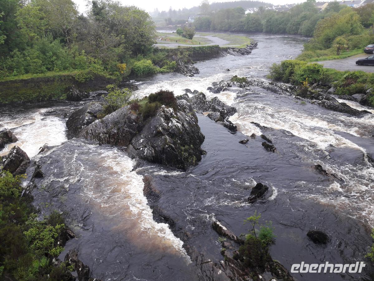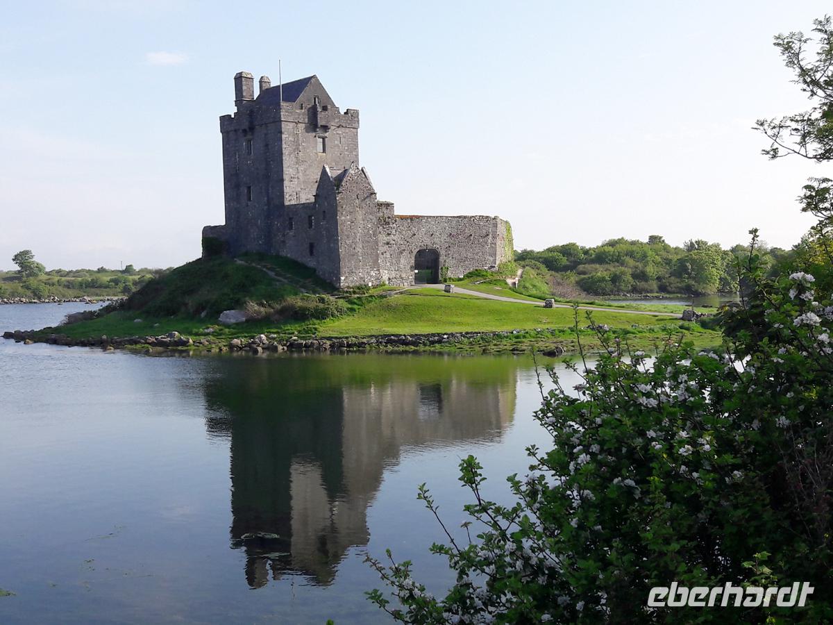 Irland ist zwar mit aufregenden Landschaften gesegnet, aber eines hat es kaum zu bieten: Wasserfälle. Doch einen breiten, dafür nicht so hohen sehen wir uns an. Den Aasleigh Waterfall, der tosend in sein Becken fällt. Nun durchreisen wir die Connemara Region. Geformt von der letzten Eiszeit bietet sich uns eine von stillen Seen durchdrungene Landschaft dar. Malerisch liegt Kylemore Abbey vor uns. Ein prachtvolles Schloß an einem See, in welches vom damaligen Multimilliardär Mitchell Henry errichtet wurde. 1920 gelangte es in die Hände aus Ypern stammender Benediktinerinnen. Es ist das älteste Benediktinerinnenkloster Irlands. Mitreißend ist auch der schöne viktorianische Garten, den wir mit einem Shuttlebus erreichen können. Nach einem kurzen Rundgang durch die kleine aber bunte Hafenstadt Clifden befahren wir bis Roundstone eine angelegene Küstenstraße. Hier befindet sich der karibisch anmutende, aber gleichsam einsame Stand der Dogs Bay. Nach einem Aufenthalt dort begeben wir uns nach Maam Cross mit einem Rasthof, wo wir eine ausgedehnte Pause einlegen. Dort steht auch ein altes Cottage, in dem Szenen des Films „The quiet man" („Der Sieger", dt. Titel) mit John Wayne und Maureen o´Hara gedreht wurden.