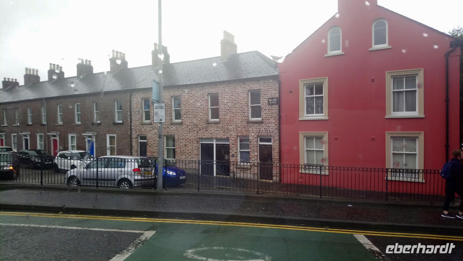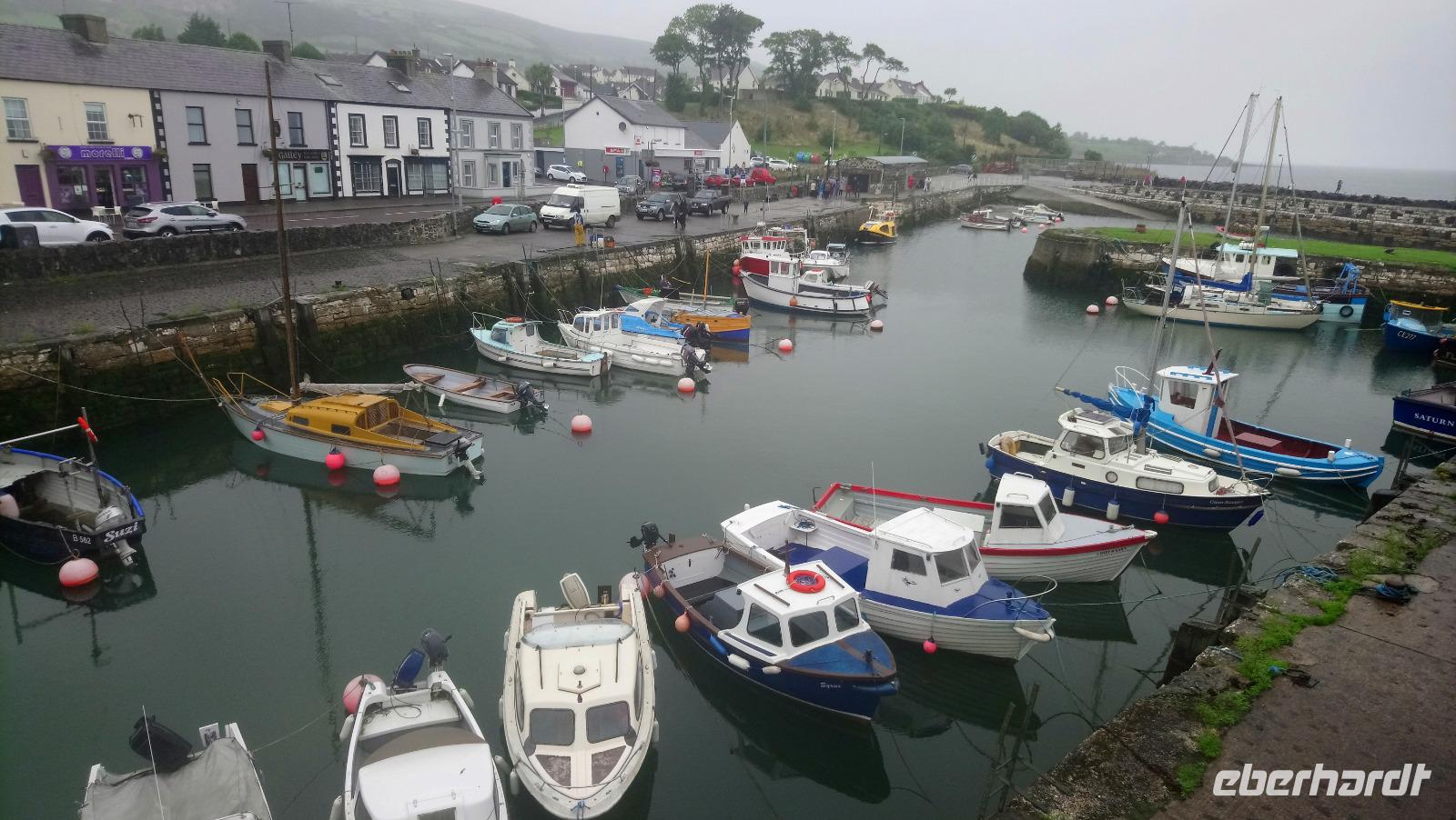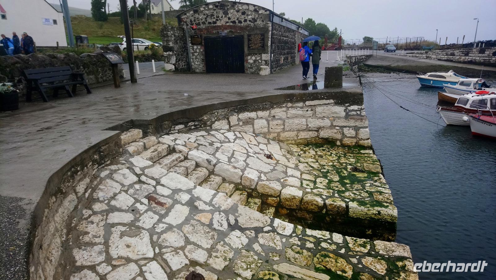 Auf dem Weg zum Giants Causway entdecken wir den kleinen Hafenort Carnlough, der durch seine Brieftaubenzüchter einen Platz in der Weltgeschichte fand. Auch die Gig -ruderer sind hier zu Hause und wetteifern jährlich um die Trophäe von Carnlough. Statt Mittagessen ist heute Whiskeytasting bei Bushmills angesagt - nach einer umfassenden Führung auf dem Produktionsgelände, haben sich alle Gäste gleich zwei Whiskeyproben verdient. Nun ist es nicht mehr weit zum eigentlichen Höhepunkt des Tages, der Besuch des Giant Causeway. Bizarre Basaltsäulen in Verbindung mit dem Meer locken Touristen aus der ganzen Welt an. Der starke Regen lässt nur ein erstes Kennenlernen zu. Einige Gäste nutzen den Busservice vor Ort, da die Wege entlang der Küste sehr rutschig sind. Gäs Doch noch ist der Tag nicht zu Ende. Ein Stop in Derry passt noch in den Zeitplan. Wir besuchen das Guilthouse und spazieren ein Stück über die Stadtmauer. All das sind Puzzelsteine, die uns die Geschichte Irlands verständlicher machen.