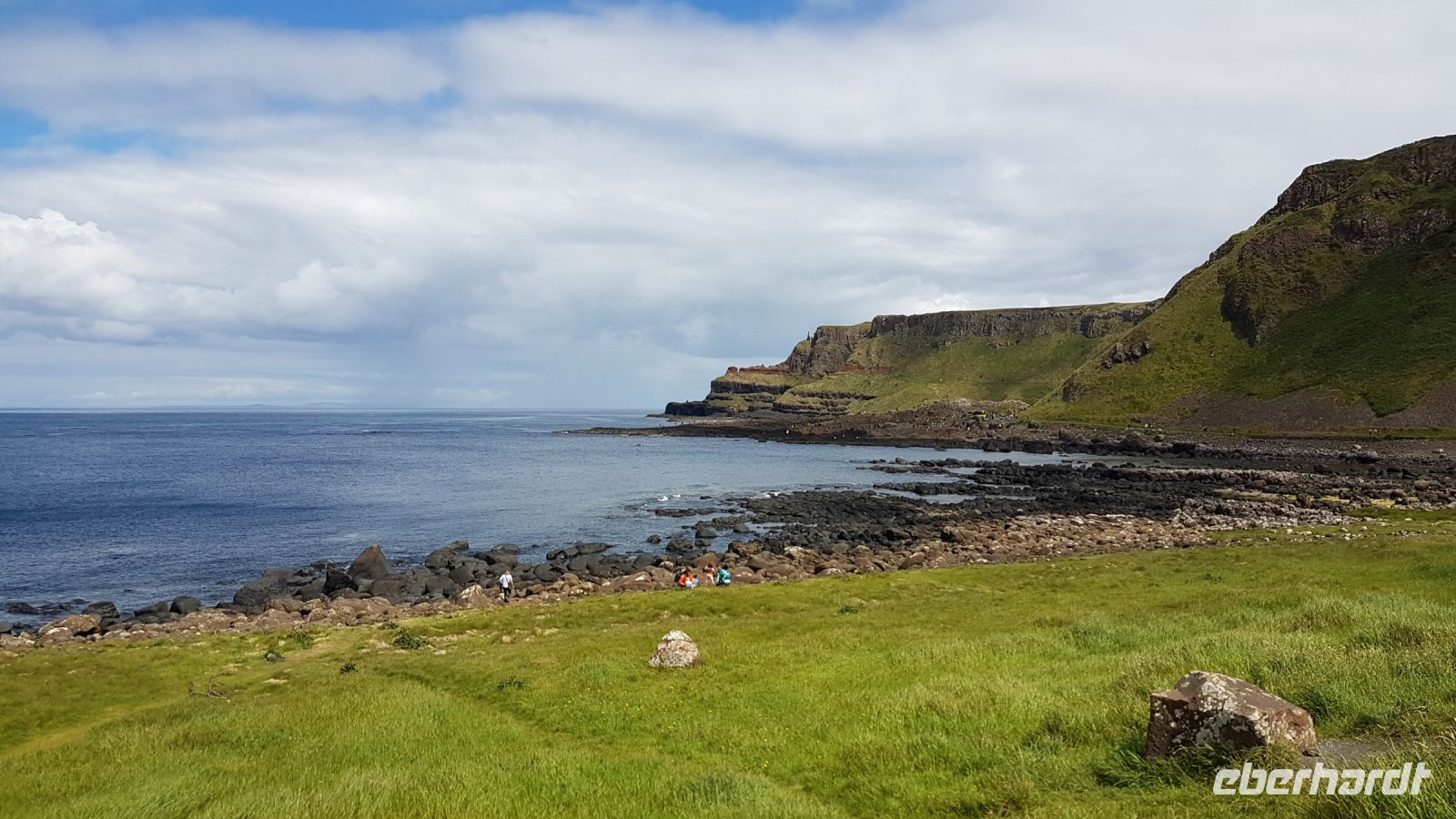 Bald erreichten wir eine der bekanntesten Sehenswürdigkeiten Nordirlands: Am Giant's Causeway sahen wir die vor 60 Millionen Jahren entstandenen zumeist sechseckigen Basaltsäulen. Wir kletterten auf diesem Wunder der Natur umher, das seit 1986 zum Unesco Weltkulturerbe gehört. Während unseres Aufenthaltes erlebten wir typisch irisches Wetter, das sich sehr wechselhaft zeigte, mal Sonne, mal Wolken, mal etwas Regen. Glücklicherweise begann es erst heftiger zu regnen, als wir schon im Bus saßen auf dem Weg zu unserem Hotel. Wir fotografierten Dunluce Castle und fuhren an Derry/Londonderry vorbei.