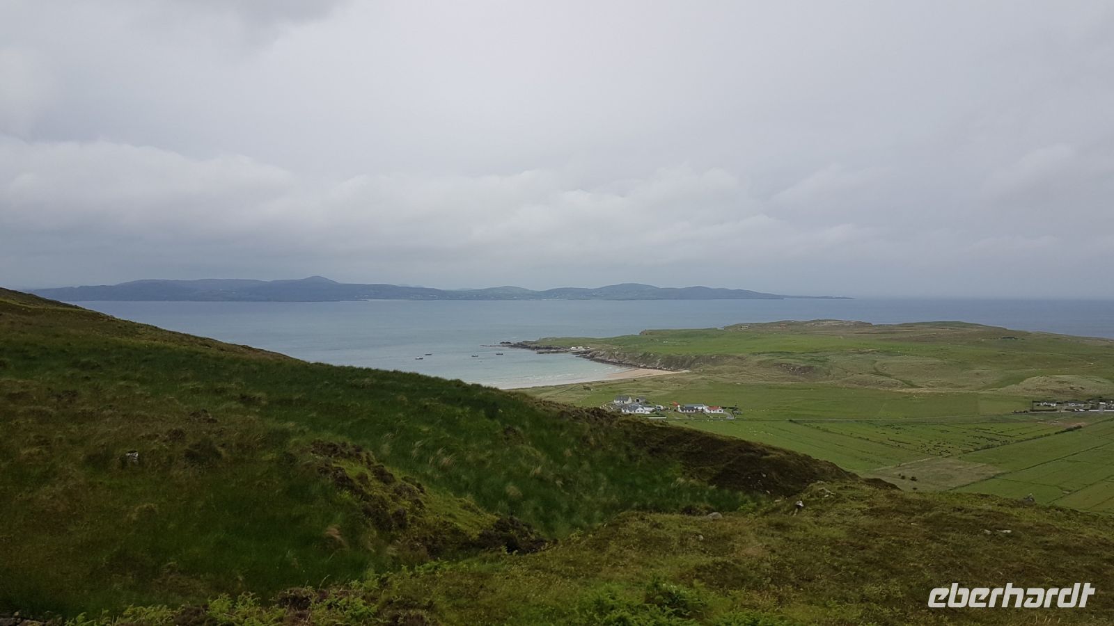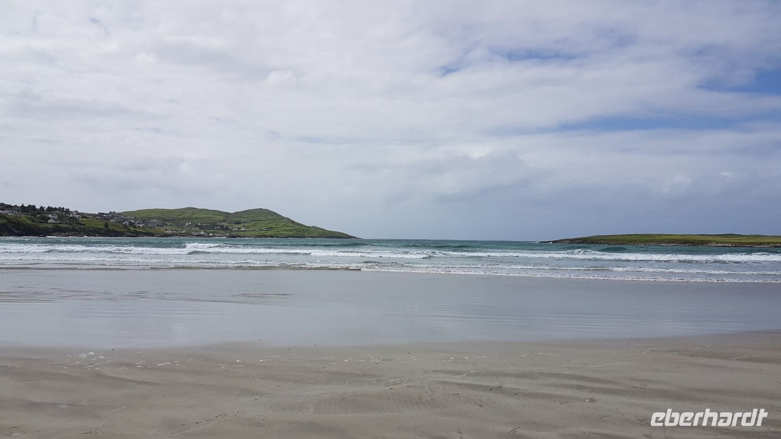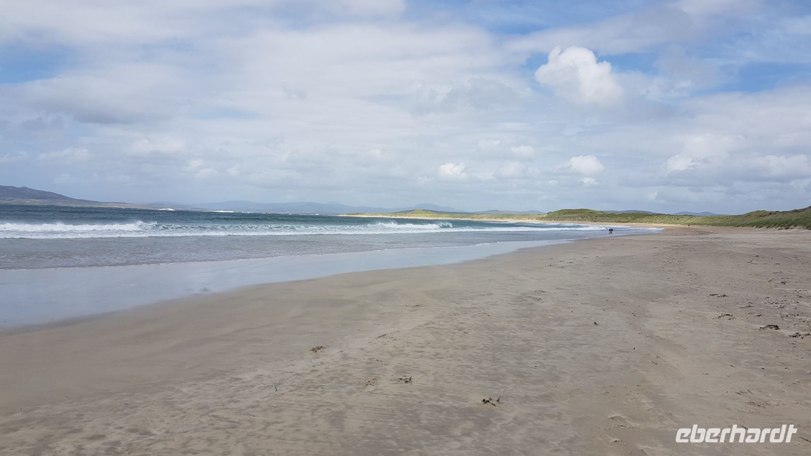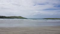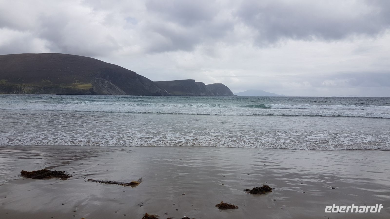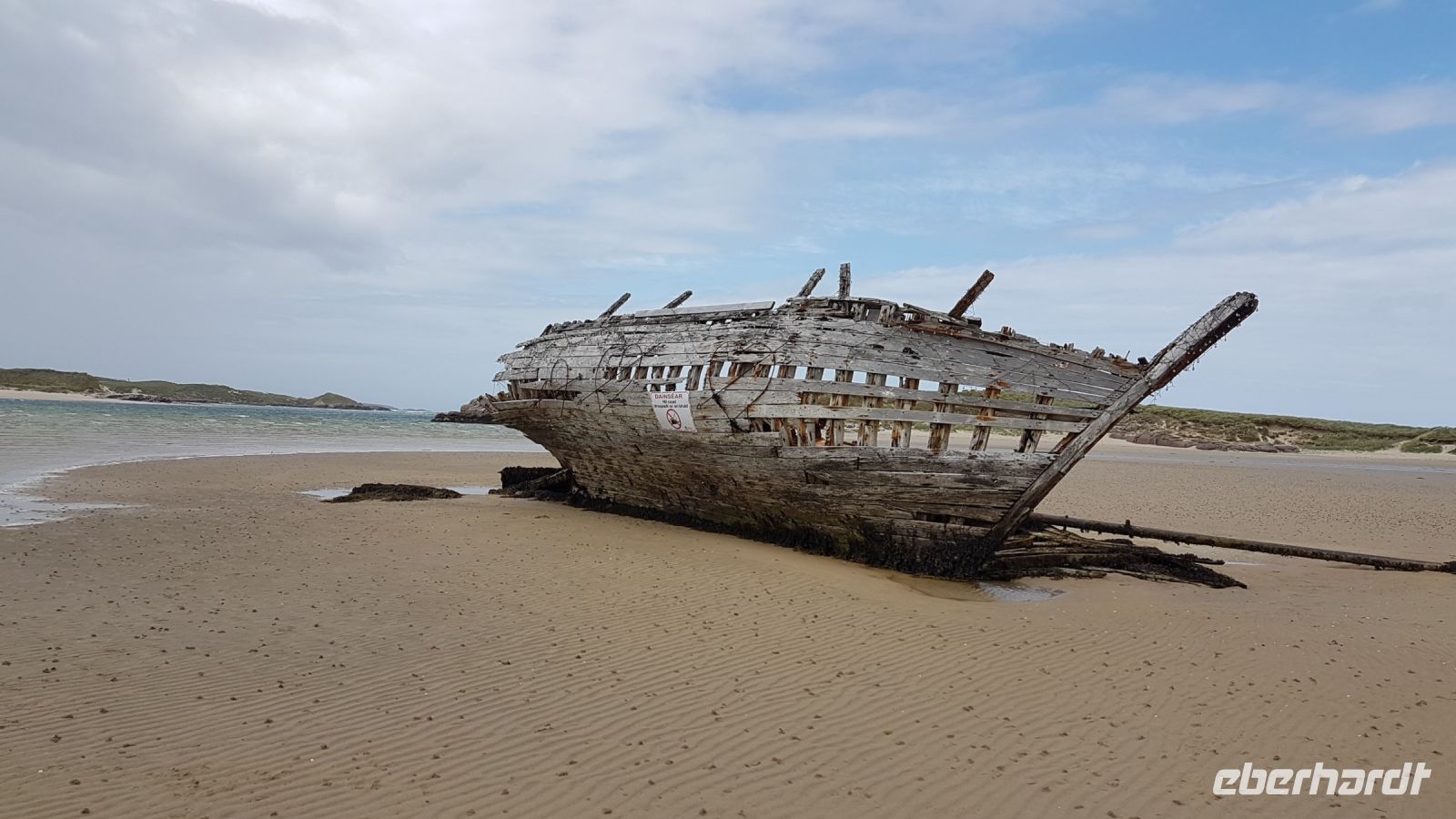 Nach kurzer Fahrt erreichten wir den höchsten Berg im County Donegal, den Mount Errigal mit 572 m Höhe. An seinem Fuß hielt unser Bus an und wir fotografierten einen idyllisch unter uns liegenden See mit kleiner Kirchenruine an seinem Ausläufer. Am Bunbeg Beach hielten wir wieder an und spazierten bei heftigem Wind – aber mit Sonnenschein - über den breiten Sandstrand zu einem alten Schiffswrack namens Bad Eddy, es entstanden beeindruckende Fotos.