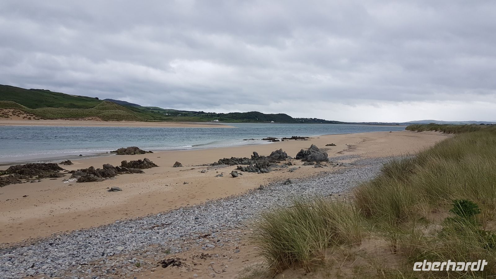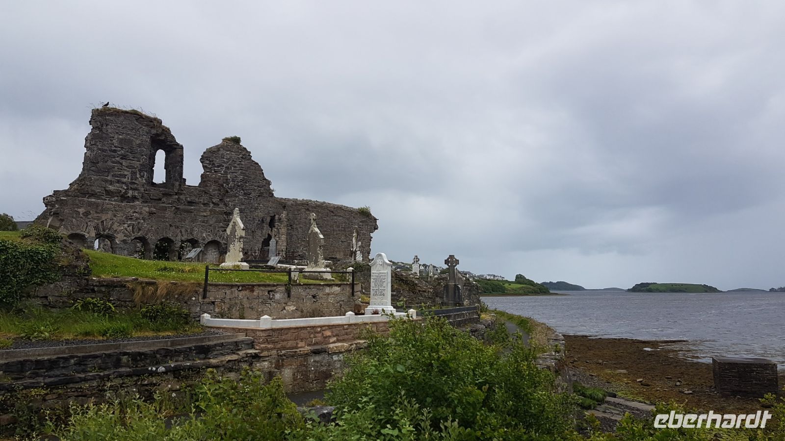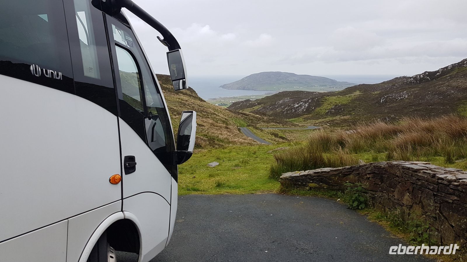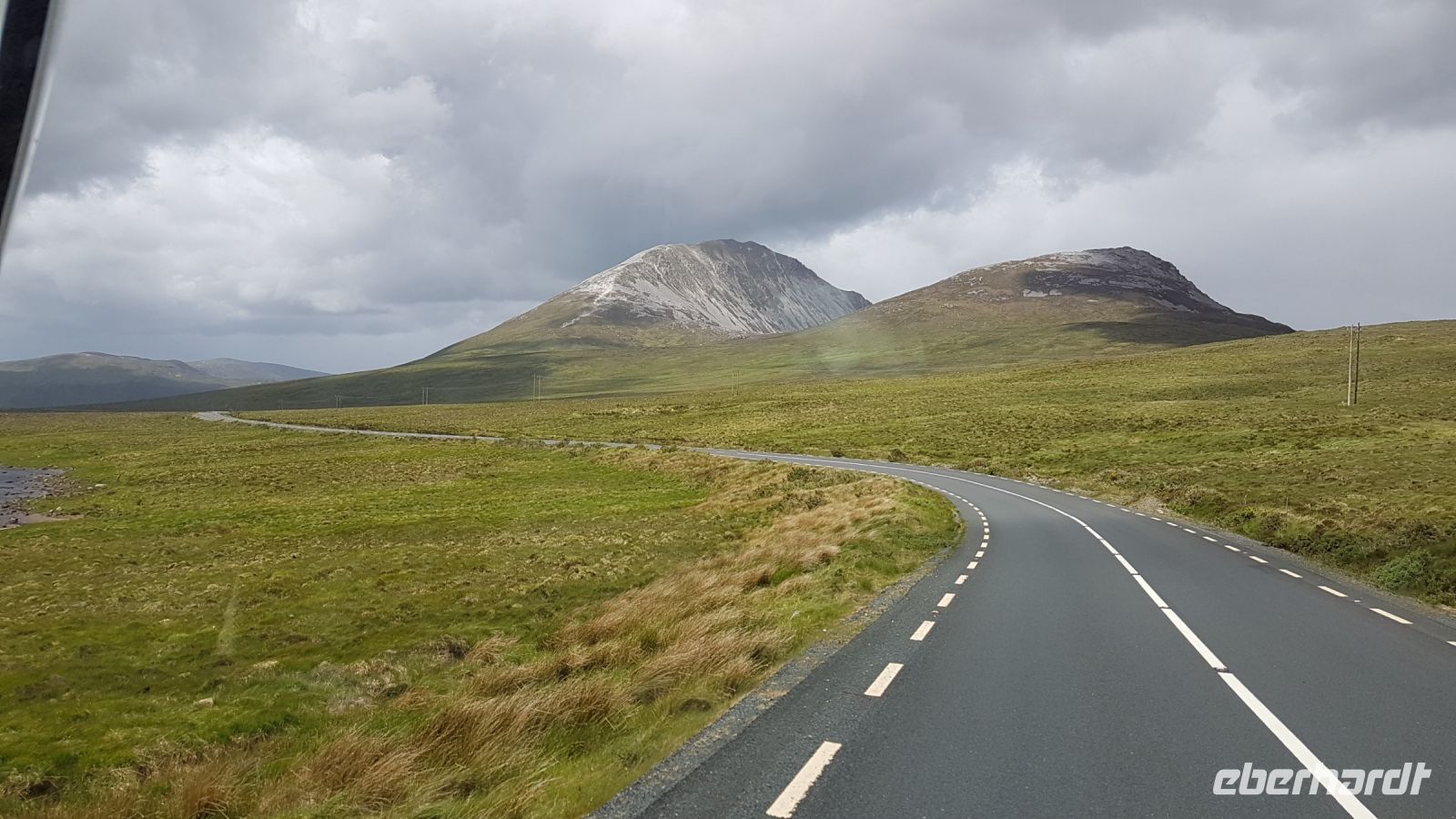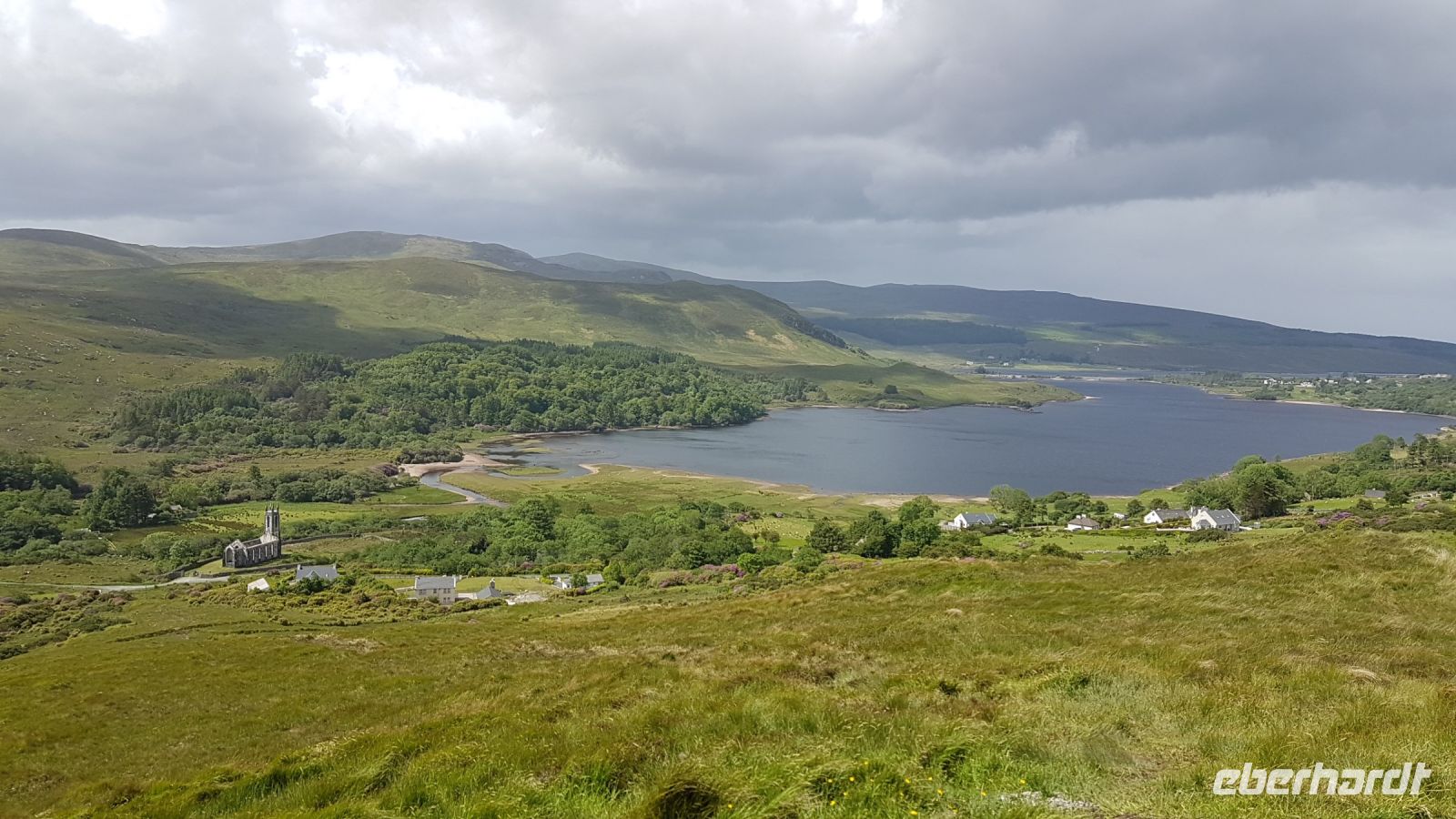 Nach kurzer Fahrt erreichten wir den höchsten Berg im County Donegal, den Mount Errigal mit 572 m Höhe. An seinem Fuß hielt unser Bus an und wir fotografierten einen idyllisch unter uns liegenden See mit kleiner Kirchenruine an seinem Ausläufer. Am Bunbeg Beach hielten wir wieder an und spazierten bei heftigem Wind – aber mit Sonnenschein - über den breiten Sandstrand zu einem alten Schiffswrack namens Bad Eddy, es entstanden beeindruckende Fotos.
