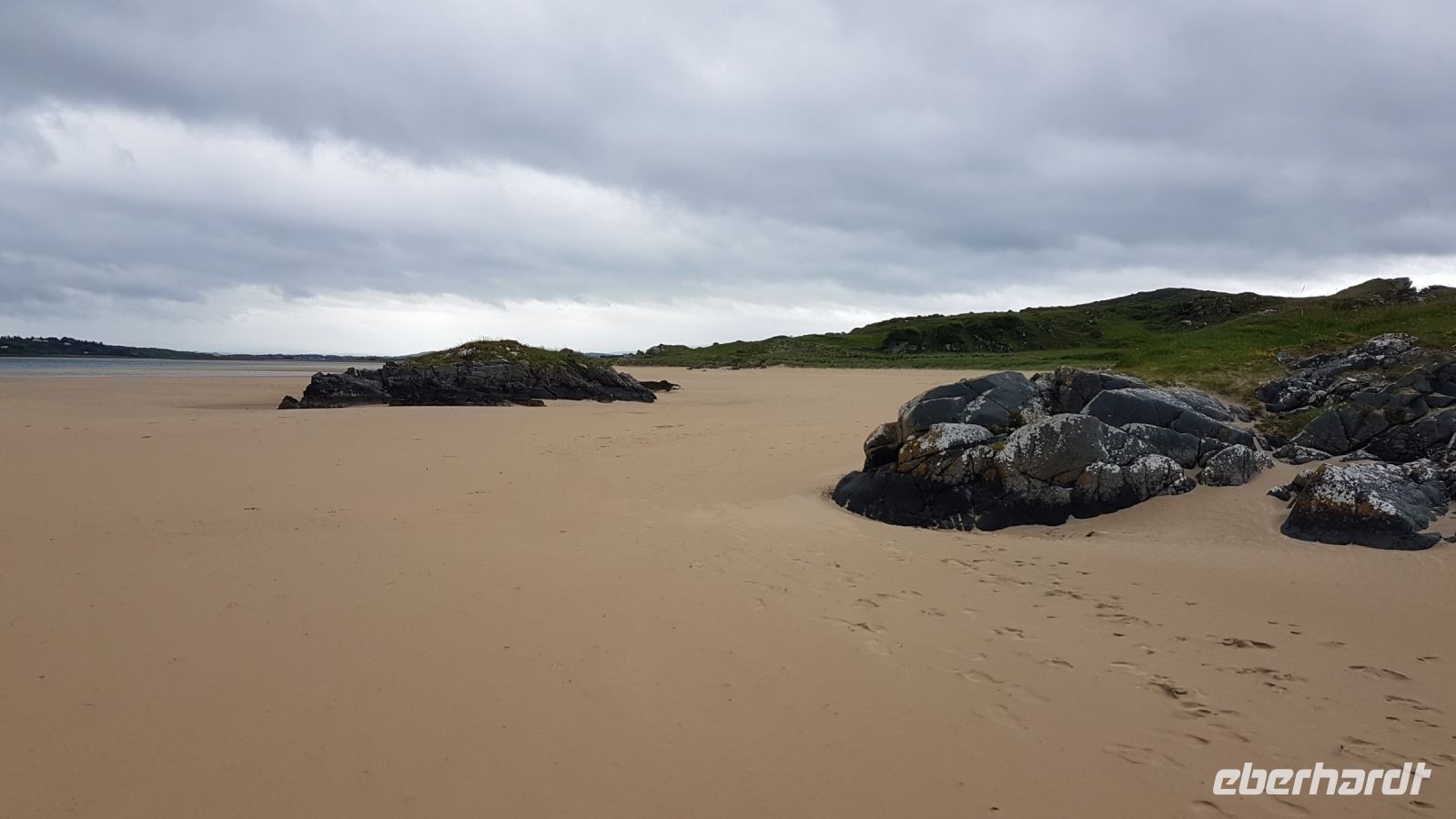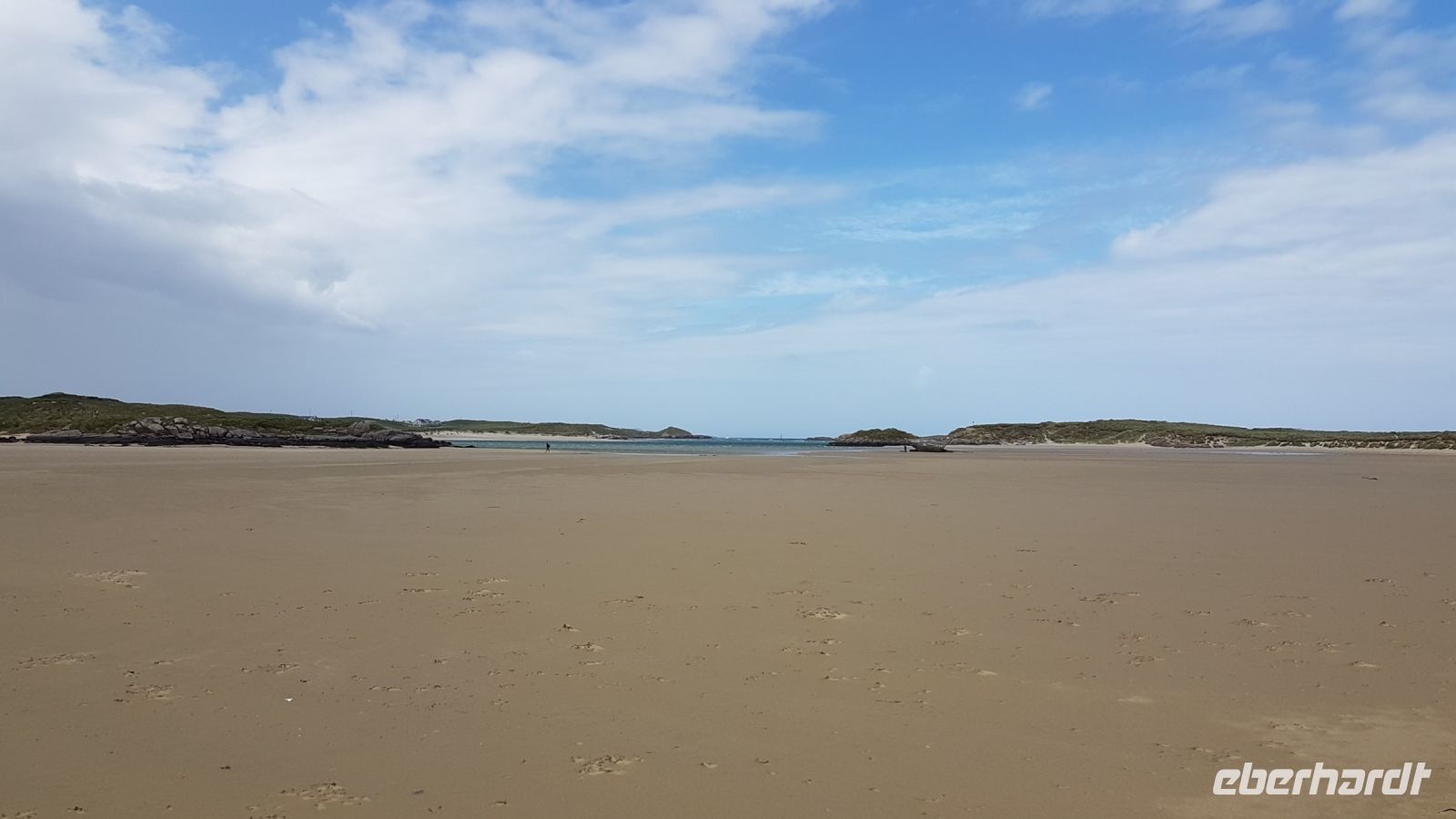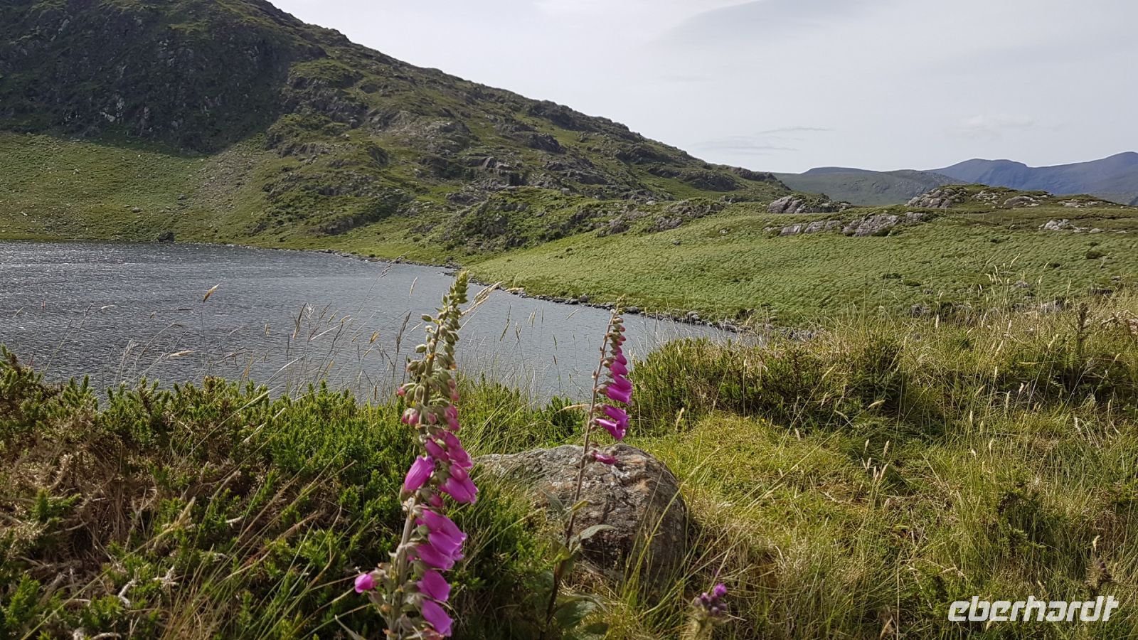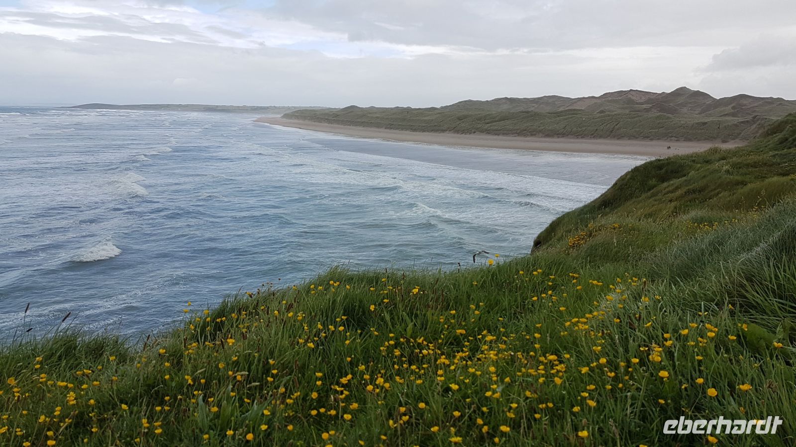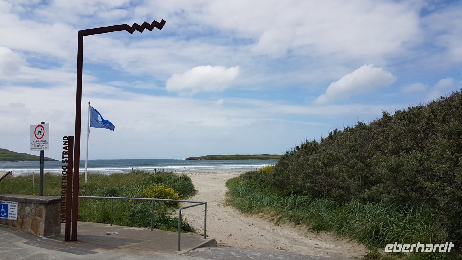 Nach kurzer Fahrt erreichten wir den höchsten Berg im County Donegal, den Mount Errigal mit 572 m Höhe. An seinem Fuß hielt unser Bus an und wir fotografierten einen idyllisch unter uns liegenden See mit kleiner Kirchenruine an seinem Ausläufer. Am Bunbeg Beach hielten wir wieder an und spazierten bei heftigem Wind – aber mit Sonnenschein - über den breiten Sandstrand zu einem alten Schiffswrack namens Bad Eddy, es entstanden beeindruckende Fotos.