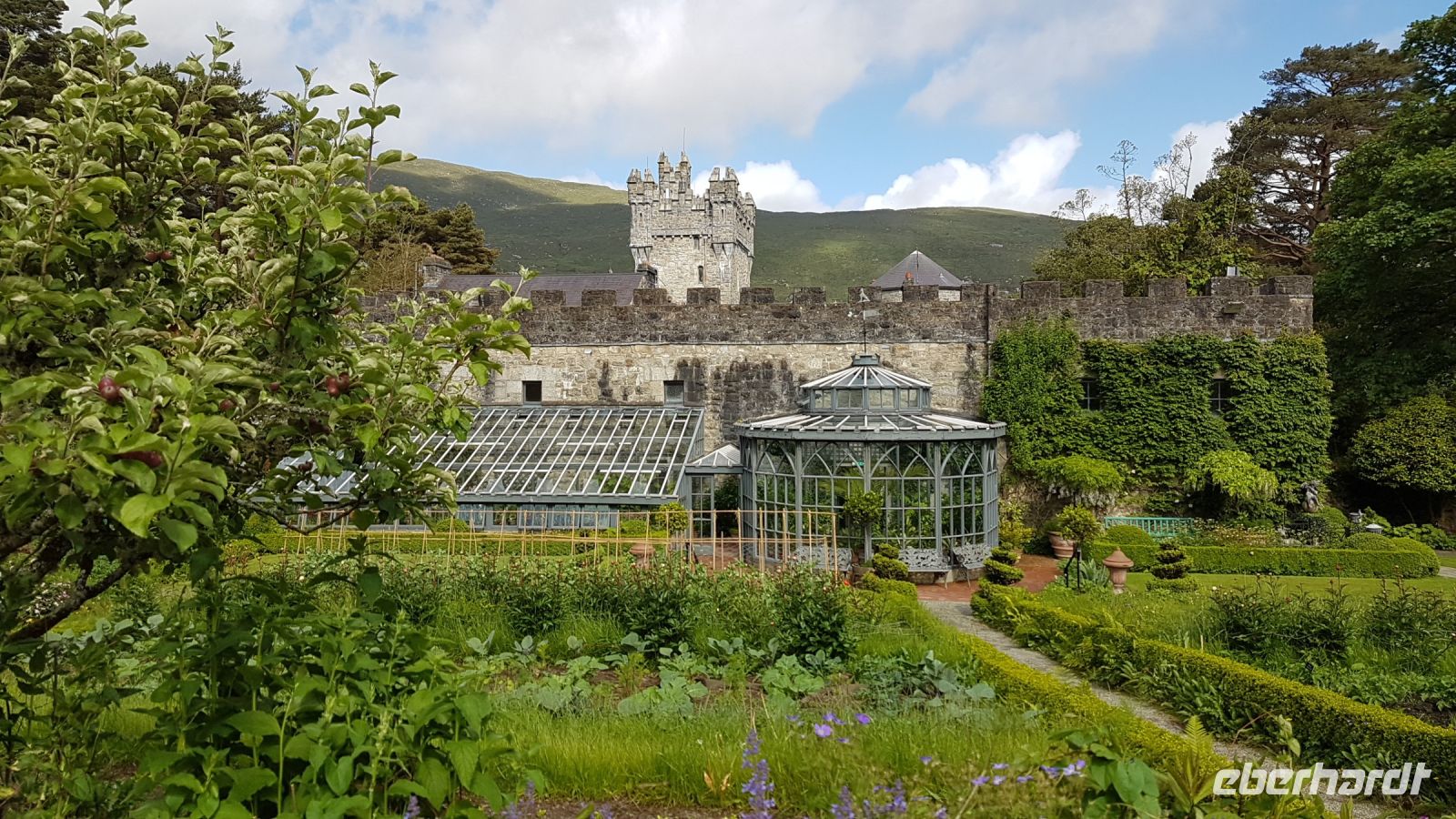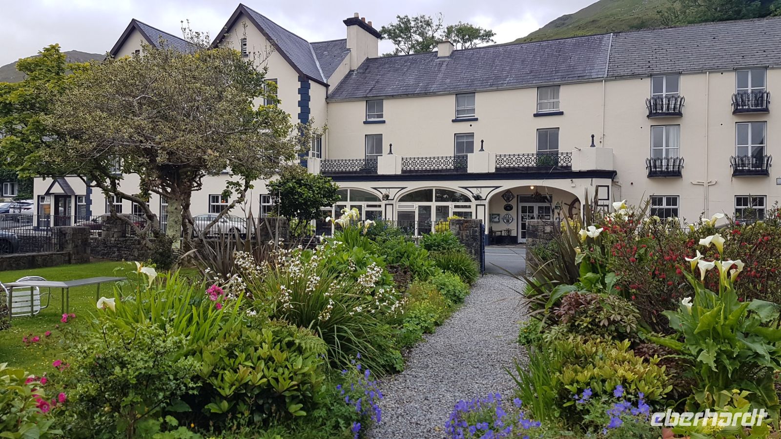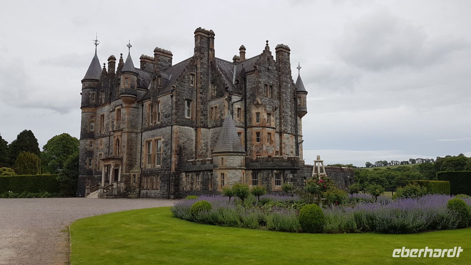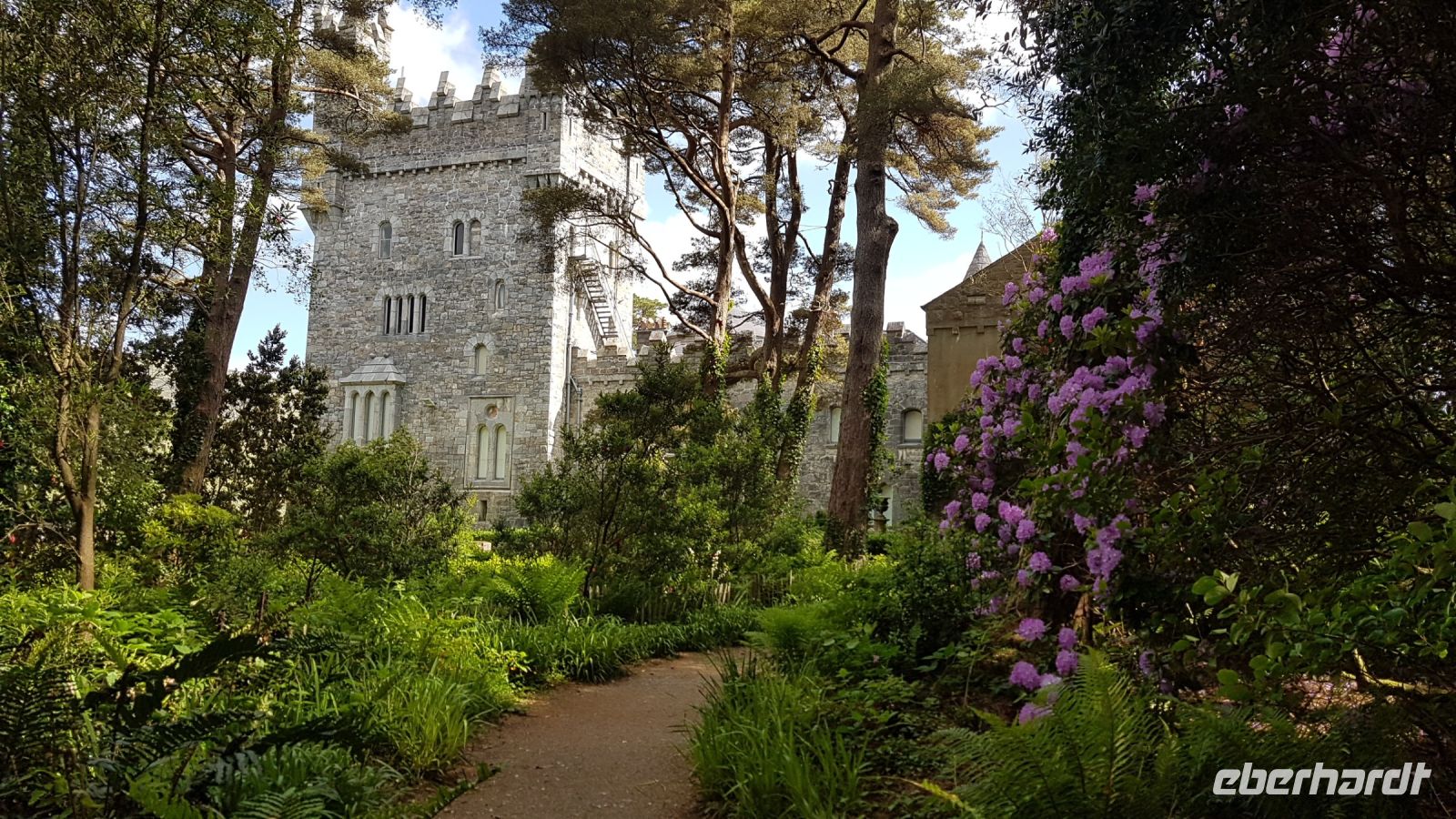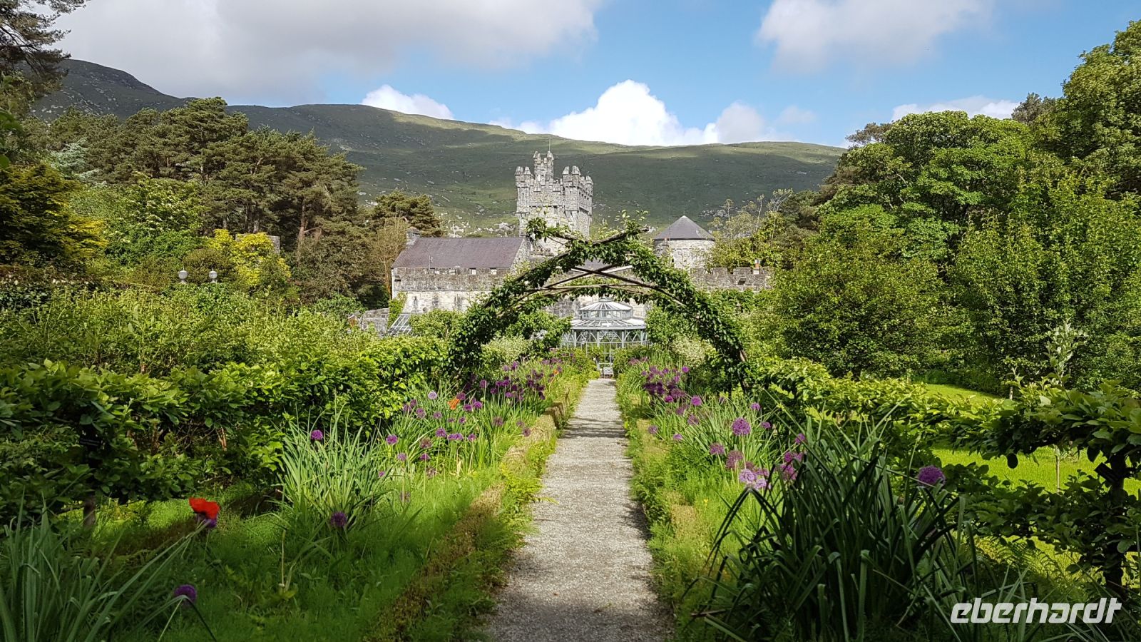 Dort angekommen, machten wir schöne Fotos bei herrlicher Sicht vom See und dem Castle aus der Ferne, das sich inmitten von rauher und karger Berglandschaft am idyllischen Ufer des Veagh Sees befindet. Es ist ein im Stil der schottischen Aristokratie errichtetes Schloss, es diente einst als Jagdschloss. Als Extra zu unserem Reiseprogramm wurden wir eingeladen, mit einem Shuttle-Bus zum Castle fahren. Wir spazierten durch herrlich angelegte Gärten, staunten über üppig blühenden Rhododendron und genossen den wunderbaren Blick über den See, der sich umrahmt von imposanten und nahezu kahlen Bergen zu Füßen des kleinen Schlosses erstreckt.
