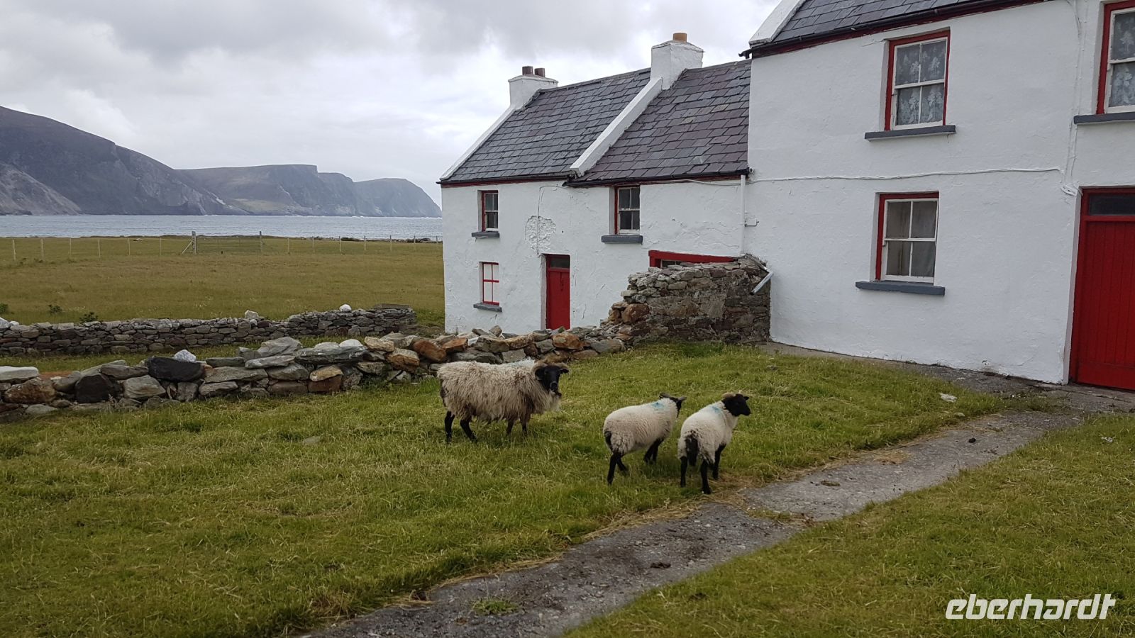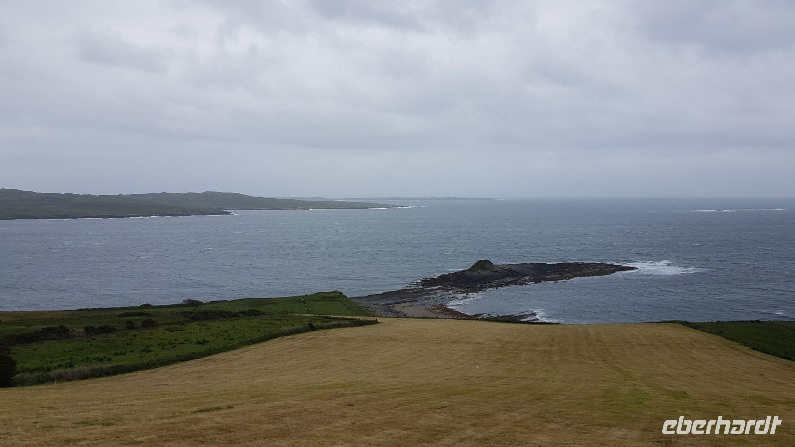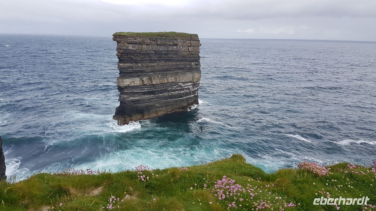 Nicht lange nach dem Frühstück verließen wir unser Hotel in Ballina und erreichten wieder die Küste und den Wild Atlantic Way. Am Downpatrick Head, einem etwa 50 Meter hohen Felspfeiler, der einsam der Brandung trotzt, machten wir einen Spaziergang über den Klippen. Das Wetter war ganz gut, es blieb weitgehend trocken, so dass wir beeindruckende Fotos machen konnten, obwohl ein starker Wind kräftig über die Klippen blies. Bei starker Brandung beobachteten wir, mit welcher Kraft das Wasser an die Felsklippen schoss und die weitere Erosion dieser Gesteinsformationen verursacht. Irgendwann in der ferneren Zukunft wird sich der nächste Pfeiler vom Klippenmassiv lösen. Mit vielen neuen Eindrücken und unzähligen tollen Fotos im Gepäck erreichten wir nach unserem Besuch am Downpatrick Head unseren Bus. Im Besucherzentrum von Ceide Fields erfuhren wir viel Interessantes über diese prähistorische Stätte. Vor etwa 5000 Jahren siedelten hier Menschen, die als Bauern von Feldarbeit und Viehzucht lebten. Am Mittag verließen wir Ceide Fields und fuhren in Richtung Südwesten davon, bald erreichten wir den Ballycroy Nationalpark. Im dortigen Besucherzentrum legten wir eine Pause ein für Kaffee, Snacks oder leckeren Kuchen. Am frühen Nachmittag fuhren wir nach Achill Island, die größte Insel der Republik Irland. Wir besuchten Keel Beach, unternahmen einen Strandspaziergang, fotografierten Schafe auf ausgesprochen grünen Weiden und kauften irische Souvenirs. Den Abend verbrachten wir in unserem Hotel in Leenane mit wunderbarer Lage am Leenane Fjord und bei einem leckeren Abendessen.