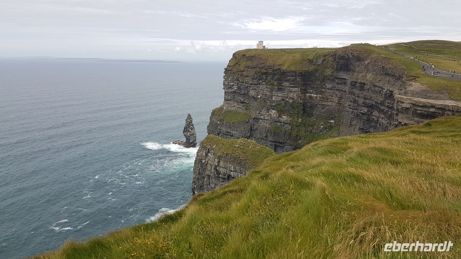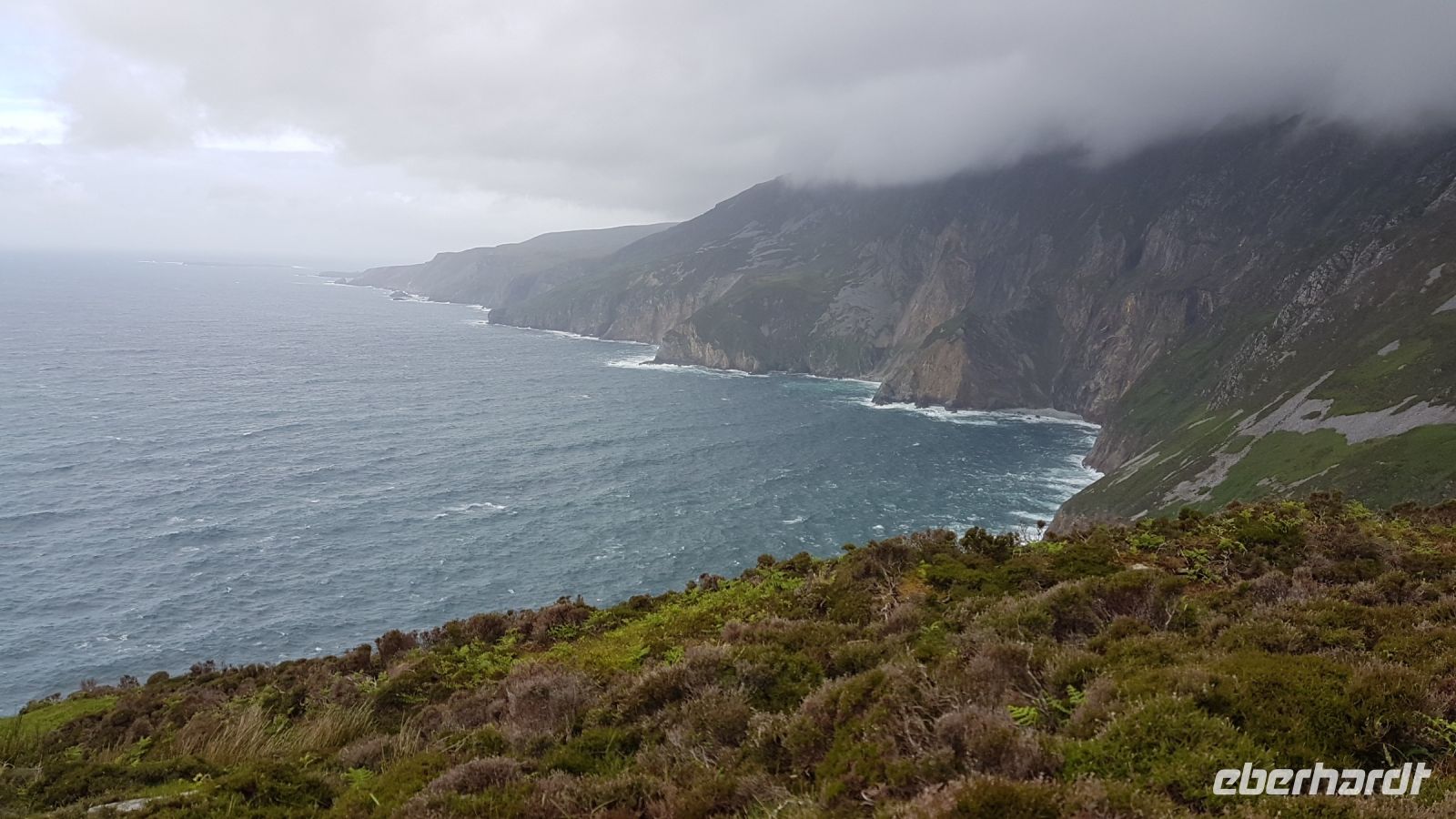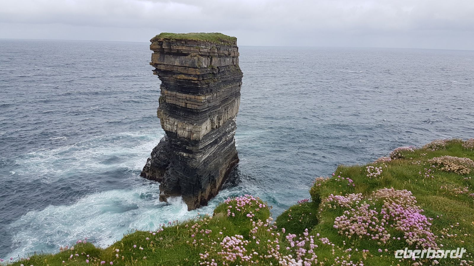 Nicht lange nach dem Frühstück verließen wir unser Hotel in Ballina und erreichten wieder die Küste und den Wild Atlantic Way. Am Downpatrick Head, einem etwa 50 Meter hohen Felspfeiler, der einsam der Brandung trotzt, machten wir einen Spaziergang über den Klippen. Das Wetter war ganz gut, es blieb weitgehend trocken, so dass wir beeindruckende Fotos machen konnten, obwohl ein starker Wind kräftig über die Klippen blies. Bei starker Brandung beobachteten wir, mit welcher Kraft das Wasser an die Felsklippen schoss und die weitere Erosion dieser Gesteinsformationen verursacht. Irgendwann in der ferneren Zukunft wird sich der nächste Pfeiler vom Klippenmassiv lösen. Mit vielen neuen Eindrücken und unzähligen tollen Fotos im Gepäck erreichten wir nach unserem Besuch am Downpatrick Head unseren Bus. Im Besucherzentrum von Ceide Fields erfuhren wir viel Interessantes über diese prähistorische Stätte. Vor etwa 5000 Jahren siedelten hier Menschen, die als Bauern von Feldarbeit und Viehzucht lebten. Am Mittag verließen wir Ceide Fields und fuhren in Richtung Südwesten davon, bald erreichten wir den Ballycroy Nationalpark. Im dortigen Besucherzentrum legten wir eine Pause ein für Kaffee, Snacks oder leckeren Kuchen. Am frühen Nachmittag fuhren wir nach Achill Island, die größte Insel der Republik Irland. Wir besuchten Keel Beach, unternahmen einen Strandspaziergang, fotografierten Schafe auf ausgesprochen grünen Weiden und kauften irische Souvenirs. Den Abend verbrachten wir in unserem Hotel in Leenane mit wunderbarer Lage am Leenane Fjord und bei einem leckeren Abendessen.