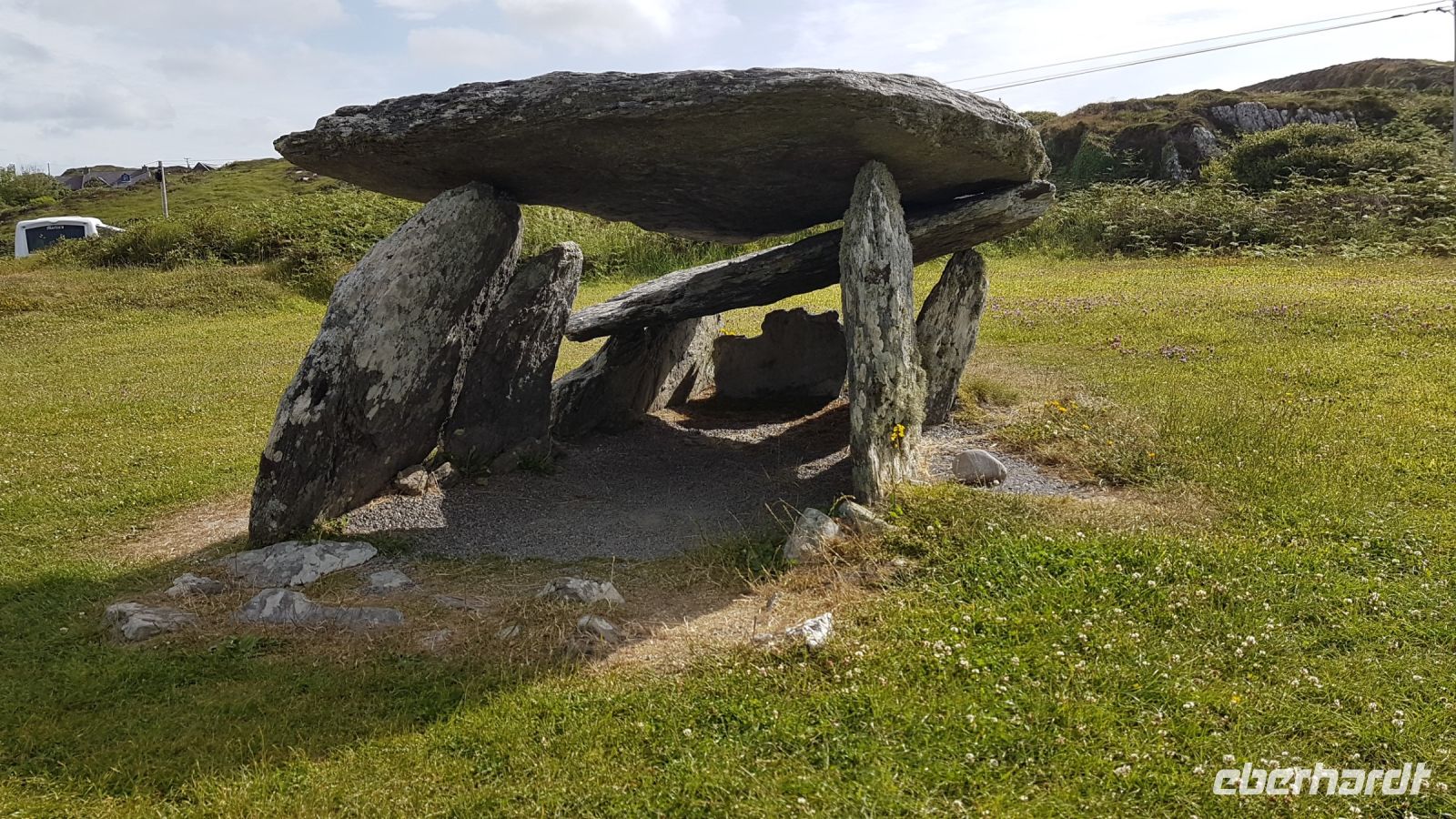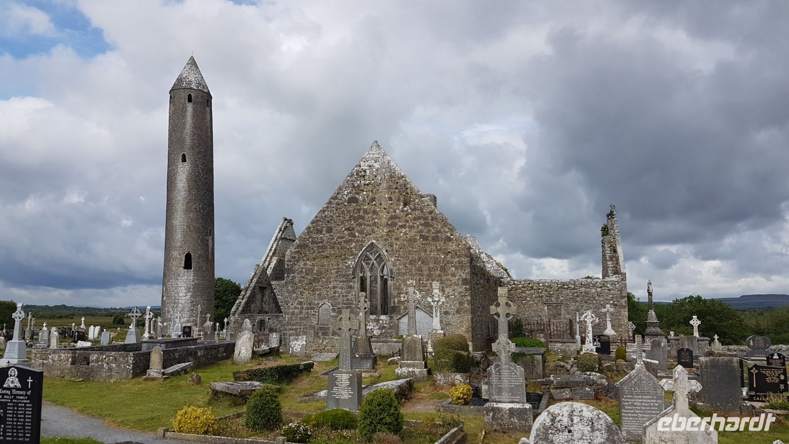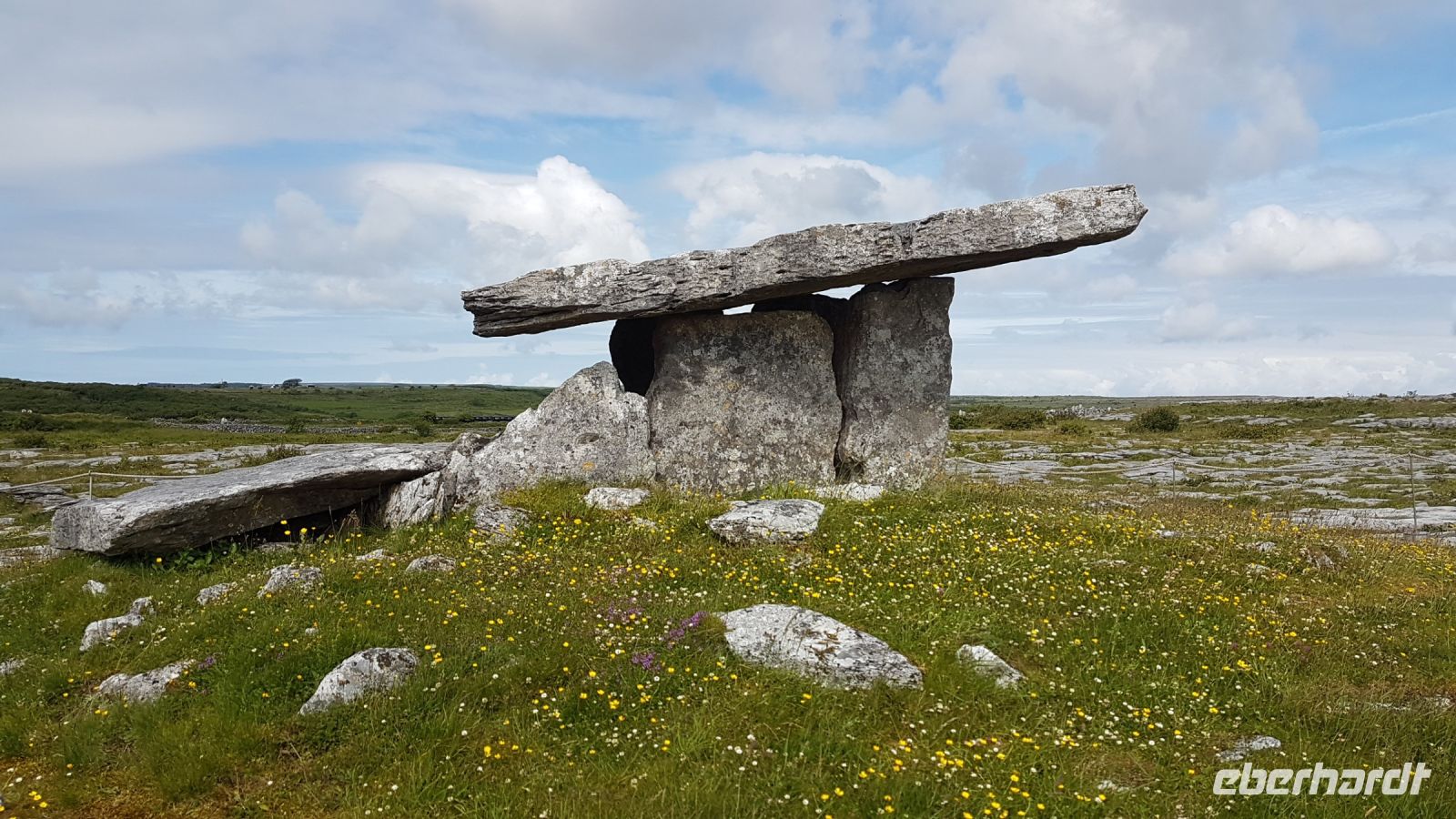 Der Morgen empfing uns mit schönem Wetter, wir verließen Galway und fuhren in Richtung Südwesten, um zum Burren zu gelangen. Der Burren ist eine Karstlandschaft. Flache Kalksteinplatten bedecken das Gelände, manchmal hatten wir das Gefühl, in einer Mondlandschaft zu stehen. Zunächst hielten wir an der ehemaligen Klosteranlage Kilmacduagh Abbey und fotografierten die beeindruckende Ruinenanlage mit einem der besterhaltenen Rundtürme Irlands. Auch prähistorische Monumente gibt es zahlreich in dieser einzigartigen Gegend. So hielten wir an am sogenannten Mühlsteintor, dem Poulnabrone Dolmen mitten im Burren. Wir staunten über die frühzeitlichen Menschen, die dieses Steingebilde vor etwa fünfeinhalb Tausend Jahren aufgebaut haben sollen.