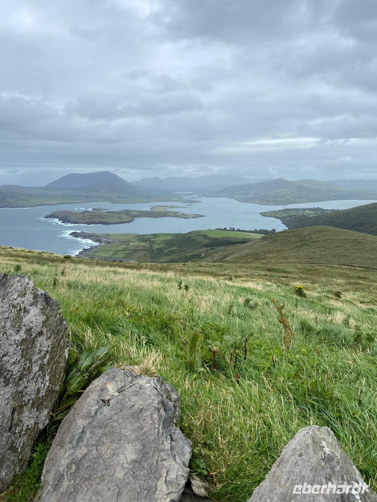 Vom Aussichtspunkt „Geokaun“ hat man dann quasi eine komplette Rundumsicht auf diese fast unbewohnt wirkende Insel. Diese kleine Insel strahlt einen besonderen, natürlichen Charme aus. Auf dem tollen Aussichtspunkt sind wir ganz alleine und auch beim späteren Spaziergang in dem liebenswerten Ort Portmagee kommt man sich vor, als sei die Zeit hier irgendwann einfach stehengeblieben.
