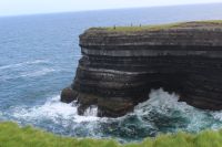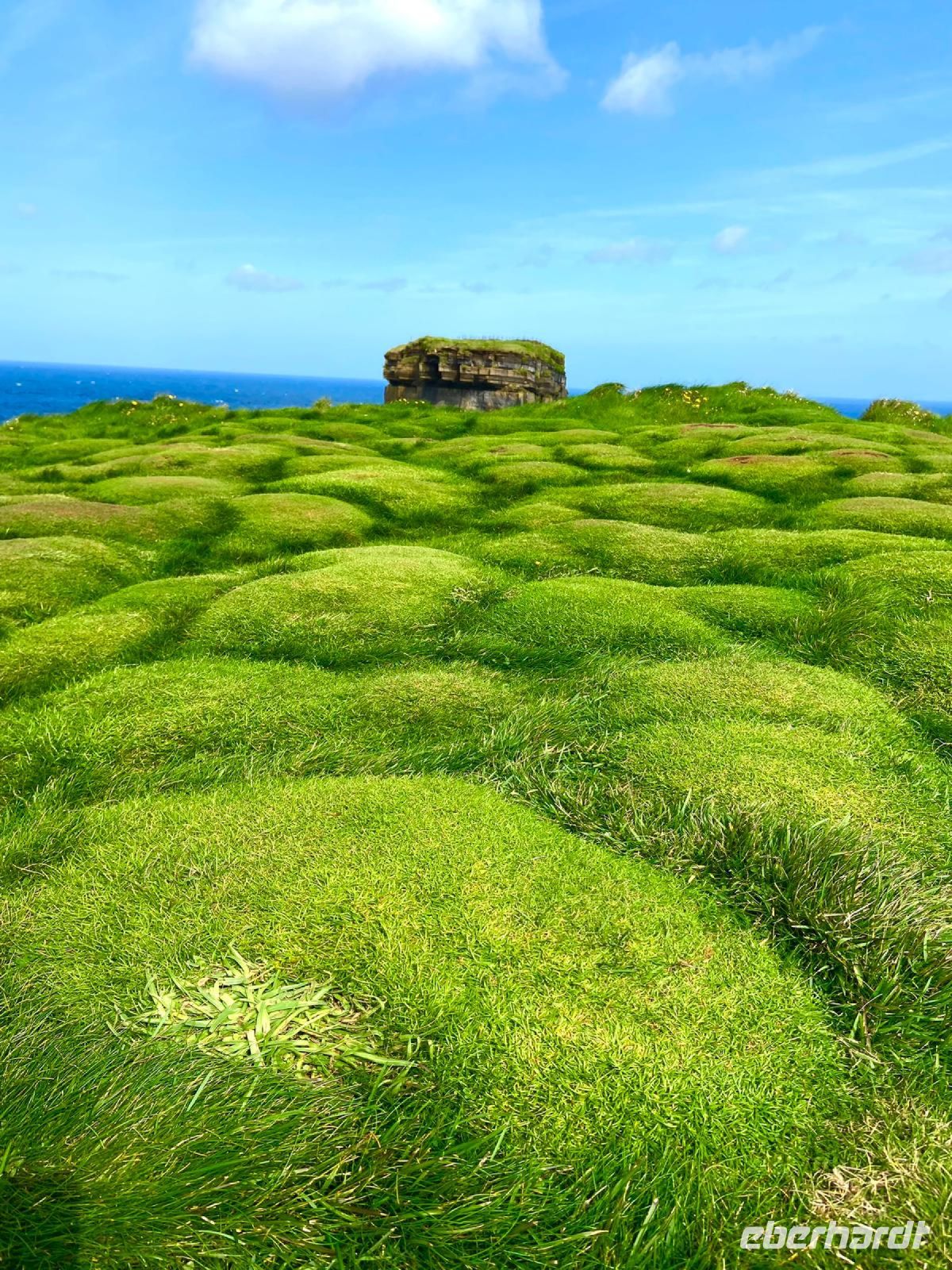 Weiter geht es dann bei inzwischen gutem Wetter zu dem nahegelegehen, spektakulären Felsen im Atlantik namens “Downpatrick Head” und wir spazieren auf den federnd weichen, frischgrünen Moosflächen entlang der windigen Klippen, um dieses Naturschauspiel aus der Nähe sehen zu können.