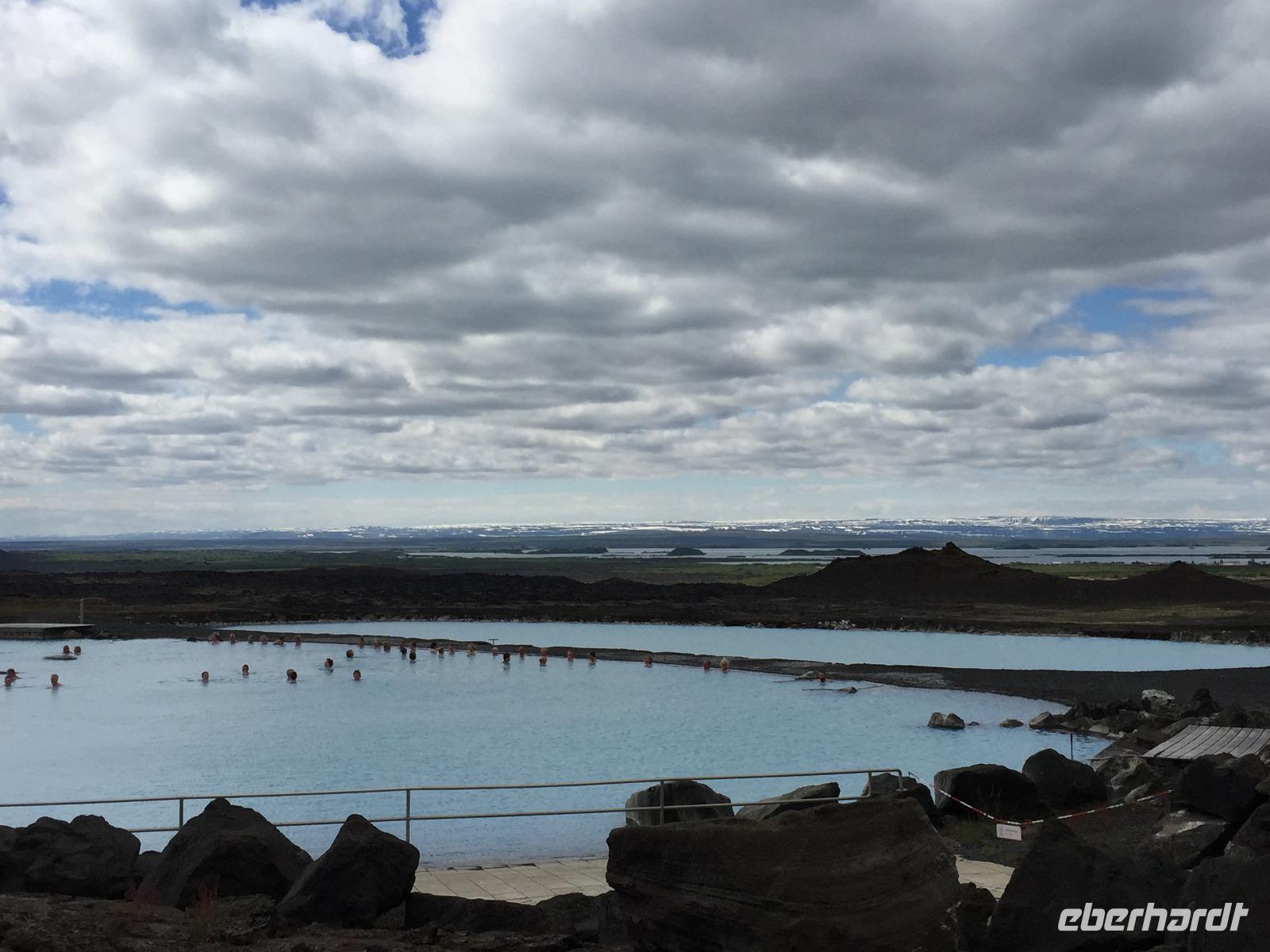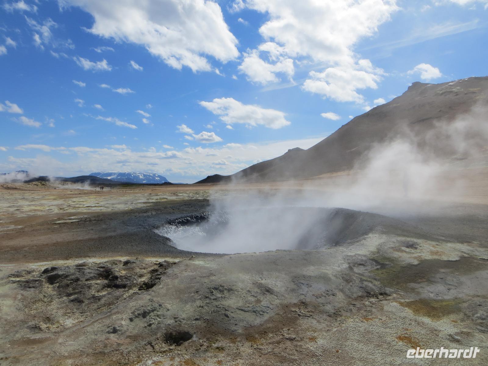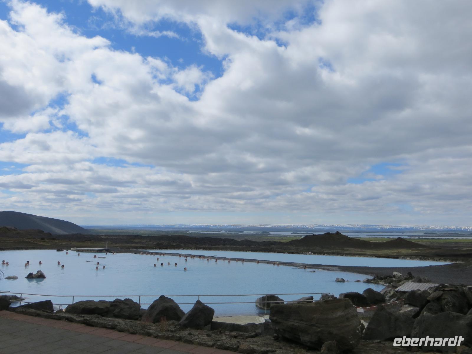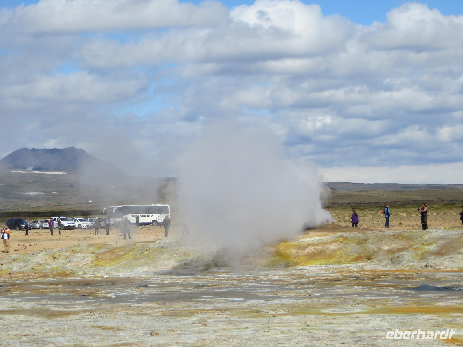 Heute verlassen wir bereits 08:00 Uhr unser Hotel, denn inzwischen hat ein AIDA-Kreuzfahrschiff angelegt und wir möchten die heutigen Programmpunkte ohne die vielen Kreuzfahrtbusse erleben. Wir blicken von der anderen Fjordseite noch einmal auf Akureyri zurück und fahren immer bergauf durch eine Postkartenidylle mit Gletschern, Wasserfällen, Flüssen und strahlend blauen Himmel. Wir haben bisher riesiges Glück mit dem Wetter, nur Sonnenschein. Unser erstes Ziel für heute ist der Godafoss, dem Götterwasserfall. Hier kommen wir wieder mit der endlosen Sagenwelt der Isländer hautnah in Berührung, denn einst sollen hier, als man das Christentums als Staatsreligion übernommen hatte, die letzten heidnischen Götterbilder hinabgestürzt worden sein. So entstand der Name für den imposanten Wasserfall. Unser nächster Stopp ist die Heimat der 13 isländischen Weihnachtsmänner - Dimmuborgir. Wir spazieren auf gut ausgebauten Wegen durch die skurille Felslandschaft. Die Weihnachtsmänner treffen wir leider nicht, amüsieren uns aber sehr über Haralds Geschichten zu Löffellecker, Türentreter und Fensterglotzer. Dann fahren wir zur Grjotagja-Spalte, einer kleinen Höhle mit See, die einst zum Baden genutzt wurde, bis das Wasser zu heiß wurde. Bekannt ist sie Liebhabern von der zur Zeit populären Serie „Game of Thrones", da diese (wie auch viele andere Orte Islands) als Drehort diente. Nachdem wir nacheinander die kleine Höhle besichtigt haben, geht es weiter zu einem ganz besonderen Erlebnis: in der Badelandschaft Jardbödin entspannen wir in den heißen Quellen bei 12°C Außentemperatur und schneebedeckten Gipfeln im Hintergrund. Wir genießen es sehr! So entspannt fahren wir zum Dettifoss, dem energiereichsten Wasserfall Europas. Nach einem kurzen Spaziergang erreichen wir diesen und lassen uns den Sprühregen nicht nur ins Gesicht wehen. Über eine Breite von ca. 100m stürzen die Wassermassen 45 tief herab, ein beeindruckendes Schauspiel. Auf dem Rückweg sehen wir von Weitem den Herdubreid - den Berg namens „Breite Schultern" - wir lieben die Isländer für Ihre Namensgebungen jedes Mal aufs Neue. Dann gelangen wir zum aktiven Solfatarenfeld Hverarönd (oder Namaskard), eine endlose, sich immer verändernde, Weite mit blubbernden Schlammtümpeln und dampfenden Quellen. Schwefelgeruch und tolle Farbspiele erwarten uns hier. Wir übernachten heute am Myvatn, den Mückensee, zum Glück heute ohne eine einzige dieser Tierchen. Am Seeufer entlang spazieren wir zu den Pseudokratern von Skutustadagigar, bevor wir mit einem Abendessen den Tag beenden.