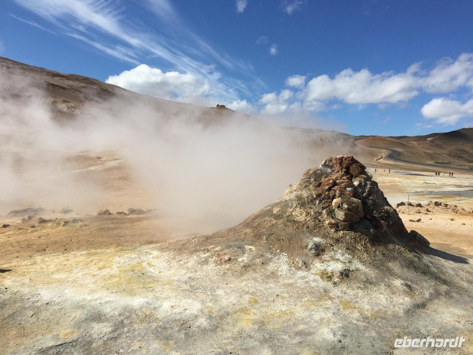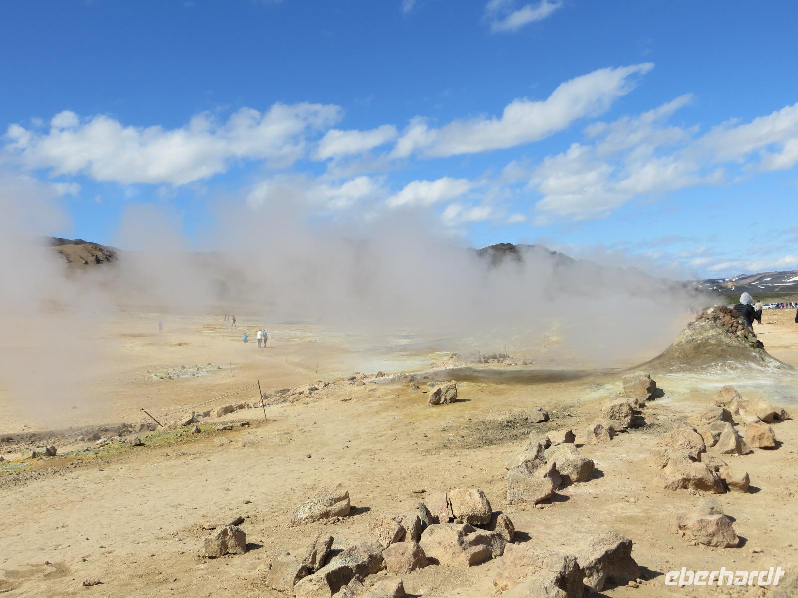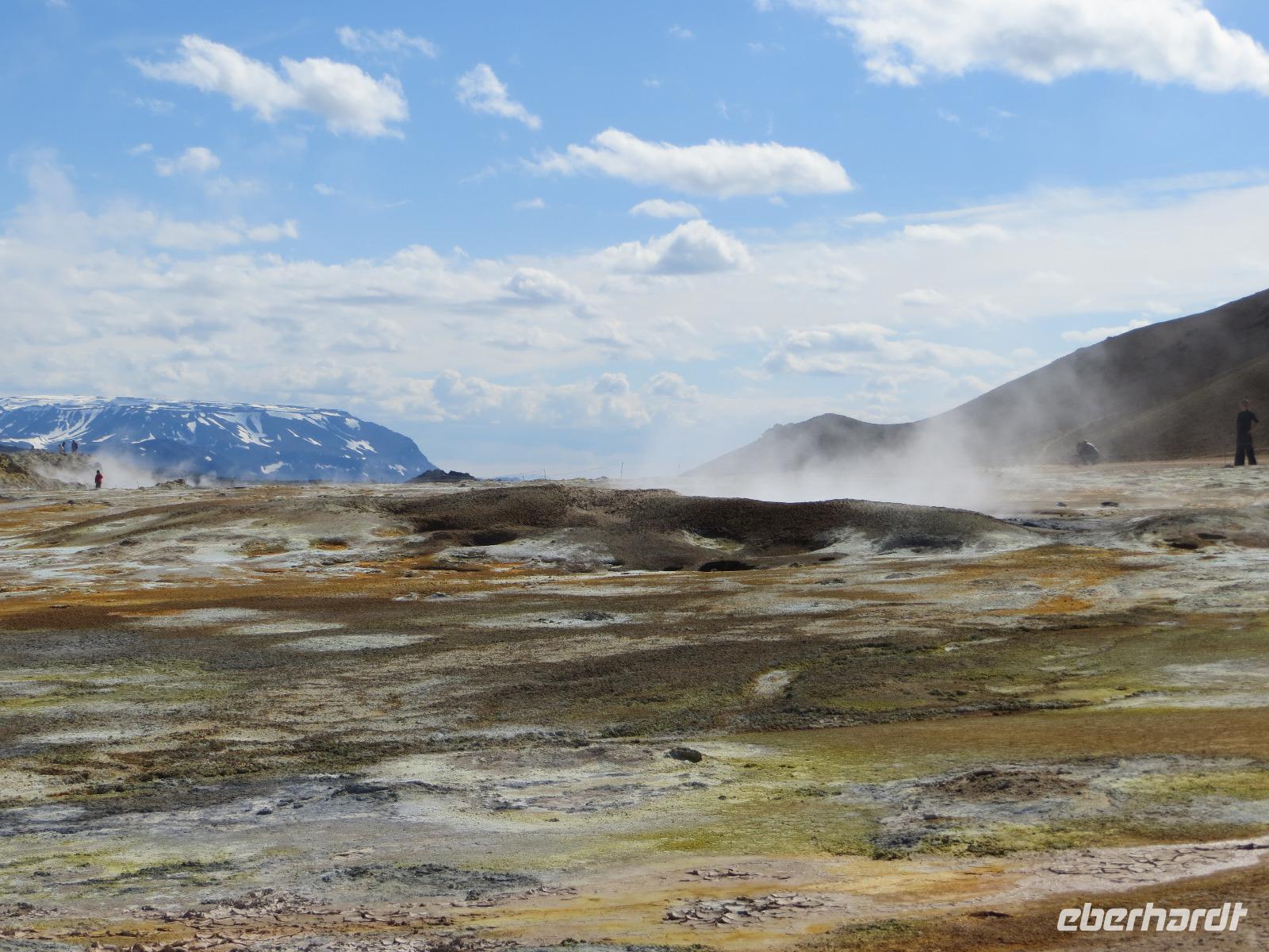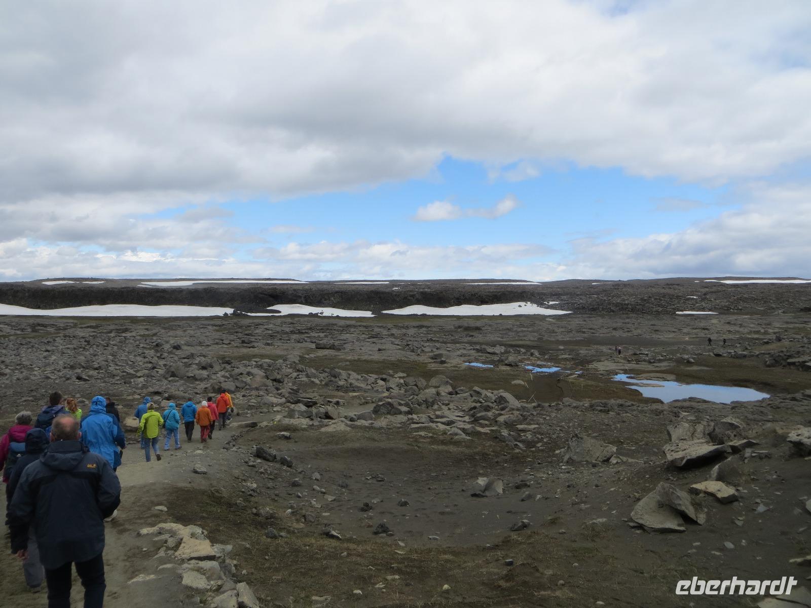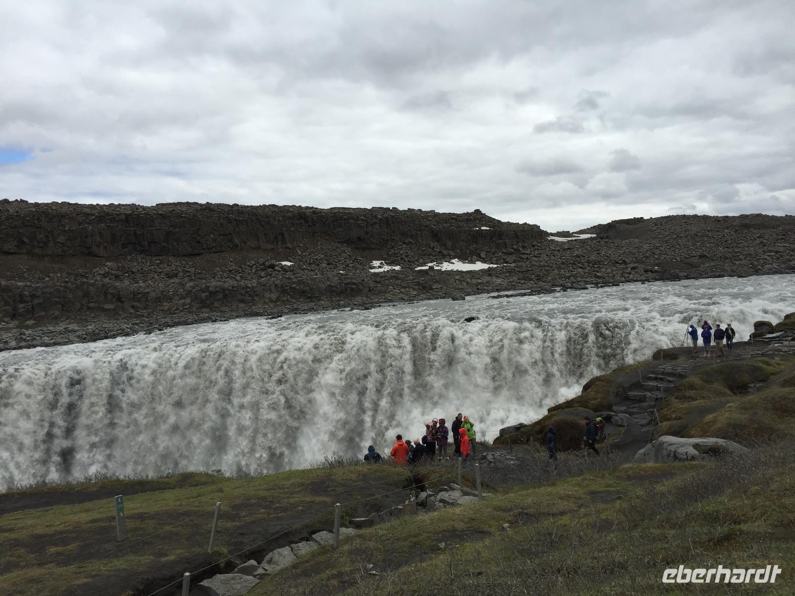 Heute verlassen wir bereits 08:00 Uhr unser Hotel, denn inzwischen hat ein AIDA-Kreuzfahrschiff angelegt und wir möchten die heutigen Programmpunkte ohne die vielen Kreuzfahrtbusse erleben. Wir blicken von der anderen Fjordseite noch einmal auf Akureyri zurück und fahren immer bergauf durch eine Postkartenidylle mit Gletschern, Wasserfällen, Flüssen und strahlend blauen Himmel. Wir haben bisher riesiges Glück mit dem Wetter, nur Sonnenschein. Unser erstes Ziel für heute ist der Godafoss, dem Götterwasserfall. Hier kommen wir wieder mit der endlosen Sagenwelt der Isländer hautnah in Berührung, denn einst sollen hier, als man das Christentums als Staatsreligion übernommen hatte, die letzten heidnischen Götterbilder hinabgestürzt worden sein. So entstand der Name für den imposanten Wasserfall. Unser nächster Stopp ist die Heimat der 13 isländischen Weihnachtsmänner - Dimmuborgir. Wir spazieren auf gut ausgebauten Wegen durch die skurille Felslandschaft. Die Weihnachtsmänner treffen wir leider nicht, amüsieren uns aber sehr über Haralds Geschichten zu Löffellecker, Türentreter und Fensterglotzer. Dann fahren wir zur Grjotagja-Spalte, einer kleinen Höhle mit See, die einst zum Baden genutzt wurde, bis das Wasser zu heiß wurde. Bekannt ist sie Liebhabern von der zur Zeit populären Serie „Game of Thrones", da diese (wie auch viele andere Orte Islands) als Drehort diente. Nachdem wir nacheinander die kleine Höhle besichtigt haben, geht es weiter zu einem ganz besonderen Erlebnis: in der Badelandschaft Jardbödin entspannen wir in den heißen Quellen bei 12°C Außentemperatur und schneebedeckten Gipfeln im Hintergrund. Wir genießen es sehr! So entspannt fahren wir zum Dettifoss, dem energiereichsten Wasserfall Europas. Nach einem kurzen Spaziergang erreichen wir diesen und lassen uns den Sprühregen nicht nur ins Gesicht wehen. Über eine Breite von ca. 100m stürzen die Wassermassen 45 tief herab, ein beeindruckendes Schauspiel. Auf dem Rückweg sehen wir von Weitem den Herdubreid - den Berg namens „Breite Schultern" - wir lieben die Isländer für Ihre Namensgebungen jedes Mal aufs Neue. Dann gelangen wir zum aktiven Solfatarenfeld Hverarönd (oder Namaskard), eine endlose, sich immer verändernde, Weite mit blubbernden Schlammtümpeln und dampfenden Quellen. Schwefelgeruch und tolle Farbspiele erwarten uns hier. Wir übernachten heute am Myvatn, den Mückensee, zum Glück heute ohne eine einzige dieser Tierchen. Am Seeufer entlang spazieren wir zu den Pseudokratern von Skutustadagigar, bevor wir mit einem Abendessen den Tag beenden.
