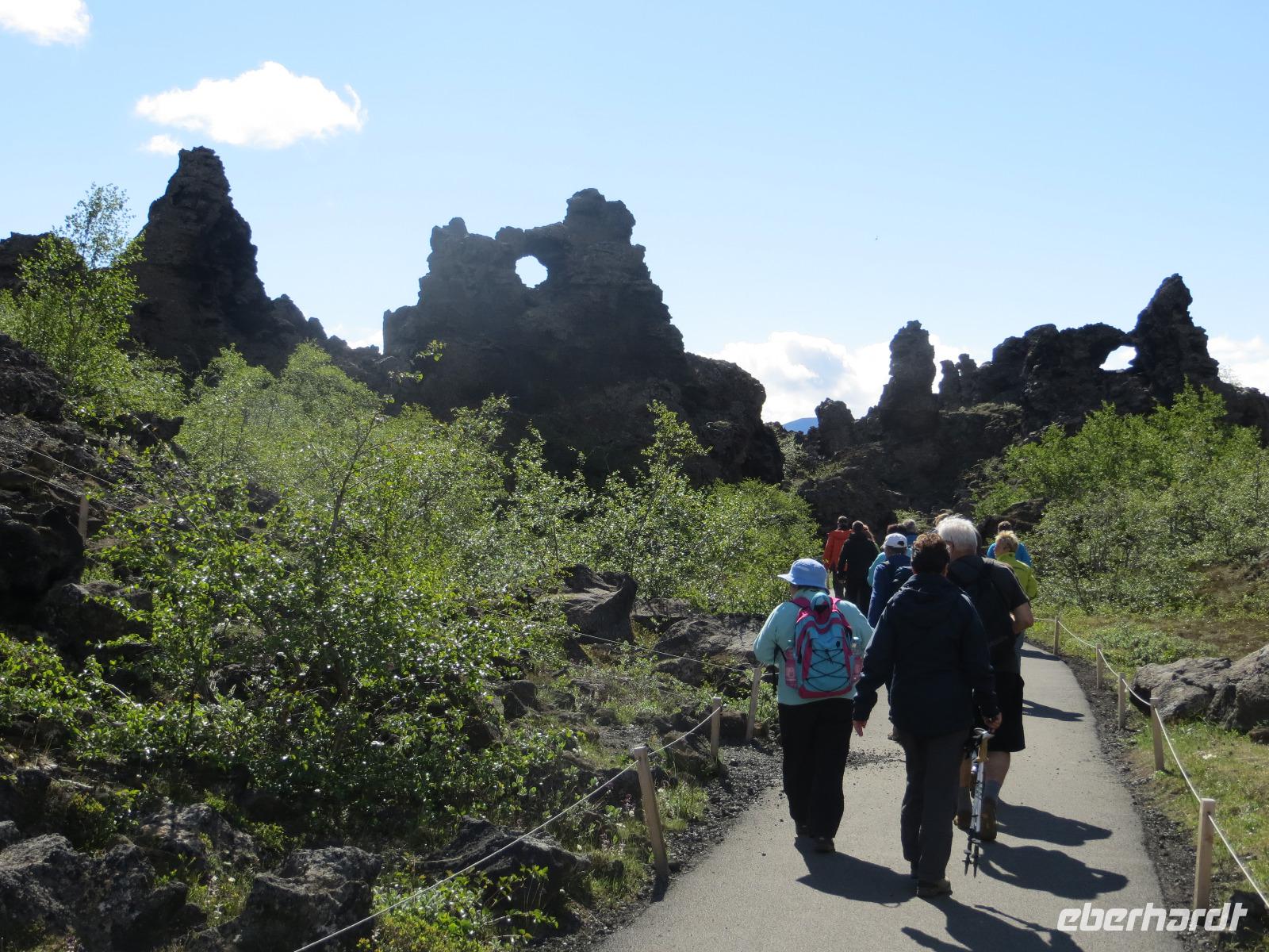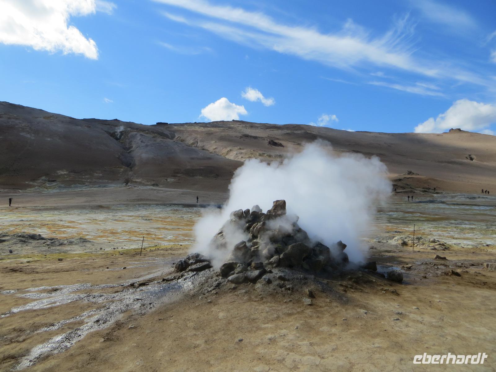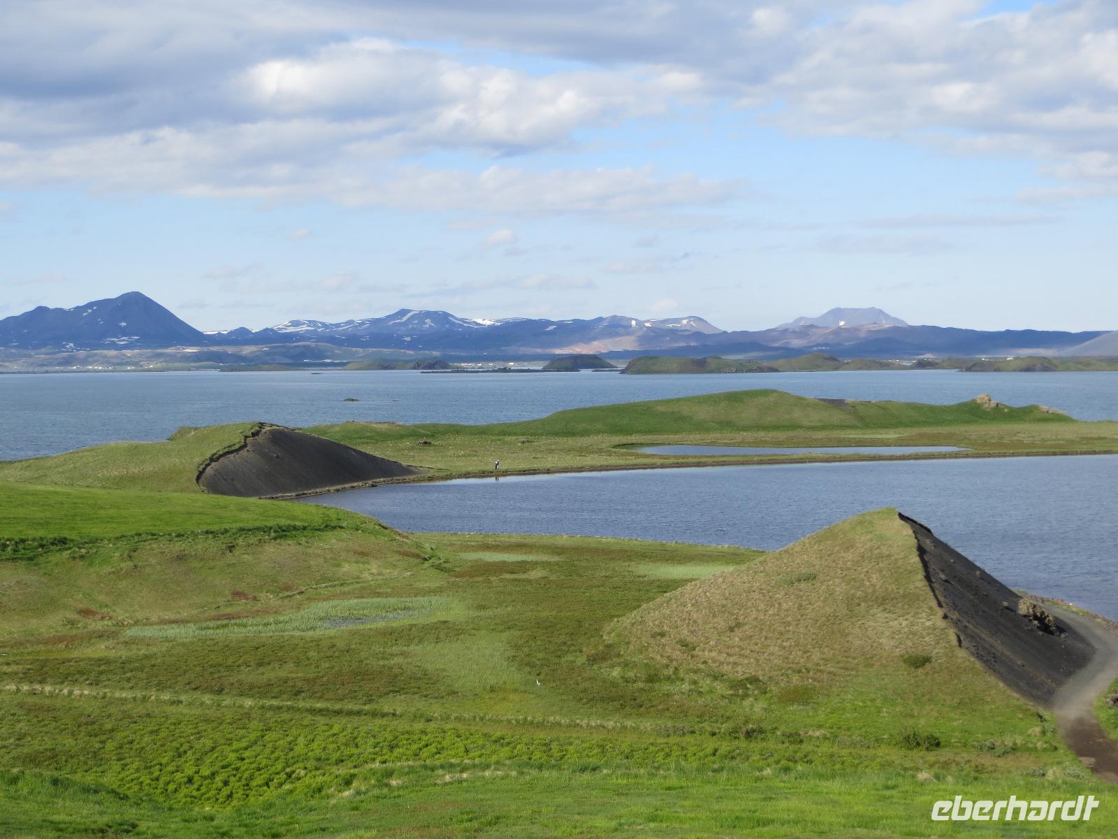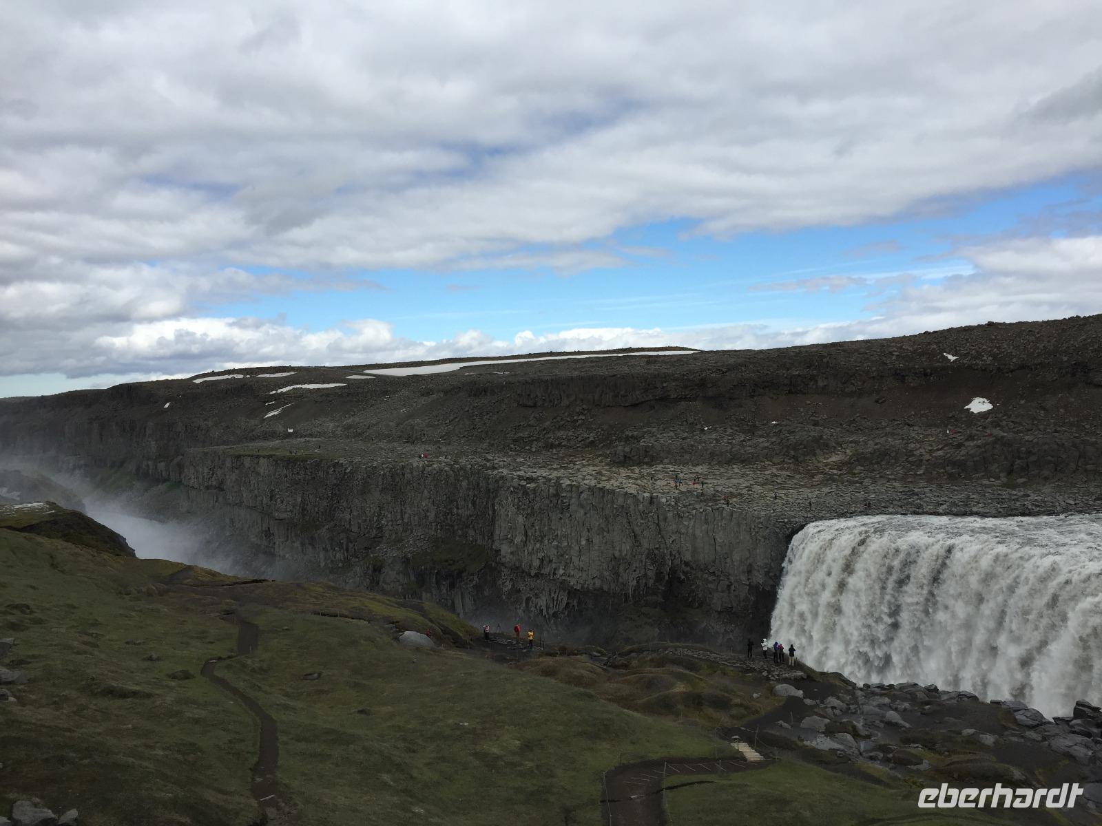 Heute verlassen wir bereits 08:00 Uhr unser Hotel, denn inzwischen hat ein AIDA-Kreuzfahrschiff angelegt und wir möchten die heutigen Programmpunkte ohne die vielen Kreuzfahrtbusse erleben. Wir blicken von der anderen Fjordseite noch einmal auf Akureyri zurück und fahren immer bergauf durch eine Postkartenidylle mit Gletschern, Wasserfällen, Flüssen und strahlend blauen Himmel. Wir haben bisher riesiges Glück mit dem Wetter, nur Sonnenschein. Unser erstes Ziel für heute ist der Godafoss, dem Götterwasserfall. Hier kommen wir wieder mit der endlosen Sagenwelt der Isländer hautnah in Berührung, denn einst sollen hier, als man das Christentums als Staatsreligion übernommen hatte, die letzten heidnischen Götterbilder hinabgestürzt worden sein. So entstand der Name für den imposanten Wasserfall. Unser nächster Stopp ist die Heimat der 13 isländischen Weihnachtsmänner - Dimmuborgir. Wir spazieren auf gut ausgebauten Wegen durch die skurille Felslandschaft. Die Weihnachtsmänner treffen wir leider nicht, amüsieren uns aber sehr über Haralds Geschichten zu Löffellecker, Türentreter und Fensterglotzer. Dann fahren wir zur Grjotagja-Spalte, einer kleinen Höhle mit See, die einst zum Baden genutzt wurde, bis das Wasser zu heiß wurde. Bekannt ist sie Liebhabern von der zur Zeit populären Serie „Game of Thrones", da diese (wie auch viele andere Orte Islands) als Drehort diente. Nachdem wir nacheinander die kleine Höhle besichtigt haben, geht es weiter zu einem ganz besonderen Erlebnis: in der Badelandschaft Jardbödin entspannen wir in den heißen Quellen bei 12°C Außentemperatur und schneebedeckten Gipfeln im Hintergrund. Wir genießen es sehr! So entspannt fahren wir zum Dettifoss, dem energiereichsten Wasserfall Europas. Nach einem kurzen Spaziergang erreichen wir diesen und lassen uns den Sprühregen nicht nur ins Gesicht wehen. Über eine Breite von ca. 100m stürzen die Wassermassen 45 tief herab, ein beeindruckendes Schauspiel. Auf dem Rückweg sehen wir von Weitem den Herdubreid - den Berg namens „Breite Schultern" - wir lieben die Isländer für Ihre Namensgebungen jedes Mal aufs Neue. Dann gelangen wir zum aktiven Solfatarenfeld Hverarönd (oder Namaskard), eine endlose, sich immer verändernde, Weite mit blubbernden Schlammtümpeln und dampfenden Quellen. Schwefelgeruch und tolle Farbspiele erwarten uns hier. Wir übernachten heute am Myvatn, den Mückensee, zum Glück heute ohne eine einzige dieser Tierchen. Am Seeufer entlang spazieren wir zu den Pseudokratern von Skutustadagigar, bevor wir mit einem Abendessen den Tag beenden.