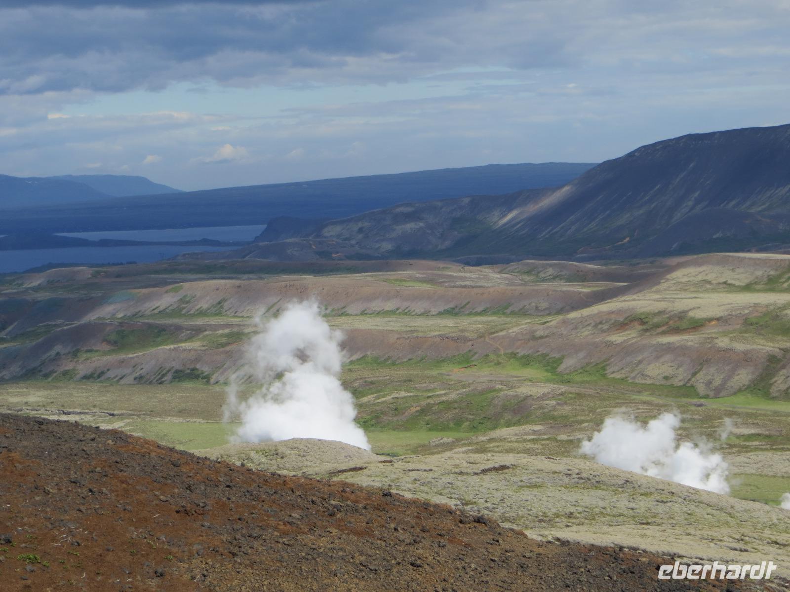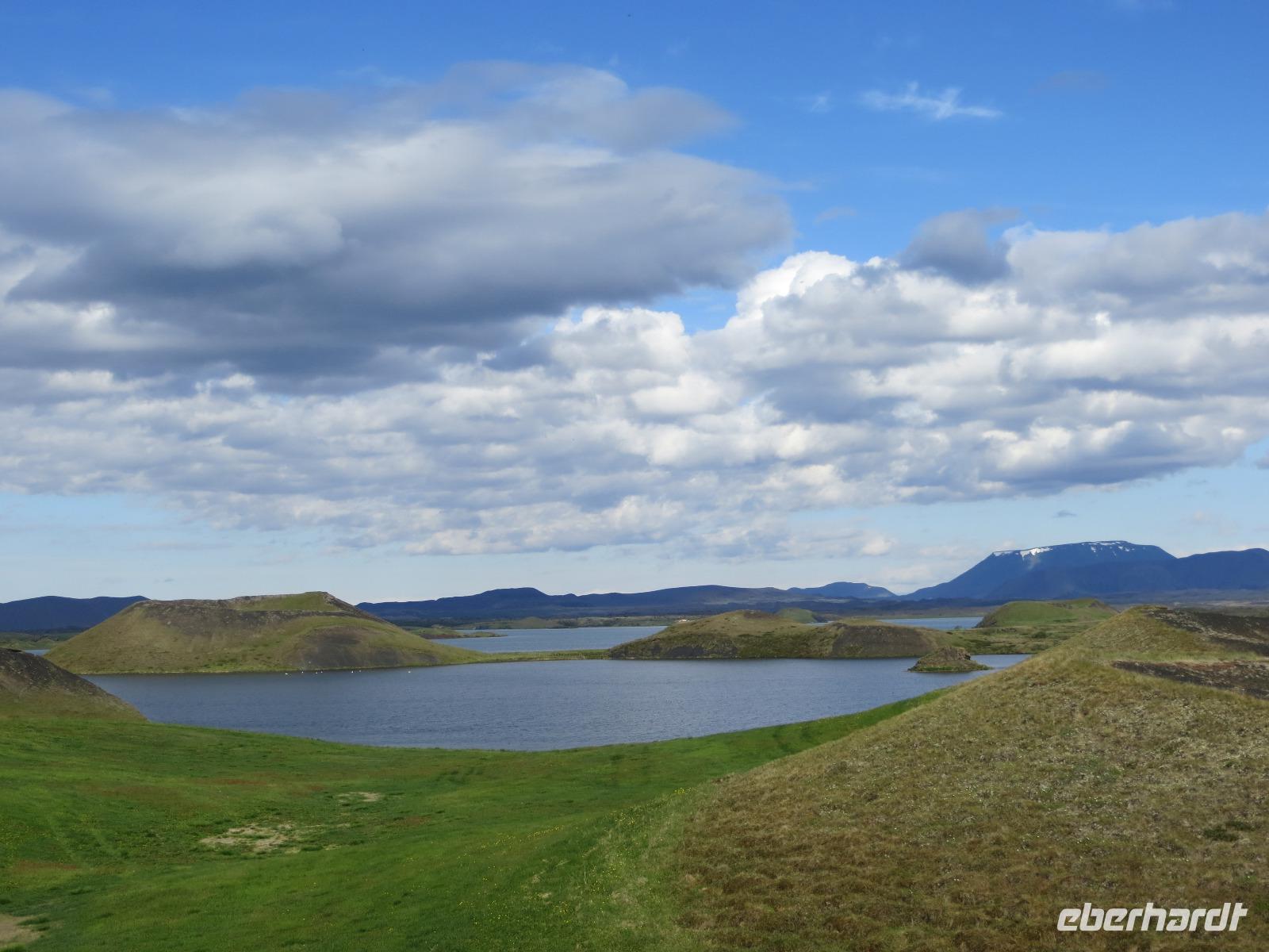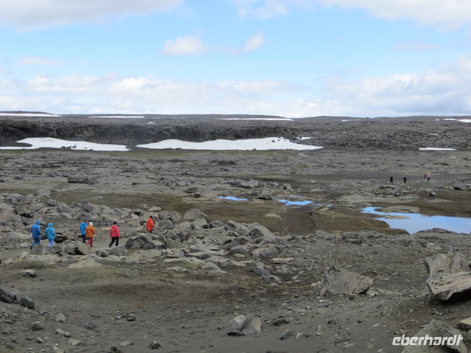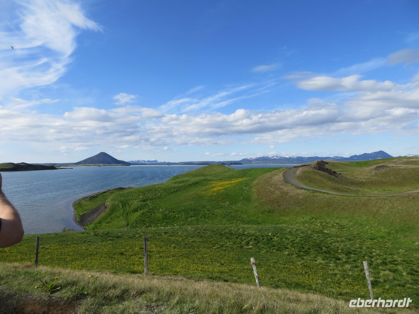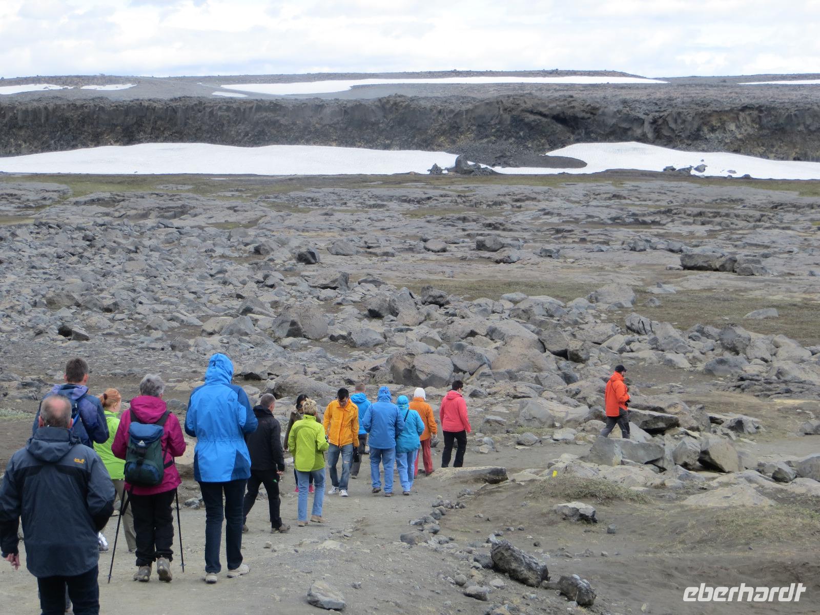 Heute verlassen wir bereits 08:00 Uhr unser Hotel, denn inzwischen hat ein AIDA-Kreuzfahrschiff angelegt und wir möchten die heutigen Programmpunkte ohne die vielen Kreuzfahrtbusse erleben. Wir blicken von der anderen Fjordseite noch einmal auf Akureyri zurück und fahren immer bergauf durch eine Postkartenidylle mit Gletschern, Wasserfällen, Flüssen und strahlend blauen Himmel. Wir haben bisher riesiges Glück mit dem Wetter, nur Sonnenschein. Unser erstes Ziel für heute ist der Godafoss, dem Götterwasserfall. Hier kommen wir wieder mit der endlosen Sagenwelt der Isländer hautnah in Berührung, denn einst sollen hier, als man das Christentums als Staatsreligion übernommen hatte, die letzten heidnischen Götterbilder hinabgestürzt worden sein. So entstand der Name für den imposanten Wasserfall. Unser nächster Stopp ist die Heimat der 13 isländischen Weihnachtsmänner - Dimmuborgir. Wir spazieren auf gut ausgebauten Wegen durch die skurille Felslandschaft. Die Weihnachtsmänner treffen wir leider nicht, amüsieren uns aber sehr über Haralds Geschichten zu Löffellecker, Türentreter und Fensterglotzer. Dann fahren wir zur Grjotagja-Spalte, einer kleinen Höhle mit See, die einst zum Baden genutzt wurde, bis das Wasser zu heiß wurde. Bekannt ist sie Liebhabern von der zur Zeit populären Serie „Game of Thrones", da diese (wie auch viele andere Orte Islands) als Drehort diente. Nachdem wir nacheinander die kleine Höhle besichtigt haben, geht es weiter zu einem ganz besonderen Erlebnis: in der Badelandschaft Jardbödin entspannen wir in den heißen Quellen bei 12°C Außentemperatur und schneebedeckten Gipfeln im Hintergrund. Wir genießen es sehr! So entspannt fahren wir zum Dettifoss, dem energiereichsten Wasserfall Europas. Nach einem kurzen Spaziergang erreichen wir diesen und lassen uns den Sprühregen nicht nur ins Gesicht wehen. Über eine Breite von ca. 100m stürzen die Wassermassen 45 tief herab, ein beeindruckendes Schauspiel. Auf dem Rückweg sehen wir von Weitem den Herdubreid - den Berg namens „Breite Schultern" - wir lieben die Isländer für Ihre Namensgebungen jedes Mal aufs Neue. Dann gelangen wir zum aktiven Solfatarenfeld Hverarönd (oder Namaskard), eine endlose, sich immer verändernde, Weite mit blubbernden Schlammtümpeln und dampfenden Quellen. Schwefelgeruch und tolle Farbspiele erwarten uns hier. Wir übernachten heute am Myvatn, den Mückensee, zum Glück heute ohne eine einzige dieser Tierchen. Am Seeufer entlang spazieren wir zu den Pseudokratern von Skutustadagigar, bevor wir mit einem Abendessen den Tag beenden.