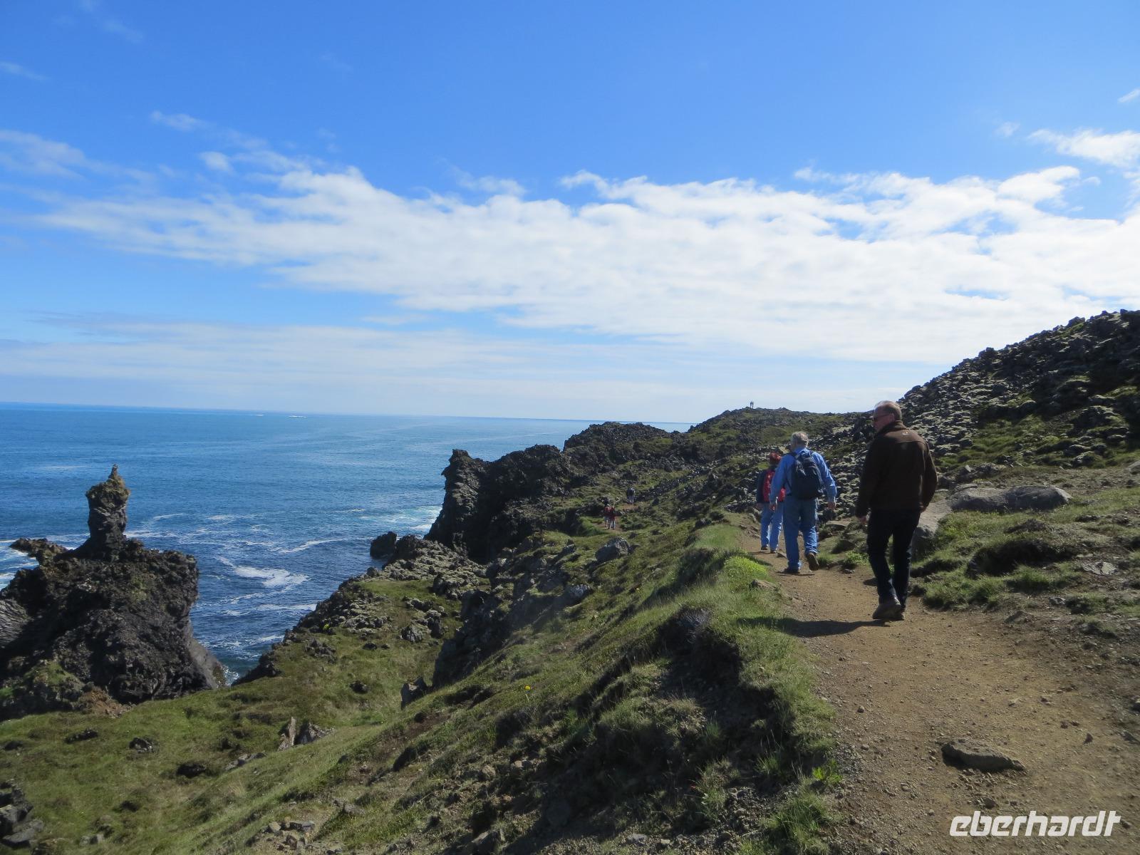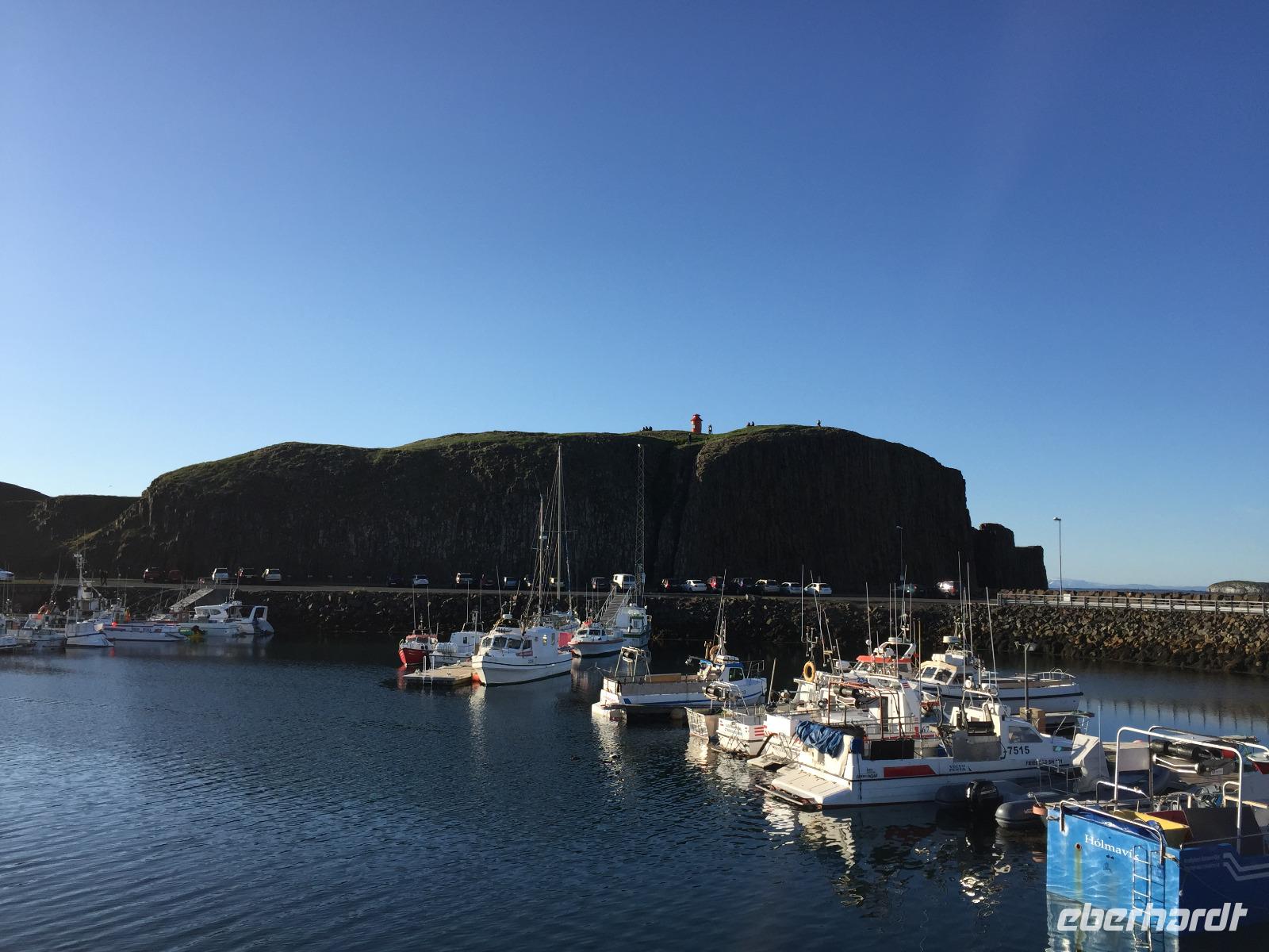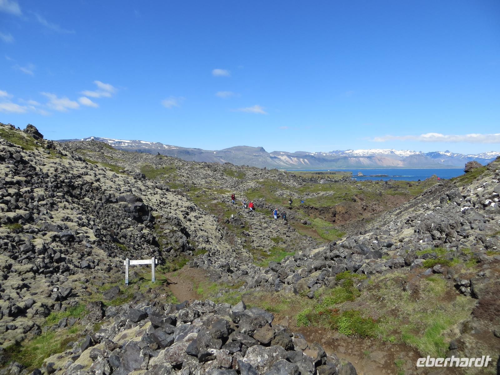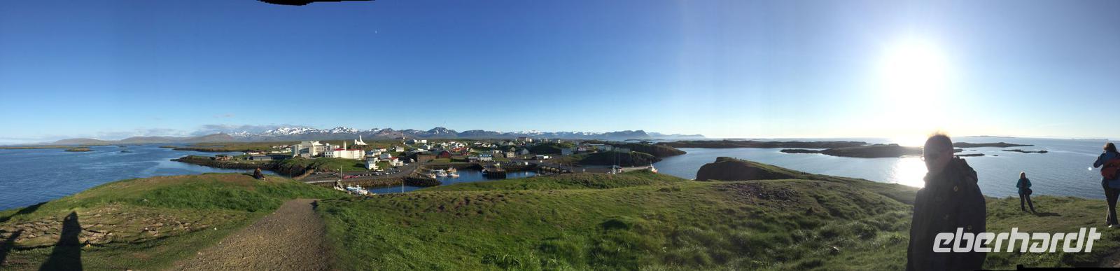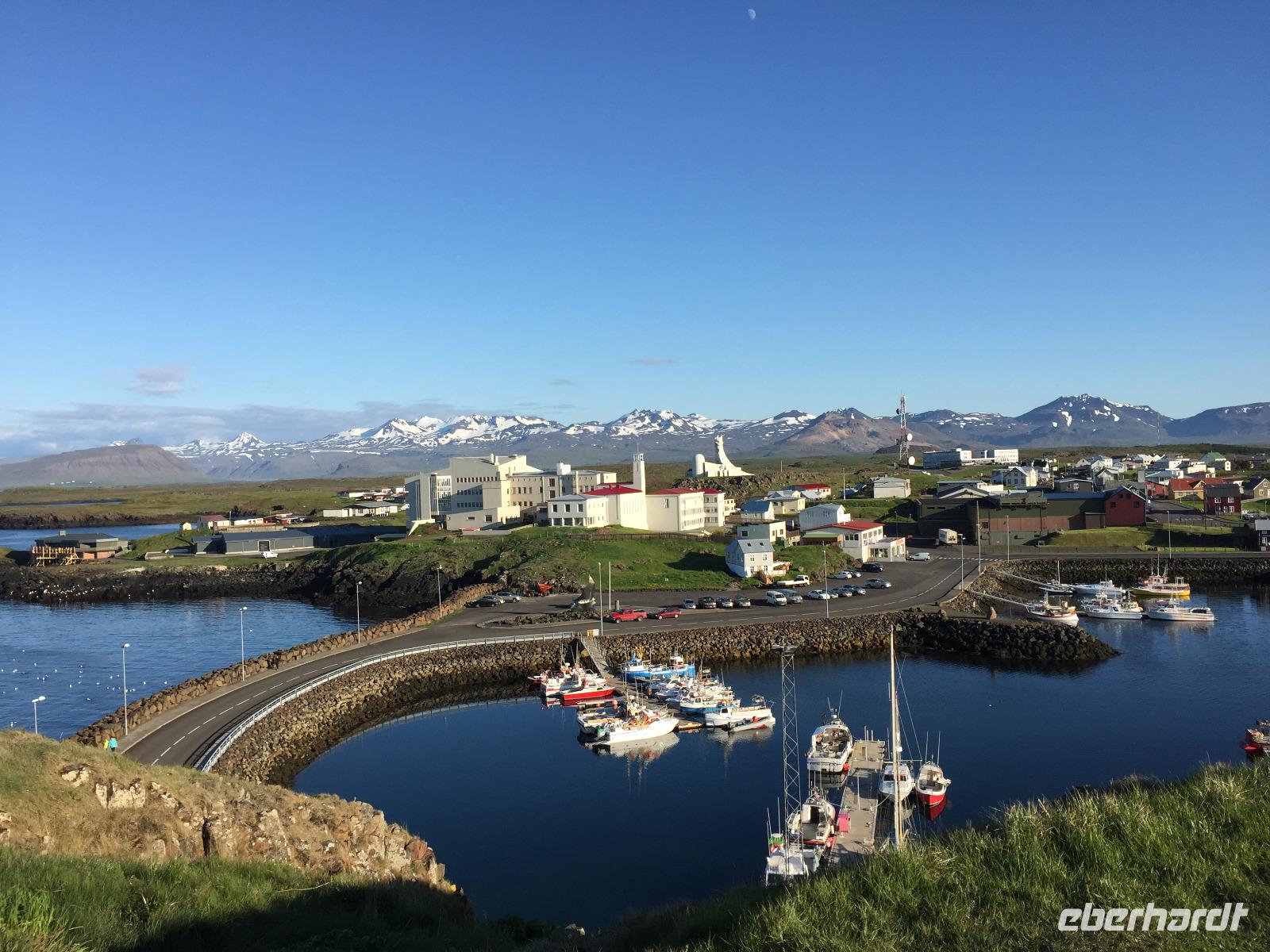 Nach dem Frühstück erwartete uns Siggi mit seinem Bus, komfortable 30 Plätze für 17 Gäste und wir verließen wieder die einzige Großstadt Islands, wo fast 40% der gesamten Insulaner leben. Die Reise führte uns in den kommenden Tagen im Uhrzeigersinn entlang der bekannten 1.300 km langen Ringstraße, die wir ab und zu verließen, aber so lernten wir Island wirklich von allen Seiten kennen. So fuhren wir heute die Westküste entlang und durchquerten alsbald den Walfjortunnel, der uns knapp 7 km in einer Tiefe von 120m durch den Hvalfjödur führte. Nach einer kurzen Einkaufspause in Borgarnes erreichten wir am späten Vormittag bei herrlichem Sonnenschein den Ausgangspunkt unserer ersten Wanderung. Schon von hier sahen wir unser Ziel, den Ringwallkrater Eldborg. Wir wanderten auf dem Lavafeld mit niedrigen Bewuchs und maximal mannshohen Birken (dem sogenannten isländischen Wald) und bestiegen dann den Kraterrand. Von hier oben genossen wir den imposanten Blick ins Kraterinnere und über die weite Landschaft mit schneebedeckten Gipfeln als Hintergrundkulisse. Mit einem gewöhnungsbedürftigen „Opal", dem Lackritzschnaps stießen wir hier oben auf eine erlebnisreiche Reise an. Dann liefen wir wieder zurück zum Bus. Mit diesem ging es weiter vorbei an unzähligen Wasserfällen und erreichten nach einer knappen Fahrtstunde Budir auf der Halbinsel Snaefellsnes. Bei strahlend blauen Himmel präsentierte sich vor uns der Snæfellsjökull - der 1446 m hohe Schneeberggletscher mit seinen 2 Spitzen. An der schwarzen Holzkirche von Budir machten wir Mittagspause, einige bummelten zur Düne bevor es weiterging nach Arnarstapi, dem Startpunkt unserer nächsten kleinen Wanderung oberhalb der Steilküste. Der Weg war teils sehr geröllig, wir erfuhren von Harald viel über das berühmte Islandmoos und genossen immer wieder den Ausblick über interessante Felsformationen auf das weite Meer. Zum Abschluss belohnten wir uns in Hellnar mit einem leckeren Kaffee in der Sonne. Anschließend fuhren wir mit einem Fotostopp am „Kirchberg" bis nach Stykkisholmur zur heutigen Übernachtung. Im Hotel genossen wir ein leckeres Abendessen mit Fischsuppe, Lamm und Eis. Anschließend spazierten wir durch den Ort und die meisten von uns erklommen noch den Hausberg Súgandisey- eigentlich eine Insel - mit dem roten Leuchtturm. Hier genossen wir einen herrlichen Blick über die Insel- und Schärenwelt in der Abendsonne... und uns wurden nun die weißen Nächte richtig bewußt ... heute (besser morgen) sollte die Sonne gegen 00:30 Uhr für 2 Stunden untergehen. Also genossen zum Teil noch ein leckeres Getränk am Hafen und spazierten gegen Mitternacht im strahlenden Sonnenschein zurück zum Hotel.