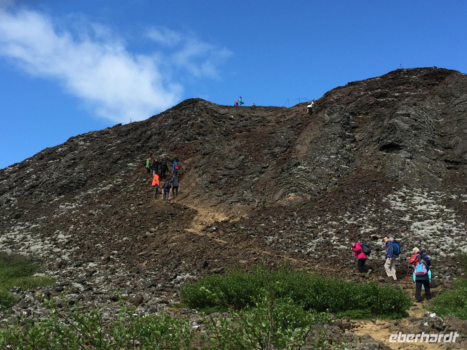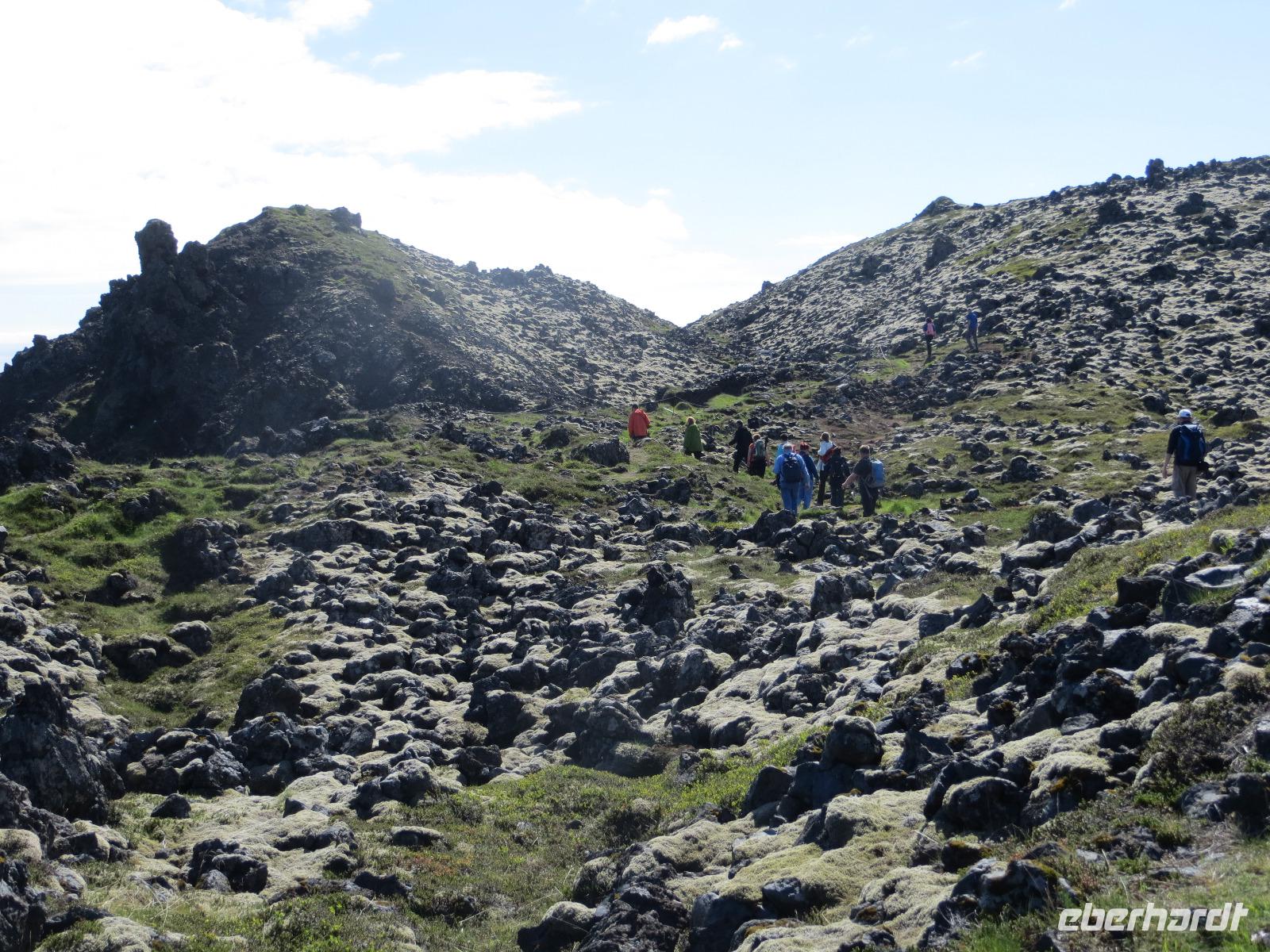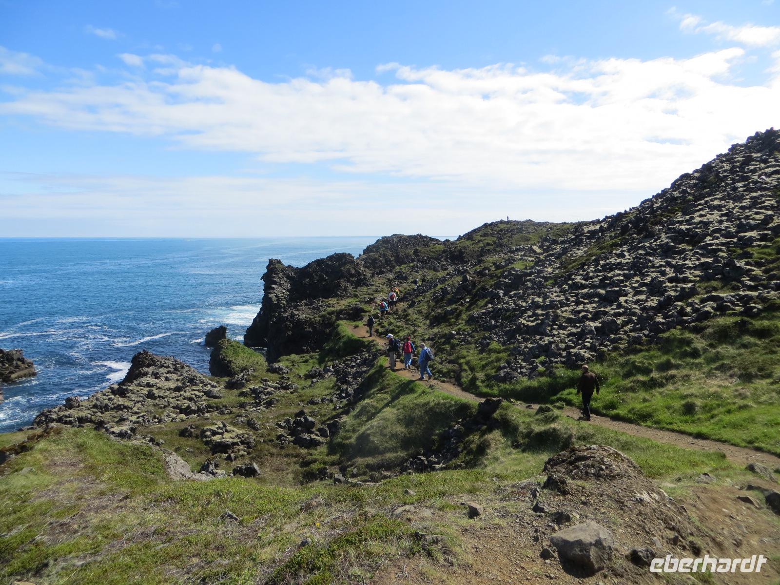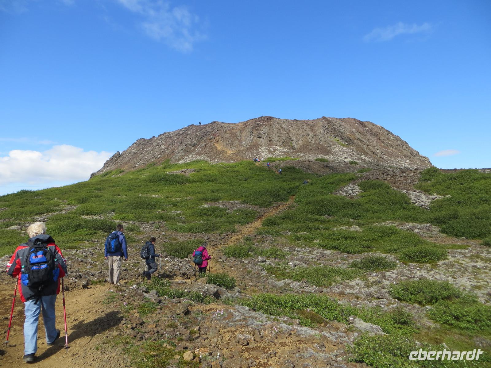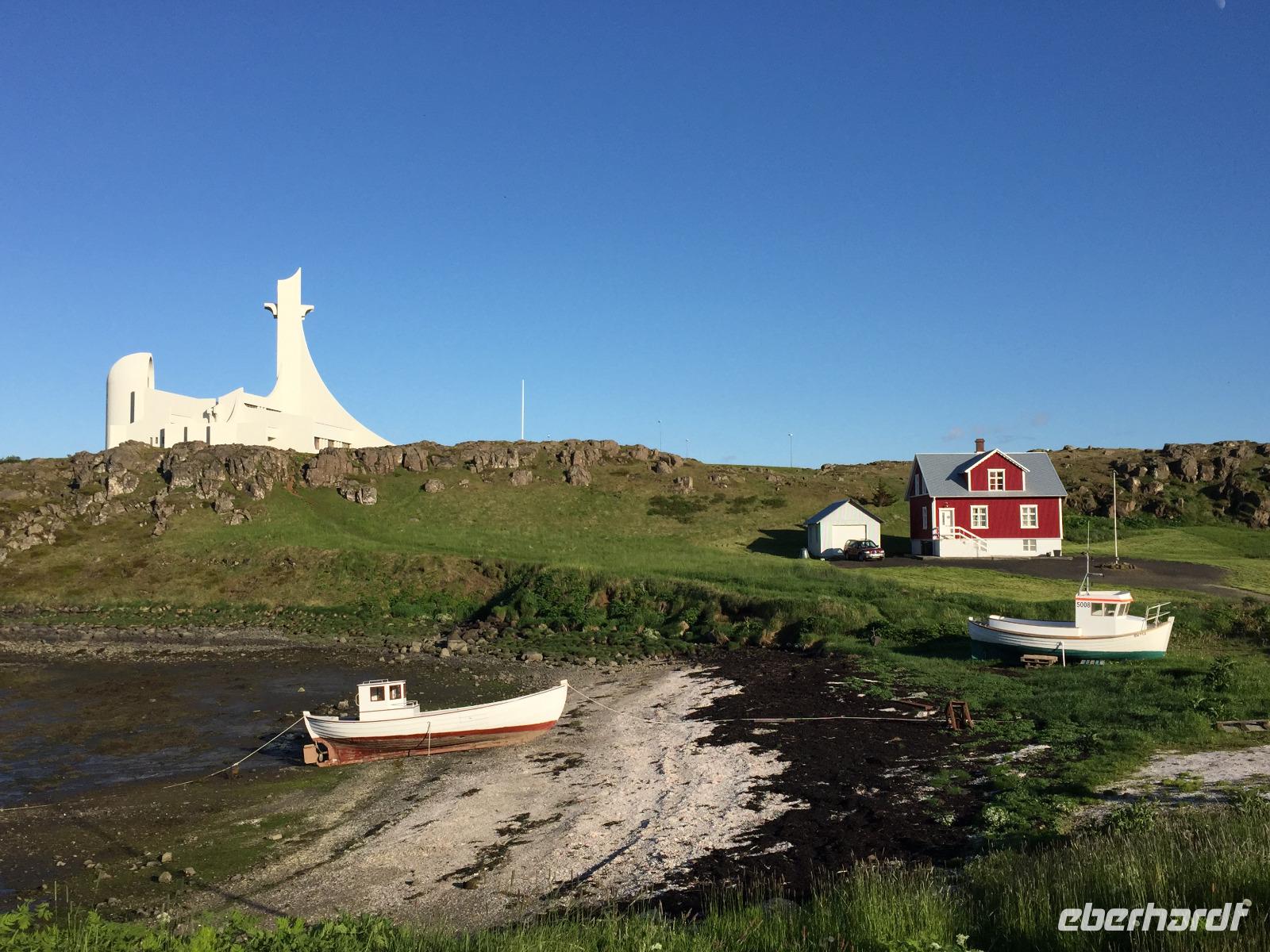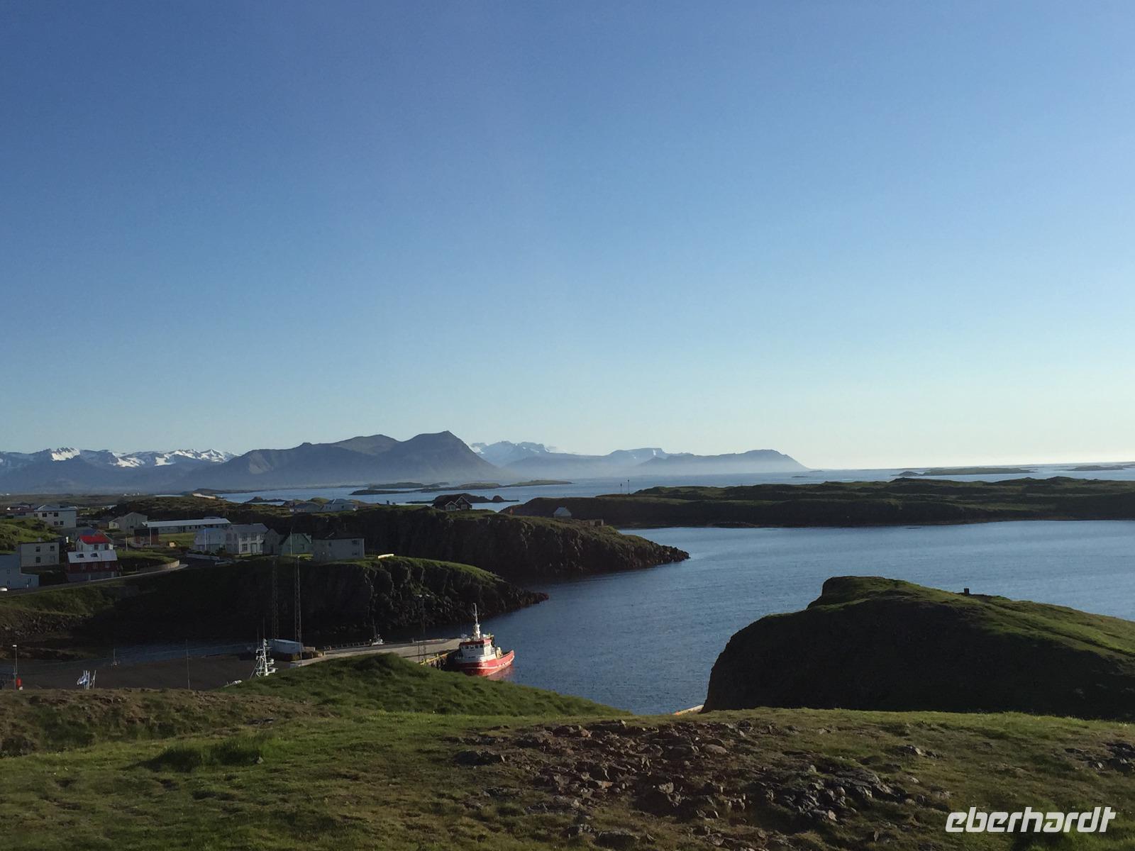 Nach dem Frühstück erwartete uns Siggi mit seinem Bus, komfortable 30 Plätze für 17 Gäste und wir verließen wieder die einzige Großstadt Islands, wo fast 40% der gesamten Insulaner leben. Die Reise führte uns in den kommenden Tagen im Uhrzeigersinn entlang der bekannten 1.300 km langen Ringstraße, die wir ab und zu verließen, aber so lernten wir Island wirklich von allen Seiten kennen. So fuhren wir heute die Westküste entlang und durchquerten alsbald den Walfjortunnel, der uns knapp 7 km in einer Tiefe von 120m durch den Hvalfjödur führte. Nach einer kurzen Einkaufspause in Borgarnes erreichten wir am späten Vormittag bei herrlichem Sonnenschein den Ausgangspunkt unserer ersten Wanderung. Schon von hier sahen wir unser Ziel, den Ringwallkrater Eldborg. Wir wanderten auf dem Lavafeld mit niedrigen Bewuchs und maximal mannshohen Birken (dem sogenannten isländischen Wald) und bestiegen dann den Kraterrand. Von hier oben genossen wir den imposanten Blick ins Kraterinnere und über die weite Landschaft mit schneebedeckten Gipfeln als Hintergrundkulisse. Mit einem gewöhnungsbedürftigen „Opal", dem Lackritzschnaps stießen wir hier oben auf eine erlebnisreiche Reise an. Dann liefen wir wieder zurück zum Bus. Mit diesem ging es weiter vorbei an unzähligen Wasserfällen und erreichten nach einer knappen Fahrtstunde Budir auf der Halbinsel Snaefellsnes. Bei strahlend blauen Himmel präsentierte sich vor uns der Snæfellsjökull - der 1446 m hohe Schneeberggletscher mit seinen 2 Spitzen. An der schwarzen Holzkirche von Budir machten wir Mittagspause, einige bummelten zur Düne bevor es weiterging nach Arnarstapi, dem Startpunkt unserer nächsten kleinen Wanderung oberhalb der Steilküste. Der Weg war teils sehr geröllig, wir erfuhren von Harald viel über das berühmte Islandmoos und genossen immer wieder den Ausblick über interessante Felsformationen auf das weite Meer. Zum Abschluss belohnten wir uns in Hellnar mit einem leckeren Kaffee in der Sonne. Anschließend fuhren wir mit einem Fotostopp am „Kirchberg" bis nach Stykkisholmur zur heutigen Übernachtung. Im Hotel genossen wir ein leckeres Abendessen mit Fischsuppe, Lamm und Eis. Anschließend spazierten wir durch den Ort und die meisten von uns erklommen noch den Hausberg Súgandisey- eigentlich eine Insel - mit dem roten Leuchtturm. Hier genossen wir einen herrlichen Blick über die Insel- und Schärenwelt in der Abendsonne... und uns wurden nun die weißen Nächte richtig bewußt ... heute (besser morgen) sollte die Sonne gegen 00:30 Uhr für 2 Stunden untergehen. Also genossen zum Teil noch ein leckeres Getränk am Hafen und spazierten gegen Mitternacht im strahlenden Sonnenschein zurück zum Hotel.