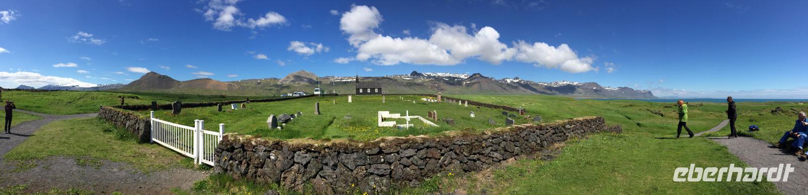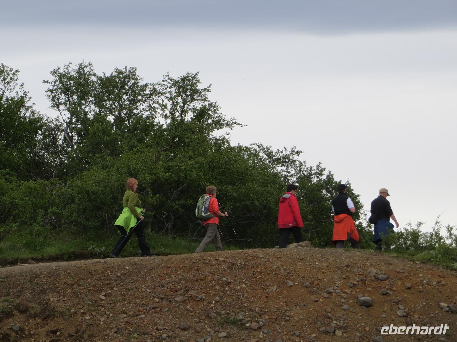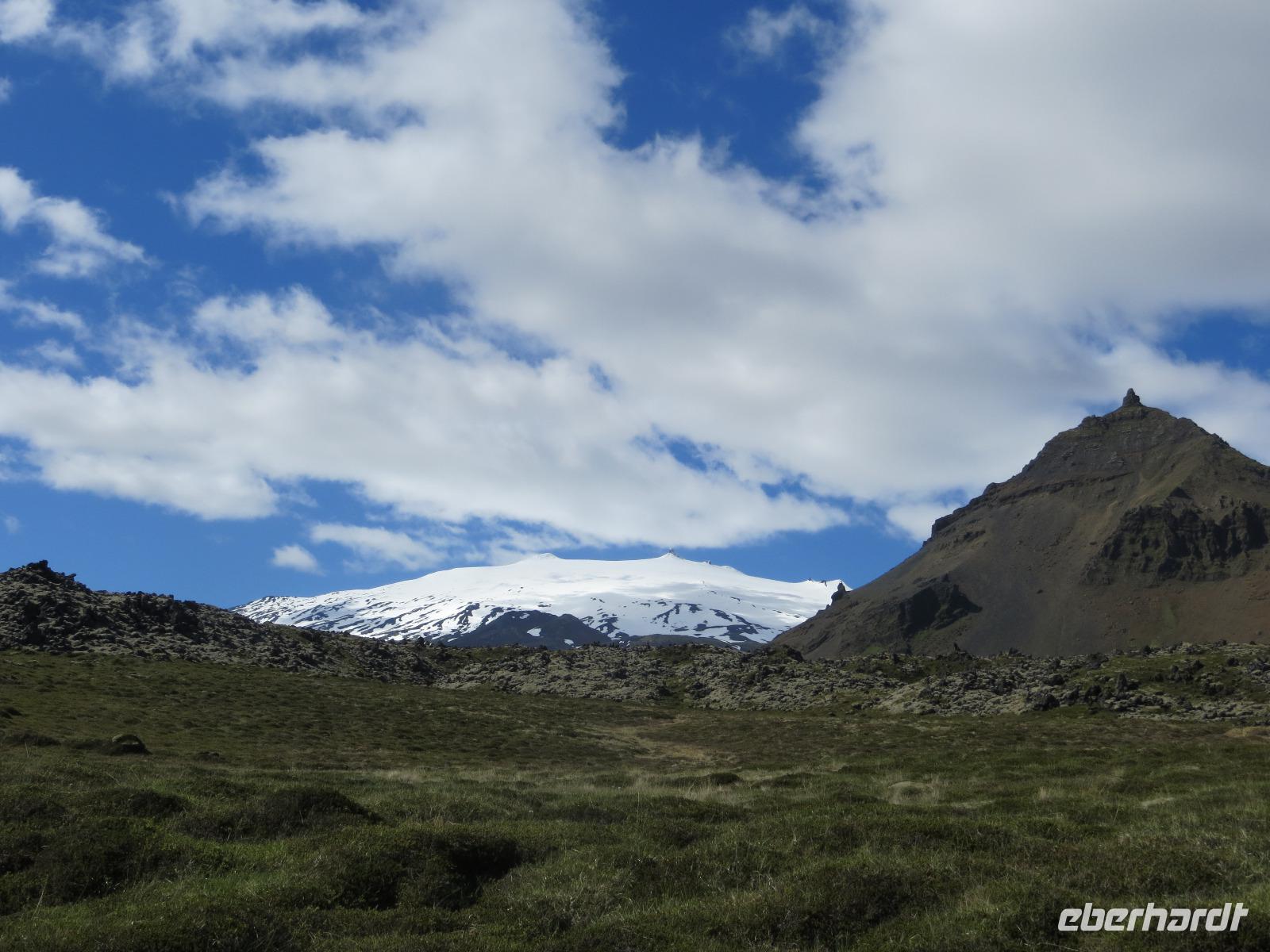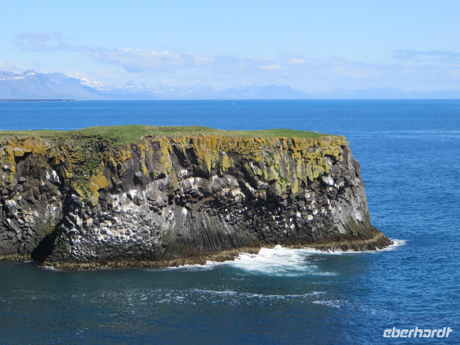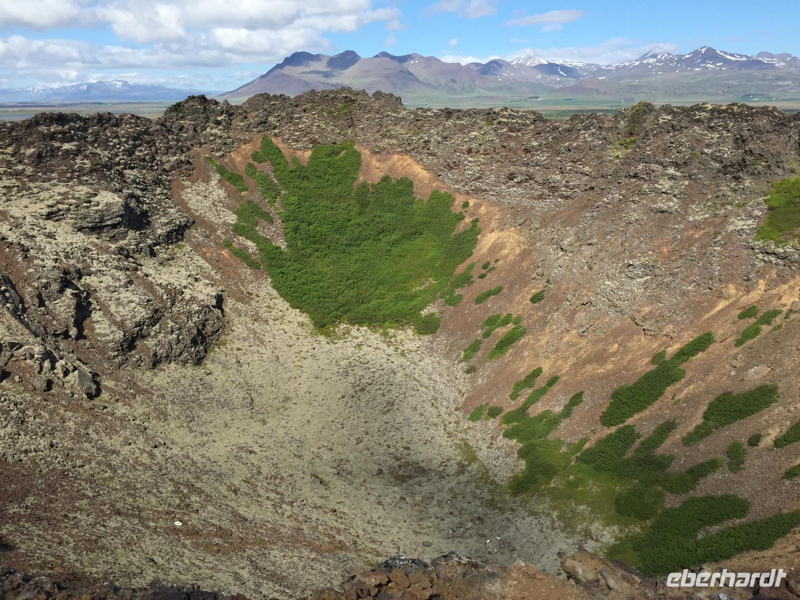 Nach dem Frühstück erwartete uns Siggi mit seinem Bus, komfortable 30 Plätze für 17 Gäste und wir verließen wieder die einzige Großstadt Islands, wo fast 40% der gesamten Insulaner leben. Die Reise führte uns in den kommenden Tagen im Uhrzeigersinn entlang der bekannten 1.300 km langen Ringstraße, die wir ab und zu verließen, aber so lernten wir Island wirklich von allen Seiten kennen. So fuhren wir heute die Westküste entlang und durchquerten alsbald den Walfjortunnel, der uns knapp 7 km in einer Tiefe von 120m durch den Hvalfjödur führte. Nach einer kurzen Einkaufspause in Borgarnes erreichten wir am späten Vormittag bei herrlichem Sonnenschein den Ausgangspunkt unserer ersten Wanderung. Schon von hier sahen wir unser Ziel, den Ringwallkrater Eldborg. Wir wanderten auf dem Lavafeld mit niedrigen Bewuchs und maximal mannshohen Birken (dem sogenannten isländischen Wald) und bestiegen dann den Kraterrand. Von hier oben genossen wir den imposanten Blick ins Kraterinnere und über die weite Landschaft mit schneebedeckten Gipfeln als Hintergrundkulisse. Mit einem gewöhnungsbedürftigen „Opal", dem Lackritzschnaps stießen wir hier oben auf eine erlebnisreiche Reise an. Dann liefen wir wieder zurück zum Bus. Mit diesem ging es weiter vorbei an unzähligen Wasserfällen und erreichten nach einer knappen Fahrtstunde Budir auf der Halbinsel Snaefellsnes. Bei strahlend blauen Himmel präsentierte sich vor uns der Snæfellsjökull - der 1446 m hohe Schneeberggletscher mit seinen 2 Spitzen. An der schwarzen Holzkirche von Budir machten wir Mittagspause, einige bummelten zur Düne bevor es weiterging nach Arnarstapi, dem Startpunkt unserer nächsten kleinen Wanderung oberhalb der Steilküste. Der Weg war teils sehr geröllig, wir erfuhren von Harald viel über das berühmte Islandmoos und genossen immer wieder den Ausblick über interessante Felsformationen auf das weite Meer. Zum Abschluss belohnten wir uns in Hellnar mit einem leckeren Kaffee in der Sonne. Anschließend fuhren wir mit einem Fotostopp am „Kirchberg" bis nach Stykkisholmur zur heutigen Übernachtung. Im Hotel genossen wir ein leckeres Abendessen mit Fischsuppe, Lamm und Eis. Anschließend spazierten wir durch den Ort und die meisten von uns erklommen noch den Hausberg Súgandisey- eigentlich eine Insel - mit dem roten Leuchtturm. Hier genossen wir einen herrlichen Blick über die Insel- und Schärenwelt in der Abendsonne... und uns wurden nun die weißen Nächte richtig bewußt ... heute (besser morgen) sollte die Sonne gegen 00:30 Uhr für 2 Stunden untergehen. Also genossen zum Teil noch ein leckeres Getränk am Hafen und spazierten gegen Mitternacht im strahlenden Sonnenschein zurück zum Hotel.