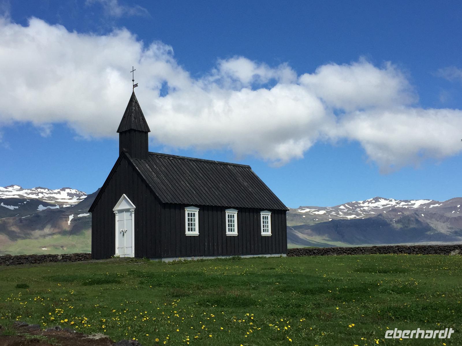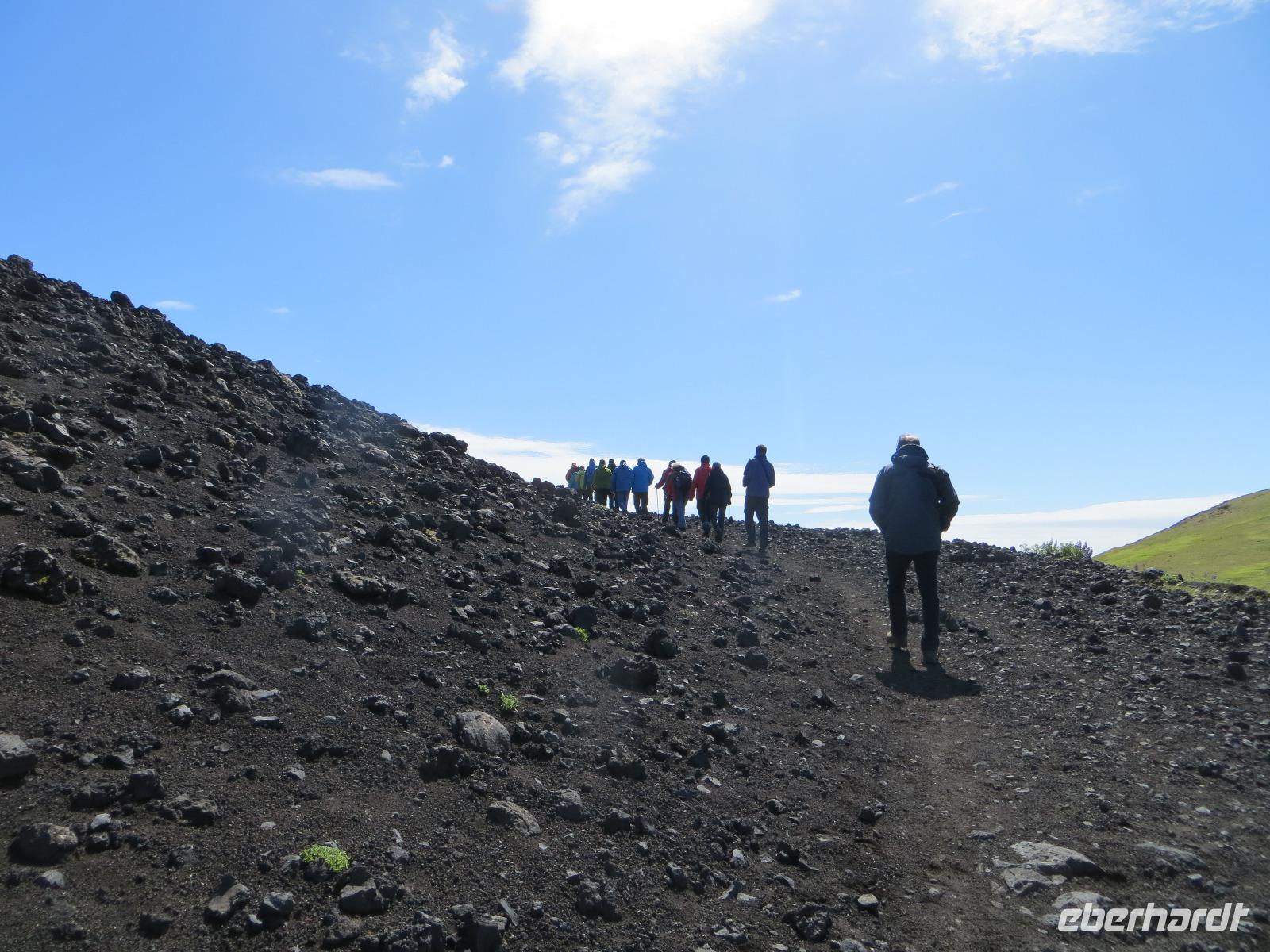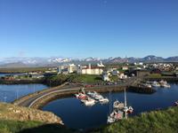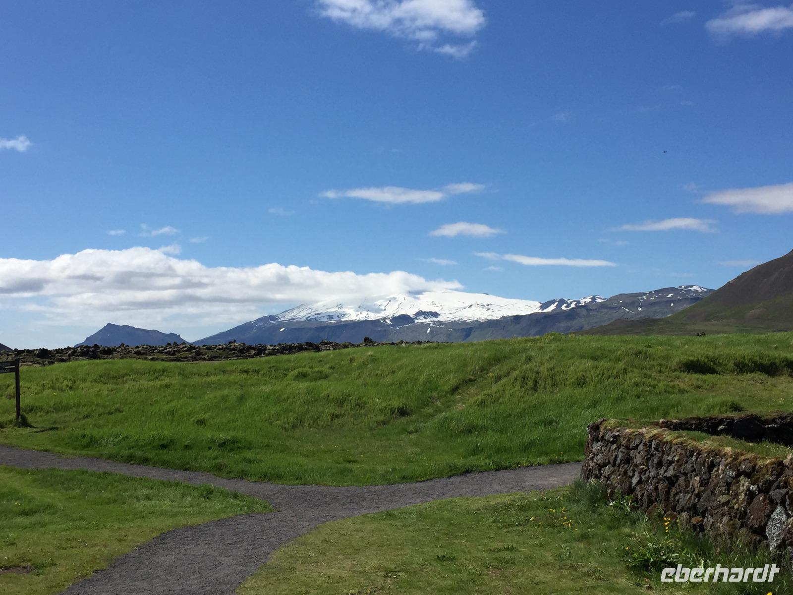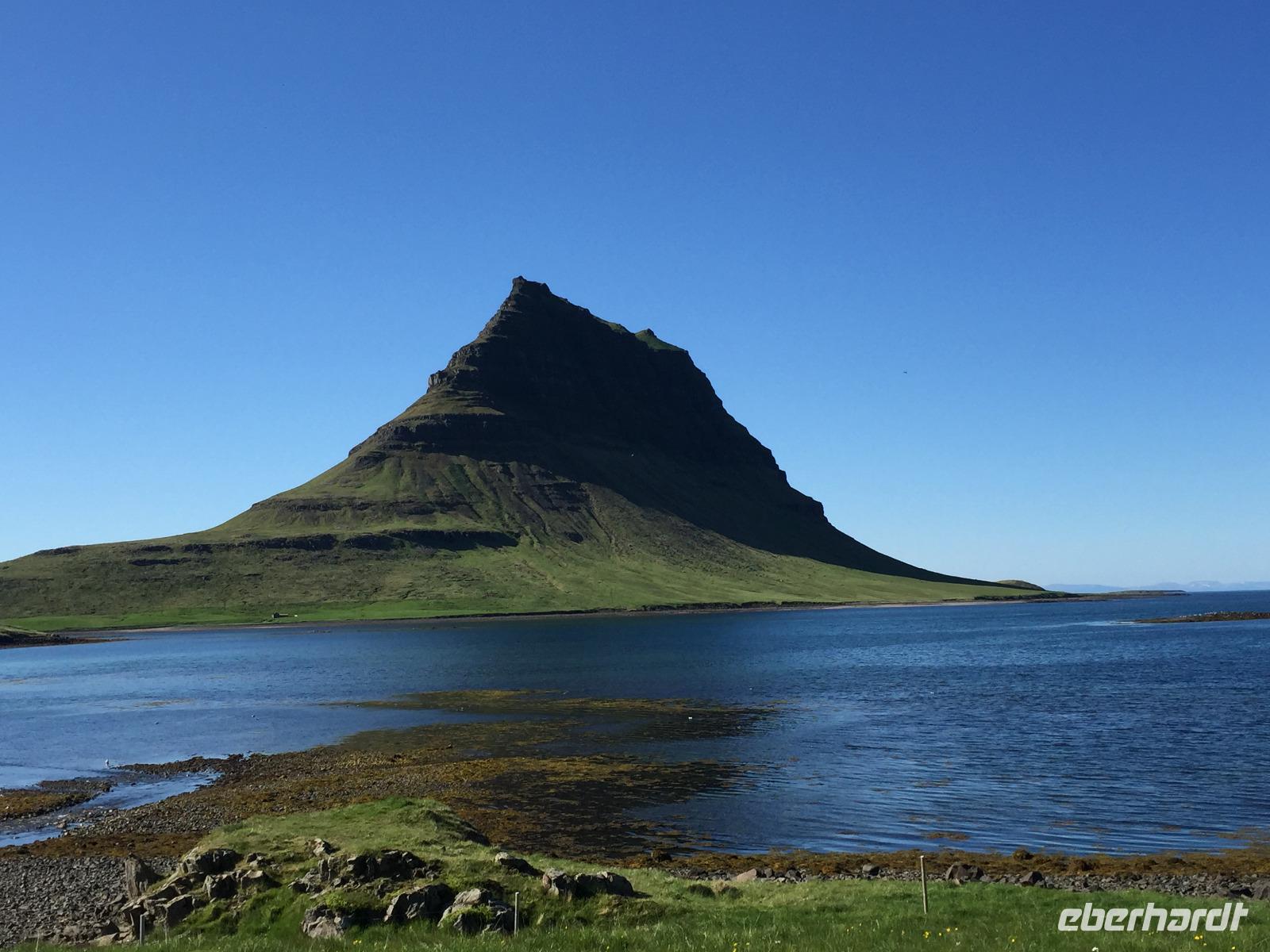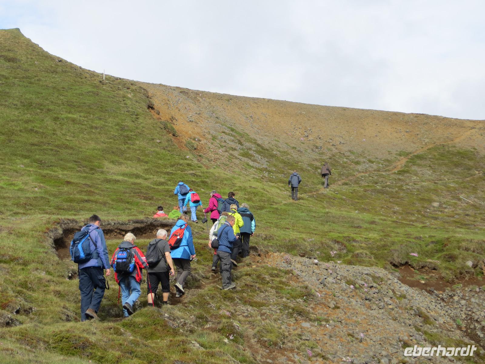 Nach dem Frühstück erwartete uns Siggi mit seinem Bus, komfortable 30 Plätze für 17 Gäste und wir verließen wieder die einzige Großstadt Islands, wo fast 40% der gesamten Insulaner leben. Die Reise führte uns in den kommenden Tagen im Uhrzeigersinn entlang der bekannten 1.300 km langen Ringstraße, die wir ab und zu verließen, aber so lernten wir Island wirklich von allen Seiten kennen. So fuhren wir heute die Westküste entlang und durchquerten alsbald den Walfjortunnel, der uns knapp 7 km in einer Tiefe von 120m durch den Hvalfjödur führte. Nach einer kurzen Einkaufspause in Borgarnes erreichten wir am späten Vormittag bei herrlichem Sonnenschein den Ausgangspunkt unserer ersten Wanderung. Schon von hier sahen wir unser Ziel, den Ringwallkrater Eldborg. Wir wanderten auf dem Lavafeld mit niedrigen Bewuchs und maximal mannshohen Birken (dem sogenannten isländischen Wald) und bestiegen dann den Kraterrand. Von hier oben genossen wir den imposanten Blick ins Kraterinnere und über die weite Landschaft mit schneebedeckten Gipfeln als Hintergrundkulisse. Mit einem gewöhnungsbedürftigen „Opal", dem Lackritzschnaps stießen wir hier oben auf eine erlebnisreiche Reise an. Dann liefen wir wieder zurück zum Bus. Mit diesem ging es weiter vorbei an unzähligen Wasserfällen und erreichten nach einer knappen Fahrtstunde Budir auf der Halbinsel Snaefellsnes. Bei strahlend blauen Himmel präsentierte sich vor uns der Snæfellsjökull - der 1446 m hohe Schneeberggletscher mit seinen 2 Spitzen. An der schwarzen Holzkirche von Budir machten wir Mittagspause, einige bummelten zur Düne bevor es weiterging nach Arnarstapi, dem Startpunkt unserer nächsten kleinen Wanderung oberhalb der Steilküste. Der Weg war teils sehr geröllig, wir erfuhren von Harald viel über das berühmte Islandmoos und genossen immer wieder den Ausblick über interessante Felsformationen auf das weite Meer. Zum Abschluss belohnten wir uns in Hellnar mit einem leckeren Kaffee in der Sonne. Anschließend fuhren wir mit einem Fotostopp am „Kirchberg" bis nach Stykkisholmur zur heutigen Übernachtung. Im Hotel genossen wir ein leckeres Abendessen mit Fischsuppe, Lamm und Eis. Anschließend spazierten wir durch den Ort und die meisten von uns erklommen noch den Hausberg Súgandisey- eigentlich eine Insel - mit dem roten Leuchtturm. Hier genossen wir einen herrlichen Blick über die Insel- und Schärenwelt in der Abendsonne... und uns wurden nun die weißen Nächte richtig bewußt ... heute (besser morgen) sollte die Sonne gegen 00:30 Uhr für 2 Stunden untergehen. Also genossen zum Teil noch ein leckeres Getränk am Hafen und spazierten gegen Mitternacht im strahlenden Sonnenschein zurück zum Hotel.