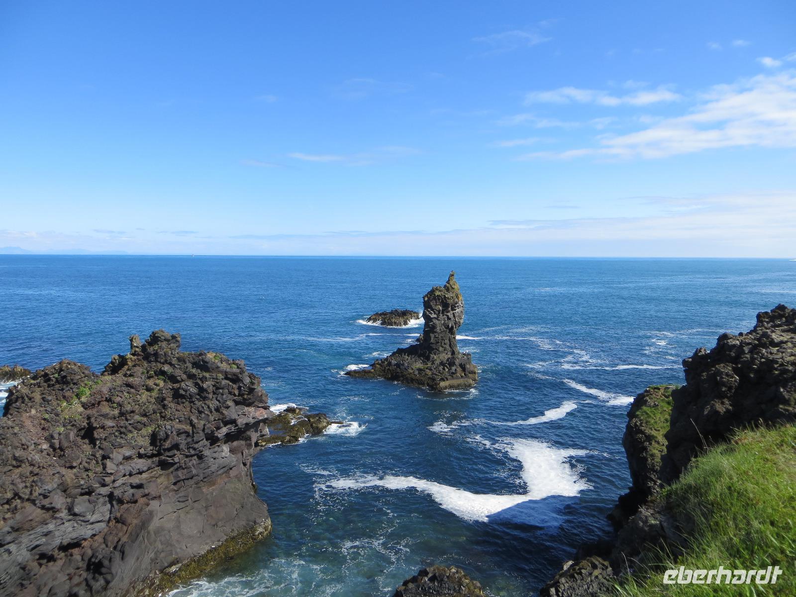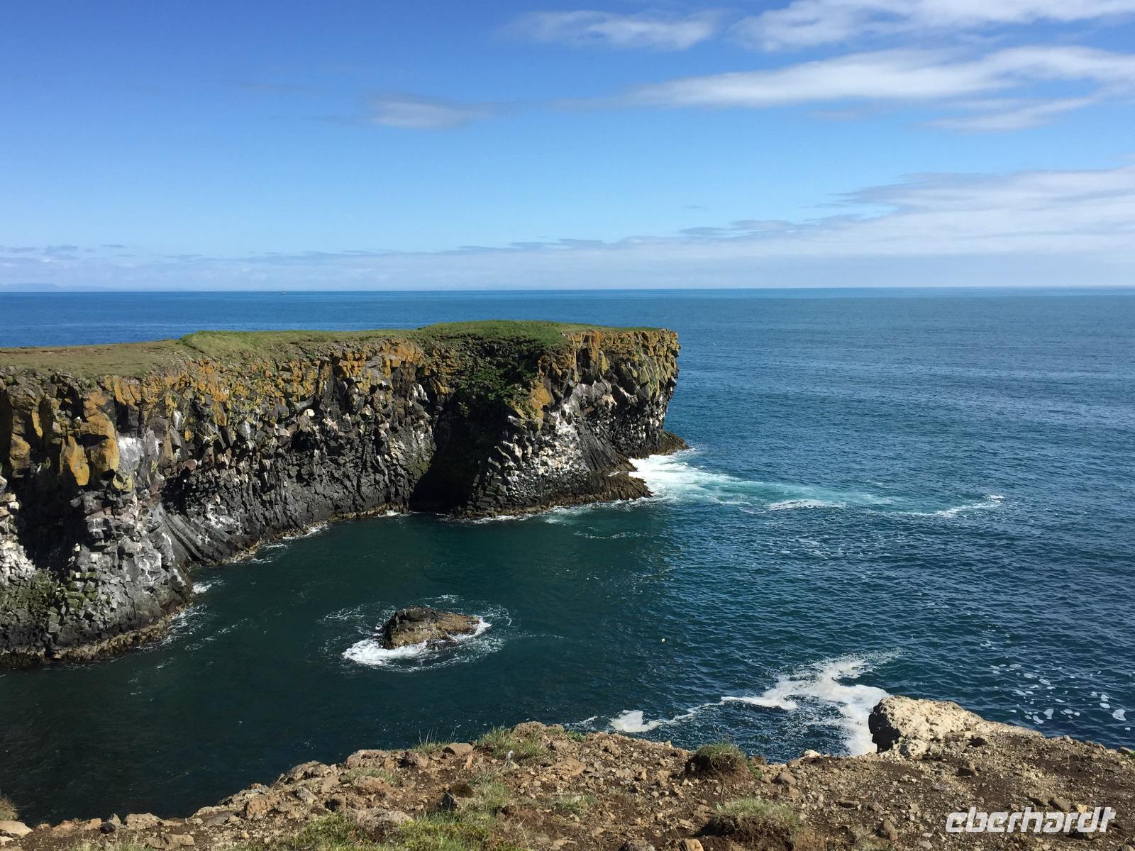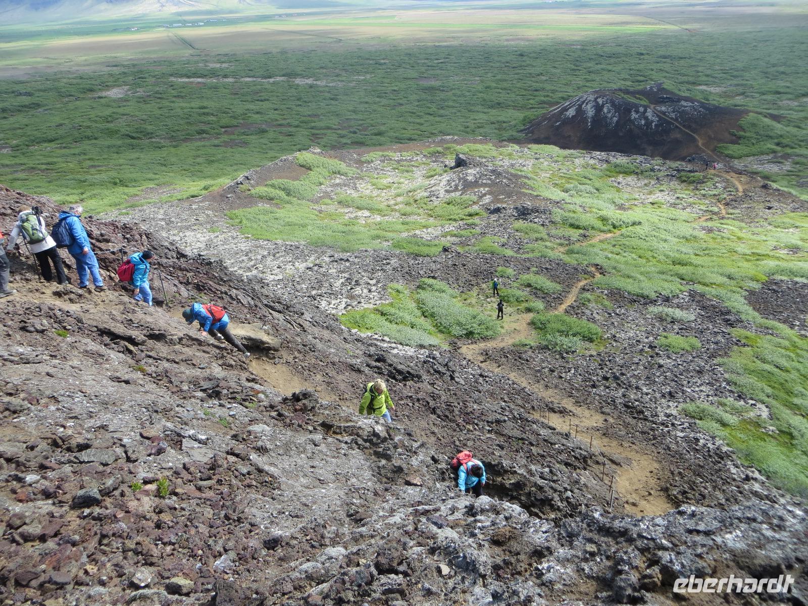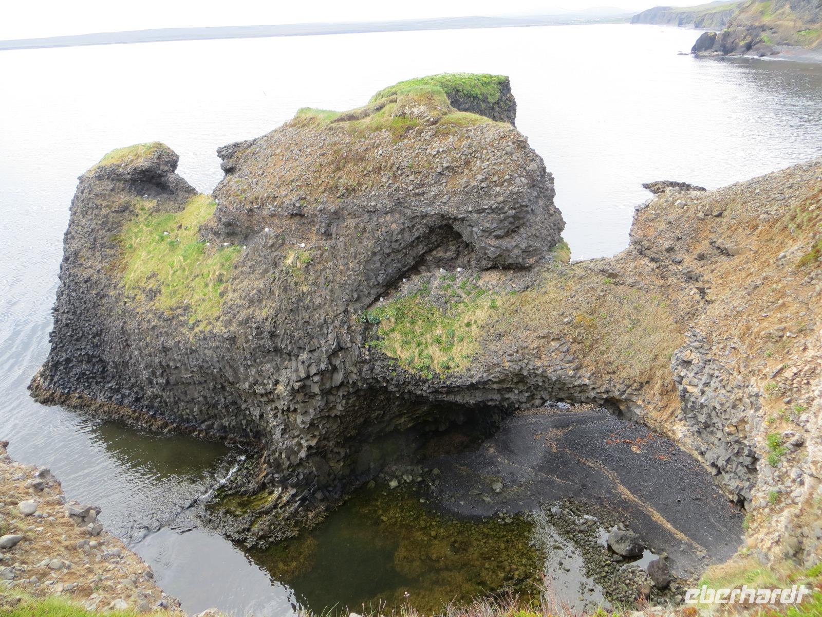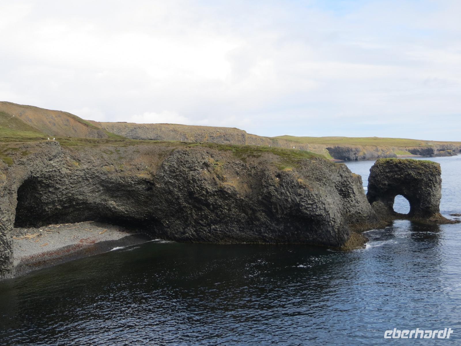 Nach dem Frühstück erwartete uns Siggi mit seinem Bus, komfortable 30 Plätze für 17 Gäste und wir verließen wieder die einzige Großstadt Islands, wo fast 40% der gesamten Insulaner leben. Die Reise führte uns in den kommenden Tagen im Uhrzeigersinn entlang der bekannten 1.300 km langen Ringstraße, die wir ab und zu verließen, aber so lernten wir Island wirklich von allen Seiten kennen. So fuhren wir heute die Westküste entlang und durchquerten alsbald den Walfjortunnel, der uns knapp 7 km in einer Tiefe von 120m durch den Hvalfjödur führte. Nach einer kurzen Einkaufspause in Borgarnes erreichten wir am späten Vormittag bei herrlichem Sonnenschein den Ausgangspunkt unserer ersten Wanderung. Schon von hier sahen wir unser Ziel, den Ringwallkrater Eldborg. Wir wanderten auf dem Lavafeld mit niedrigen Bewuchs und maximal mannshohen Birken (dem sogenannten isländischen Wald) und bestiegen dann den Kraterrand. Von hier oben genossen wir den imposanten Blick ins Kraterinnere und über die weite Landschaft mit schneebedeckten Gipfeln als Hintergrundkulisse. Mit einem gewöhnungsbedürftigen „Opal", dem Lackritzschnaps stießen wir hier oben auf eine erlebnisreiche Reise an. Dann liefen wir wieder zurück zum Bus. Mit diesem ging es weiter vorbei an unzähligen Wasserfällen und erreichten nach einer knappen Fahrtstunde Budir auf der Halbinsel Snaefellsnes. Bei strahlend blauen Himmel präsentierte sich vor uns der Snæfellsjökull - der 1446 m hohe Schneeberggletscher mit seinen 2 Spitzen. An der schwarzen Holzkirche von Budir machten wir Mittagspause, einige bummelten zur Düne bevor es weiterging nach Arnarstapi, dem Startpunkt unserer nächsten kleinen Wanderung oberhalb der Steilküste. Der Weg war teils sehr geröllig, wir erfuhren von Harald viel über das berühmte Islandmoos und genossen immer wieder den Ausblick über interessante Felsformationen auf das weite Meer. Zum Abschluss belohnten wir uns in Hellnar mit einem leckeren Kaffee in der Sonne. Anschließend fuhren wir mit einem Fotostopp am „Kirchberg" bis nach Stykkisholmur zur heutigen Übernachtung. Im Hotel genossen wir ein leckeres Abendessen mit Fischsuppe, Lamm und Eis. Anschließend spazierten wir durch den Ort und die meisten von uns erklommen noch den Hausberg Súgandisey- eigentlich eine Insel - mit dem roten Leuchtturm. Hier genossen wir einen herrlichen Blick über die Insel- und Schärenwelt in der Abendsonne... und uns wurden nun die weißen Nächte richtig bewußt ... heute (besser morgen) sollte die Sonne gegen 00:30 Uhr für 2 Stunden untergehen. Also genossen zum Teil noch ein leckeres Getränk am Hafen und spazierten gegen Mitternacht im strahlenden Sonnenschein zurück zum Hotel.