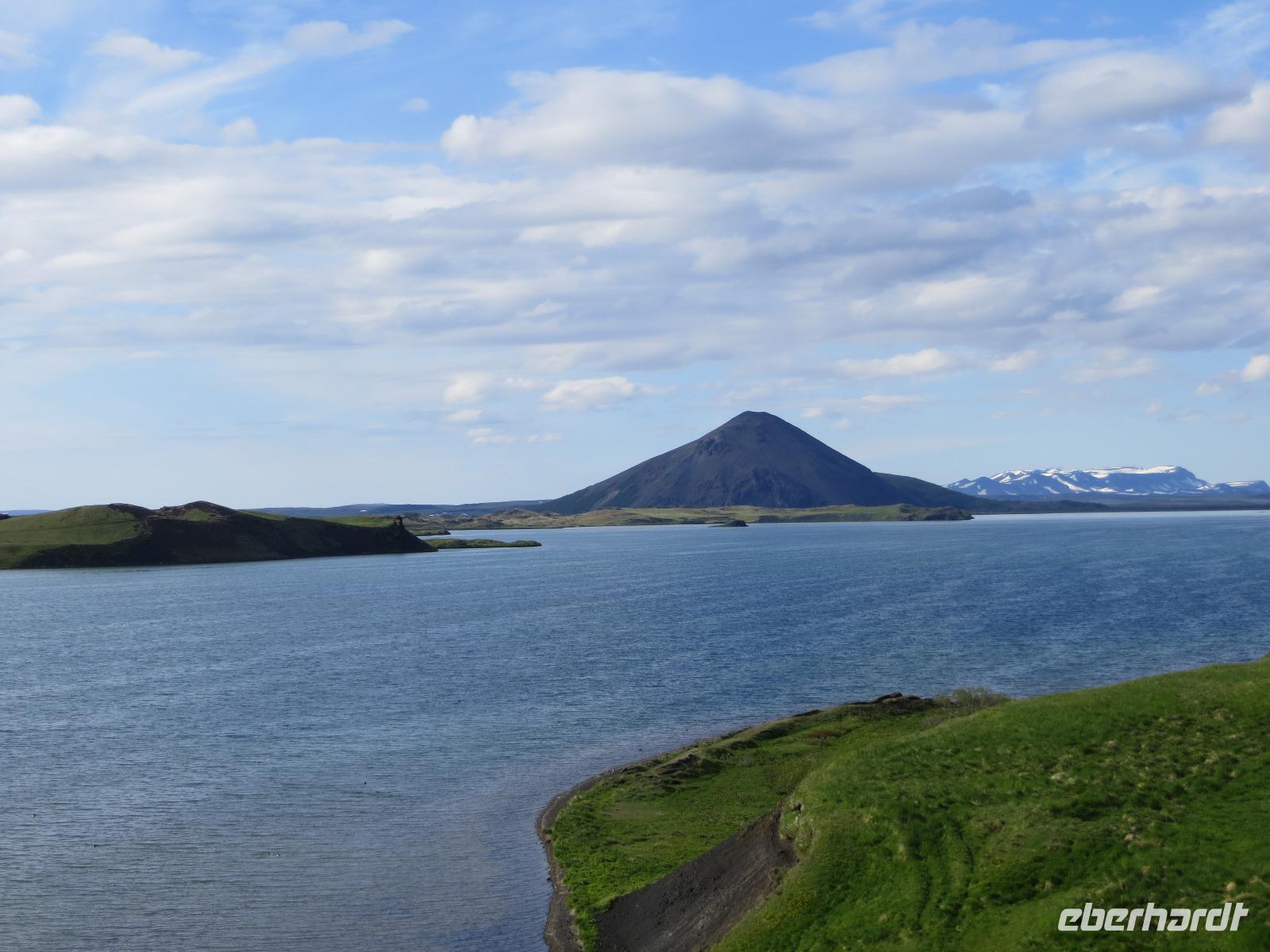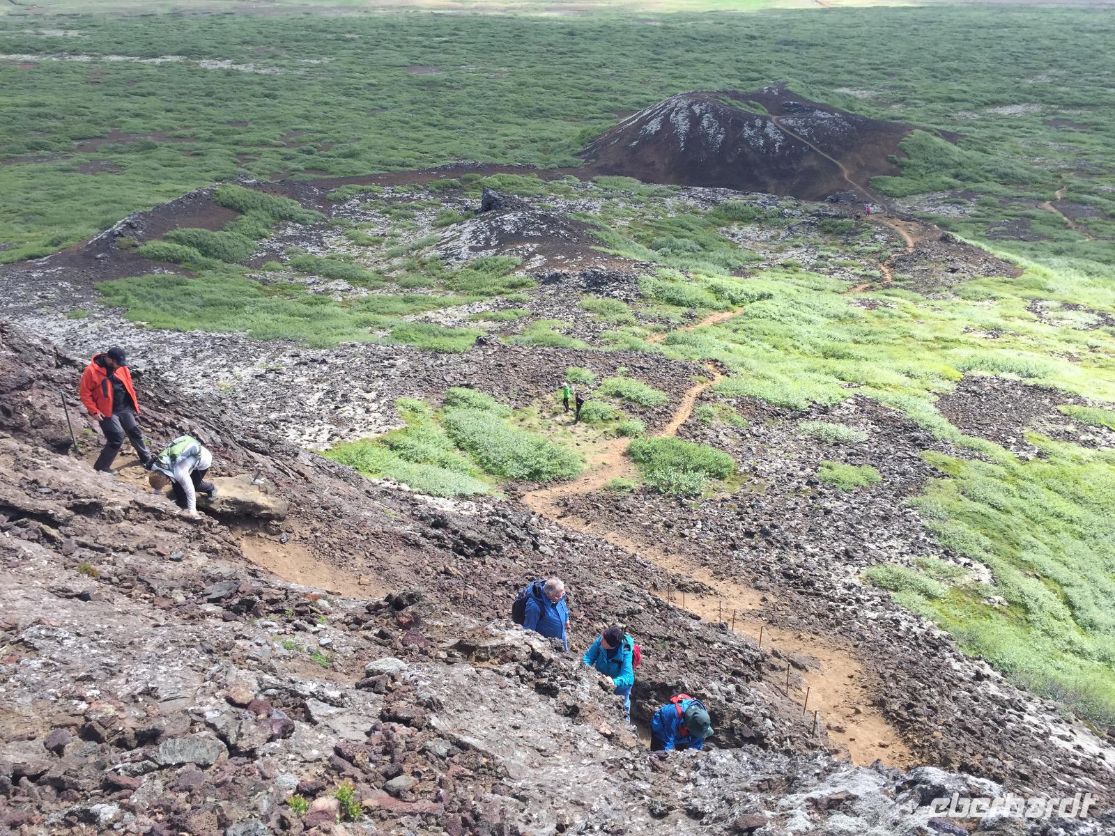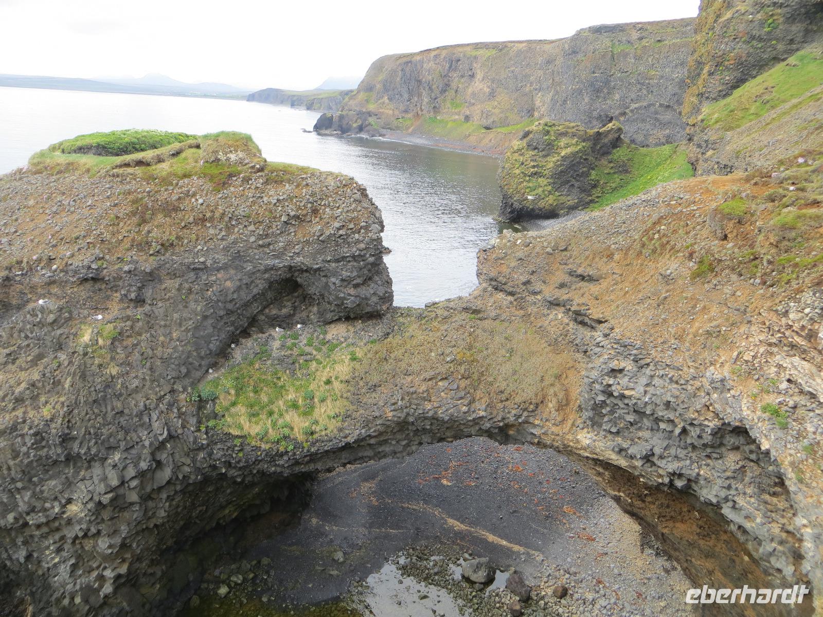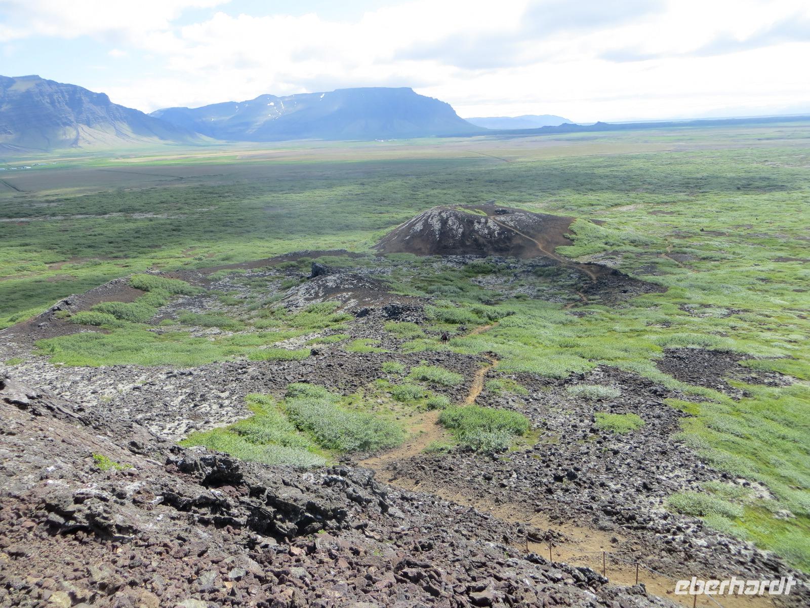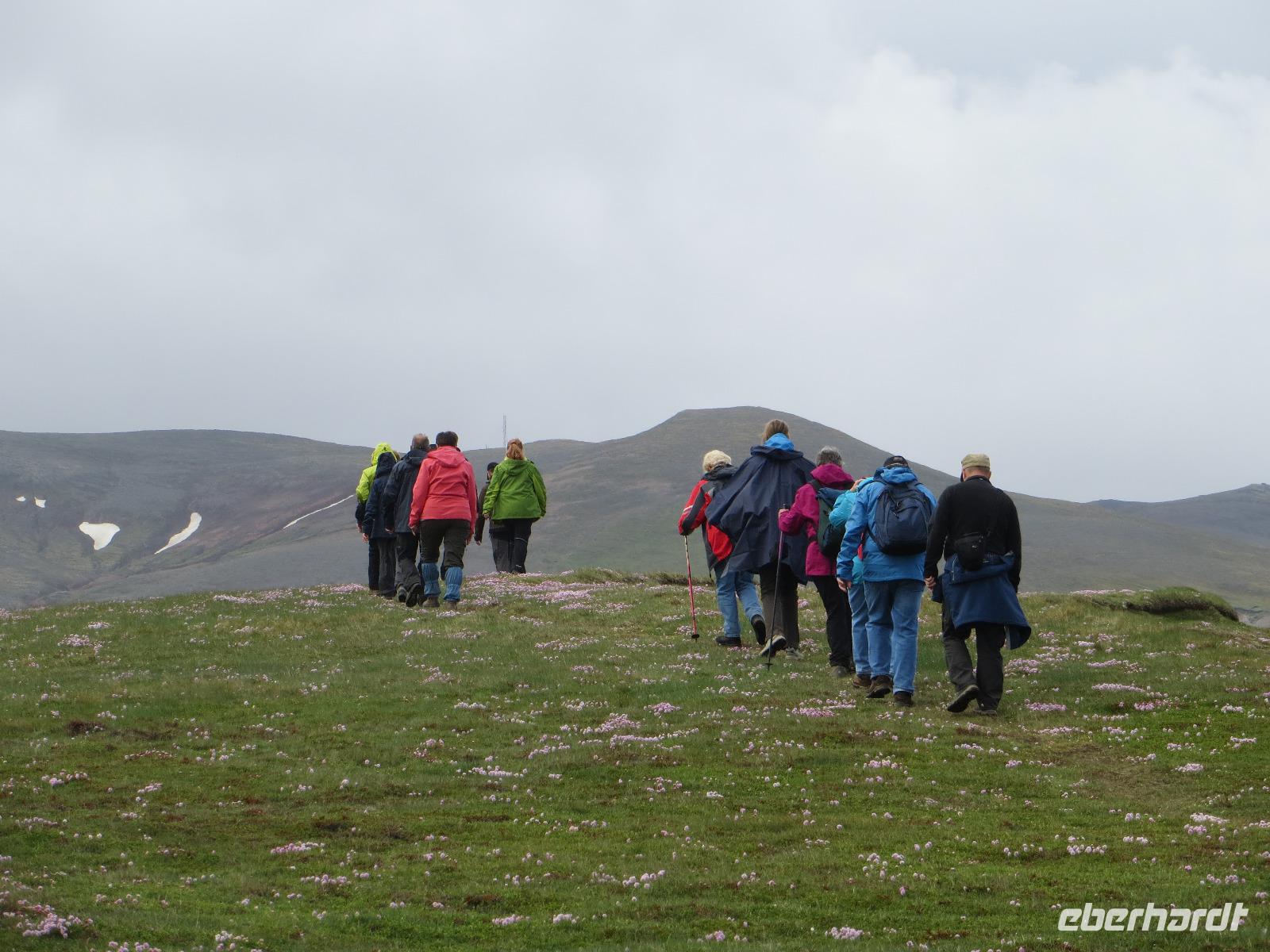 Nach dem Frühstück erwartete uns Siggi mit seinem Bus, komfortable 30 Plätze für 17 Gäste und wir verließen wieder die einzige Großstadt Islands, wo fast 40% der gesamten Insulaner leben. Die Reise führte uns in den kommenden Tagen im Uhrzeigersinn entlang der bekannten 1.300 km langen Ringstraße, die wir ab und zu verließen, aber so lernten wir Island wirklich von allen Seiten kennen. So fuhren wir heute die Westküste entlang und durchquerten alsbald den Walfjortunnel, der uns knapp 7 km in einer Tiefe von 120m durch den Hvalfjödur führte. Nach einer kurzen Einkaufspause in Borgarnes erreichten wir am späten Vormittag bei herrlichem Sonnenschein den Ausgangspunkt unserer ersten Wanderung. Schon von hier sahen wir unser Ziel, den Ringwallkrater Eldborg. Wir wanderten auf dem Lavafeld mit niedrigen Bewuchs und maximal mannshohen Birken (dem sogenannten isländischen Wald) und bestiegen dann den Kraterrand. Von hier oben genossen wir den imposanten Blick ins Kraterinnere und über die weite Landschaft mit schneebedeckten Gipfeln als Hintergrundkulisse. Mit einem gewöhnungsbedürftigen „Opal", dem Lackritzschnaps stießen wir hier oben auf eine erlebnisreiche Reise an. Dann liefen wir wieder zurück zum Bus. Mit diesem ging es weiter vorbei an unzähligen Wasserfällen und erreichten nach einer knappen Fahrtstunde Budir auf der Halbinsel Snaefellsnes. Bei strahlend blauen Himmel präsentierte sich vor uns der Snæfellsjökull - der 1446 m hohe Schneeberggletscher mit seinen 2 Spitzen. An der schwarzen Holzkirche von Budir machten wir Mittagspause, einige bummelten zur Düne bevor es weiterging nach Arnarstapi, dem Startpunkt unserer nächsten kleinen Wanderung oberhalb der Steilküste. Der Weg war teils sehr geröllig, wir erfuhren von Harald viel über das berühmte Islandmoos und genossen immer wieder den Ausblick über interessante Felsformationen auf das weite Meer. Zum Abschluss belohnten wir uns in Hellnar mit einem leckeren Kaffee in der Sonne. Anschließend fuhren wir mit einem Fotostopp am „Kirchberg" bis nach Stykkisholmur zur heutigen Übernachtung. Im Hotel genossen wir ein leckeres Abendessen mit Fischsuppe, Lamm und Eis. Anschließend spazierten wir durch den Ort und die meisten von uns erklommen noch den Hausberg Súgandisey- eigentlich eine Insel - mit dem roten Leuchtturm. Hier genossen wir einen herrlichen Blick über die Insel- und Schärenwelt in der Abendsonne... und uns wurden nun die weißen Nächte richtig bewußt ... heute (besser morgen) sollte die Sonne gegen 00:30 Uhr für 2 Stunden untergehen. Also genossen zum Teil noch ein leckeres Getränk am Hafen und spazierten gegen Mitternacht im strahlenden Sonnenschein zurück zum Hotel.