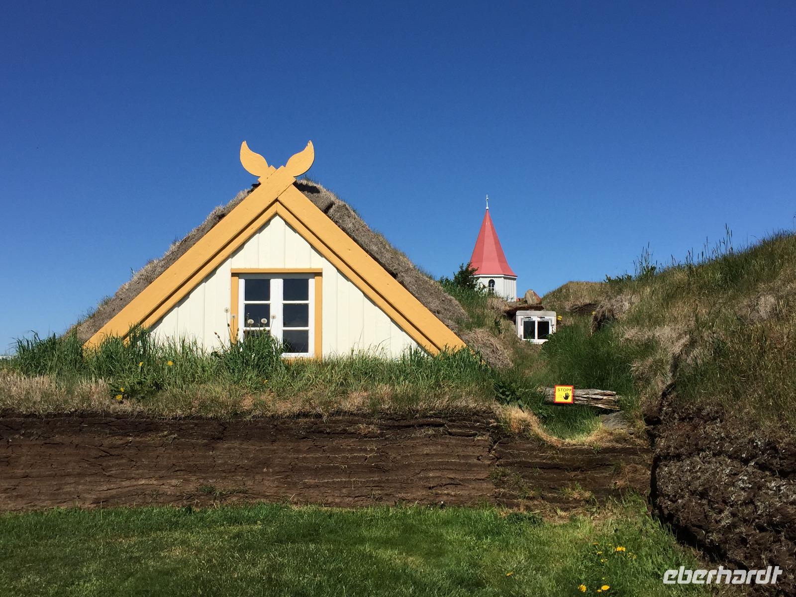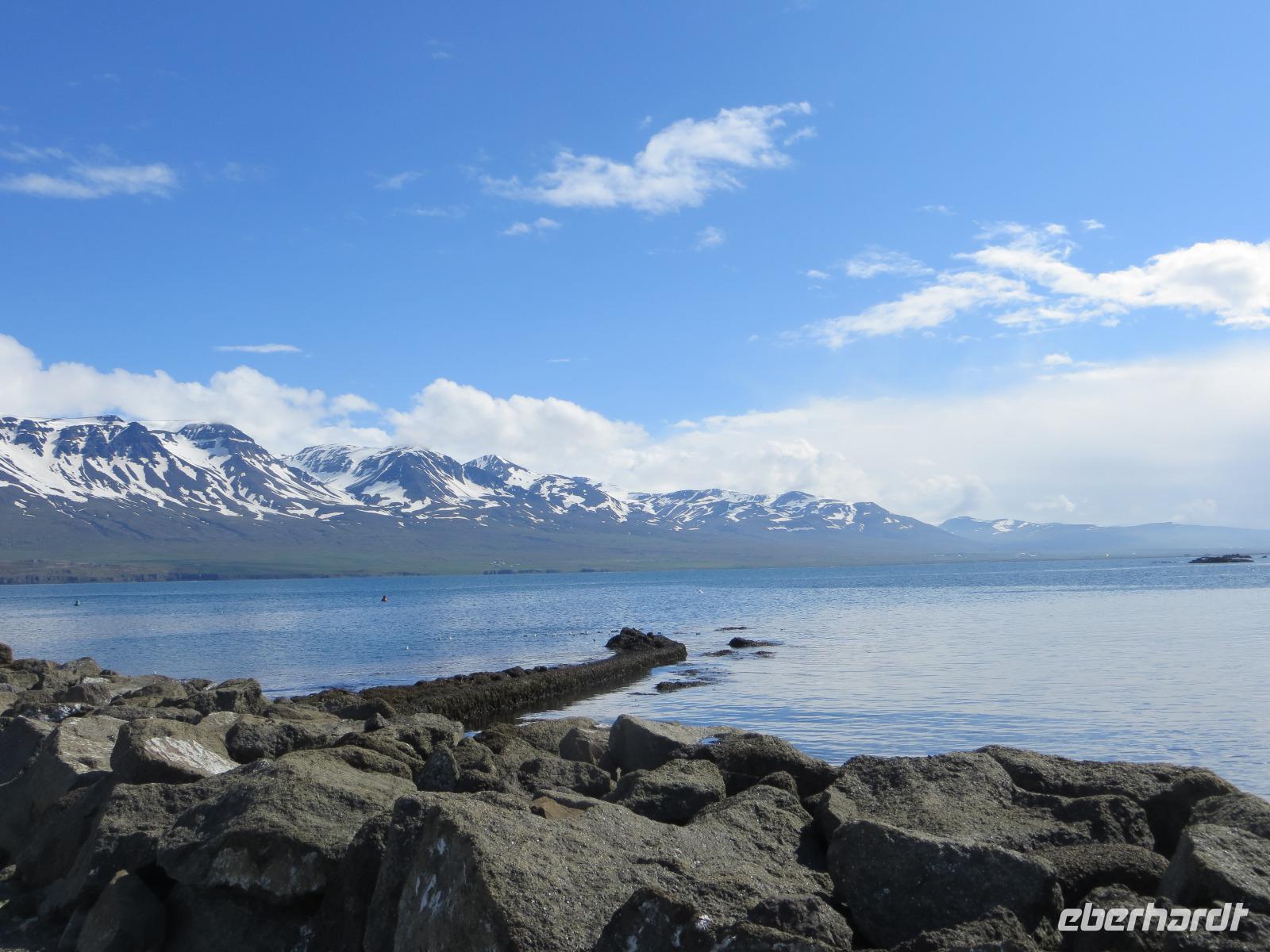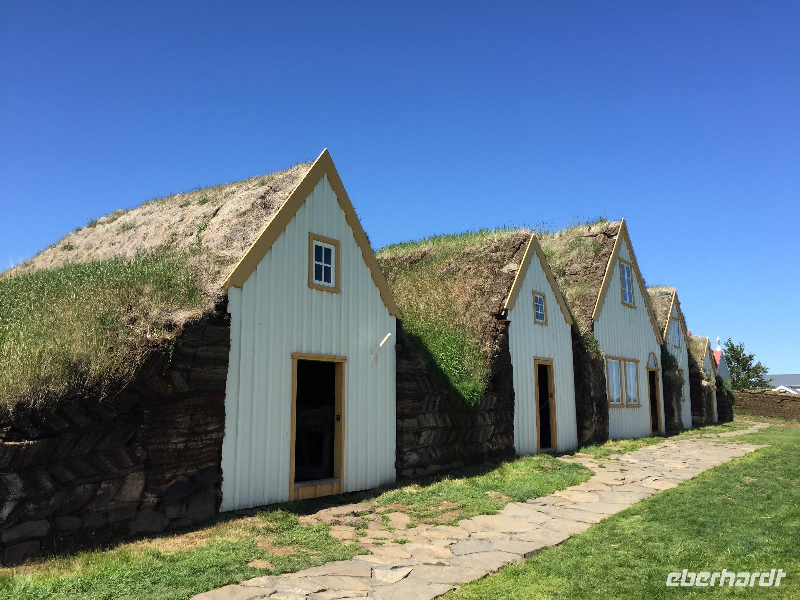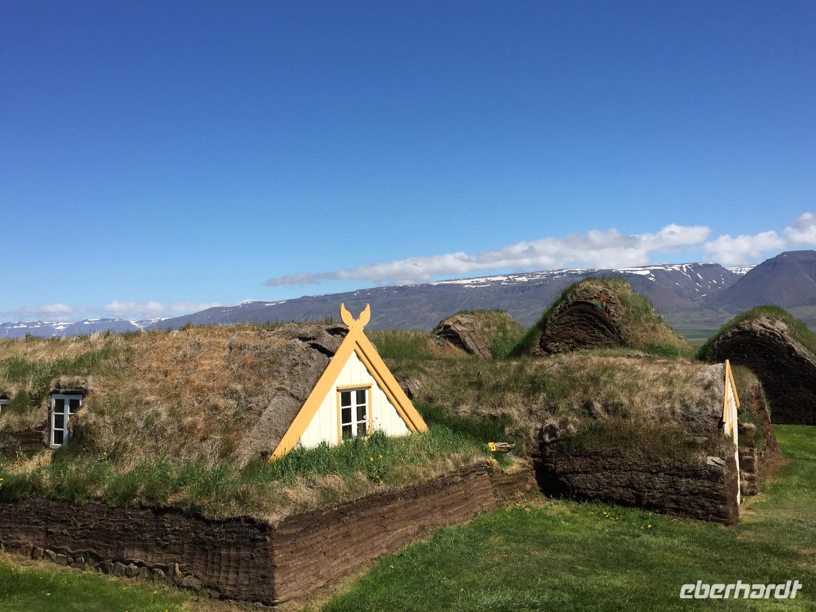 Nach etwas Aufregung, da am Morgen kurzzeitig der Strom und damit das warme Duschwasser ausgefallen war, verließen wir die Halbinsel Porsnes, umrundeten einen malerischen Fjord, sahen Schnee am Straßenrand und wie immer auch unzählige Wasserfälle, machten eine kleine Pause in Blönduos und erreichten gegen Mittag Skagafjördur. Hier besuchten wir Glaumbaer, einen eindrucksvollen Museumshof mit den typischen Grassodenhäusern aus dem 18. Jahrhundert. Das Bemerkenswerte hier ist, dass die 13 Räume der insgesamt 6 Häuser mit Gängen verbunden sind. Wir besichtigten alle Wohn- und Wirtschaftsräume ausführlich, auch die kleine Kirche und bestaunten die Bauweise der Häuser, deren Wandfüllungen und Dächer aus aufgestapelten Grassoden bestehen. Nach einem weiteren kurzen Stopp zum Mittagessen erreichten wir Akureyri, mit reichlich 18.000 Einwohnern immerhin die zweitgrößte Stadt Islands. Wir checkten im EDDA Hotel ein und begaben uns zu Fuß auf Stadterkundung. Einige von uns nutzten die Möglichkeit zum angebotenen Reitausflug mit den berühmten Islandpferden. Zum Abendessen genießen wir ein leckeres Buffet im Hotel.