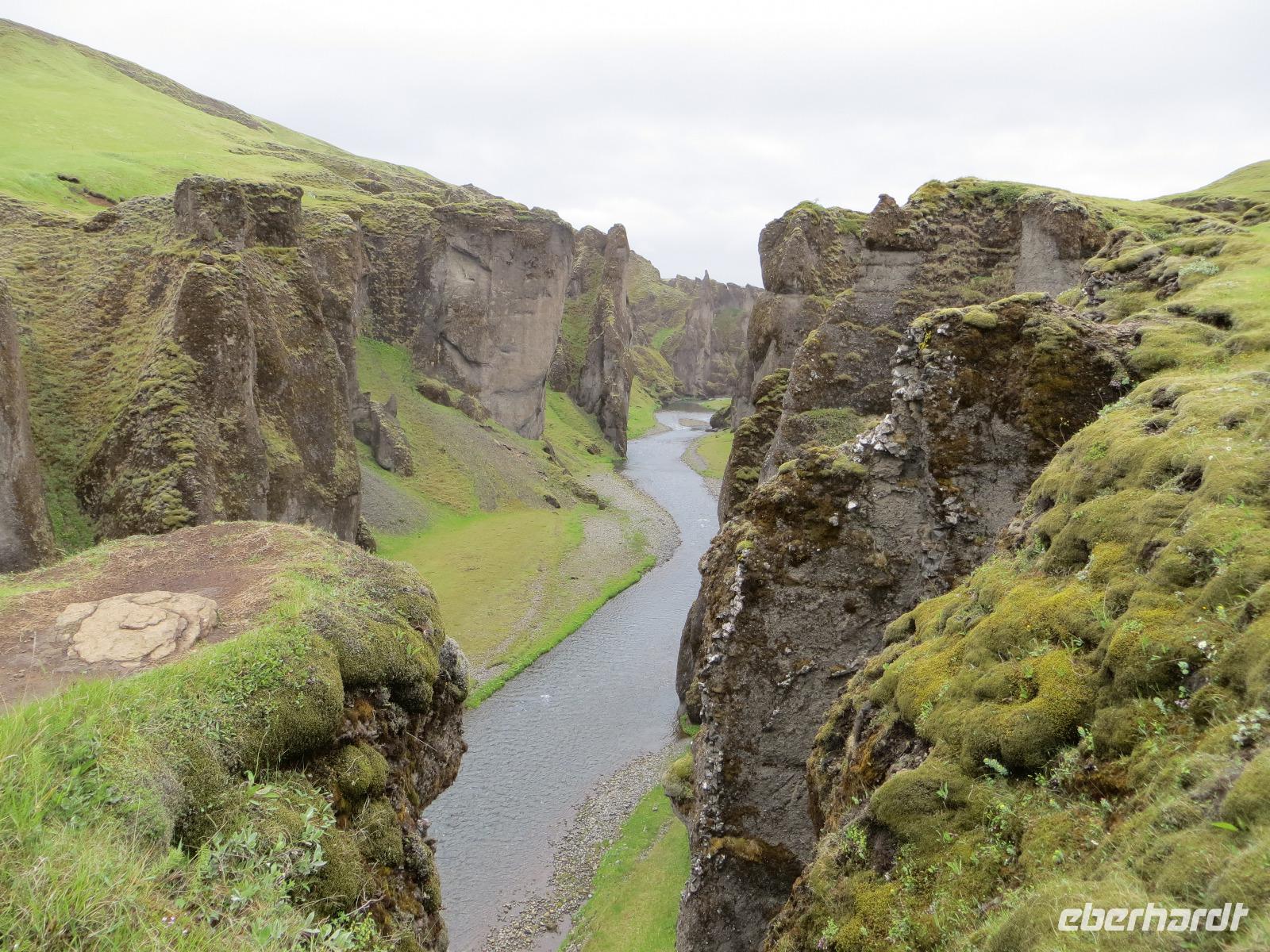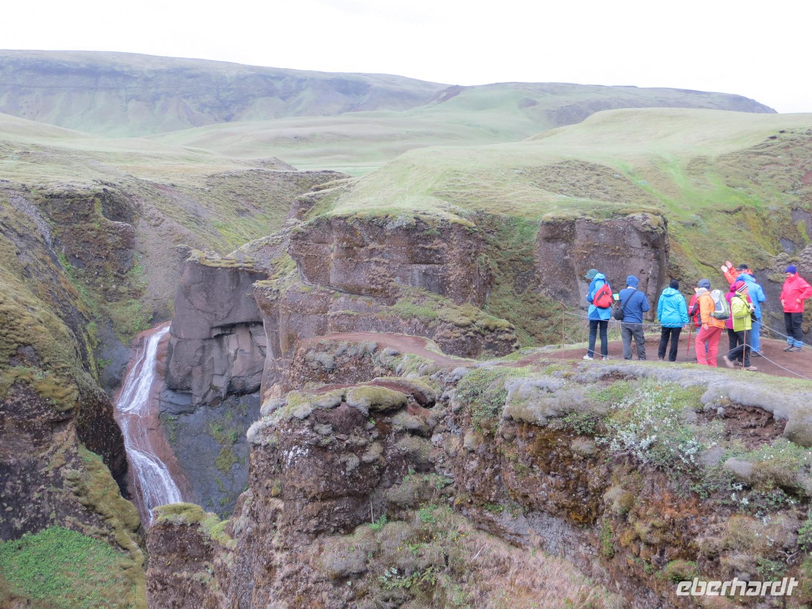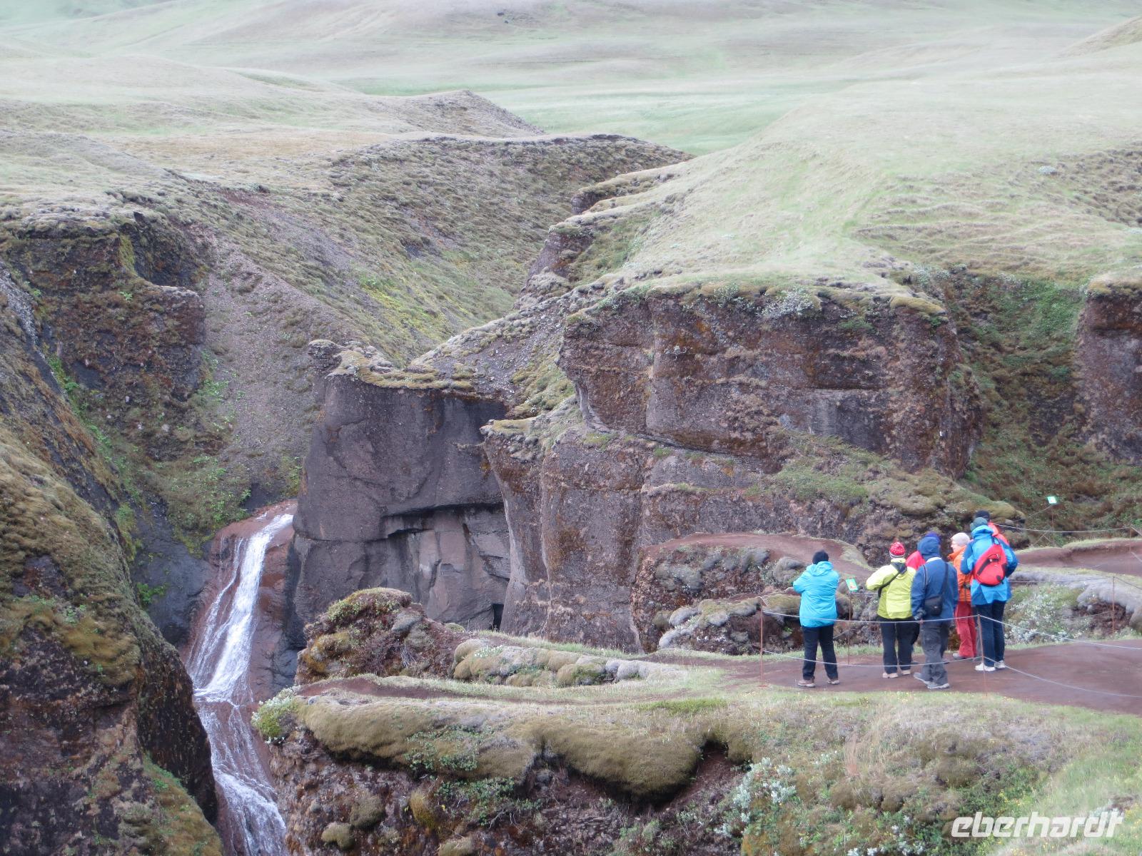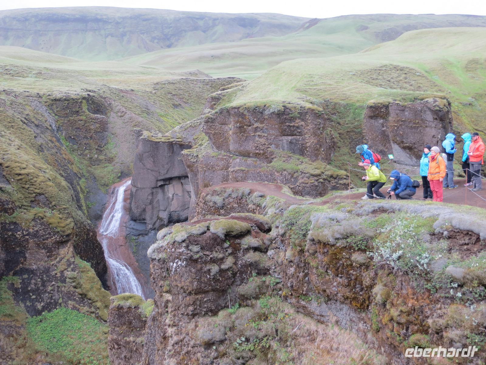 Nach dem Frühstück hält der Sturm sich noch in Grenzen, so fahren wir zum Ausgangspunkt unserer kleinen Wanderung im Katla Geopark. Wir wandern oberhalb der Schlucht Fjadrargljufur und genießen immer wieder die Blicke hinab.