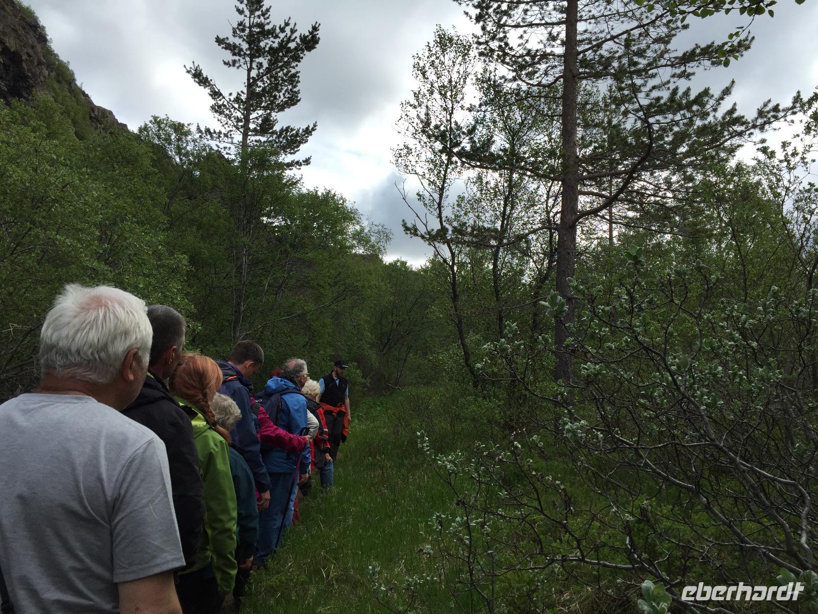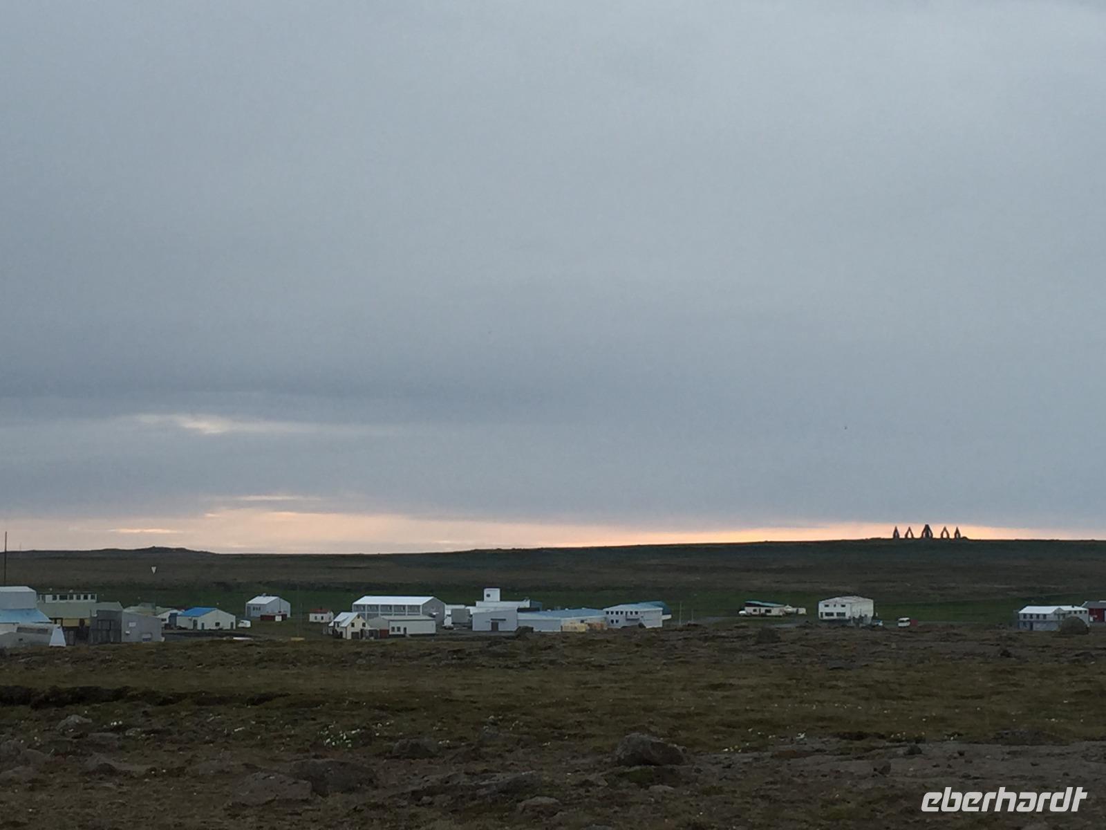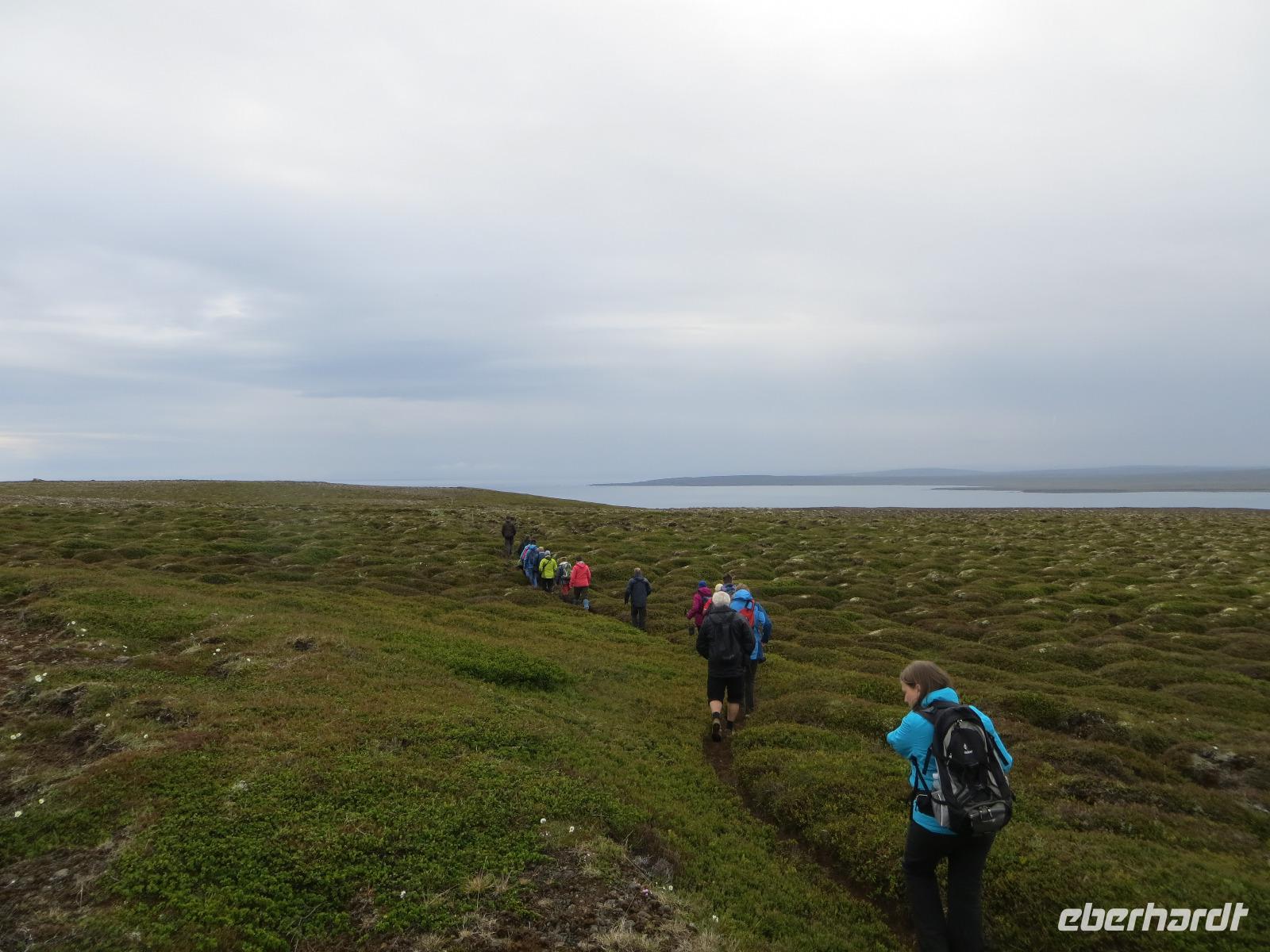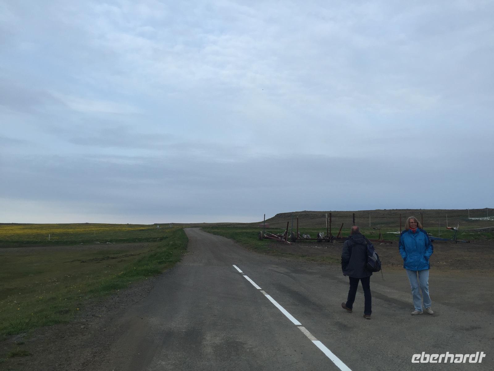 Am frühen Morgen fahren wir nach Husavik, In Europas Hauptstadt für Walbeobachtungen möchten auch wir die Chance ergreifen, die imposanten Meerestiere zu sehen. So besteigen wir unser restauriertes, traditionelles Fischerboot aus Eichenholz namens „Bjössi Sör" , werden warm eingekleidet und starten. Bald wird Husavik hinter uns immer kleiner und die in der Bucht gegenüberliegenden über 1.000 m hohen Kinn-Berge immer höher. Wir werden in die Positionsbestimmung eingewiesen, gesichtete Wale werden in Uhrzeiten angesagt und schnell haben wir das Prinzip verinnerlicht, als der erste Ruf des Skippers erschallt: 1 Uhr. Es wird spannend und wir haben wirklich Glück, sehen wir doch etliche Buckel- und Zwergwale (auch in Gruppen) und einen Schweinswal. Glücklich machen wir usn auf die Rückfahrt nach Husavik und werden noch mit einem heißen Kakao und einer leckeren Zimtschnecke an Bord verwöhnt. Nach unserer Ankunft bummeln wir noch etwas durch den Ort und fahren dann weiter entlang der Halbinsel Tjörnes. Unterwegs sehen wir bei einem Fotostopp unsere ersten Papageientaucher. Es gibt sie wirklich ... nicht nur als Plüschtiere :-) Unser nächstes Ziel ist das Besucherzentrum, von wo wir aus, nach einer kurzen Besichtigung, unsere Wanderung zur hufeisenförmigen Schlucht Asbyrgi starten. Wir wandern unterhalb der steil aufragenden Basaltwände und genießen besonders die Pflanzenwelt mit Teppichen aus Frauenmantel, Storchschnabel, Blaubeeren und auch einigen Orchideen können wir entdecken. Dann kommen wir zum Ende der Schlucht mit einem kleinen See und einem Wasserfall OHNE Wasser. Auch das gibt es in Island. Dieses Phänomen wird ab sofort von uns „Haraldfoss" genannt. Wir genießen hier ein Weilchen die Natur und lauschen wiedermal der Sagenwelt, denn der Legende nach soll das achtbeinige Pferd Odins hier auf der Erde so aufgetreten sein, dass sich dieses hufeisenförmige Tal gebildet hat. Danach geht es zu unserem heutigen Übernachtungsort Raufarhöfn, von hier aus sind es nur noch ca. 15 km bis zum nördlichsten Punkt auf dem Festland. Mit ca. 150 Einwohnern ist es das Dienstleistungszentrum für diese abgelegene Gegend und verfügt über Kirche, Kindergarten, Grundschule, Tankstelle, Bank, Islandpferde und unser einfaches Hotel. Am Abend, als wir zum Leuchtturm spazieren, treffen wir jedoch niemanden an. Es herrscht eine fast unheimliche Ruhe. Hier oben, fast am Polarkreis, erleben wir Mitte Juni nun auch das Phänomen, dass die Sonne gar nicht untergeht.