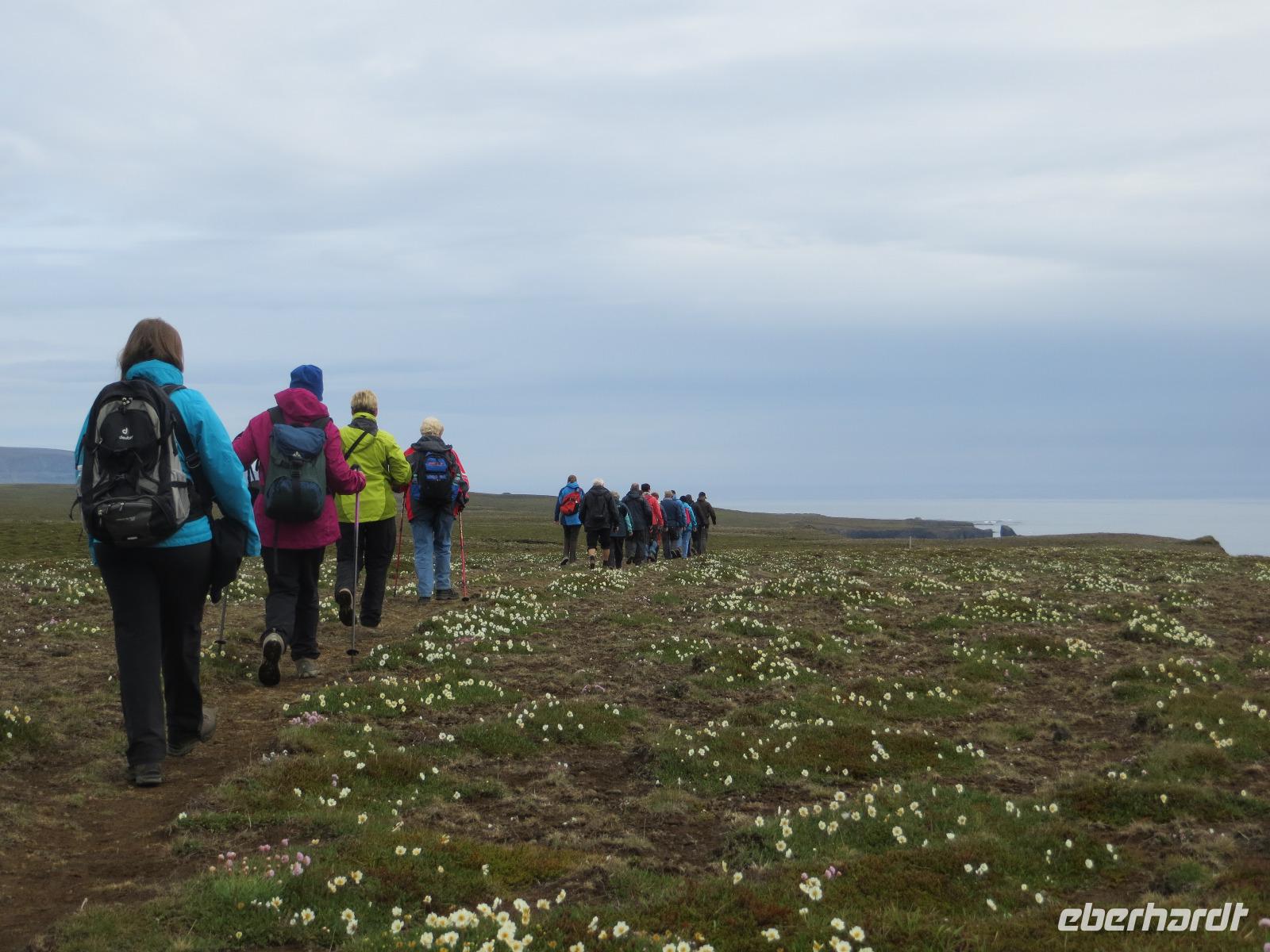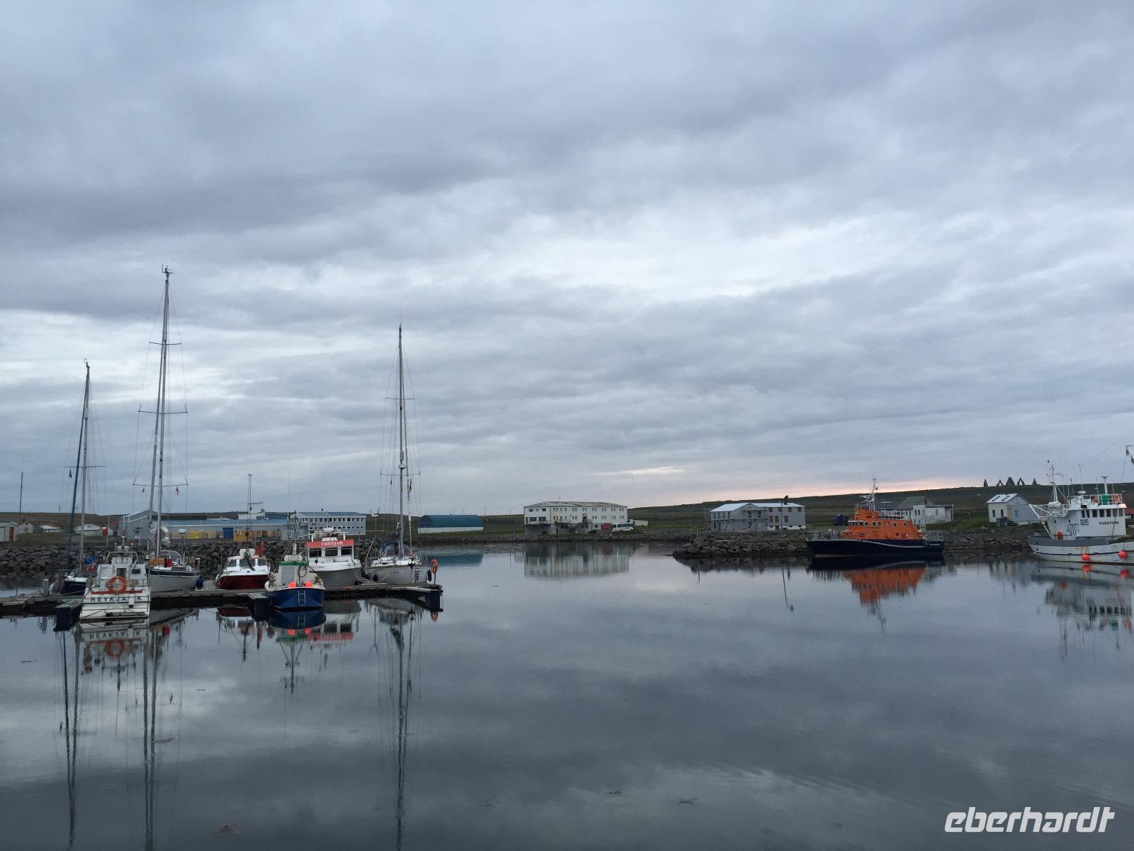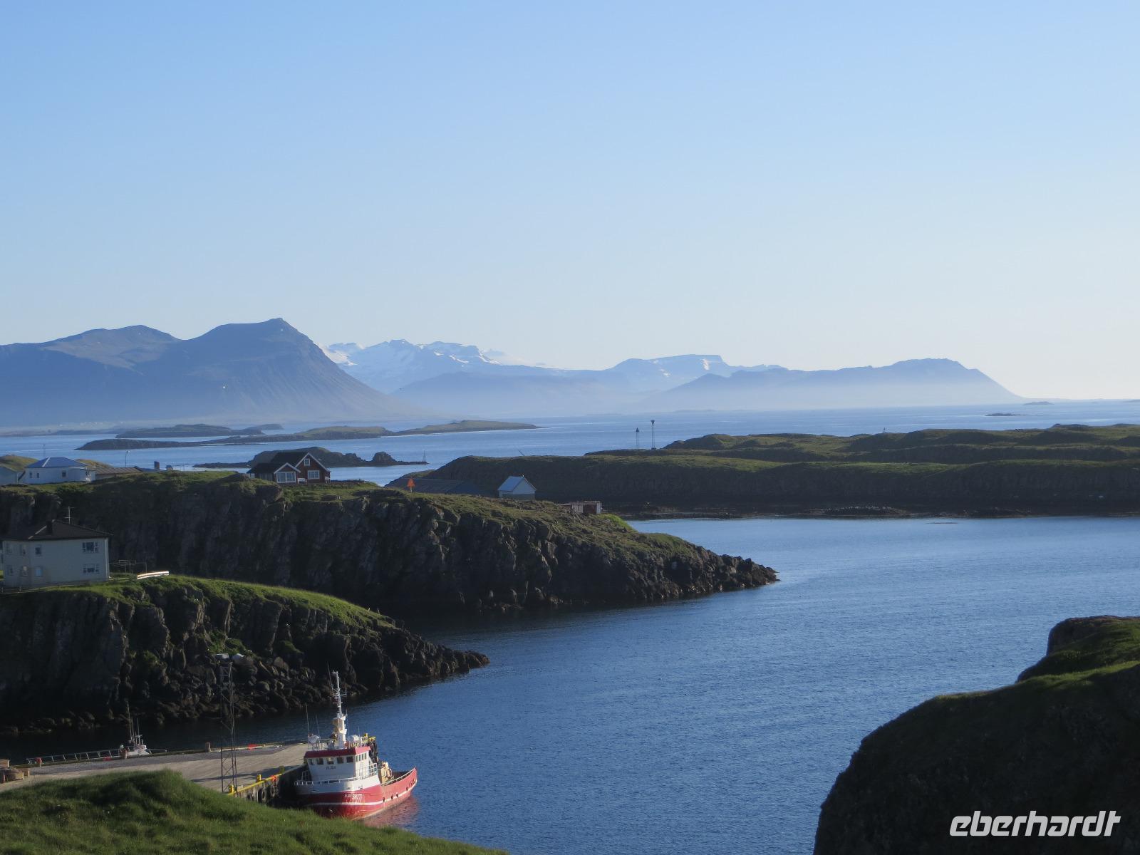 Am frühen Morgen fahren wir nach Husavik, In Europas Hauptstadt für Walbeobachtungen möchten auch wir die Chance ergreifen, die imposanten Meerestiere zu sehen. So besteigen wir unser restauriertes, traditionelles Fischerboot aus Eichenholz namens „Bjössi Sör" , werden warm eingekleidet und starten. Bald wird Husavik hinter uns immer kleiner und die in der Bucht gegenüberliegenden über 1.000 m hohen Kinn-Berge immer höher. Wir werden in die Positionsbestimmung eingewiesen, gesichtete Wale werden in Uhrzeiten angesagt und schnell haben wir das Prinzip verinnerlicht, als der erste Ruf des Skippers erschallt: 1 Uhr. Es wird spannend und wir haben wirklich Glück, sehen wir doch etliche Buckel- und Zwergwale (auch in Gruppen) und einen Schweinswal. Glücklich machen wir usn auf die Rückfahrt nach Husavik und werden noch mit einem heißen Kakao und einer leckeren Zimtschnecke an Bord verwöhnt. Nach unserer Ankunft bummeln wir noch etwas durch den Ort und fahren dann weiter entlang der Halbinsel Tjörnes. Unterwegs sehen wir bei einem Fotostopp unsere ersten Papageientaucher. Es gibt sie wirklich ... nicht nur als Plüschtiere :-) Unser nächstes Ziel ist das Besucherzentrum, von wo wir aus, nach einer kurzen Besichtigung, unsere Wanderung zur hufeisenförmigen Schlucht Asbyrgi starten. Wir wandern unterhalb der steil aufragenden Basaltwände und genießen besonders die Pflanzenwelt mit Teppichen aus Frauenmantel, Storchschnabel, Blaubeeren und auch einigen Orchideen können wir entdecken. Dann kommen wir zum Ende der Schlucht mit einem kleinen See und einem Wasserfall OHNE Wasser. Auch das gibt es in Island. Dieses Phänomen wird ab sofort von uns „Haraldfoss" genannt. Wir genießen hier ein Weilchen die Natur und lauschen wiedermal der Sagenwelt, denn der Legende nach soll das achtbeinige Pferd Odins hier auf der Erde so aufgetreten sein, dass sich dieses hufeisenförmige Tal gebildet hat. Danach geht es zu unserem heutigen Übernachtungsort Raufarhöfn, von hier aus sind es nur noch ca. 15 km bis zum nördlichsten Punkt auf dem Festland. Mit ca. 150 Einwohnern ist es das Dienstleistungszentrum für diese abgelegene Gegend und verfügt über Kirche, Kindergarten, Grundschule, Tankstelle, Bank, Islandpferde und unser einfaches Hotel. Am Abend, als wir zum Leuchtturm spazieren, treffen wir jedoch niemanden an. Es herrscht eine fast unheimliche Ruhe. Hier oben, fast am Polarkreis, erleben wir Mitte Juni nun auch das Phänomen, dass die Sonne gar nicht untergeht.